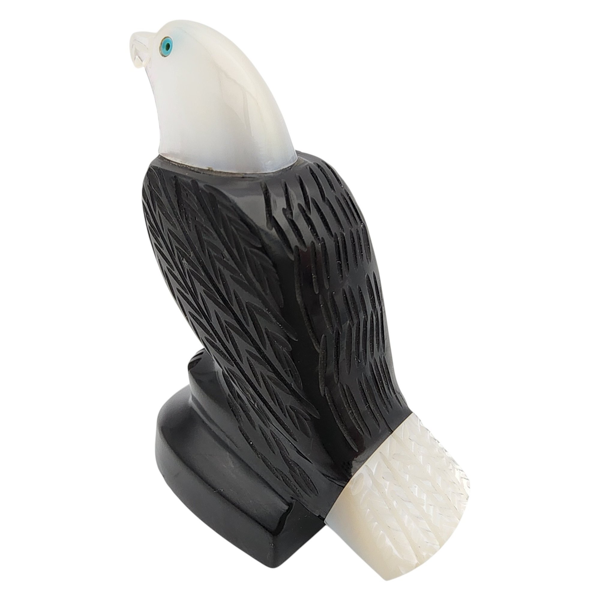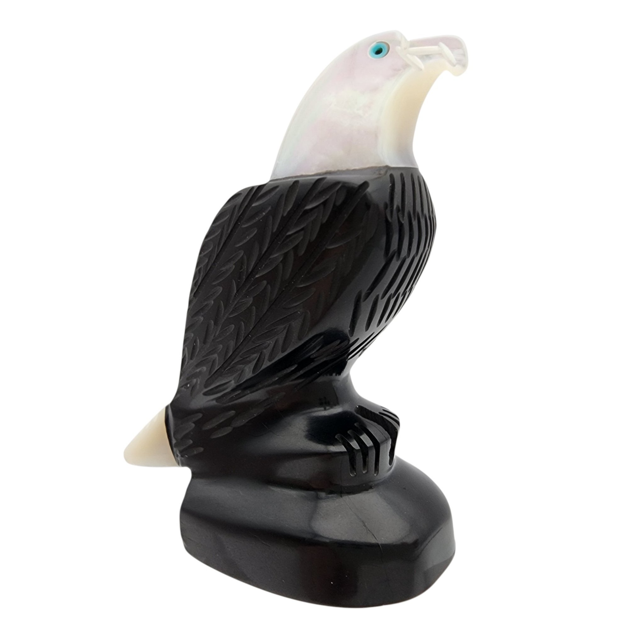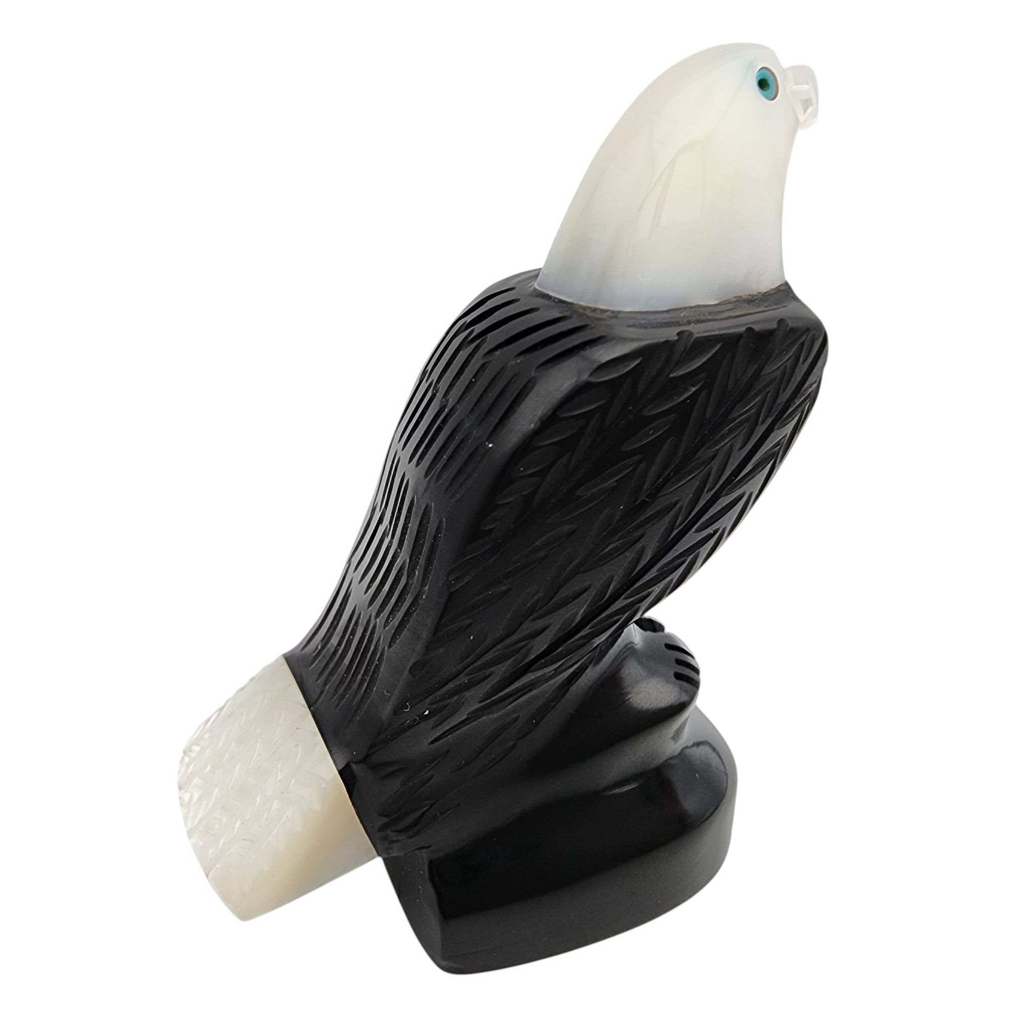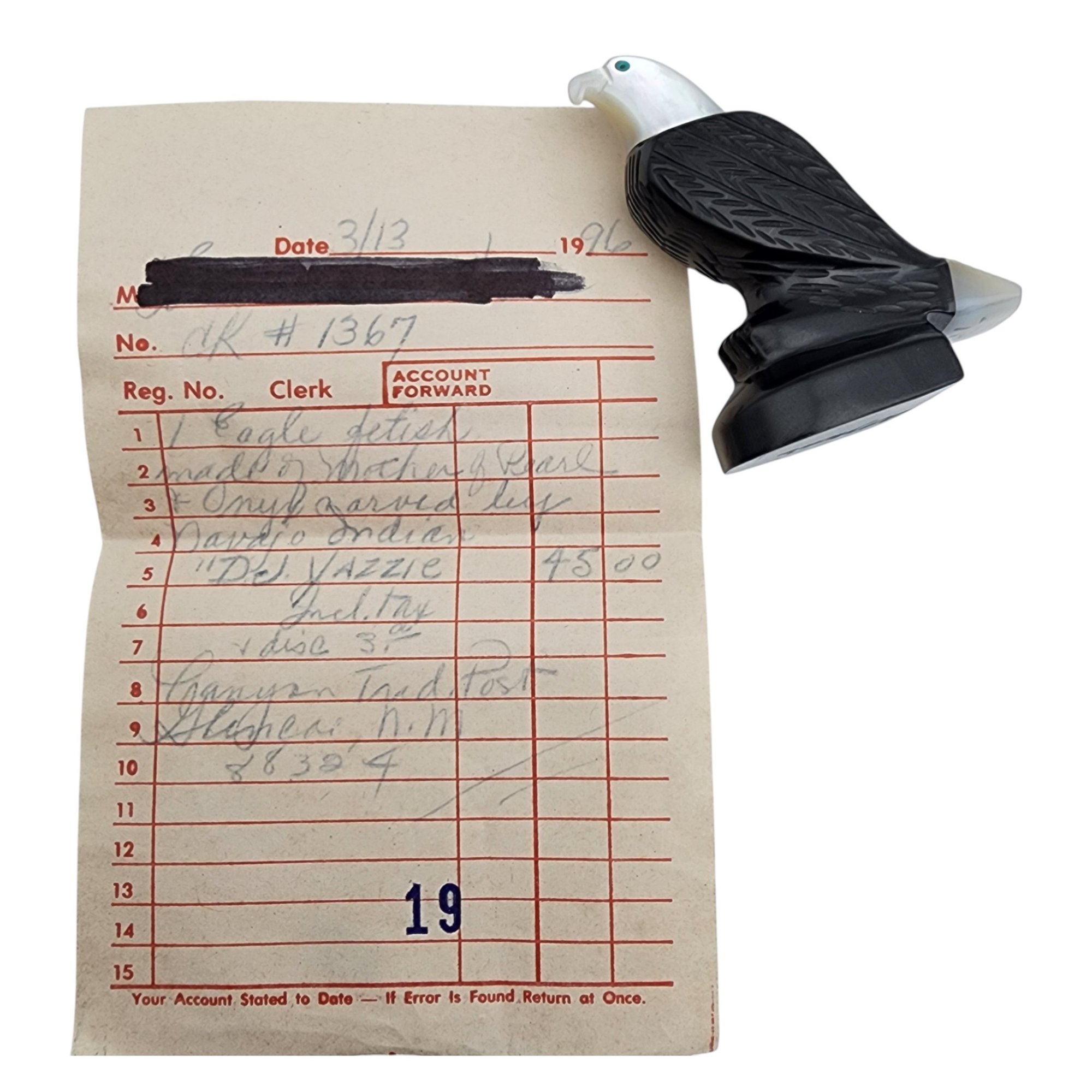 David Yazzie Navajo Jet, Mother of Pearl, and Inlaid Turquoise Eagle Fetish / Approximate Weight: 29g / Approximate measurements: 2.3″ x 1.7″ / Note 1: Signed DJ Yazzie under the base – Comes with original receipt from time of purchase. / This item is part of an estate collection of Native American fetishes, pottery, baskets, and rugs acquired by a collector who traveled throughout the Southwest between the 1970s and early 2000s. Many pieces were purchased from trading posts in Arizona and New Mexico. Artist attributions are based on available documentation, including receipts, tags, stickers, and signatures where present. Select items include original or copied receipts and original tags identifying artists pricing at the time of purchase, primarily from the 1970s through the 1990s. Please review our non-jewelry shipping information and reach out with any questions prior to bidding. Thank you!
