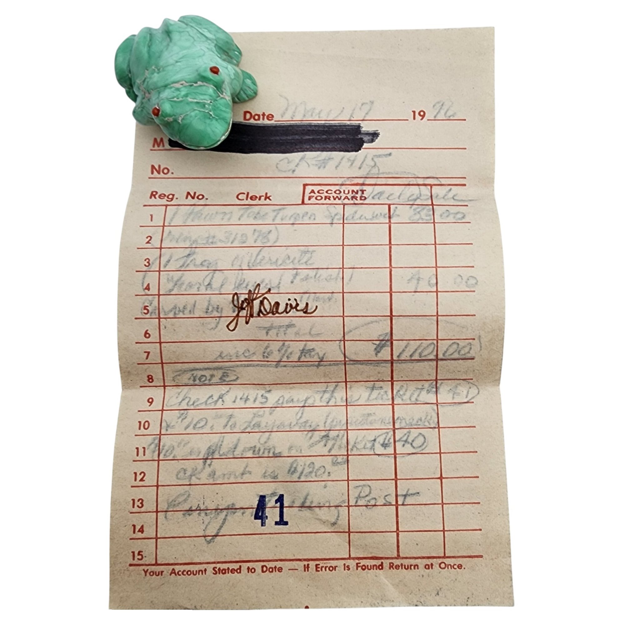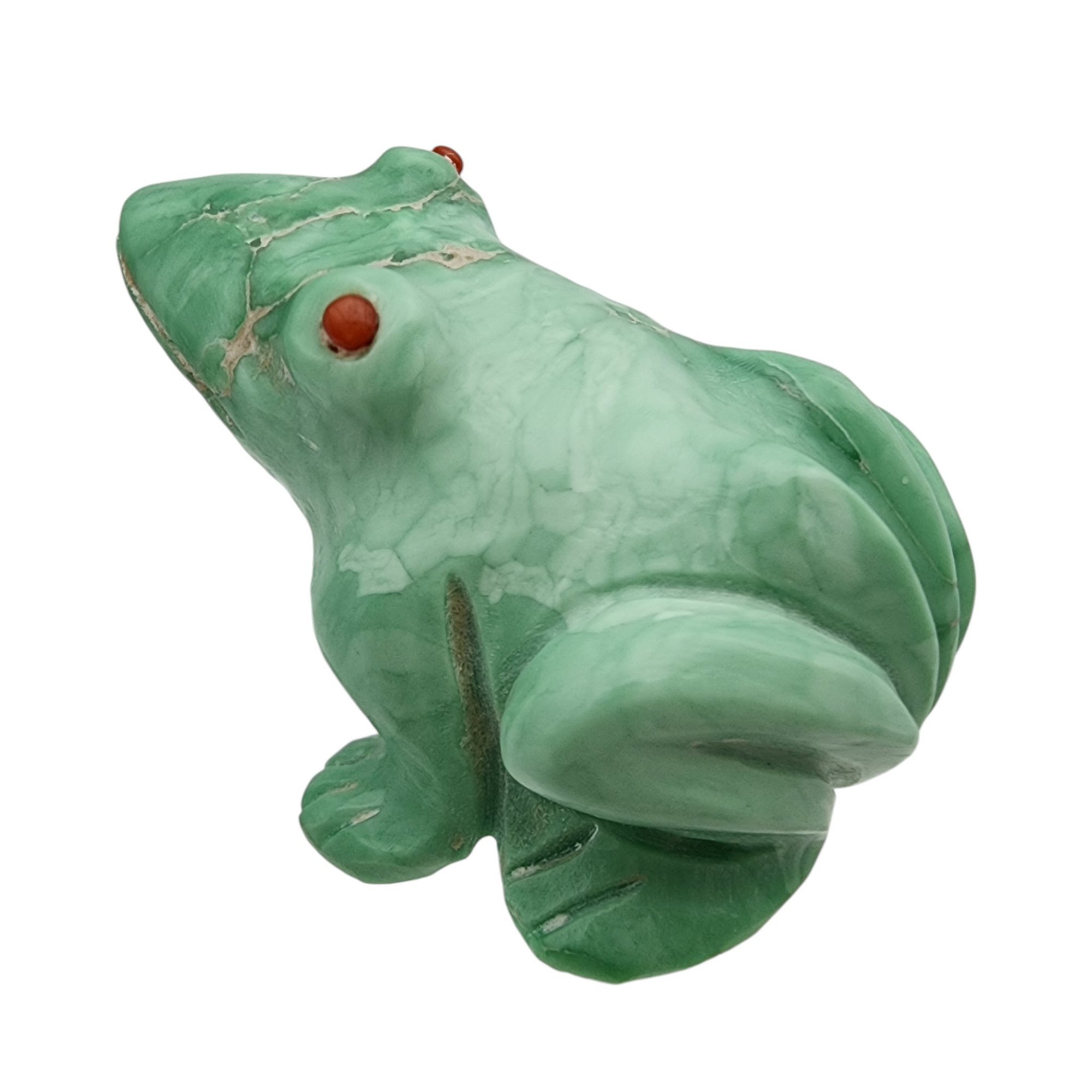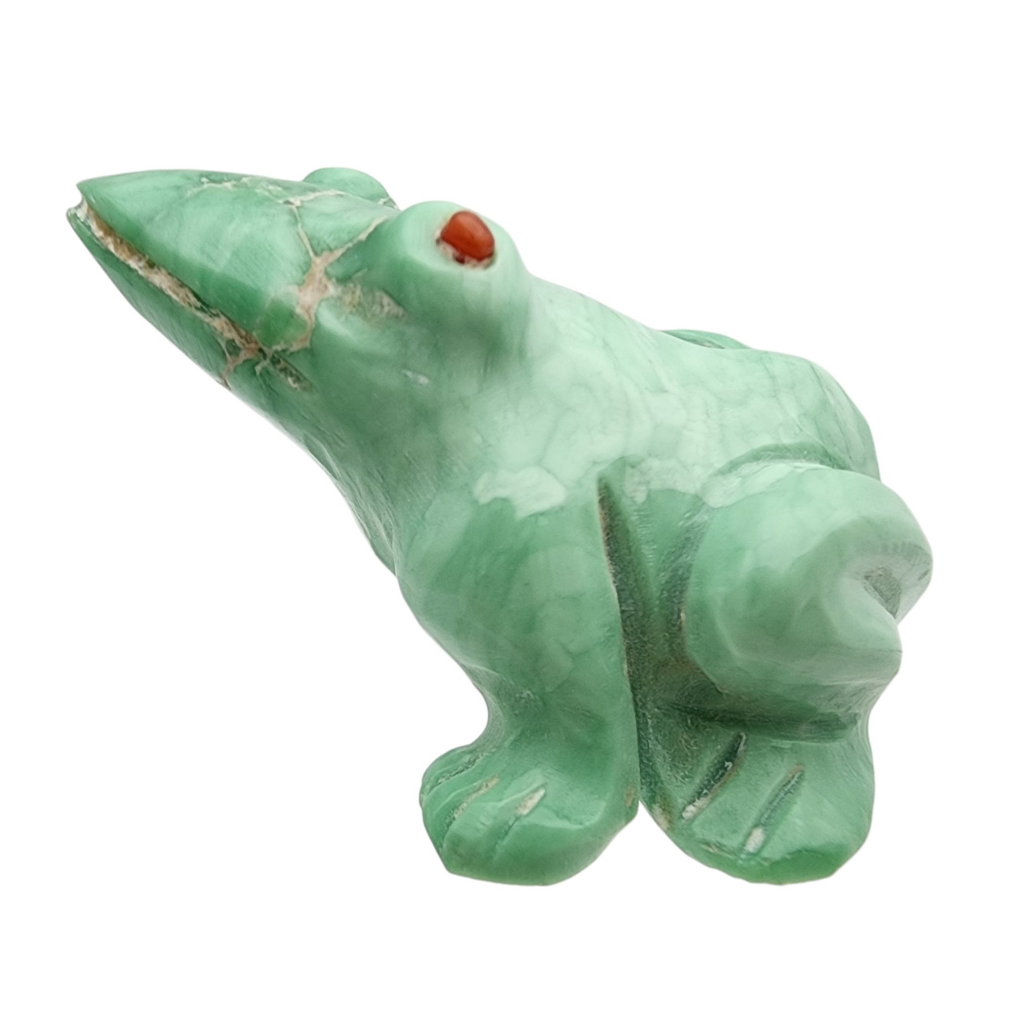 Herbert and Jeff Davis Navajo Variscite and Inlaid Coral Frog Fetish / Approximate Weight: 19g / Approximate measurements: 1.7″ x 1.2″ x .85″ / Note 1: Purchased at Canyon Trading Post in 1996. Comes with original receipt at time of purchase. / This item is part of an estate collection of Native American fetishes, pottery, baskets, and rugs acquired by a collector who traveled throughout the Southwest between the 1970s and early 2000s. Many pieces were purchased from trading posts in Arizona and New Mexico. Artist attributions are based on available documentation, including receipts, tags, stickers, and signatures where present. Select items include original or copied receipts and original tags identifying artists pricing at the time of purchase, primarily from the 1970s through the 1990s. Please review our non-jewelry shipping information and reach out with any questions prior to bidding. Thank you!
