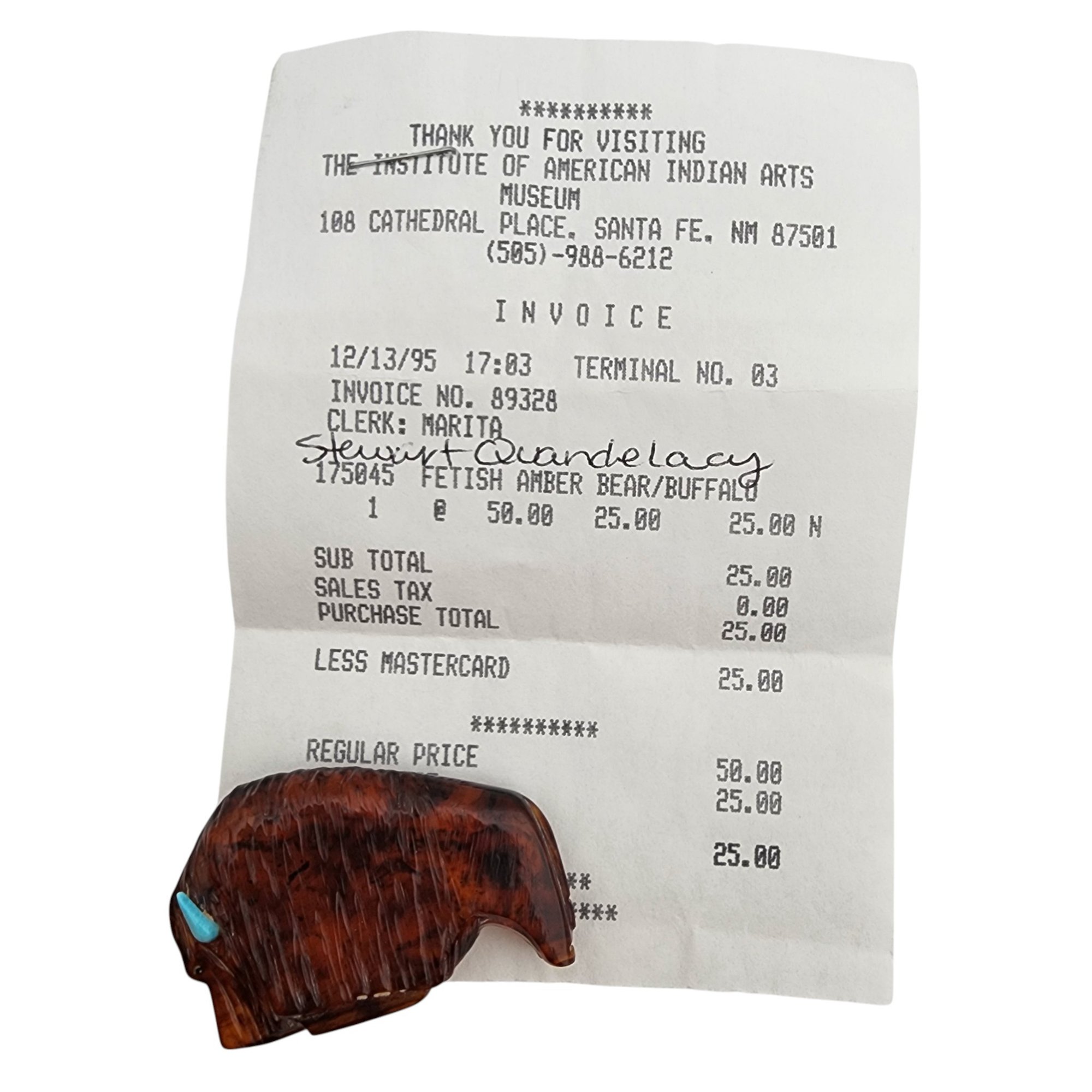 Rare Stewart Quandelacy Zuni Amber and Inlaid Turquoise Buffalo/Bison Fetish / Approximate Weight: 7g / Approximate measurements: 1.6″ x 1″ x .4″ / Note 1: Purchased at The Institute of American Indian Arts Museum in 1995. Comes with original receipt at time of purchase. / This item is part of an estate collection of Native American fetishes, pottery, baskets, and rugs acquired by a collector who traveled throughout the Southwest between the 1970s and early 2000s. Many pieces were purchased from trading posts in Arizona and New Mexico. Artist attributions are based on available documentation, including receipts, tags, stickers, and signatures where present. Select items include original or copied receipts and original tags identifying artists pricing at the time of purchase, primarily from the 1970s through the 1990s. Please review our non-jewelry shipping information and reach out with any questions prior to bidding. Thank you!