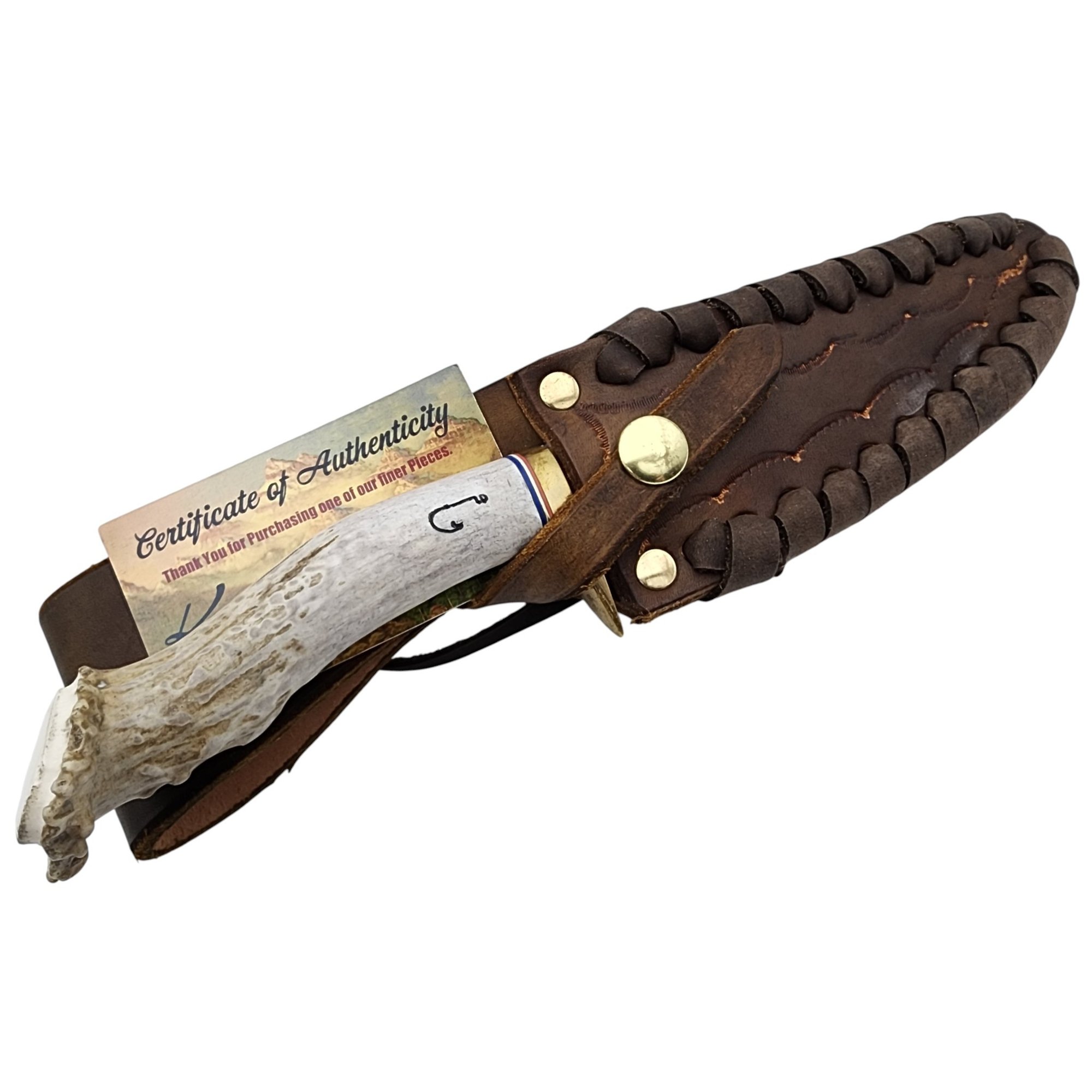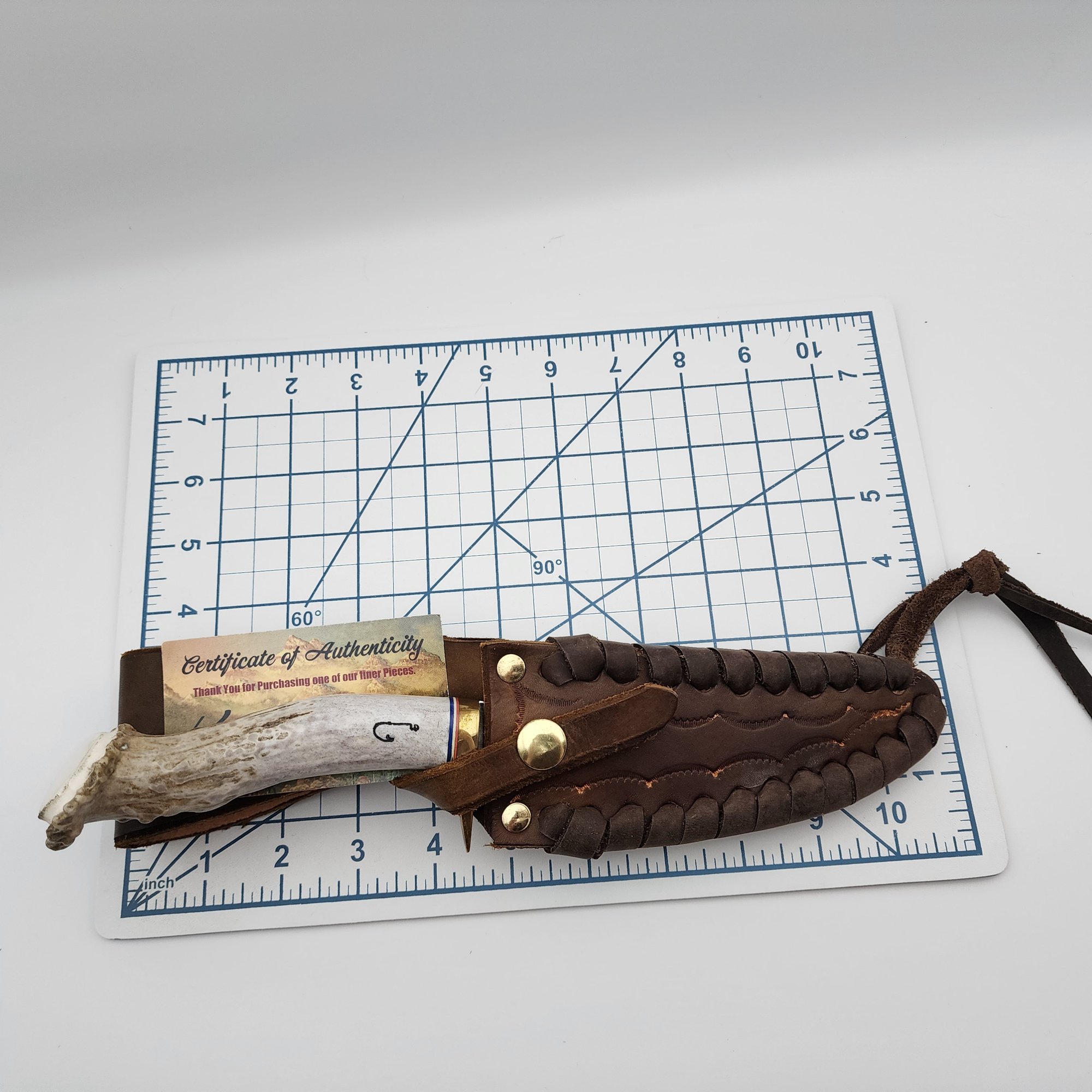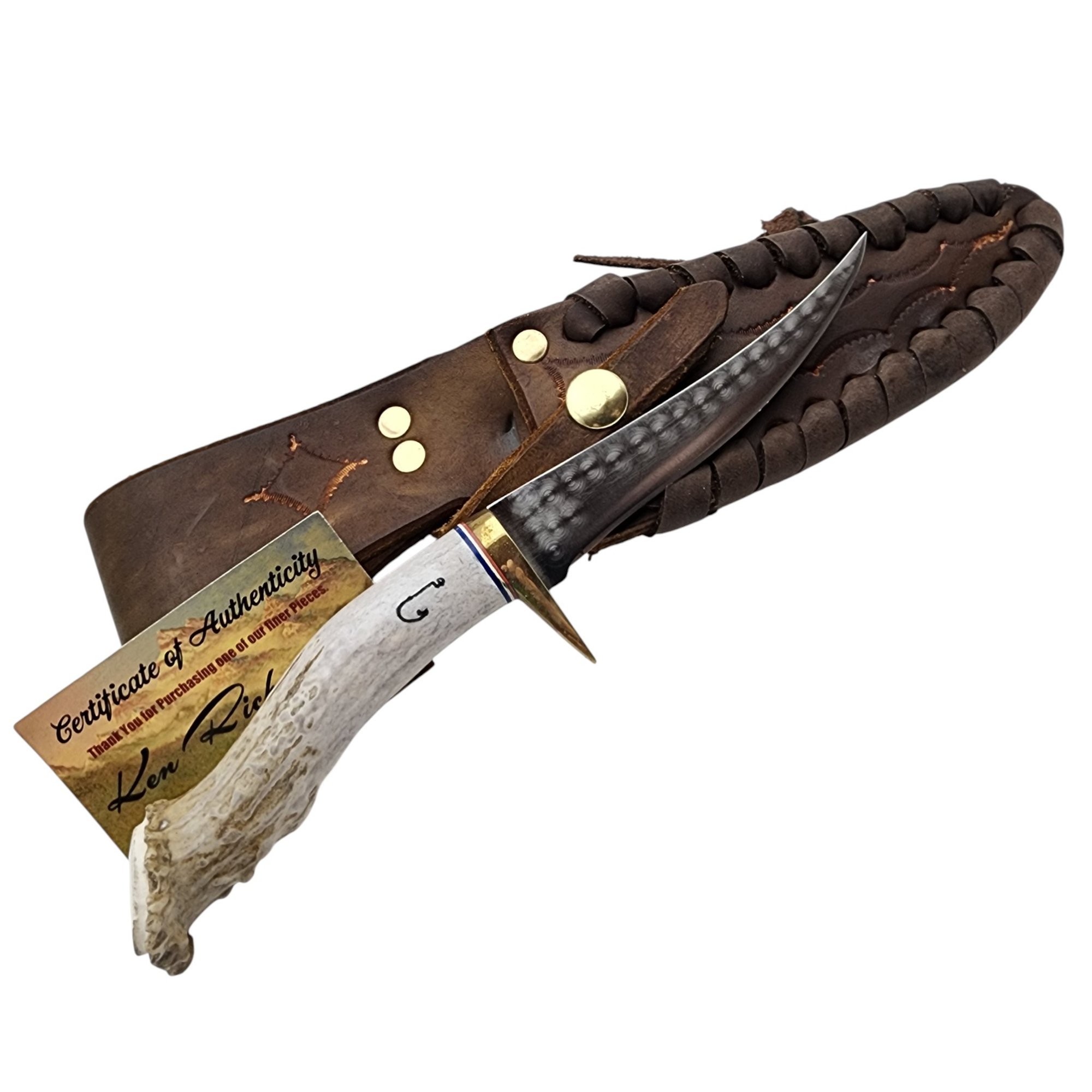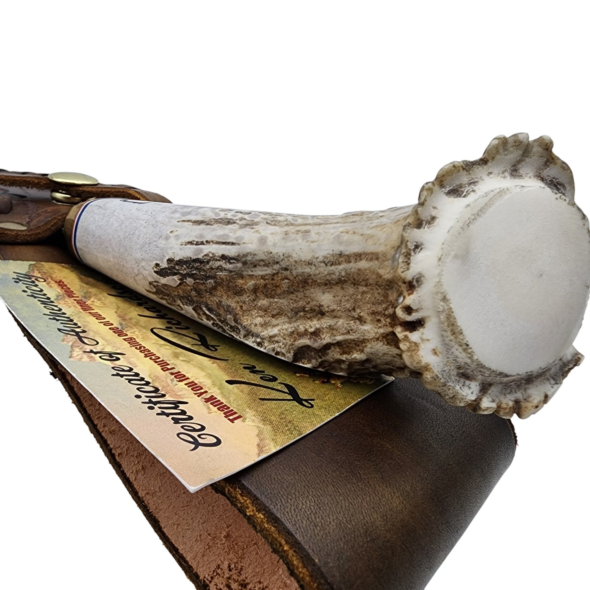 Southwestern Ken Richardson Handmade Carved Antler Knife and Coordinating Handstamped Leather Sheath / Handle portion is approximately 5" and knife blade is approximately 4.5" – total knife measurement of approximately 9.5" / Knife (not including sheath weight) weighs approximately 151g. Comes with the artist’s ‘Certificate of Authenticity’ card / Appears new or like new / We are not knife experts – please ask any additional questions before bidding. Non-jewelry/large items in this auction ship for the cost of postage plus $20 for handling/materials per invoice.