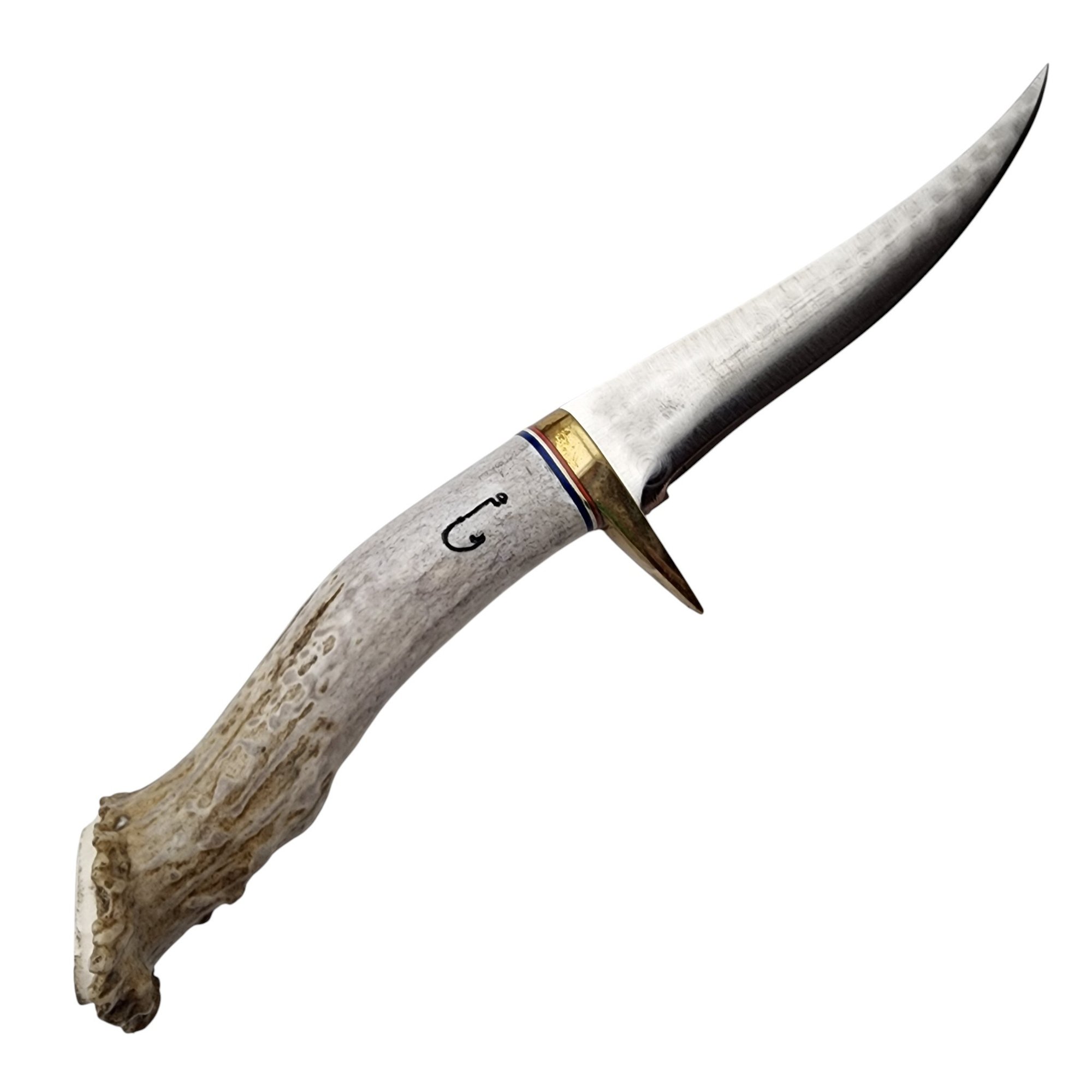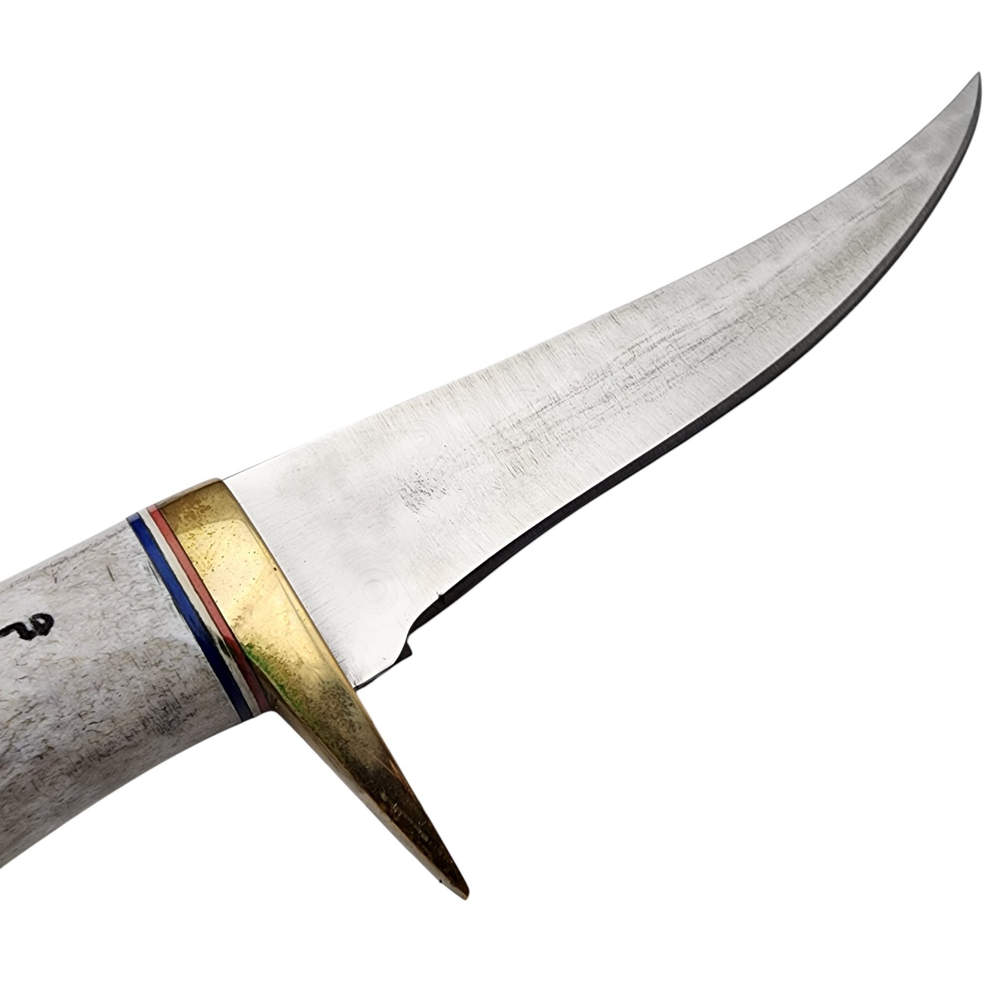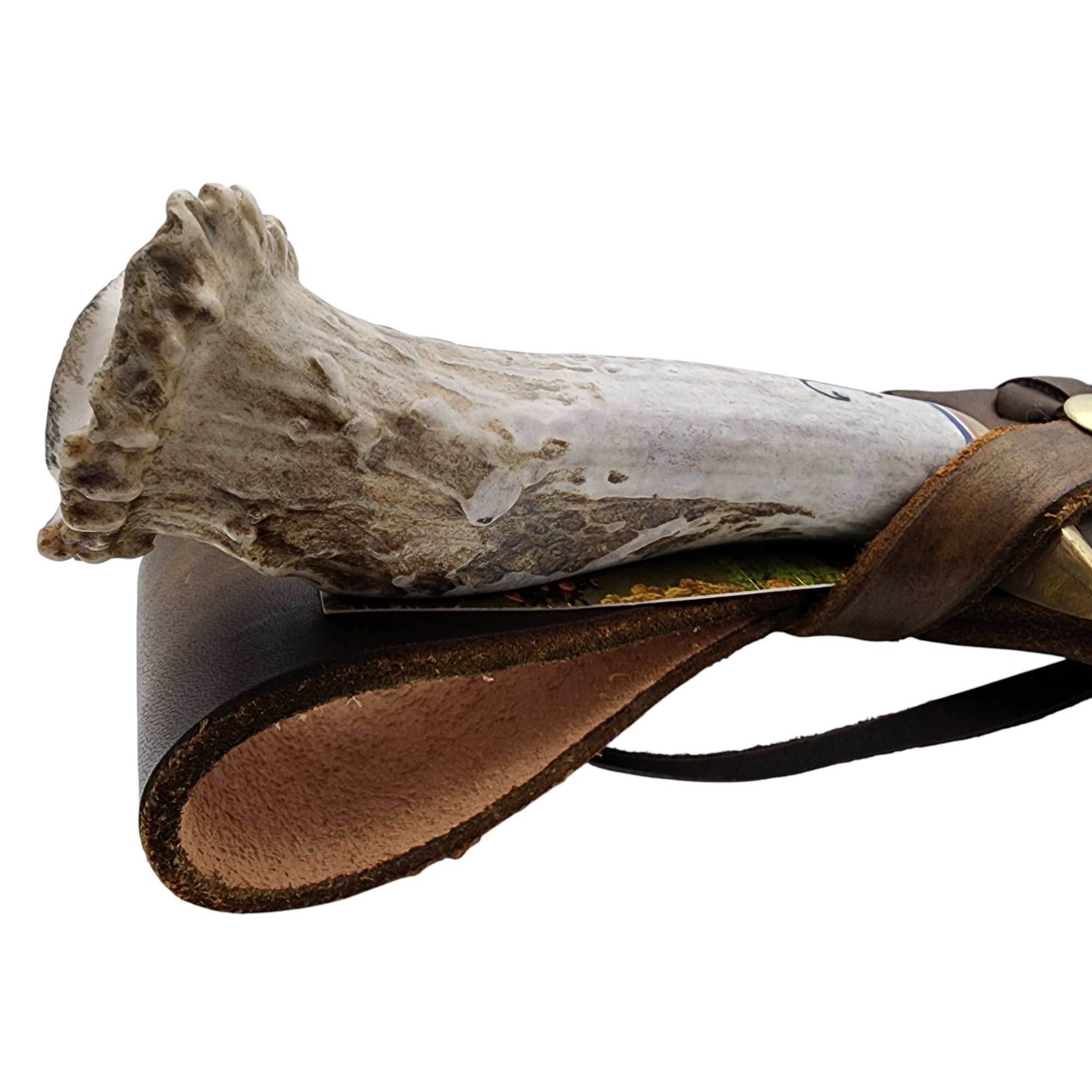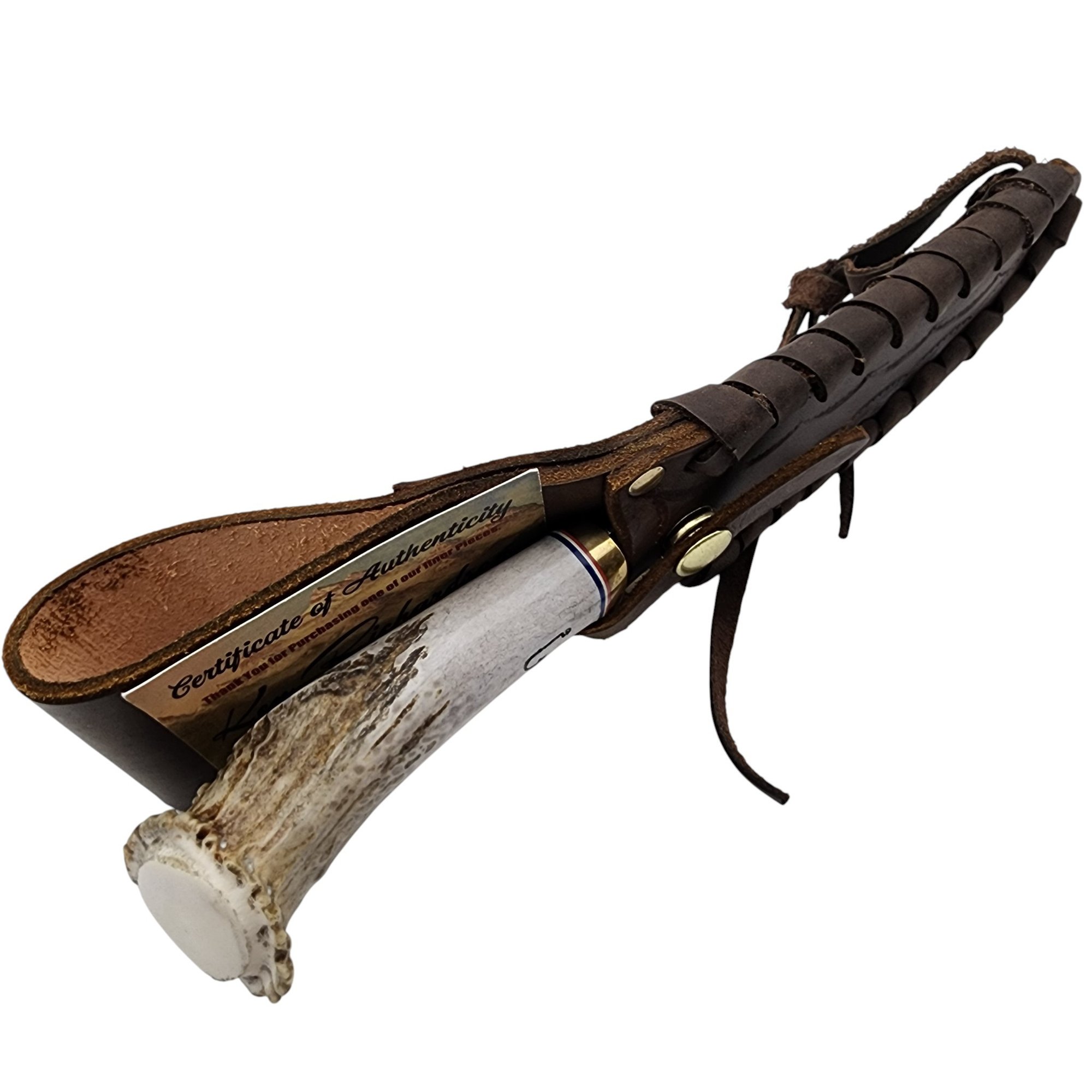 Southwestern Ken Richardson Handmade Carved Antler Knife and Coordinating Handstamped Leather Sheath / Handle portion is approximately 5" and knife blade is approximately 4.5" – total knife measurement of approximately 9.5" / Knife (not including sheath weight) weighs approximately 151g. Comes with the artist’s ‘Certificate of Authenticity’ card / Appears new or like new / We are not knife experts – please ask any additional questions before bidding. Non-jewelry/large items in this auction ship for the cost of postage plus $20 for handling/materials per invoice.