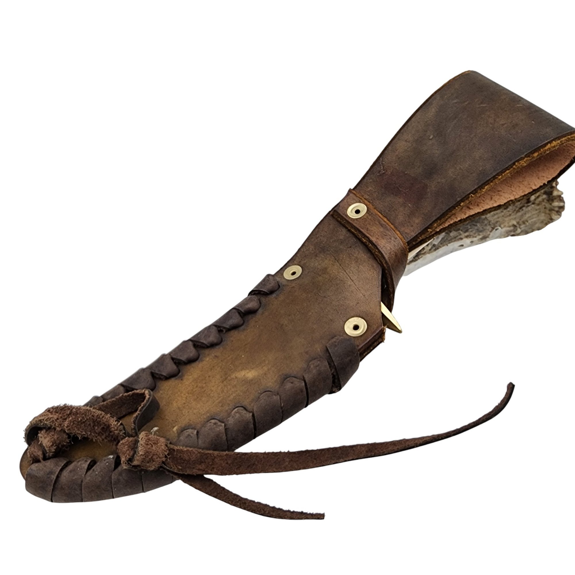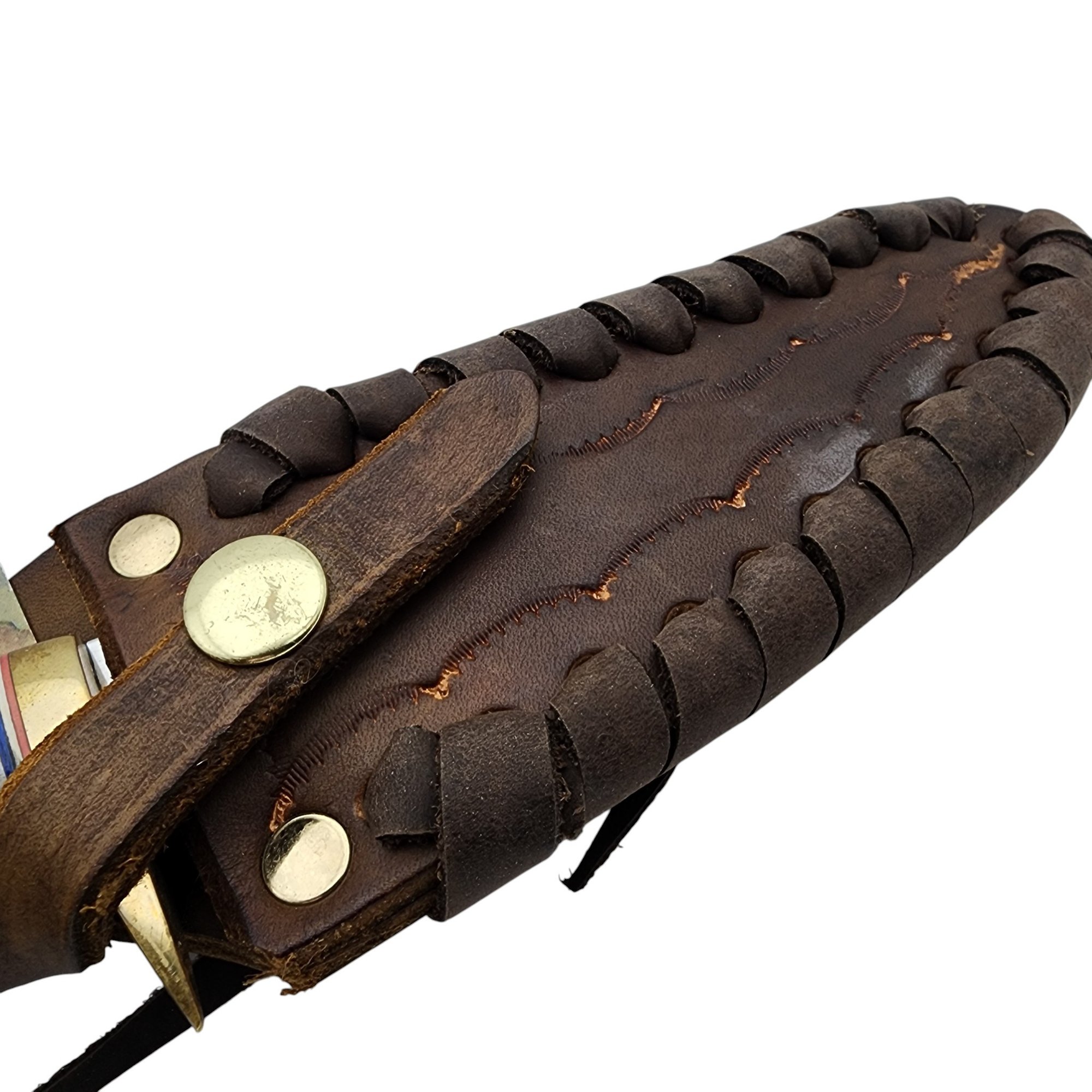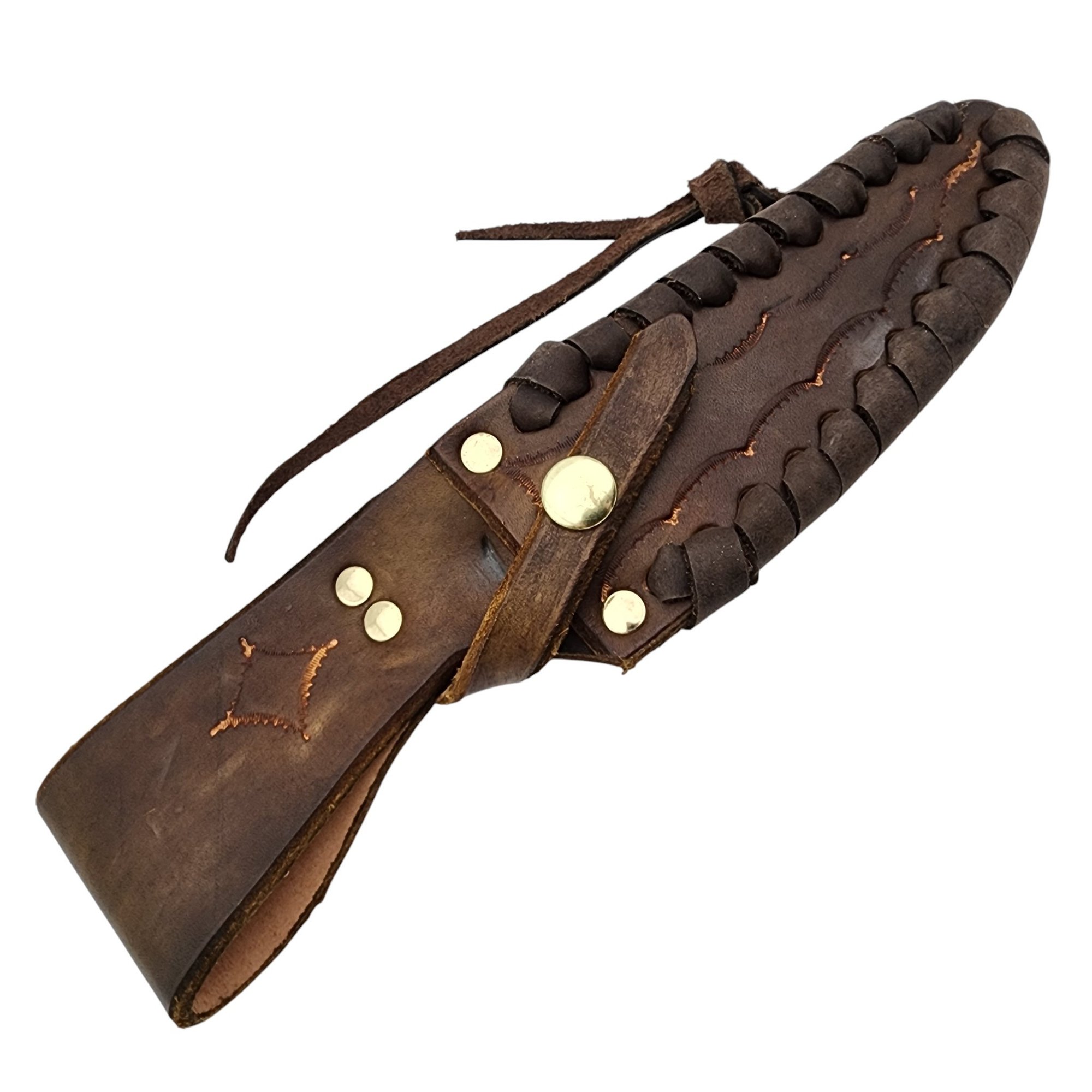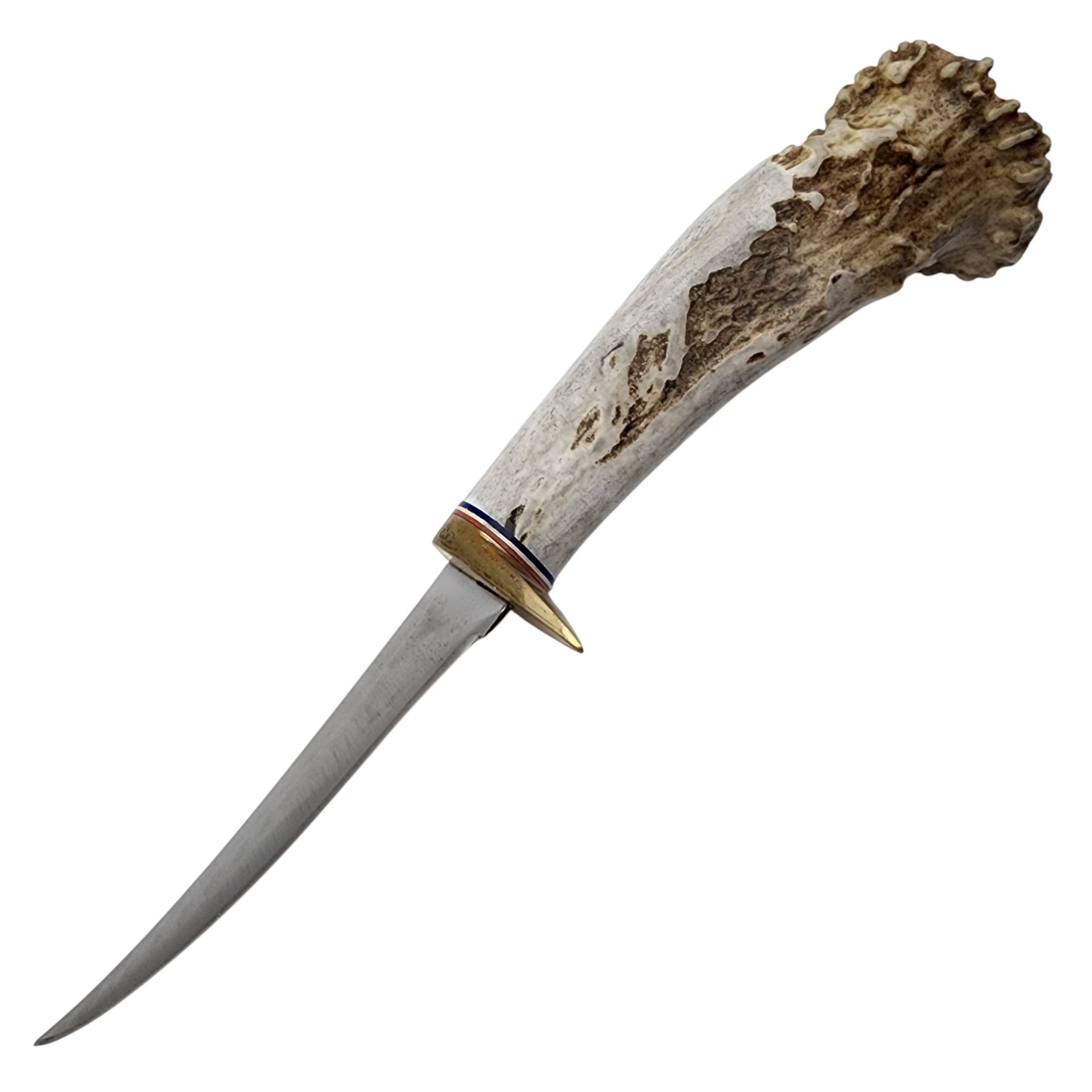 Southwestern Ken Richardson Handmade Carved Antler Knife and Coordinating Handstamped Leather Sheath / Handle portion is approximately 5" and knife blade is approximately 4.5" – total knife measurement of approximately 9.5" / Knife (not including sheath weight) weighs approximately 151g. Comes with the artist’s ‘Certificate of Authenticity’ card / Appears new or like new / We are not knife experts – please ask any additional questions before bidding. Non-jewelry/large items in this auction ship for the cost of postage plus $20 for handling/materials per invoice.
