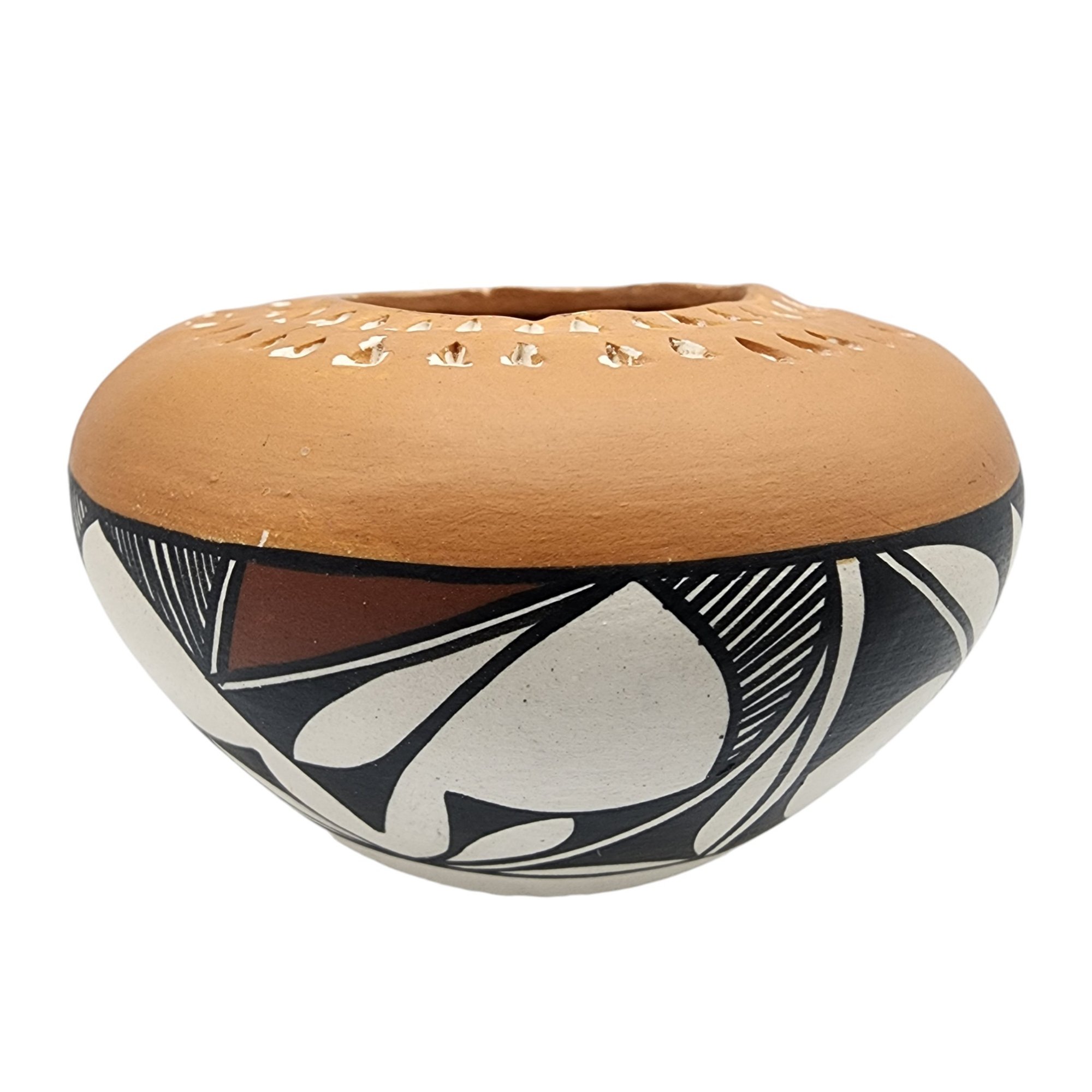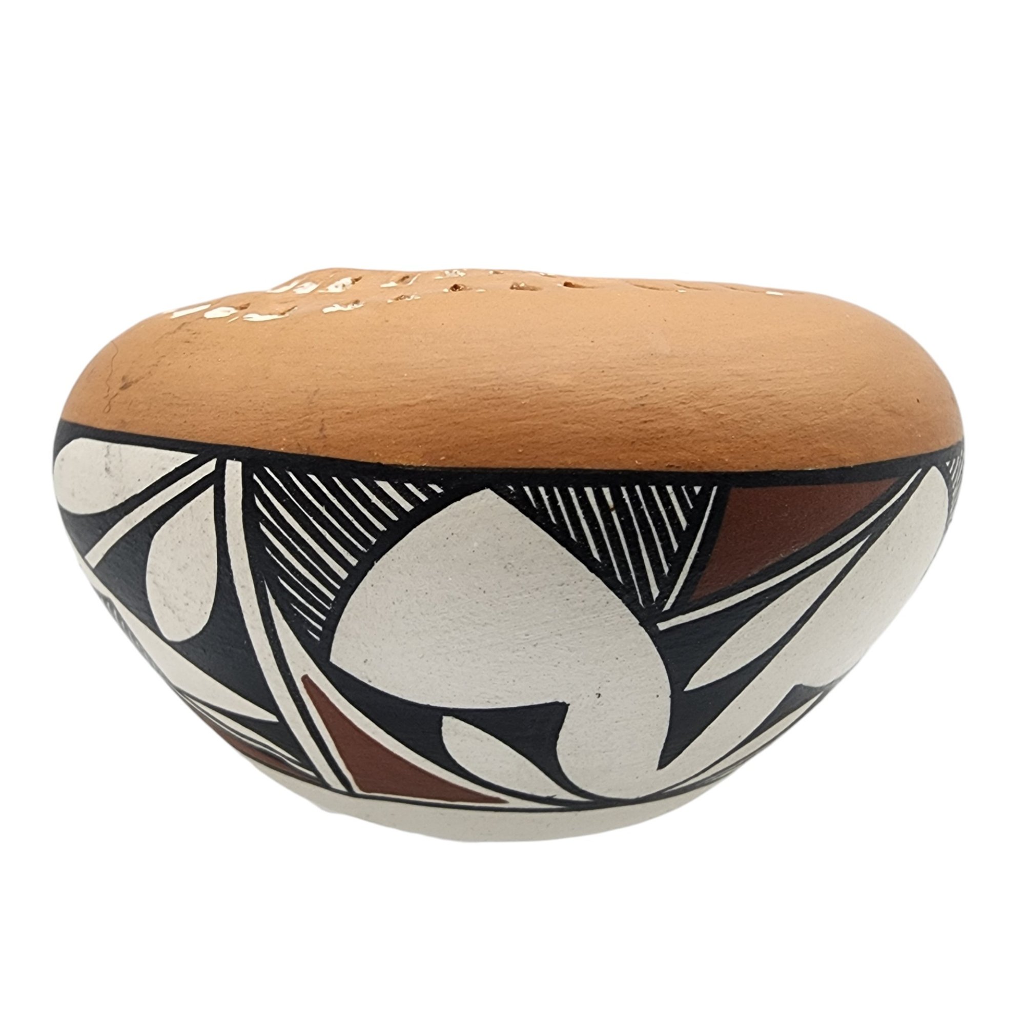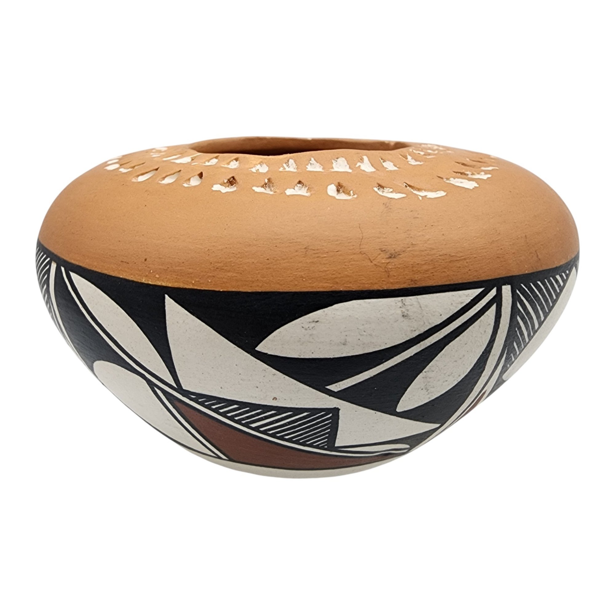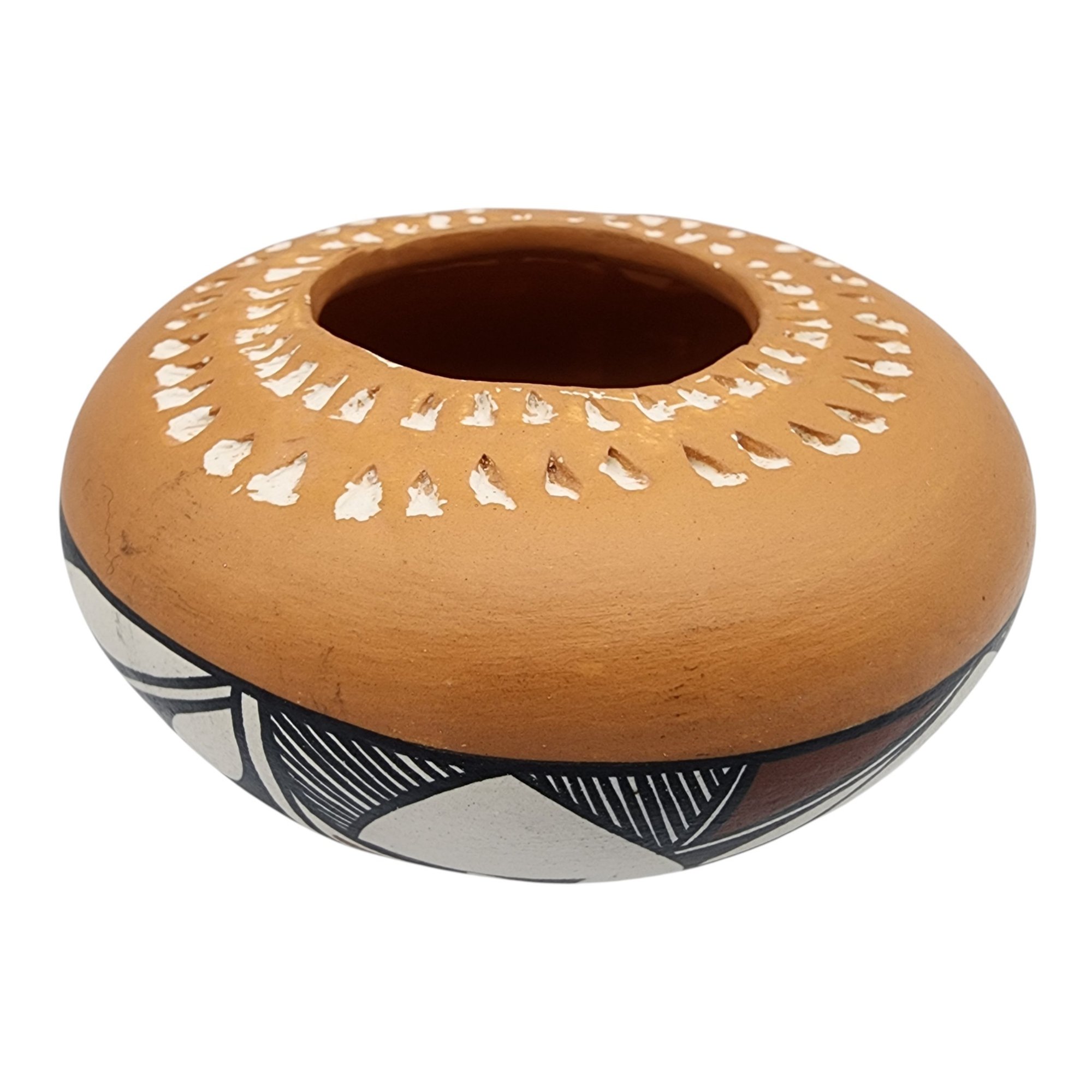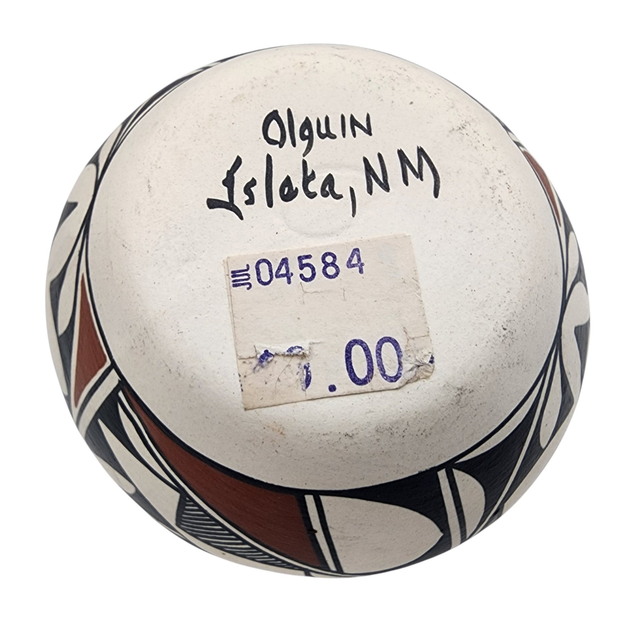 Elizabeth Olguin (or S.M. Olguin) Isleta Pueblo Painted Polychrome Pottery Jar / 73g / 1.7″h x 3″d / This item is part of an estate collection of Native American fetishes, pottery, baskets, and rugs acquired by a collector who traveled throughout the Southwest between the 1970s and early 2000s. Many pieces were purchased from trading posts in Arizona and New Mexico. Artist attributions are based on available documentation, including receipts, tags, stickers, and signatures where present. Select items include original or copied receipts and original tags identifying artists pricing at the time of purchase, primarily from the 1970s through the 1990s. Non-jewelry/large items in this auction ship for the cost of postage plus $20 for handling/materials per invoice. Please ask any questions prior to bidding. Thank you!