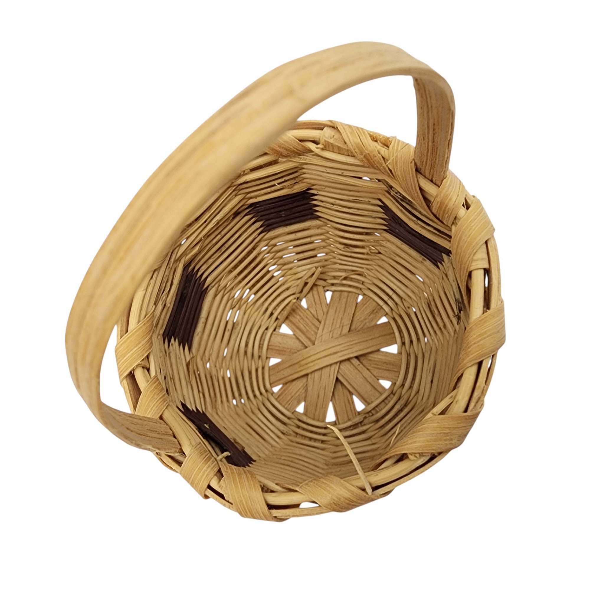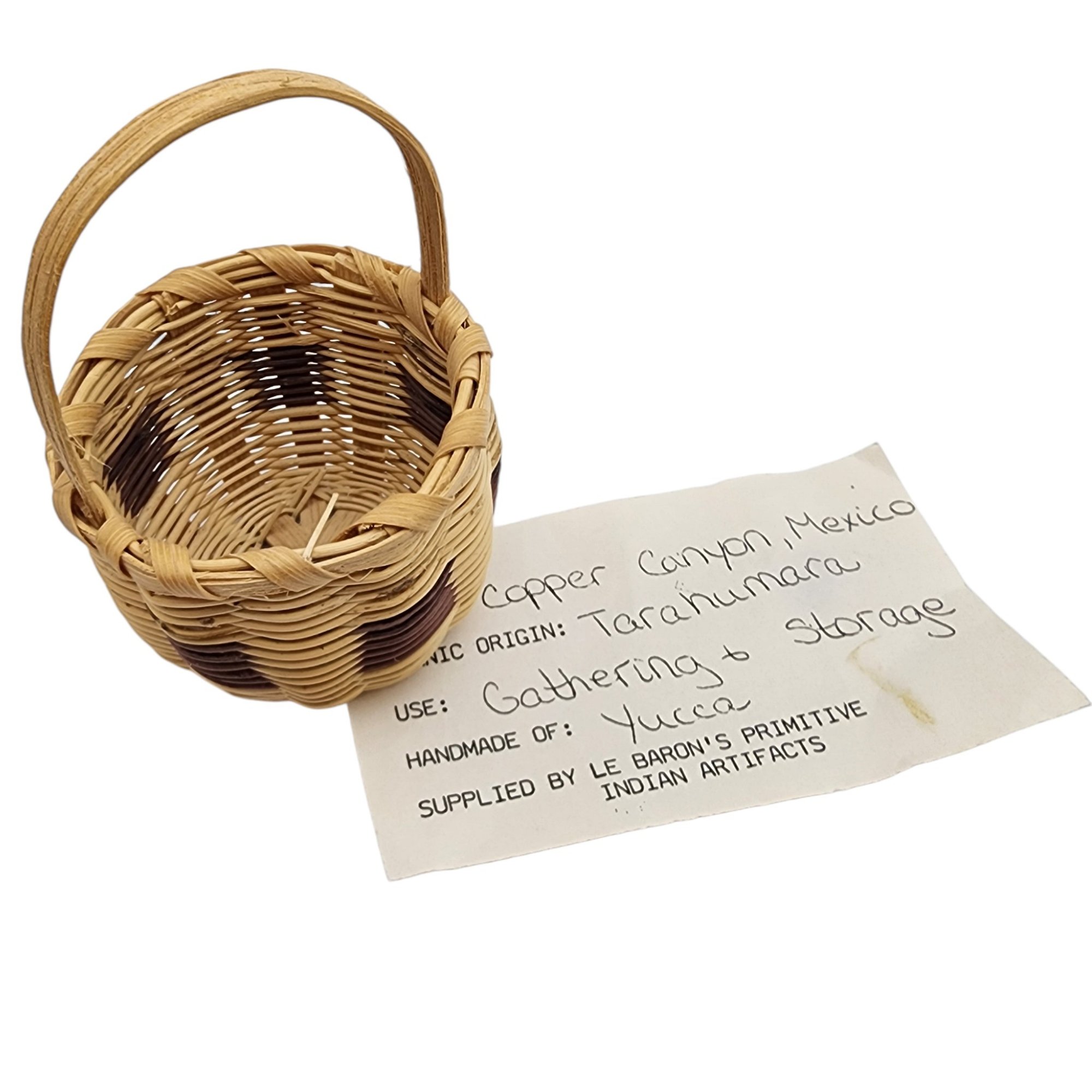 Tarahumara Indian (of Copper Canyon, Mexico) Miniature Gathering and Storage Yucca Plant Basket / 6g / 3.3″ x 2.2″d / This item is part of an estate collection of Native American fetishes, pottery, baskets, and rugs acquired by a collector who traveled throughout the Southwest between the 1970s and early 2000s. Many pieces were purchased from trading posts in Arizona and New Mexico. Artist attributions are based on available documentation, including receipts, tags, stickers, and signatures where present. Select items include original or copied receipts and original tags identifying artists pricing at the time of purchase, primarily from the 1970s through the 1990s. Non-jewelry/large items in this auction ship for the cost of postage plus $20 for handling/materials per invoice. Please ask any questions prior to bidding. Thank you!