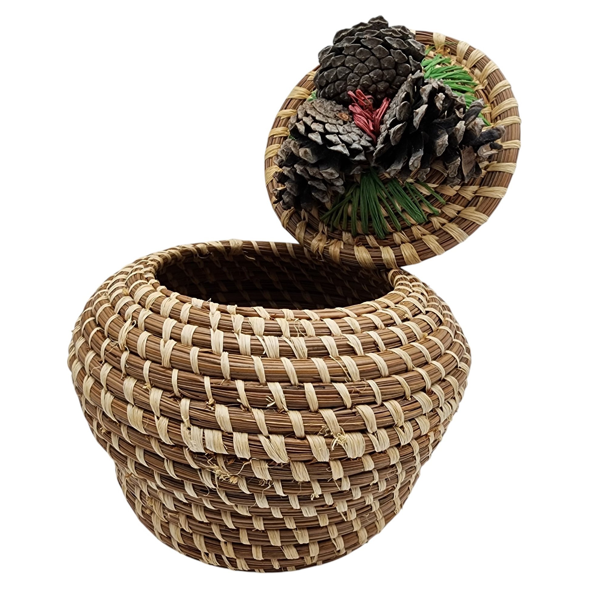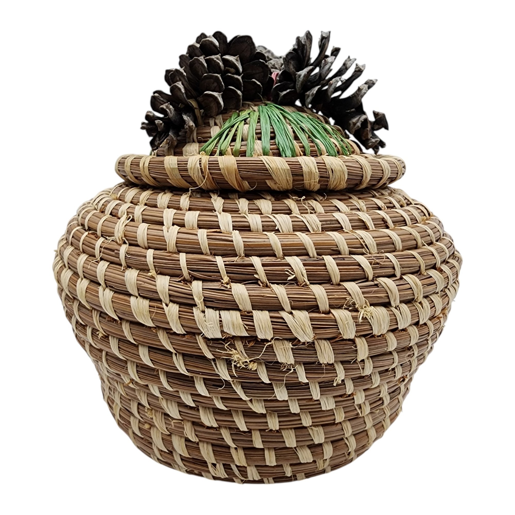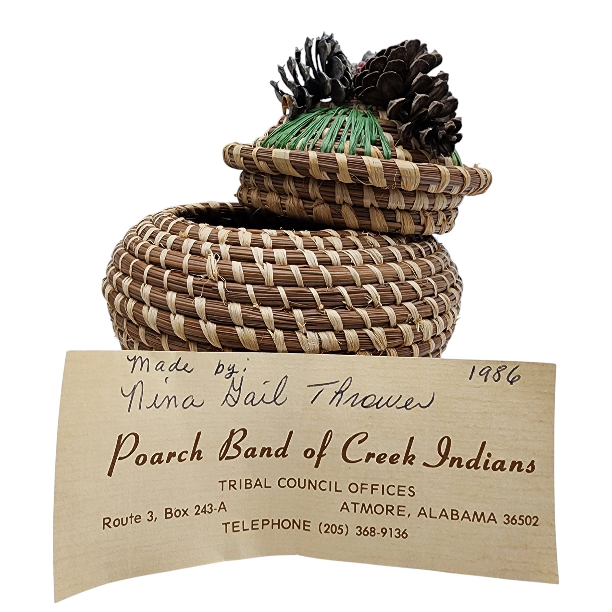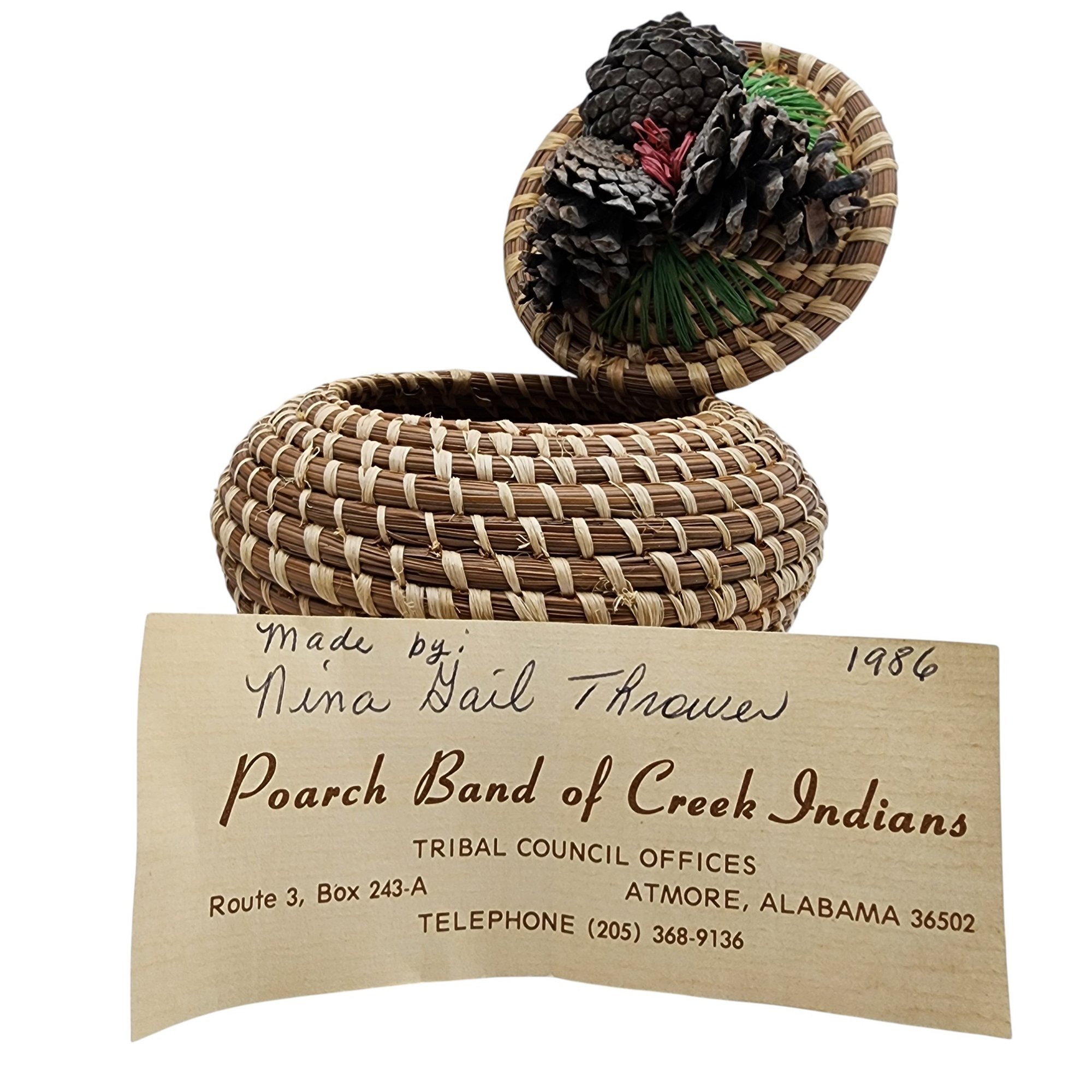 Poarch Band of Creek Indians Pine Cone Lidded Basket by Nina Gail Thrower, 1986 / 124g / 4.8″ x 5″d / Comes with tag given at time of purchase. Non-jewelry/large items in this auction ship for the cost of postage plus $20 for handling/materials per invoice. Please ask any questions prior to bidding. Thank you!