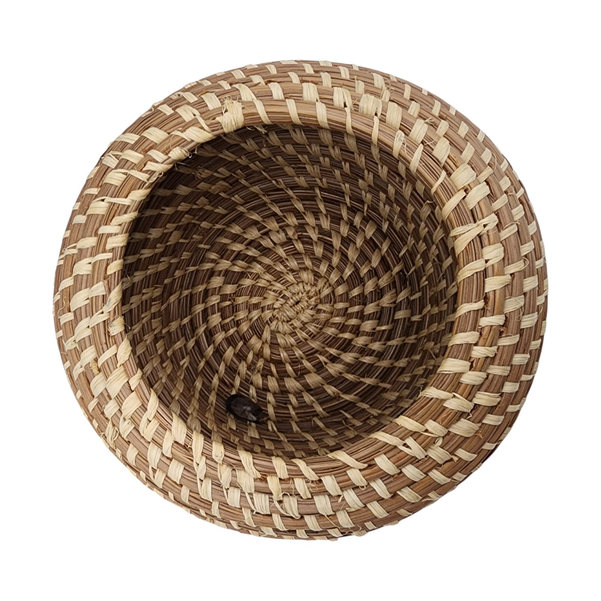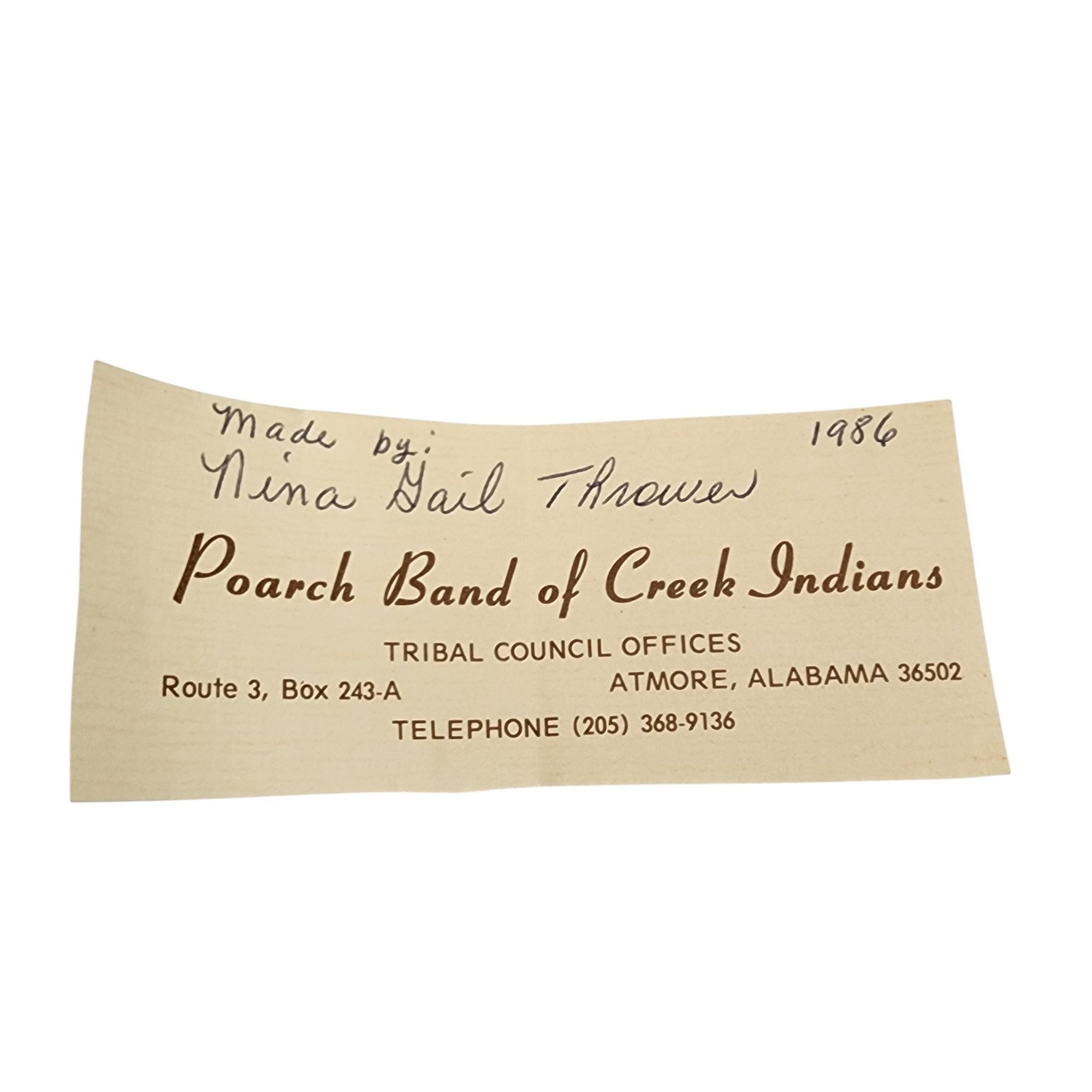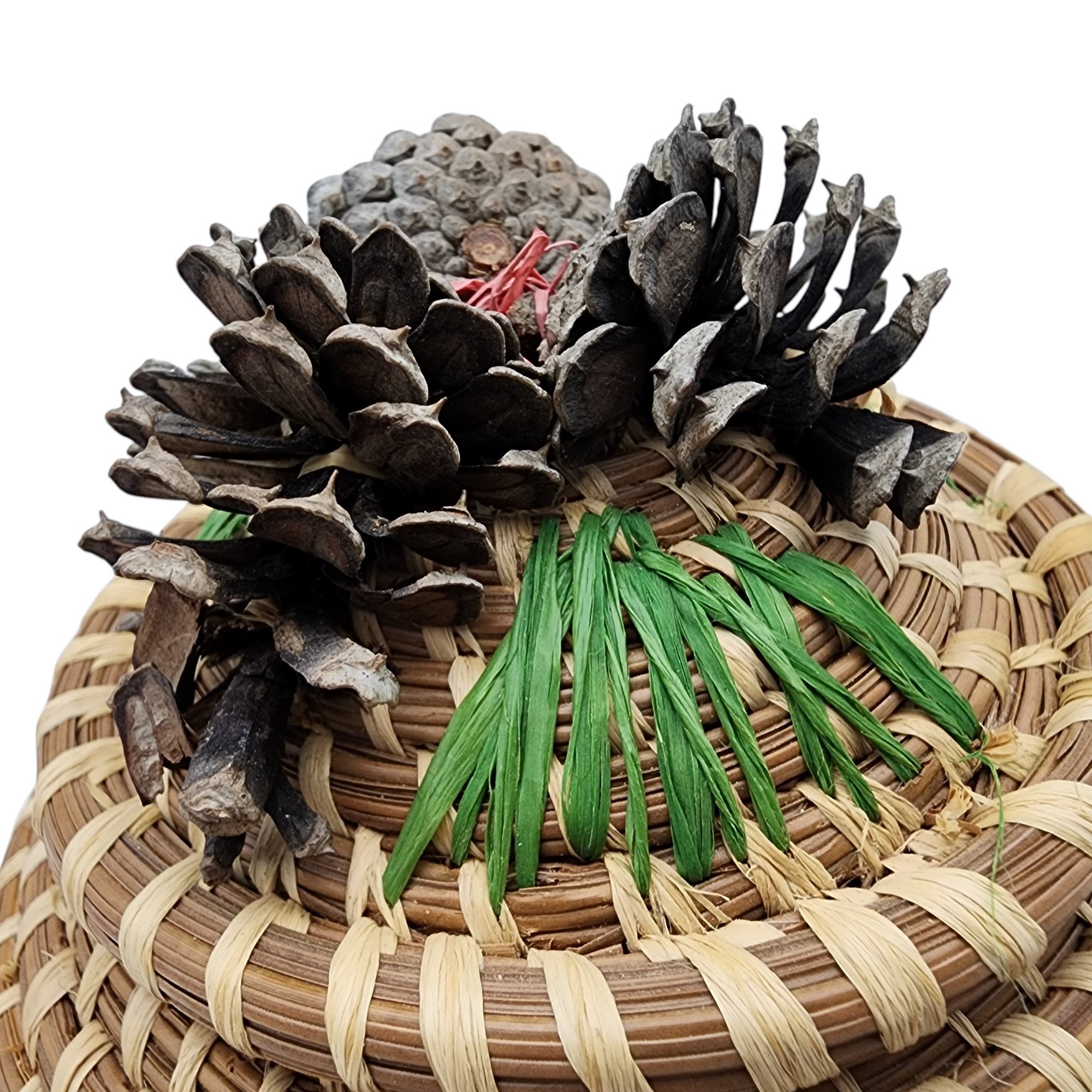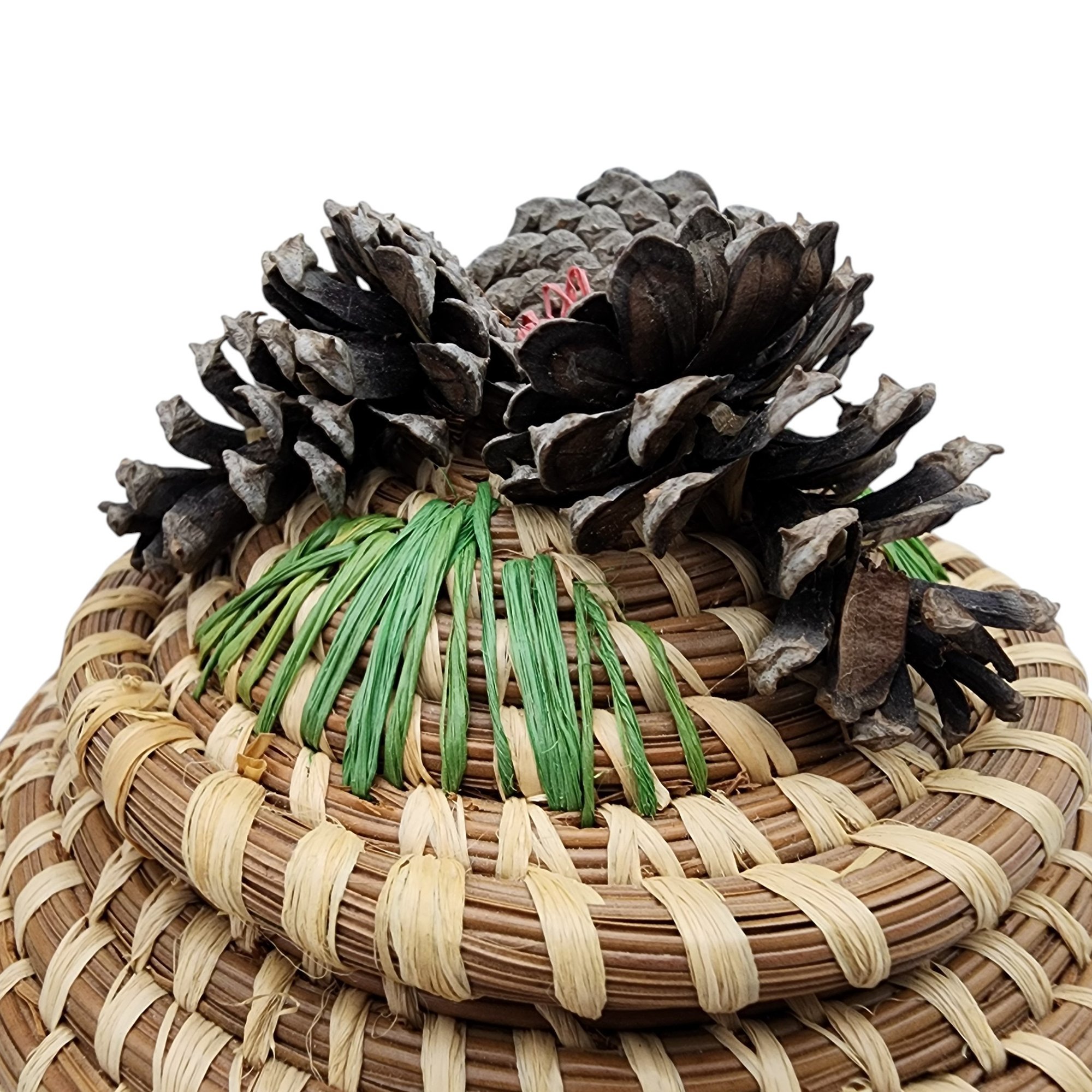 Poarch Band of Creek Indians Pine Cone Lidded Basket by Nina Gail Thrower, 1986 / 124g / 4.8″ x 5″d / Comes with tag given at time of purchase. Non-jewelry/large items in this auction ship for the cost of postage plus $20 for handling/materials per invoice. Please ask any questions prior to bidding. Thank you!