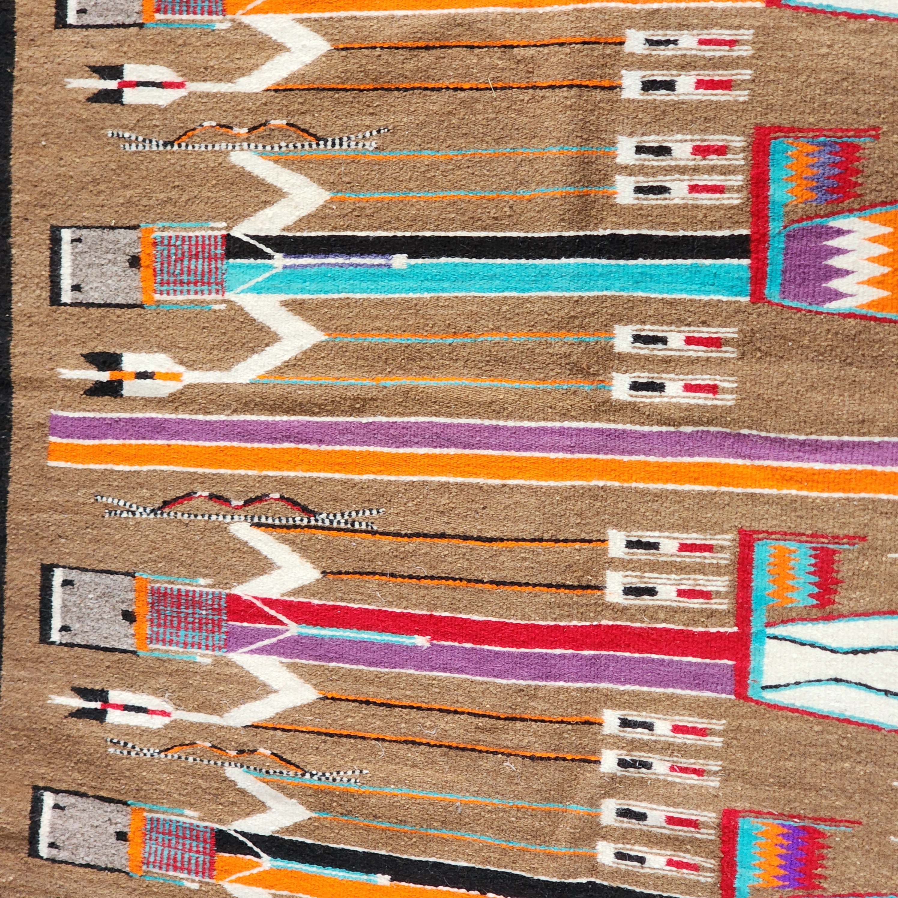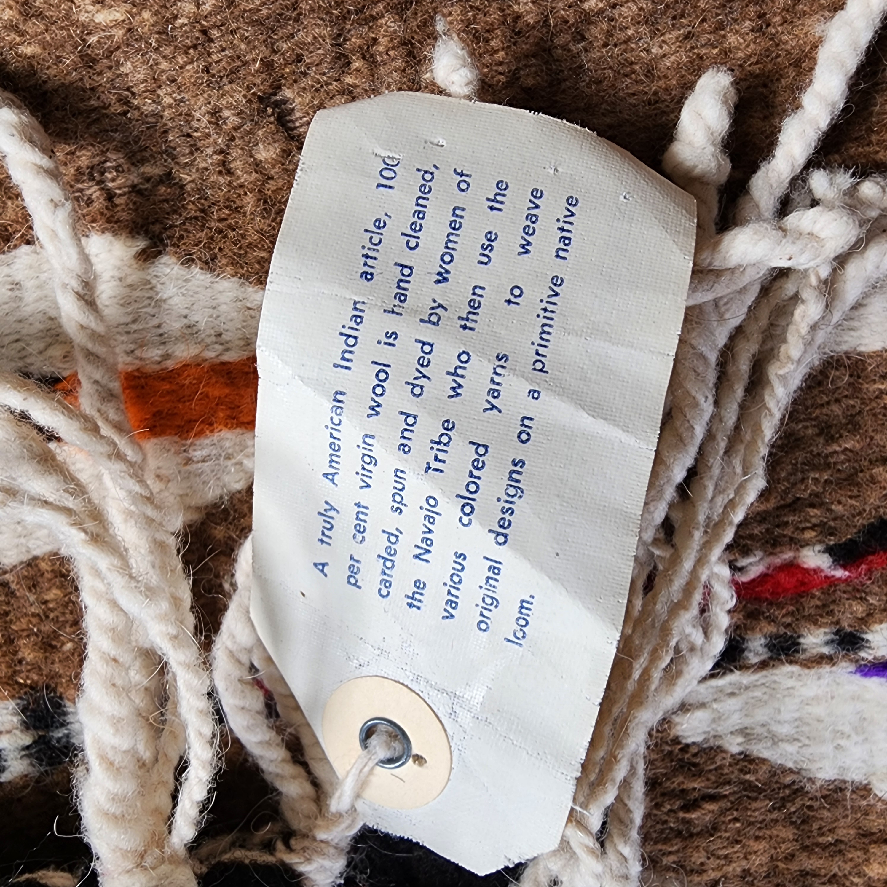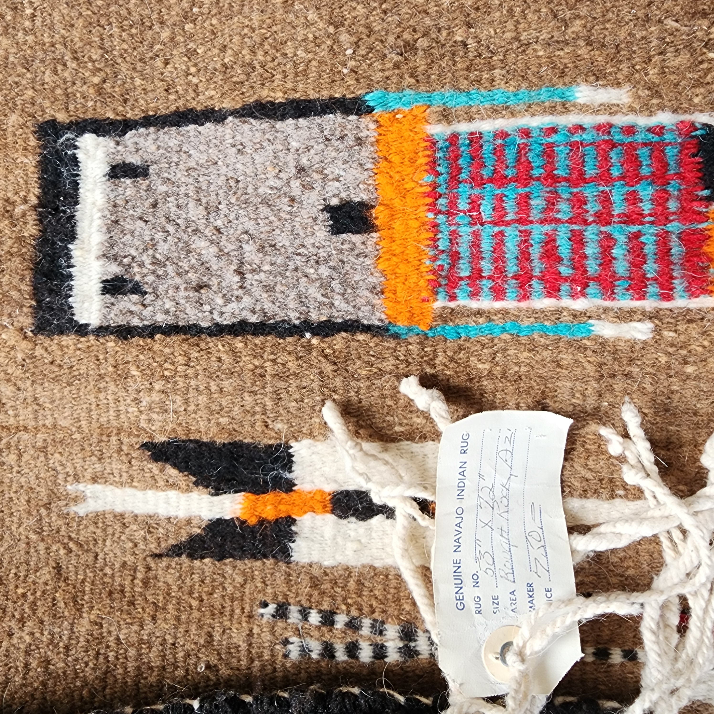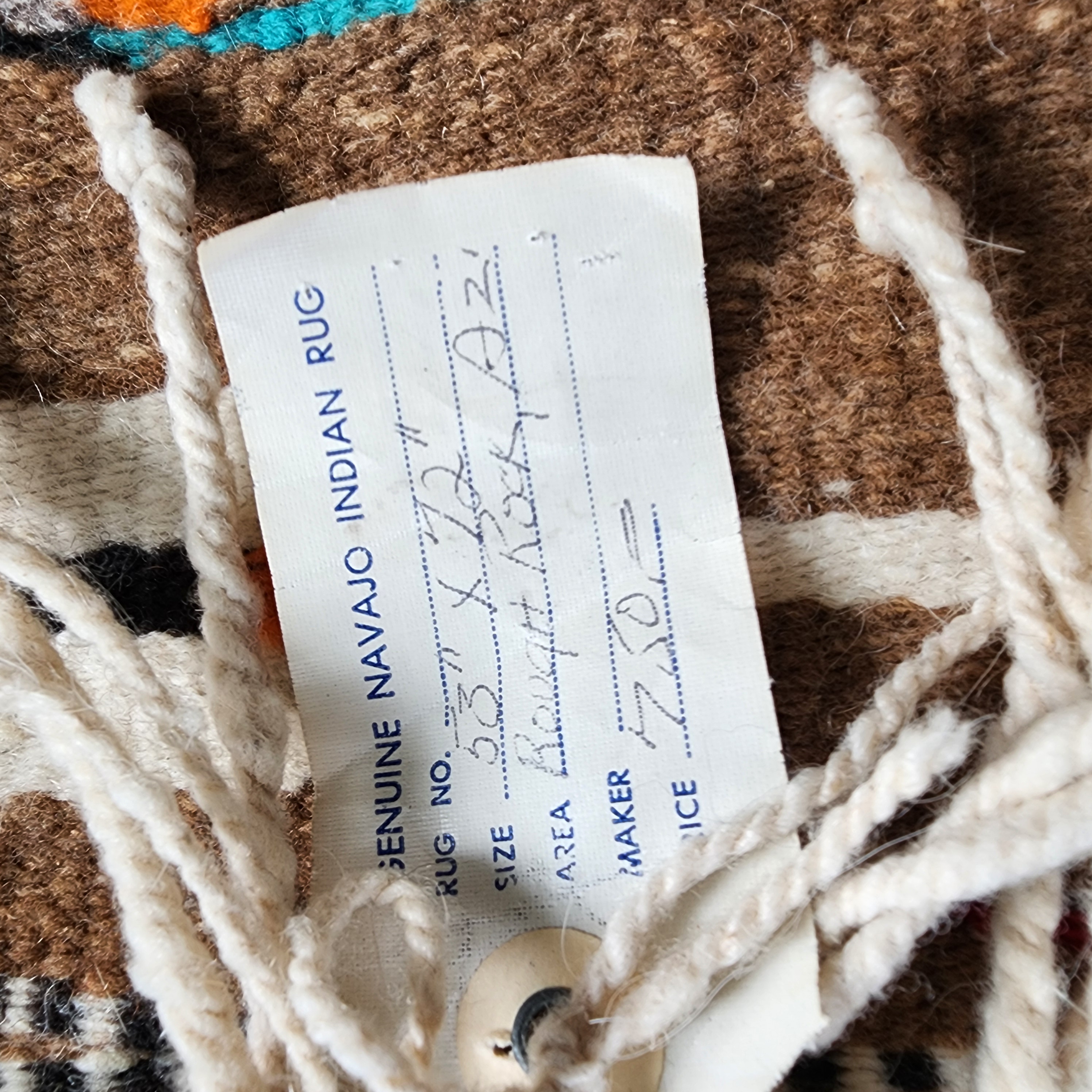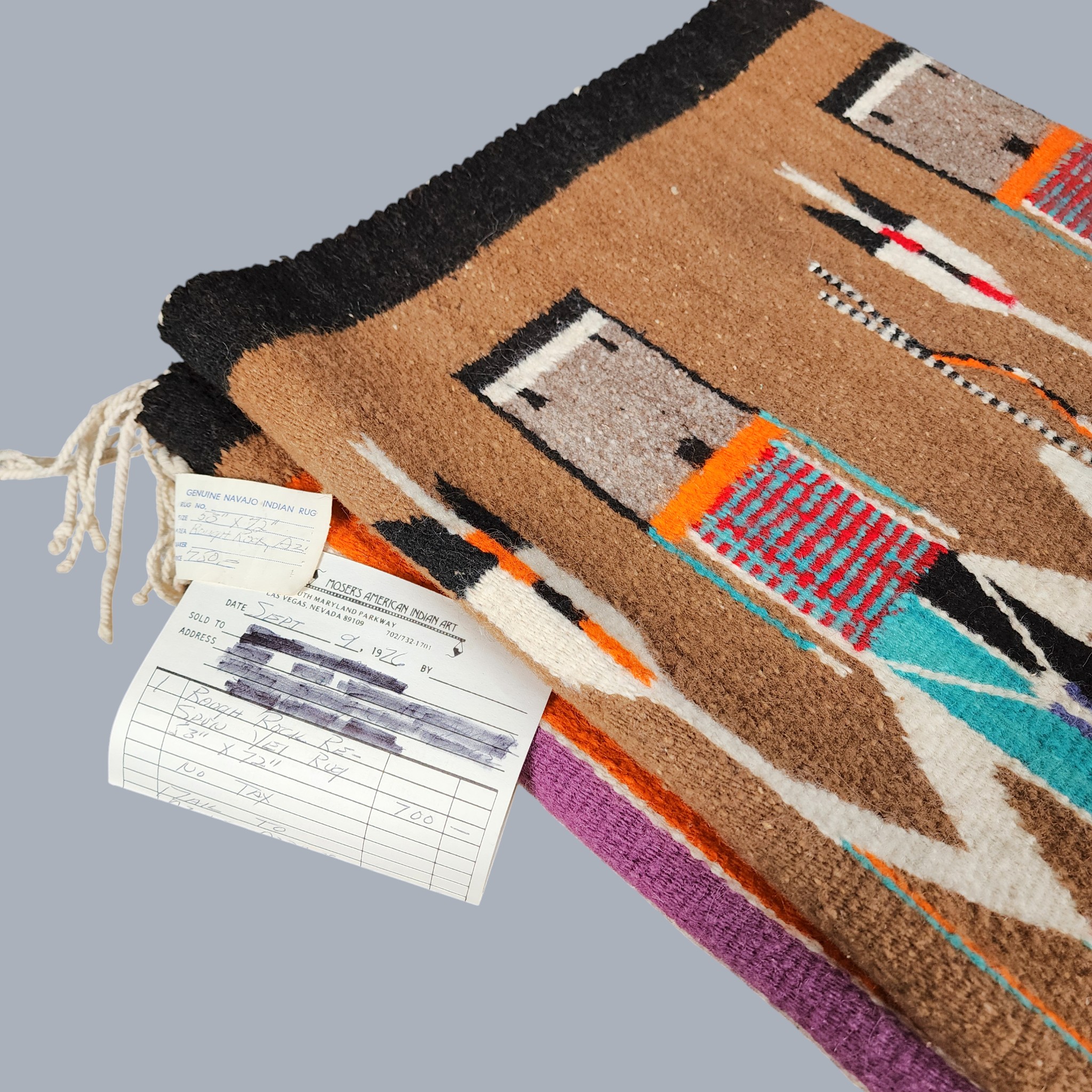 Vintage Genuine Navajo Indian Handmade Yei be Chei Wool Rug, 53″ x 72″ / The original “Genuine Navajo Indian Rug” tag from time of purchase is attached to the rug. Tag information states that it was made in Rough Rock, AZ with a $750 retail price – the equivalent of over $4,200 in 2026’s dollar. Reverse side of tag reads “A truly American Indian article. 100 per cent virgin wool is hand cleaned, carded, spun and dyed by women of the Navajo Tribe who then use the various colored yarns to weave original designs on a primitive native loom.” Was purchased at a now-closed Trading Post in Nevada – Moser’s American Indian Art in September of 1976. The rug will come with the original receipt/certificate of guarantee from time of purchase. Beautiful colors! Non-jewelry/large items in this auction ship for the cost of postage plus $20 for handling/materials per invoice.