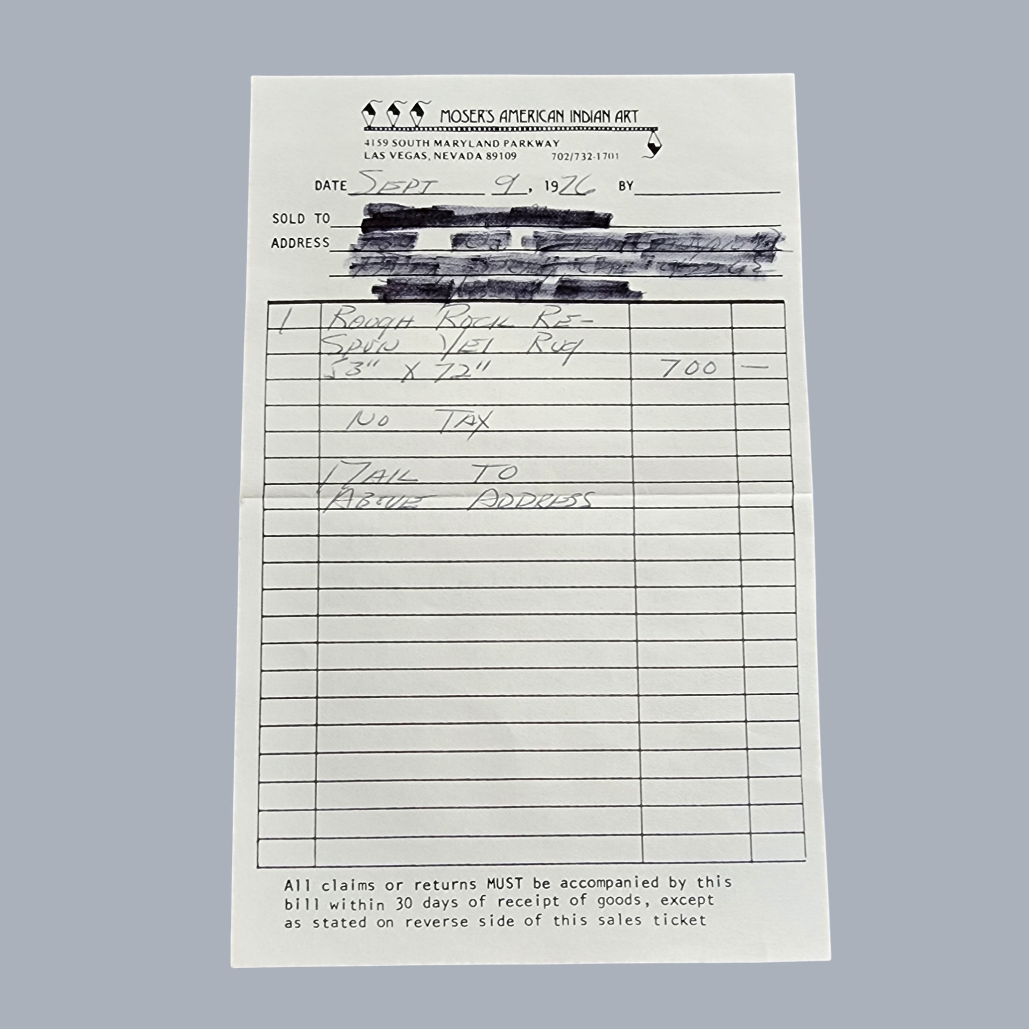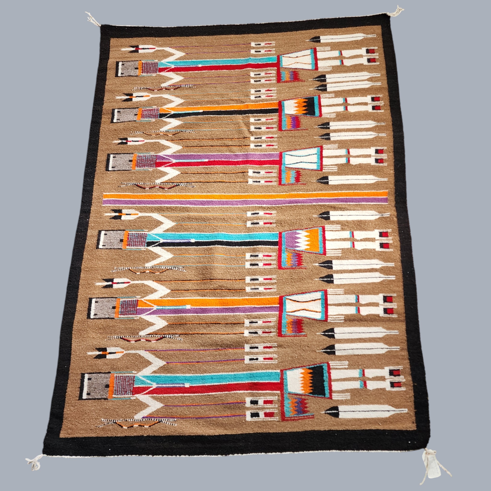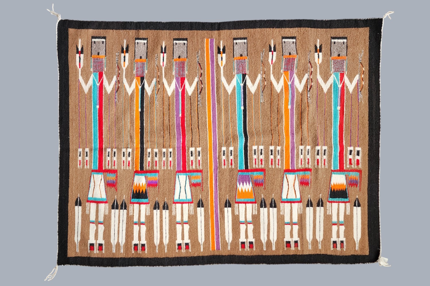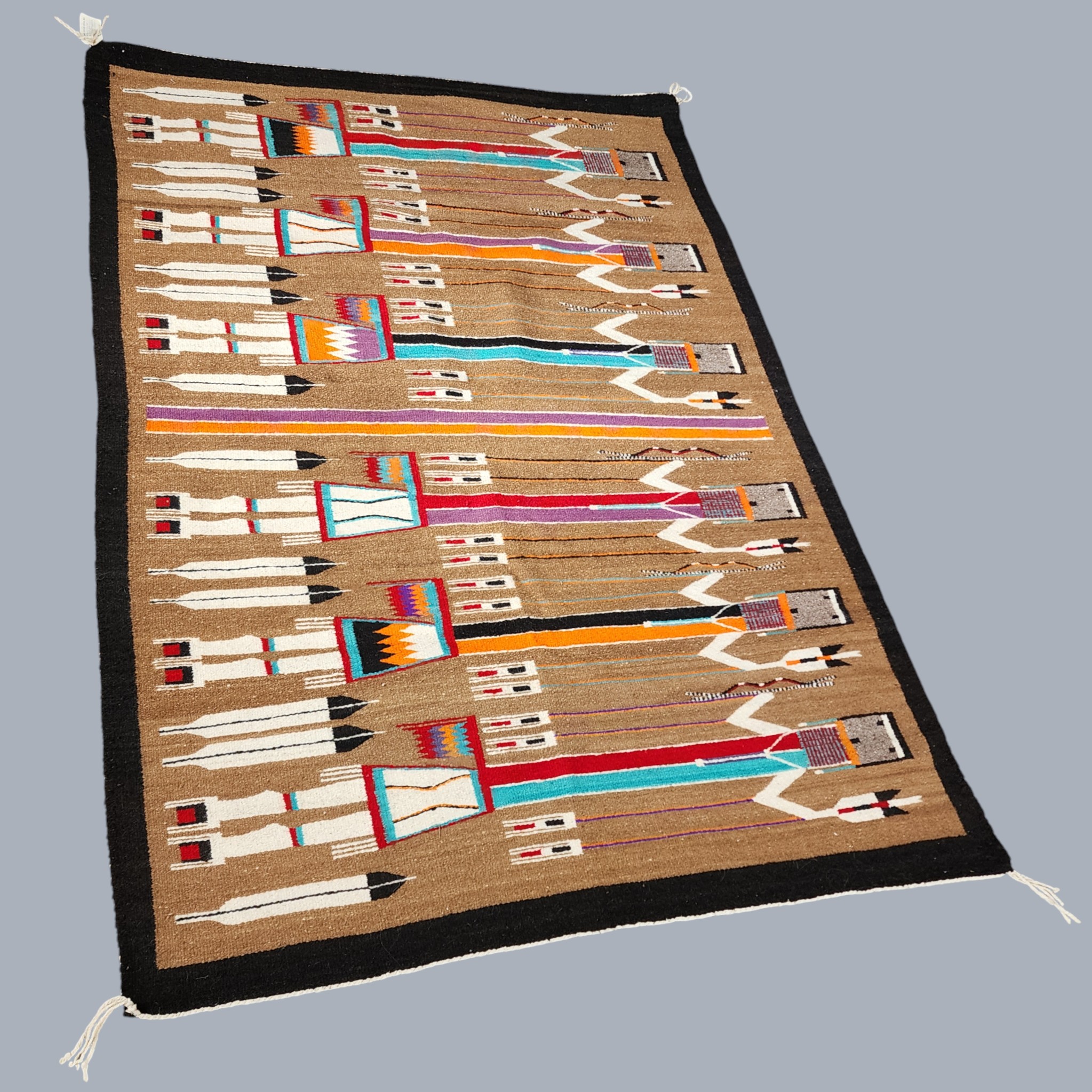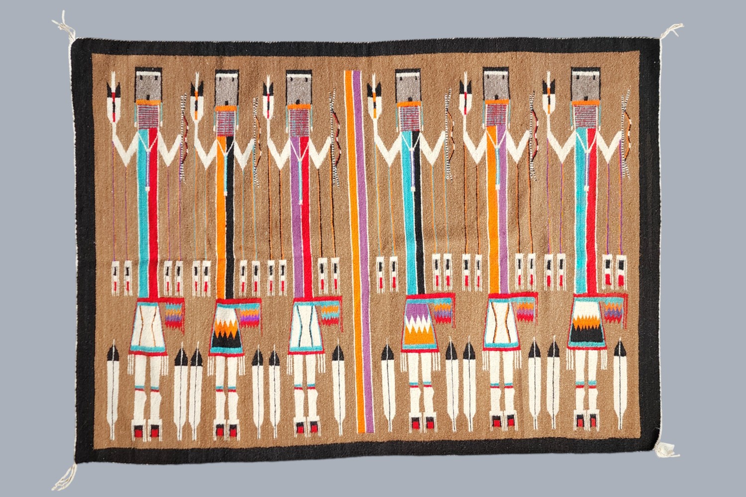 Vintage Genuine Navajo Indian Handmade Yei be Chei Wool Rug, 53″ x 72″ / The original “Genuine Navajo Indian Rug” tag from time of purchase is attached to the rug. Tag information states that it was made in Rough Rock, AZ with a $750 retail price – the equivalent of over $4,200 in 2026’s dollar. Reverse side of tag reads “A truly American Indian article. 100 per cent virgin wool is hand cleaned, carded, spun and dyed by women of the Navajo Tribe who then use the various colored yarns to weave original designs on a primitive native loom.” Was purchased at a now-closed Trading Post in Nevada – Moser’s American Indian Art in September of 1976. The rug will come with the original receipt/certificate of guarantee from time of purchase. Beautiful colors! Non-jewelry/large items in this auction ship for the cost of postage plus $20 for handling/materials per invoice.