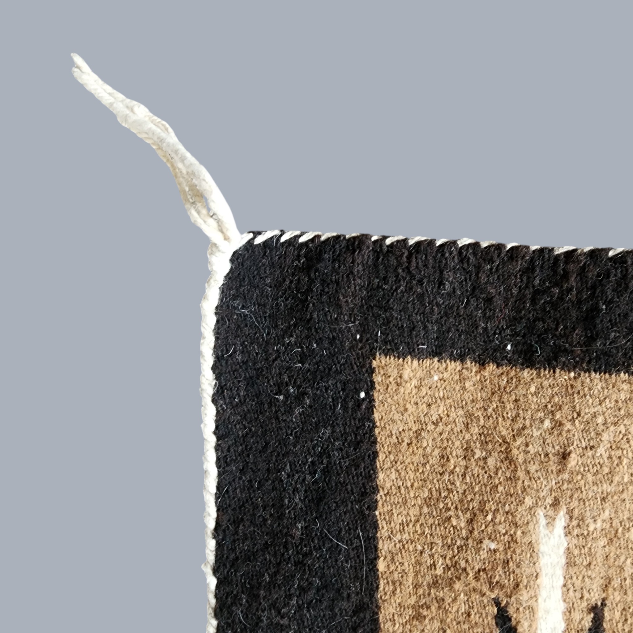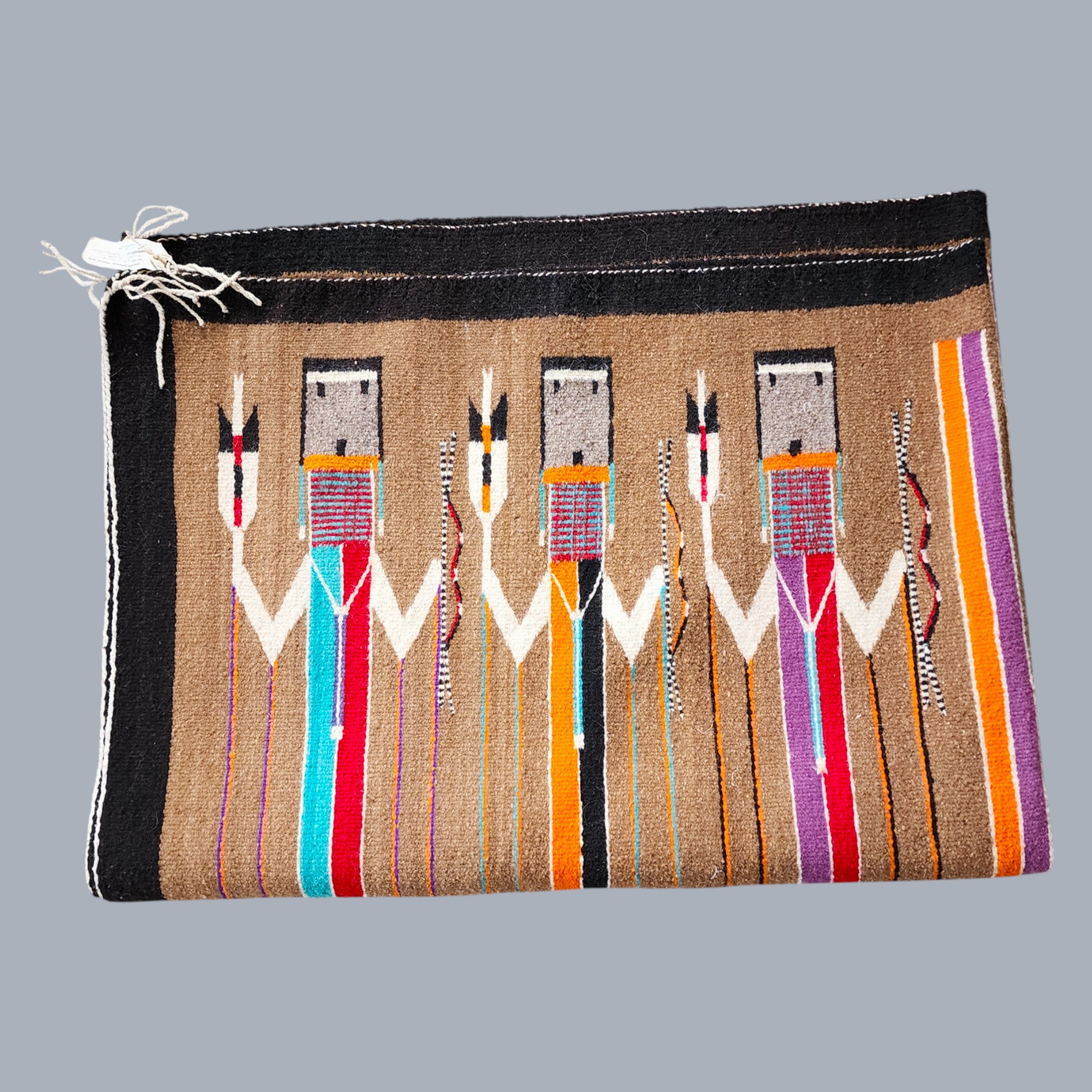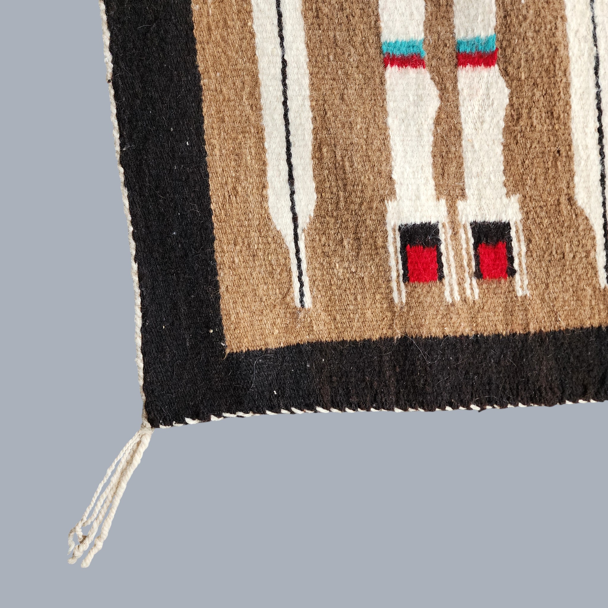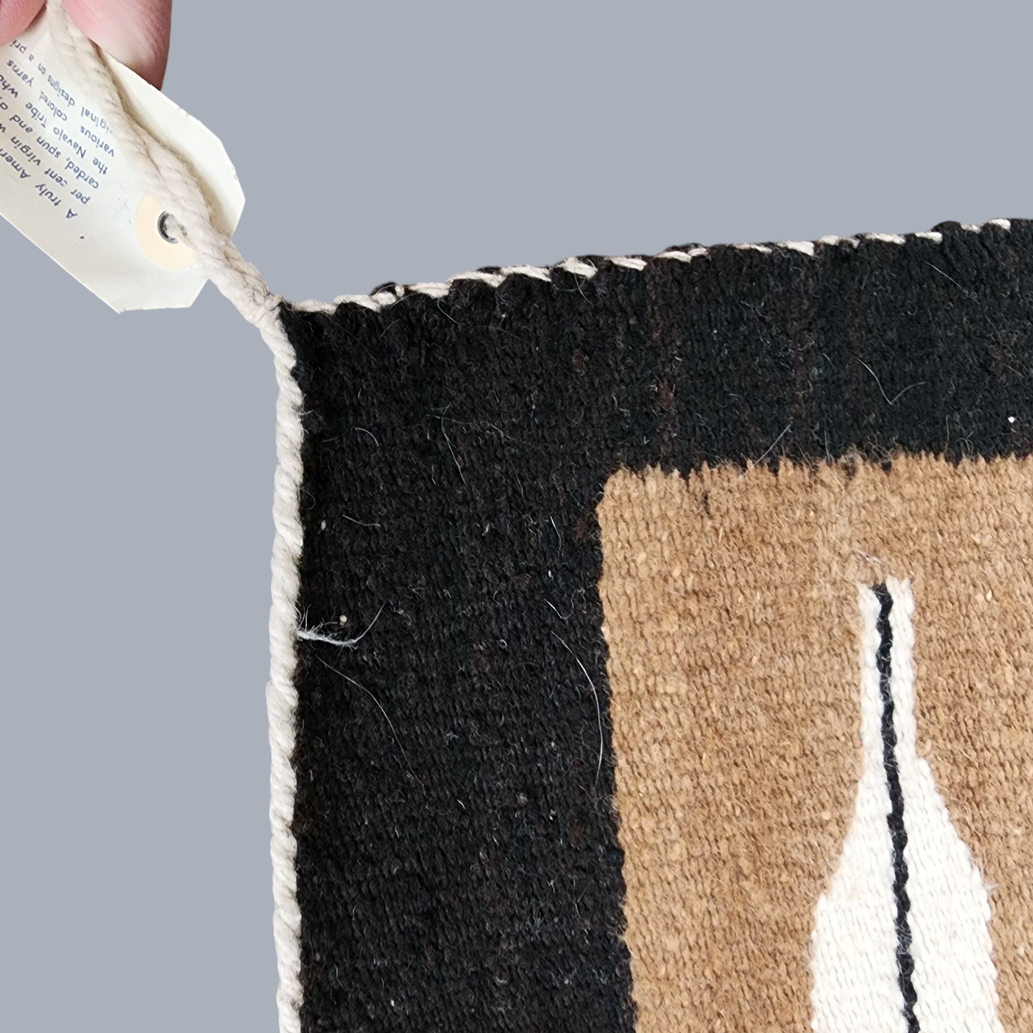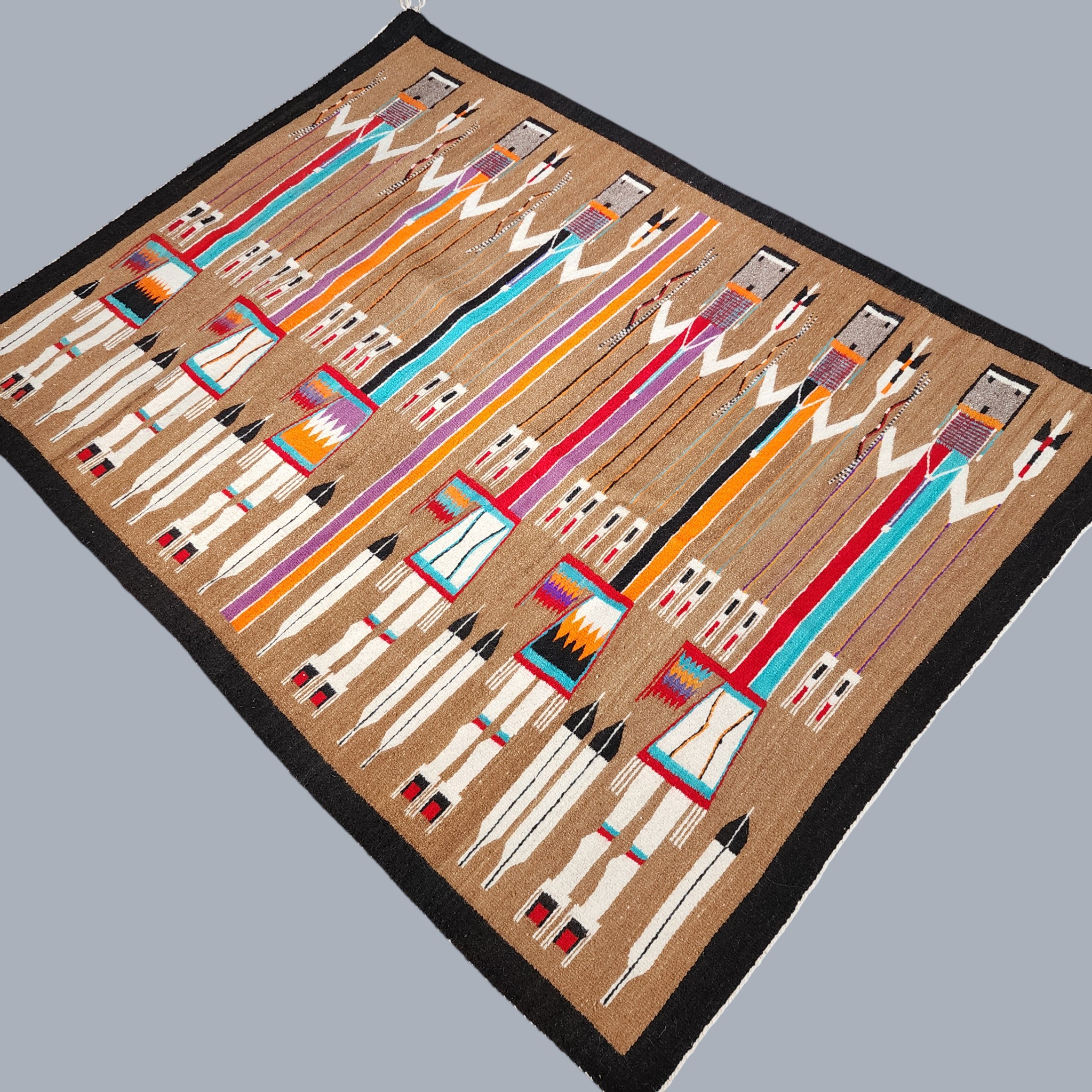 Vintage Genuine Navajo Indian Handmade Yei be Chei Wool Rug, 53″ x 72″ / The original “Genuine Navajo Indian Rug” tag from time of purchase is attached to the rug. Tag information states that it was made in Rough Rock, AZ with a $750 retail price – the equivalent of over $4,200 in 2026’s dollar. Reverse side of tag reads “A truly American Indian article. 100 per cent virgin wool is hand cleaned, carded, spun and dyed by women of the Navajo Tribe who then use the various colored yarns to weave original designs on a primitive native loom.” Was purchased at a now-closed Trading Post in Nevada – Moser’s American Indian Art in September of 1976. The rug will come with the original receipt/certificate of guarantee from time of purchase. Beautiful colors! Non-jewelry/large items in this auction ship for the cost of postage plus $20 for handling/materials per invoice.