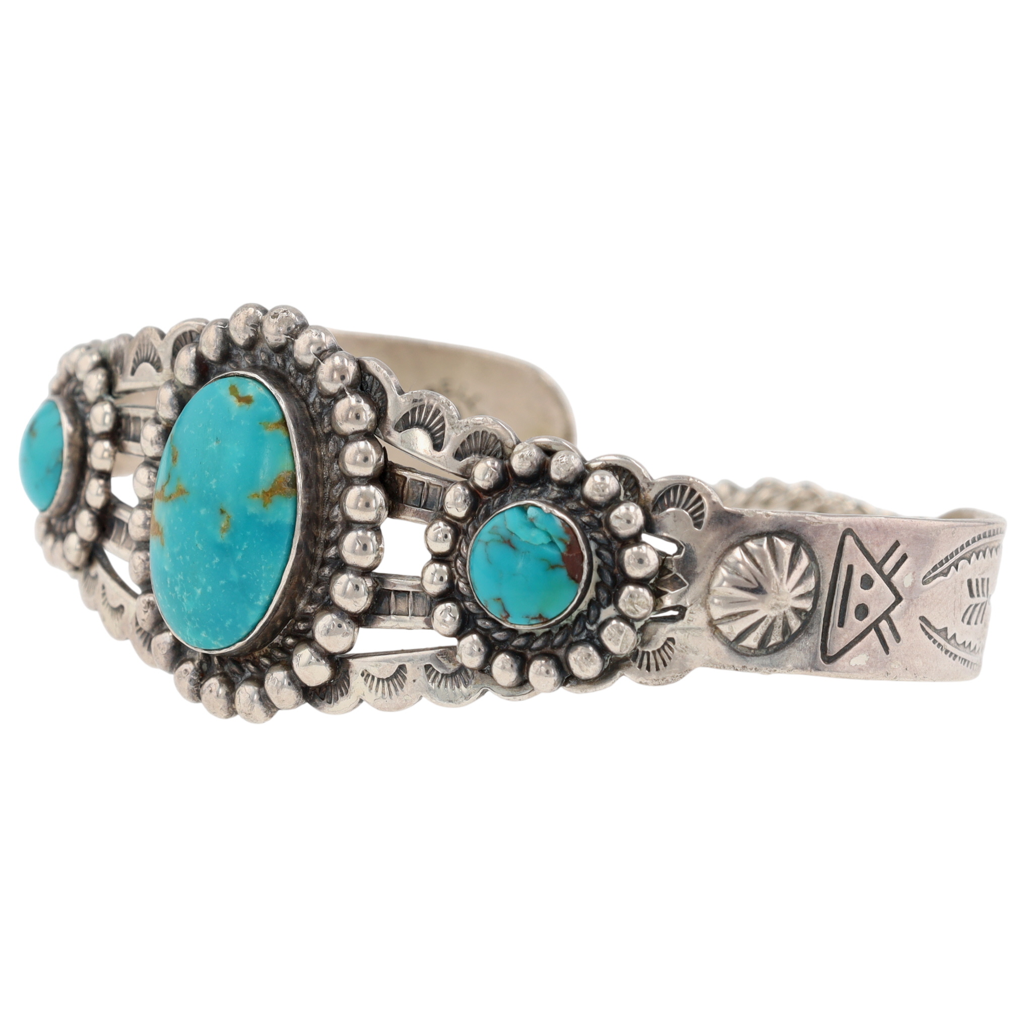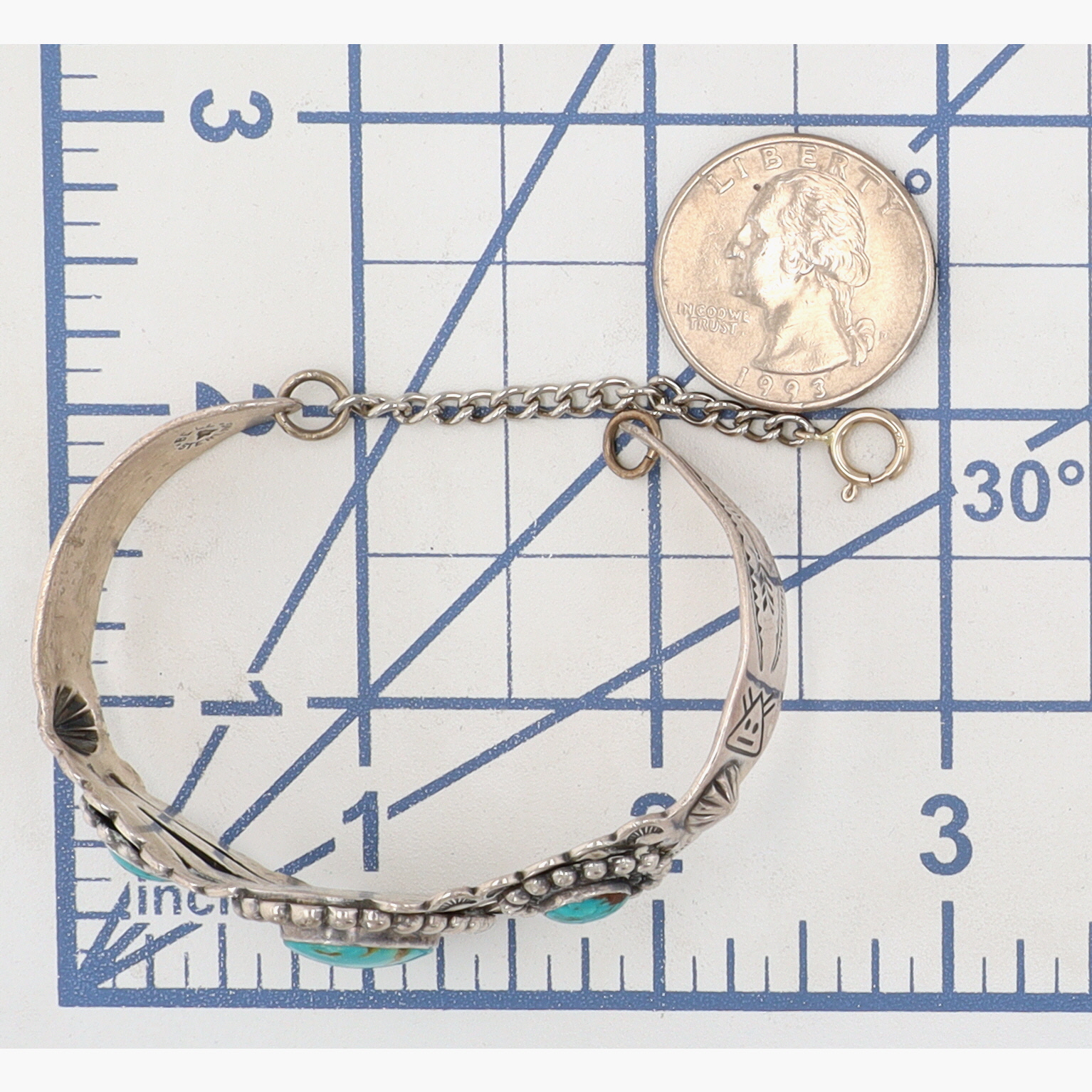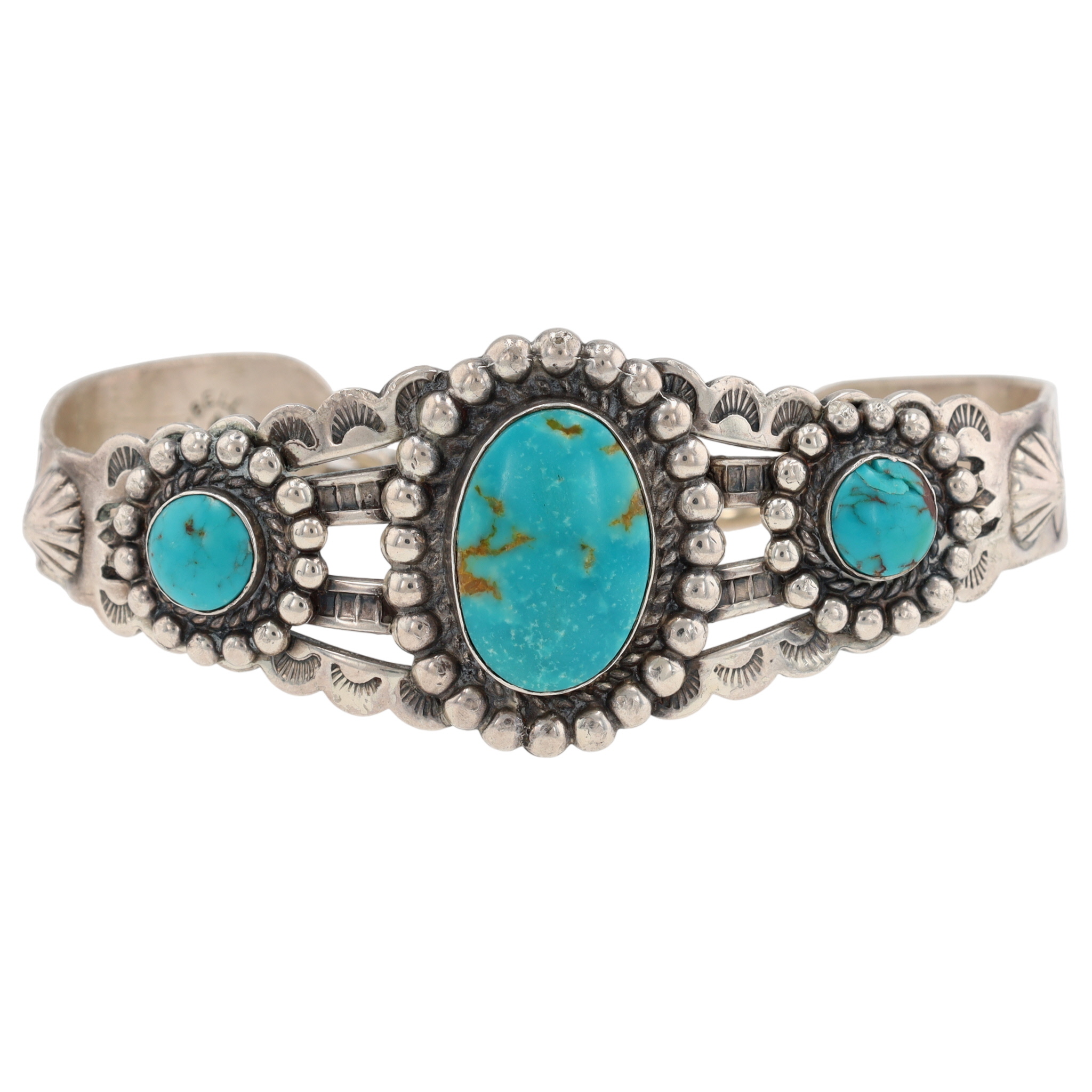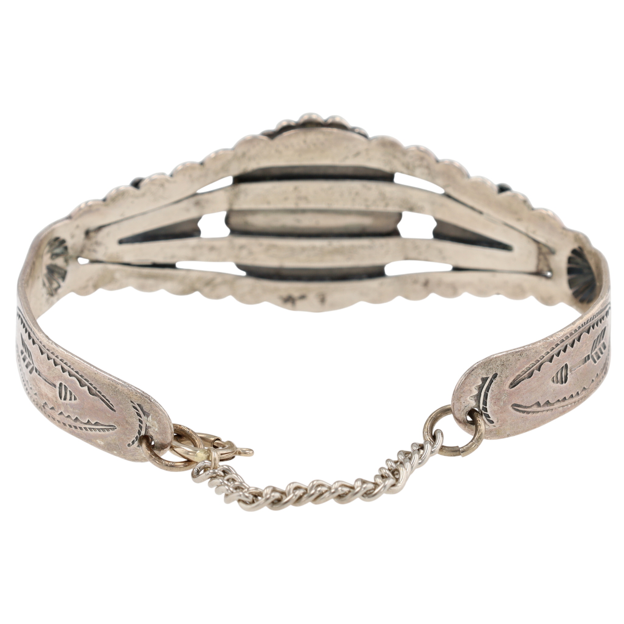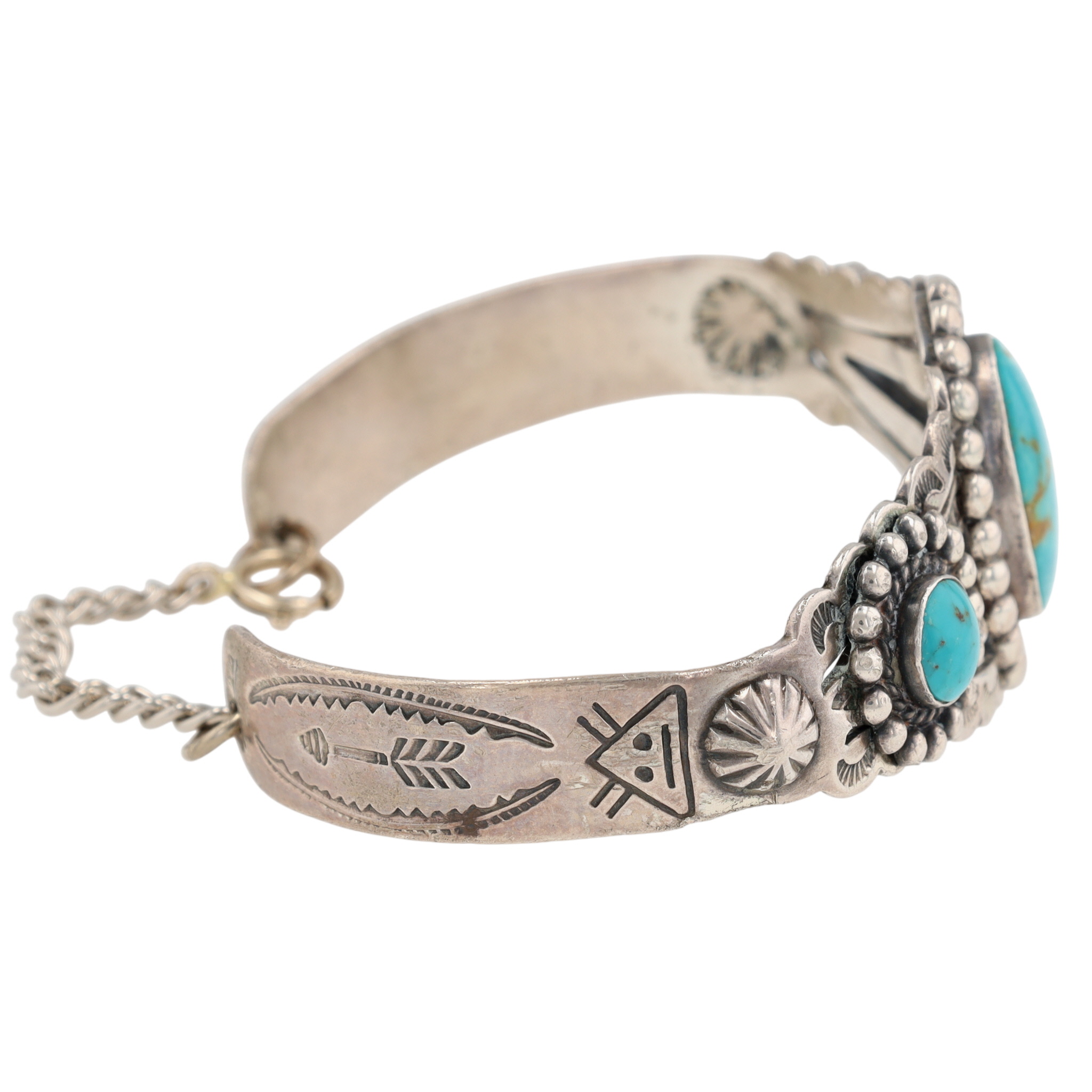 Vintage Bell Trading Post Sterling Stamped Turquoise Cuff Bracelet w/ safety chain attachment – 22.5g