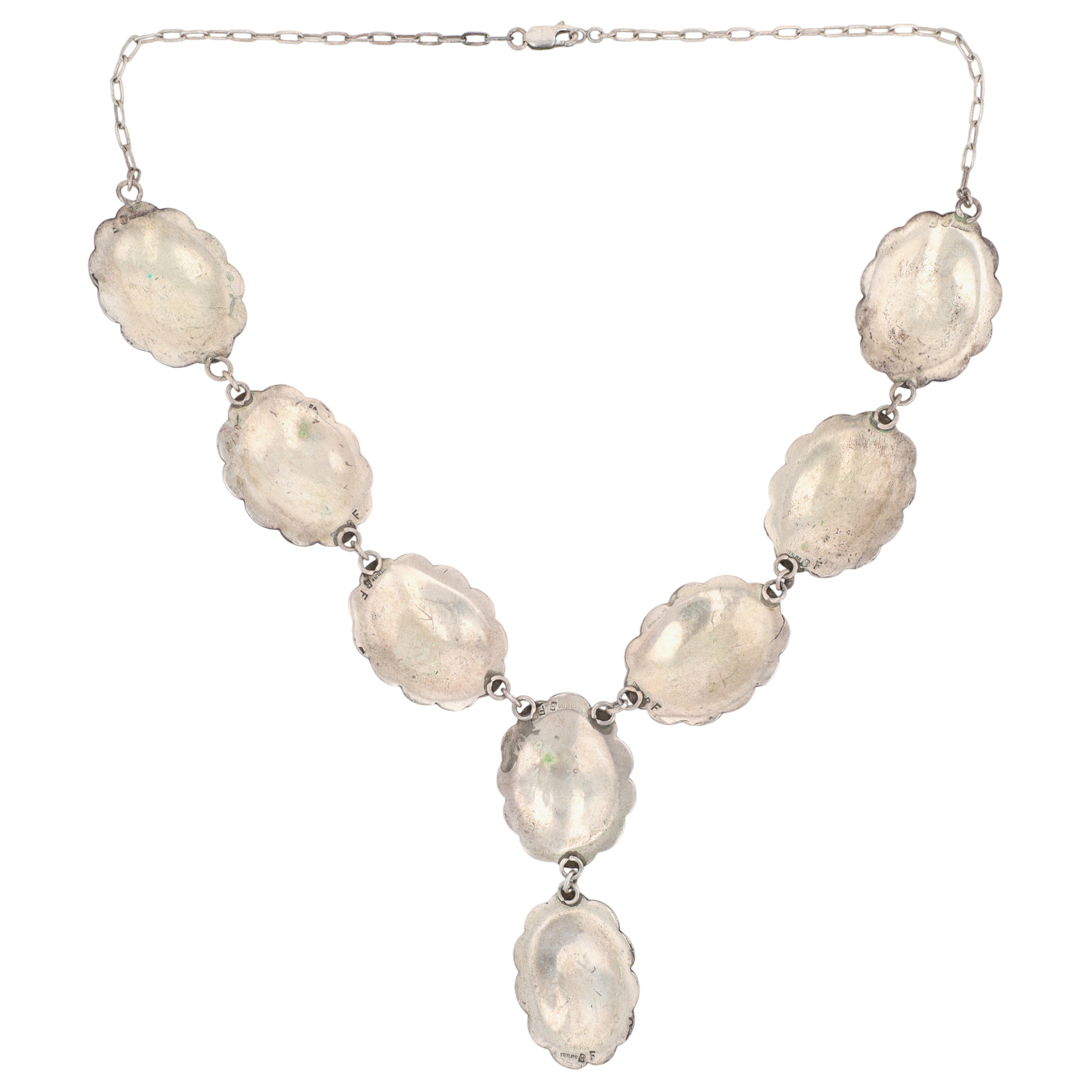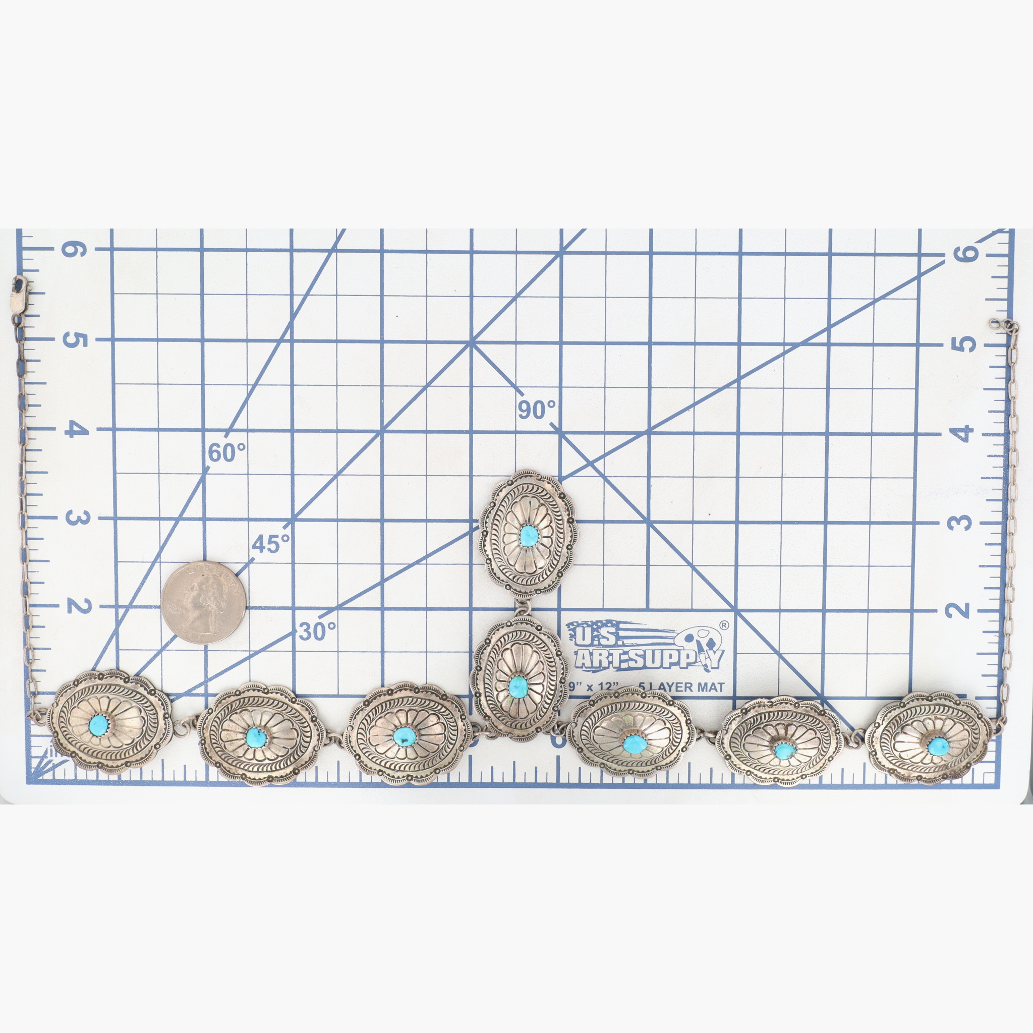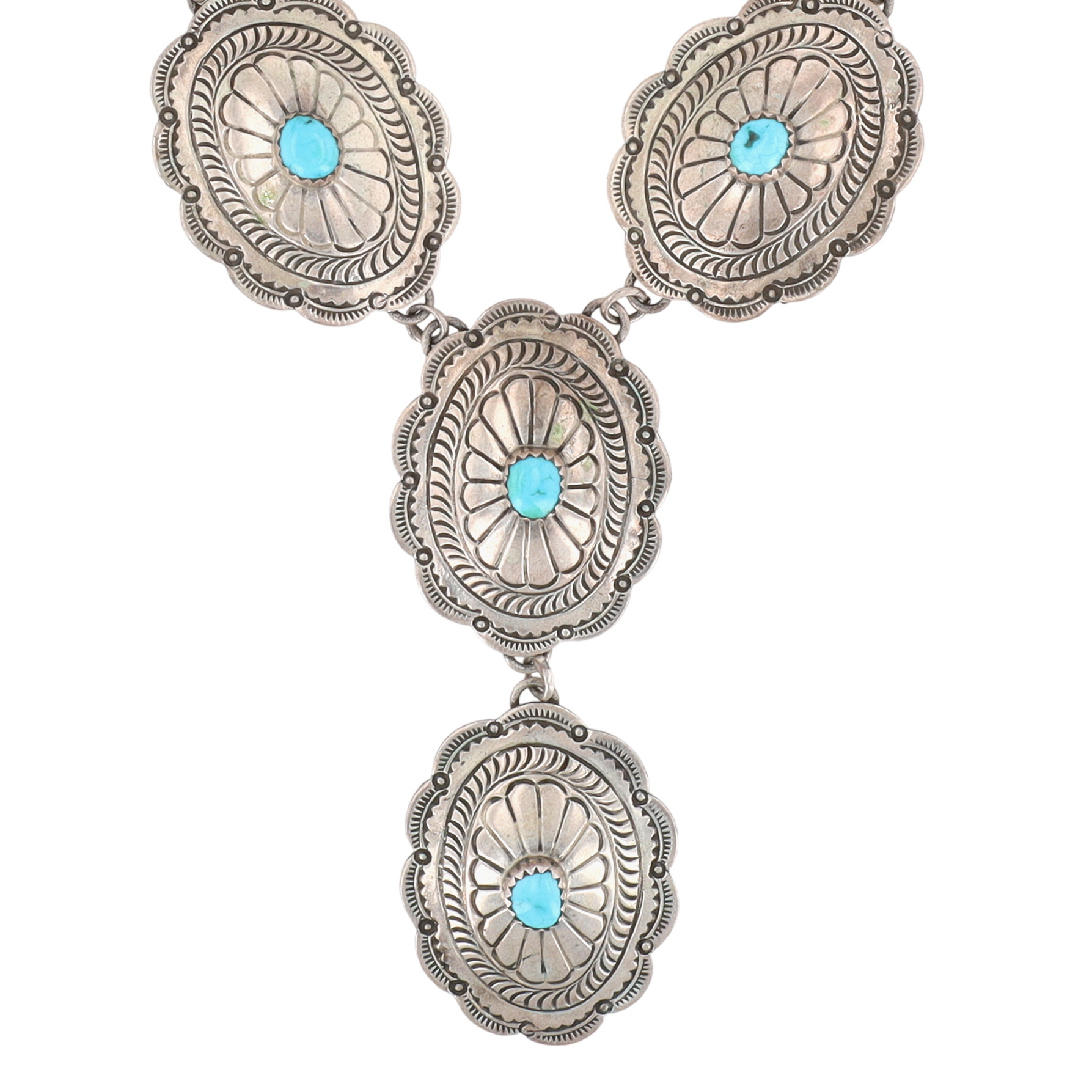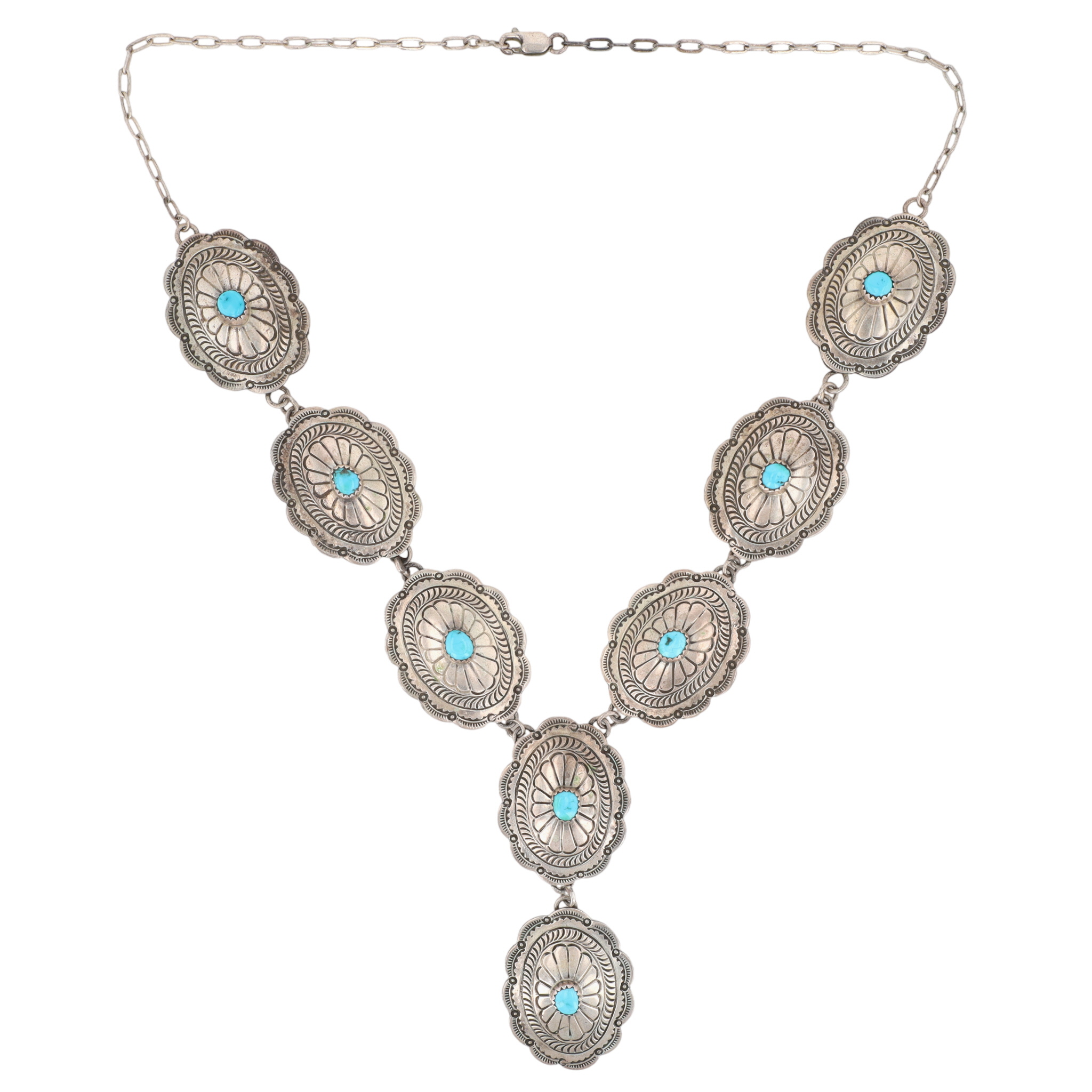 Signed Navajo Sterling and Turquoise Hand Stamped Concho Necklace – 61.3g – approx. 21″ long – each concho is approx. 1.45″ x 1.15″ – approx 3.14″ drop