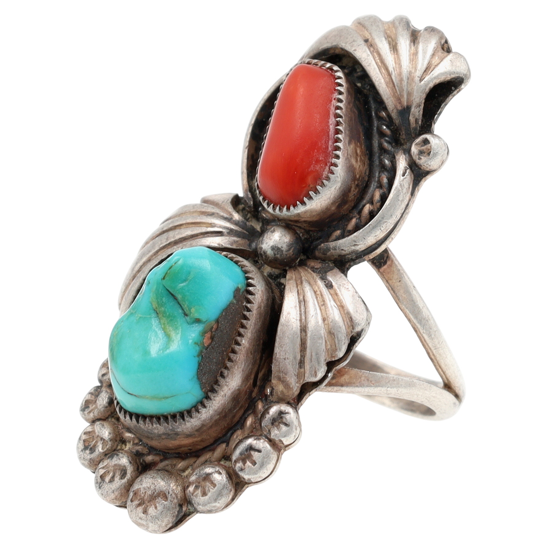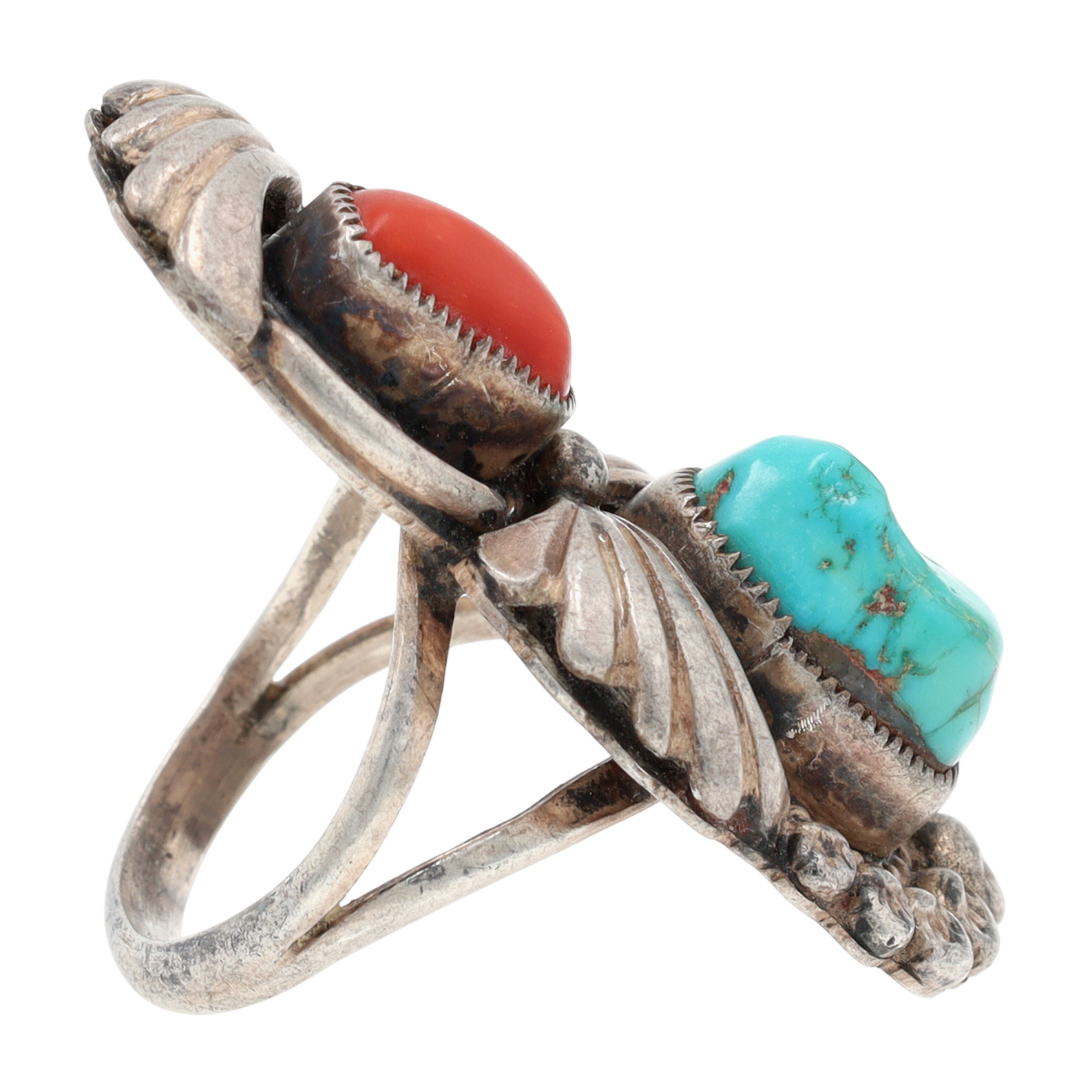 Vintage Signed Navajo Turquoise and Coral Ring Sz 6