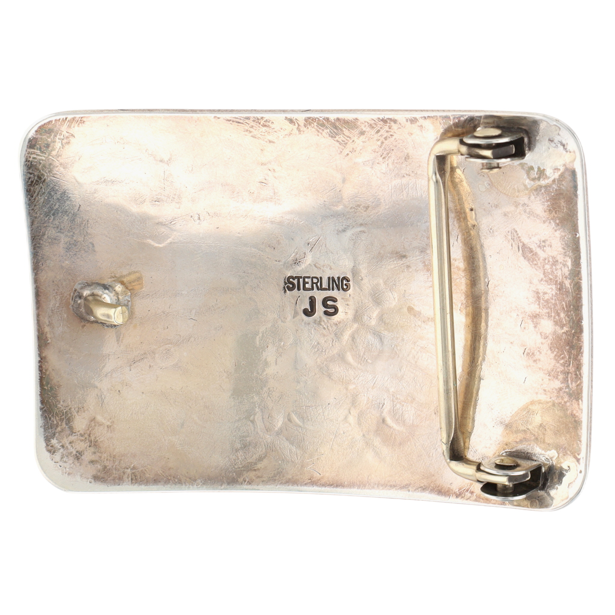 James Shay Navajo Sterling Turquoise Stamped Belt Buckle – 47.5g – Approx 3″ x 2″ – gorgeous turquoise cab!