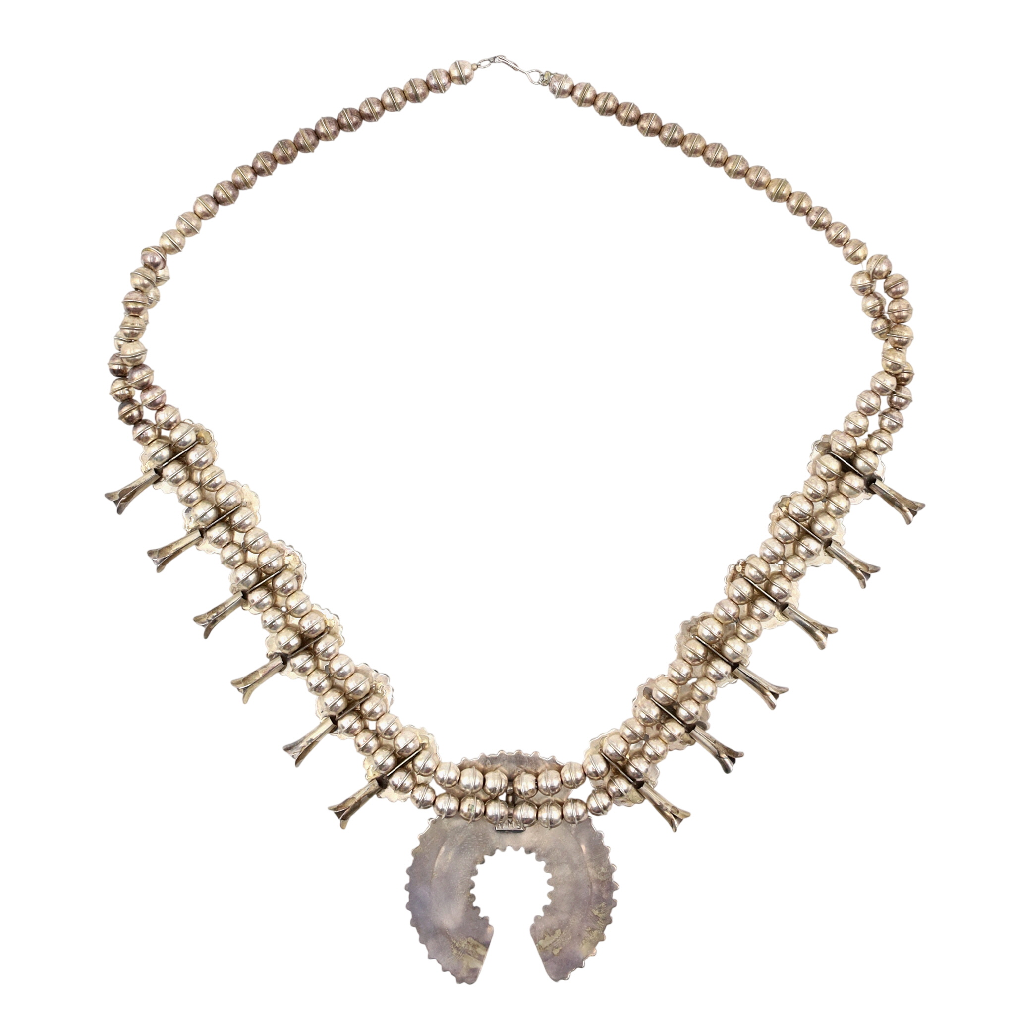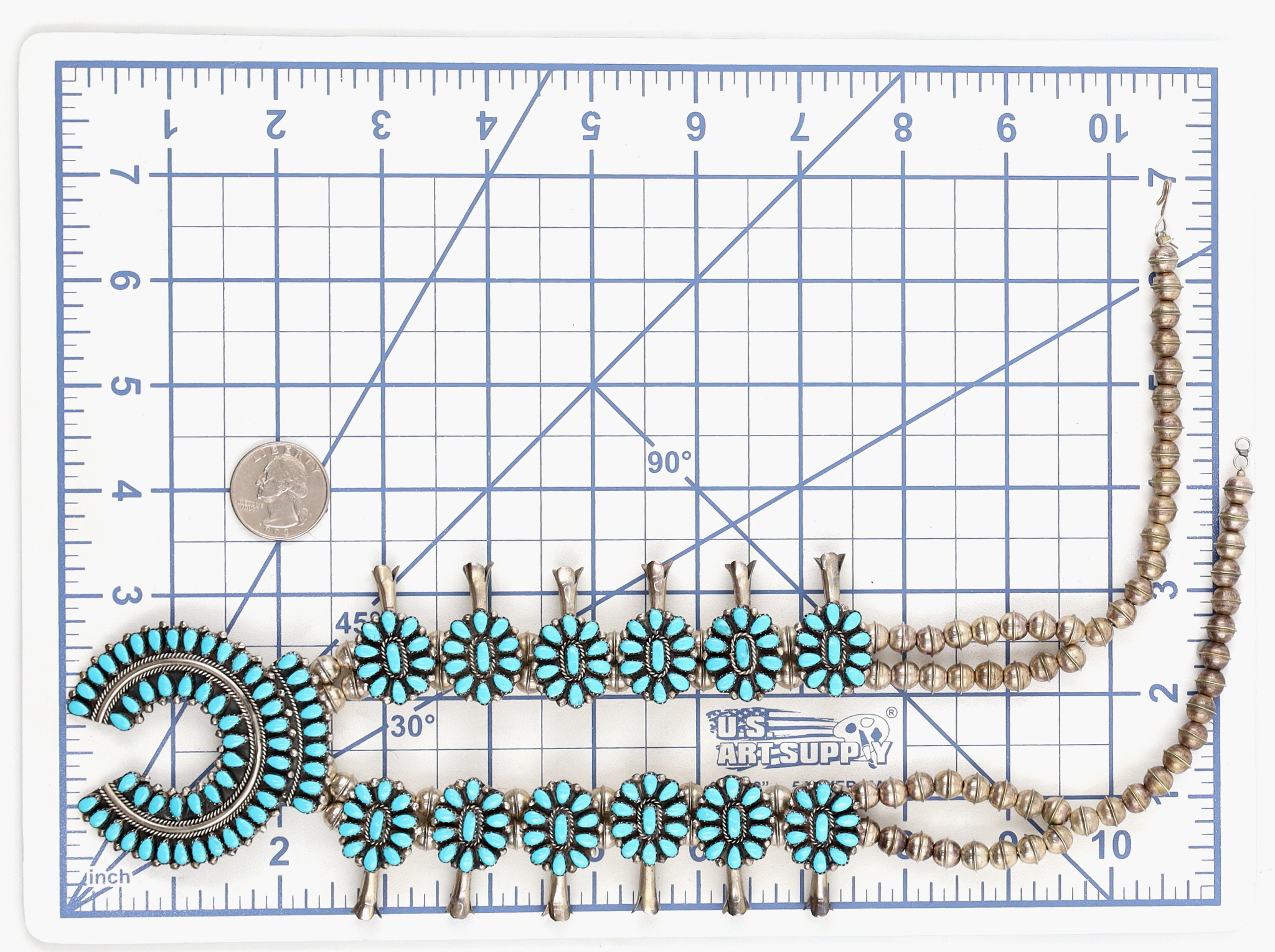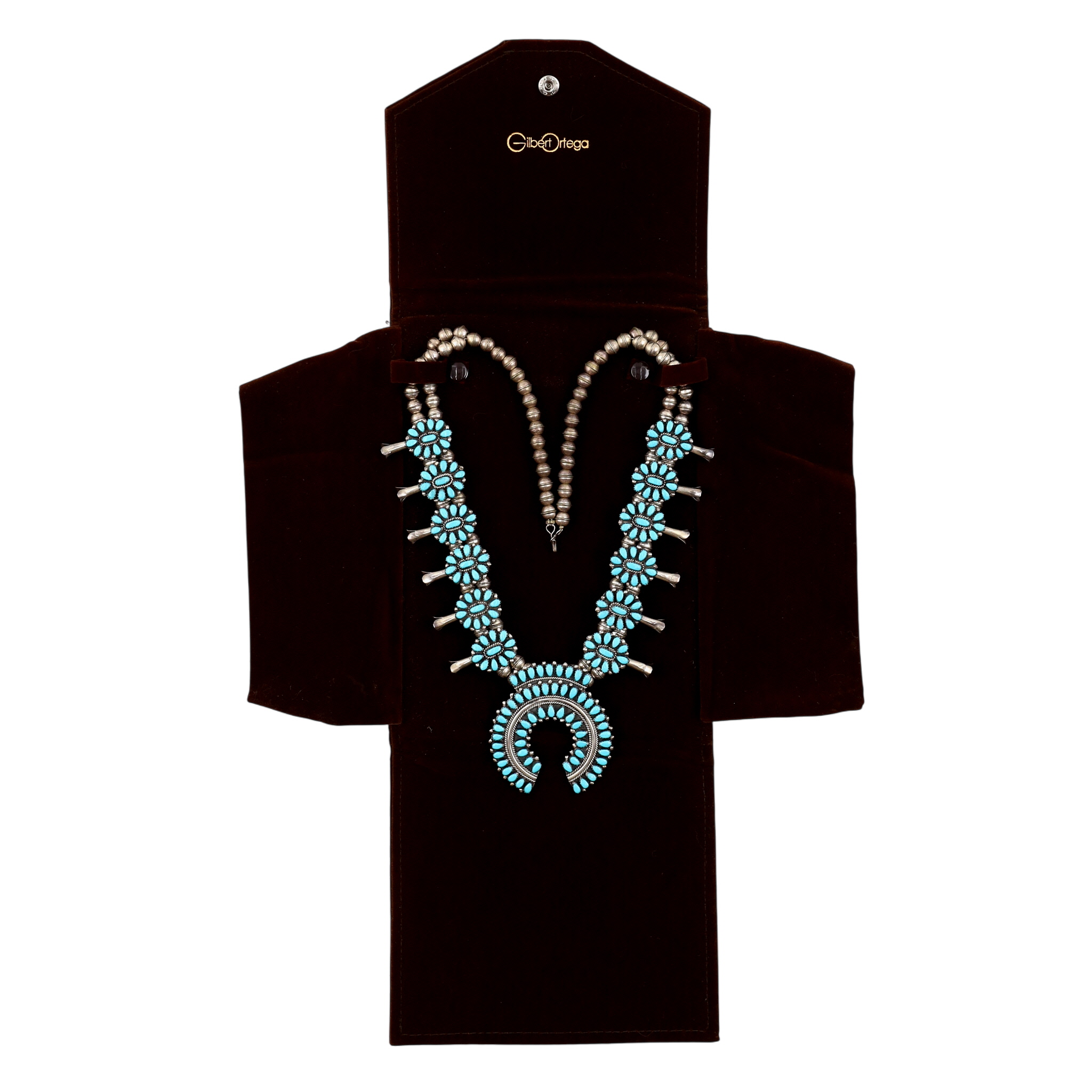 Victor Moses Begay Navajo Sterling Squash Blossom Necklace – 102g – approx. 24″ from end to end – note: consignor purchased from the Gilbert Ortega Shop and will come with the folding Gilbert Ortega carry case (as shown in photo).