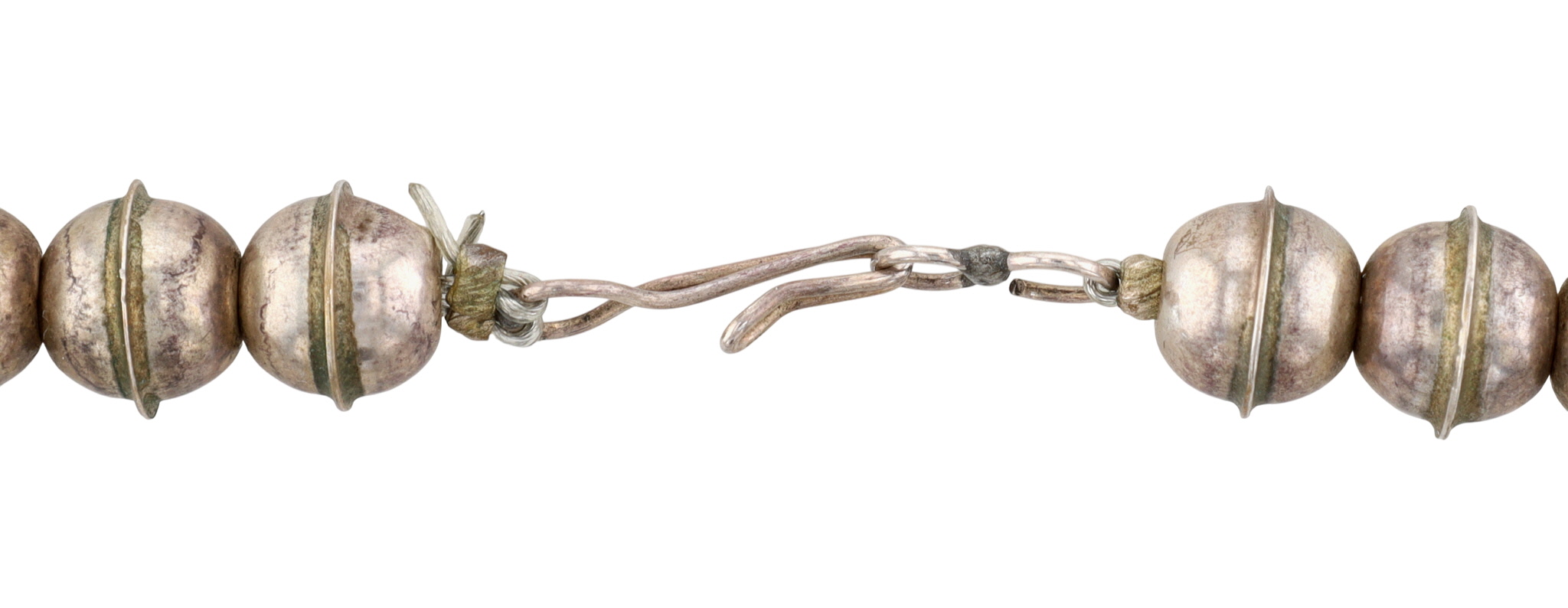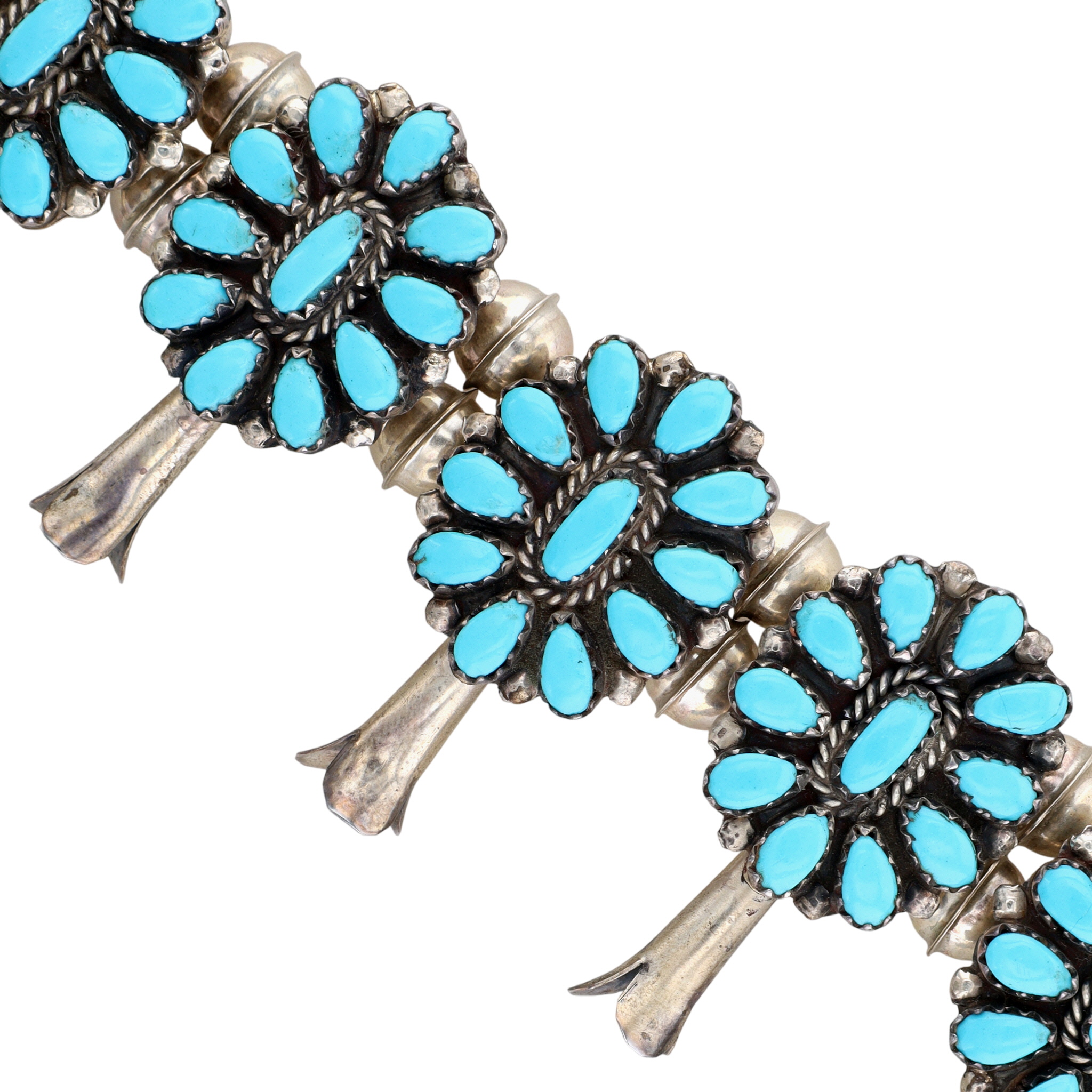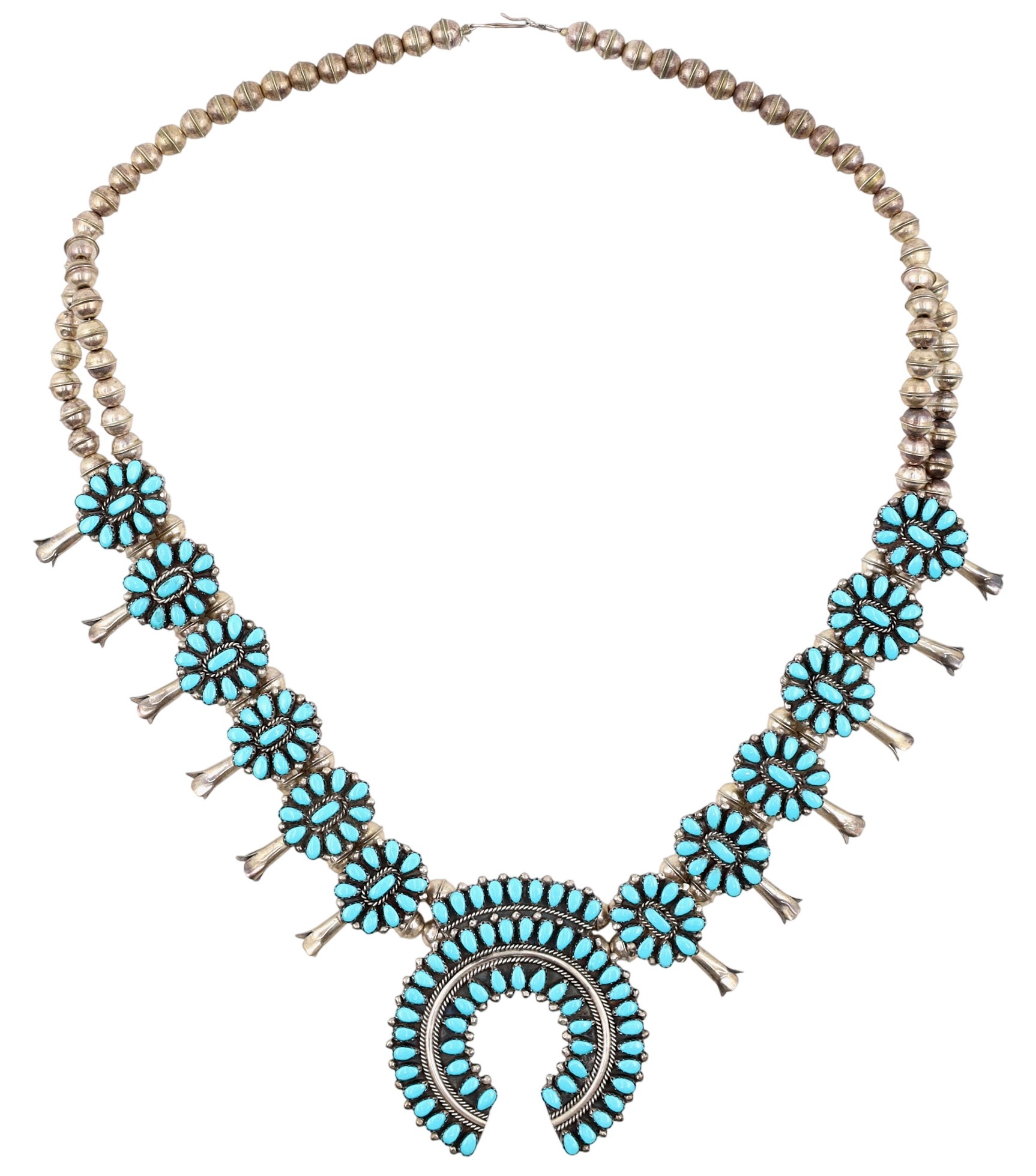 Victor Moses Begay Navajo Sterling Squash Blossom Necklace – 102g – approx. 24″ from end to end – note: consignor purchased from the Gilbert Ortega Shop and will come with the folding Gilbert Ortega carry case (as shown in photo).