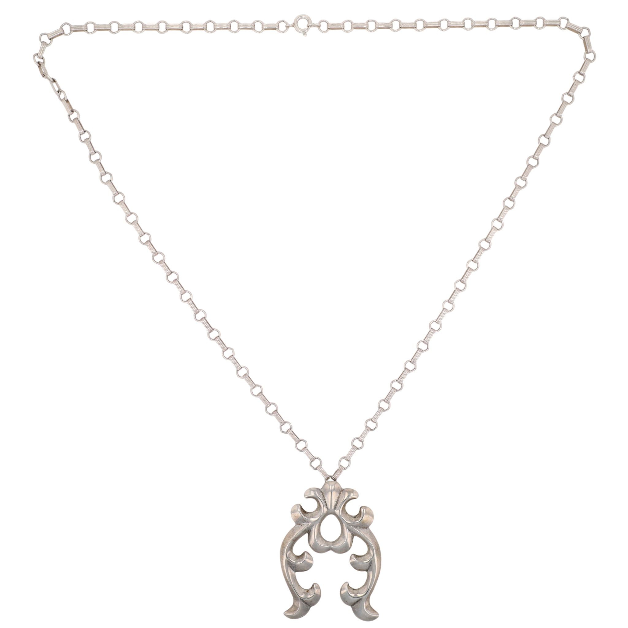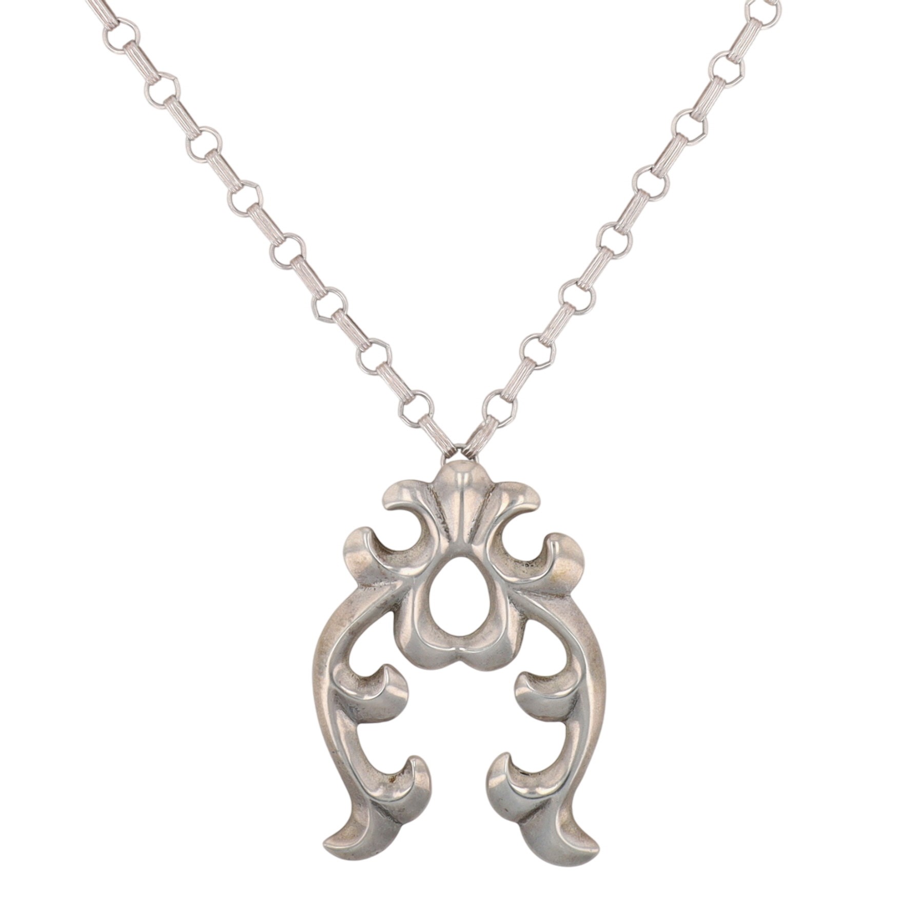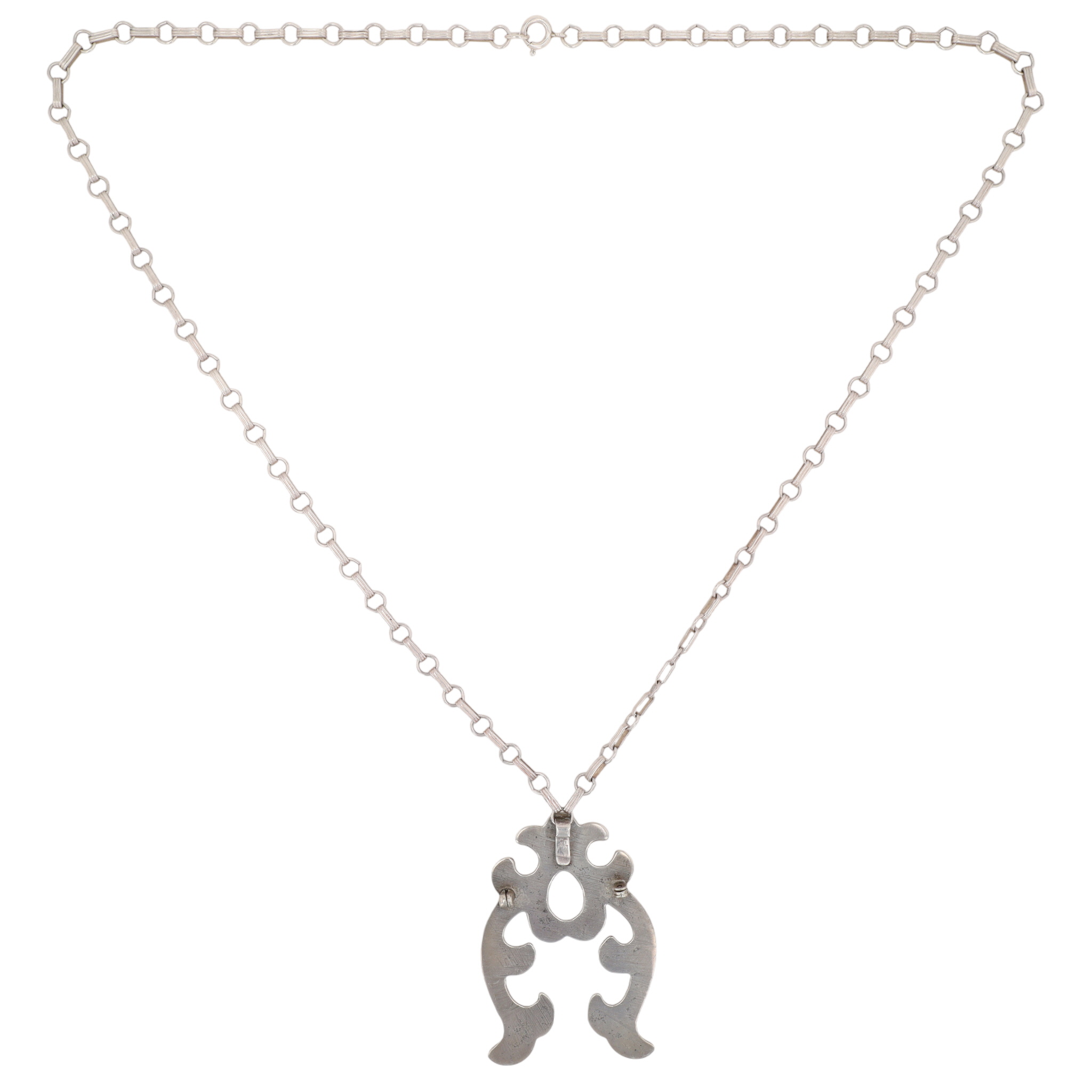 Hand Signed AEX Navajo Sterling Sandcast Naja Necklace – 31.8g – Approx Length: 24″ – Note: The back of the naja also has a brooch attachment but doesn’t have the pin for brooch intact.