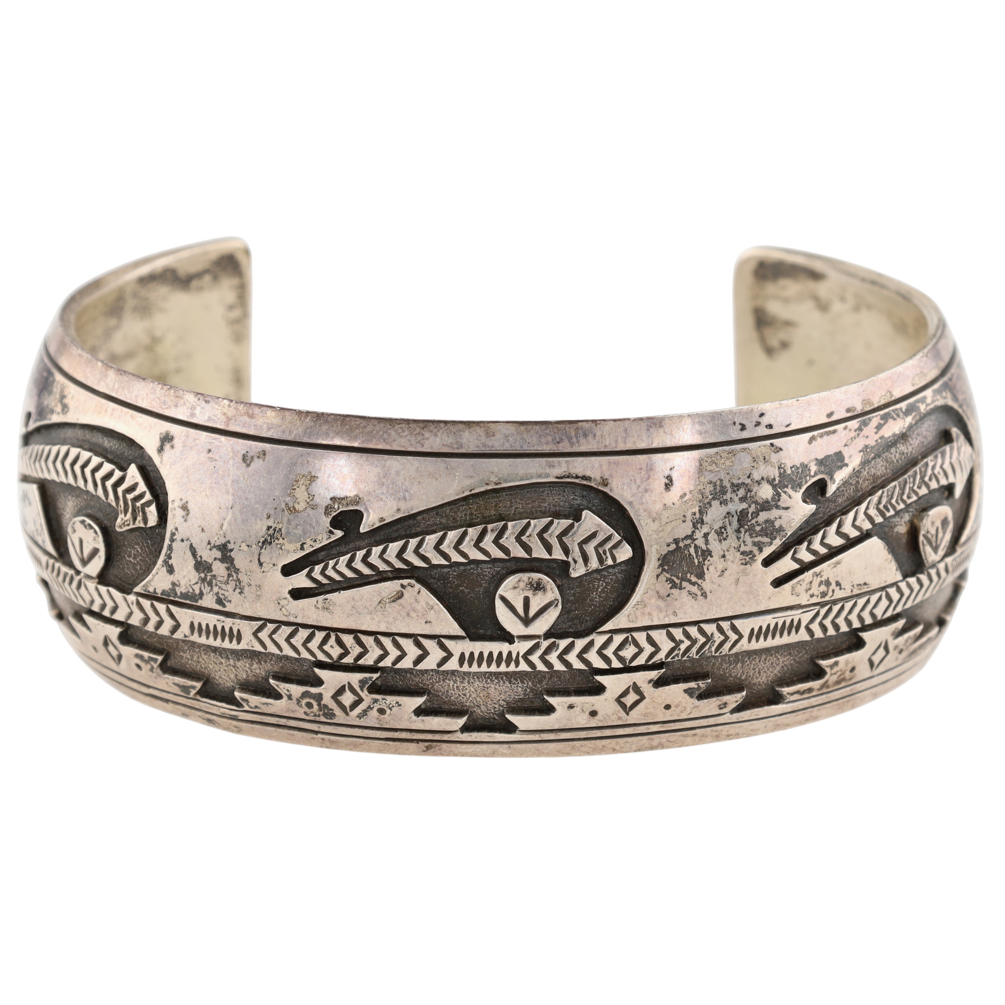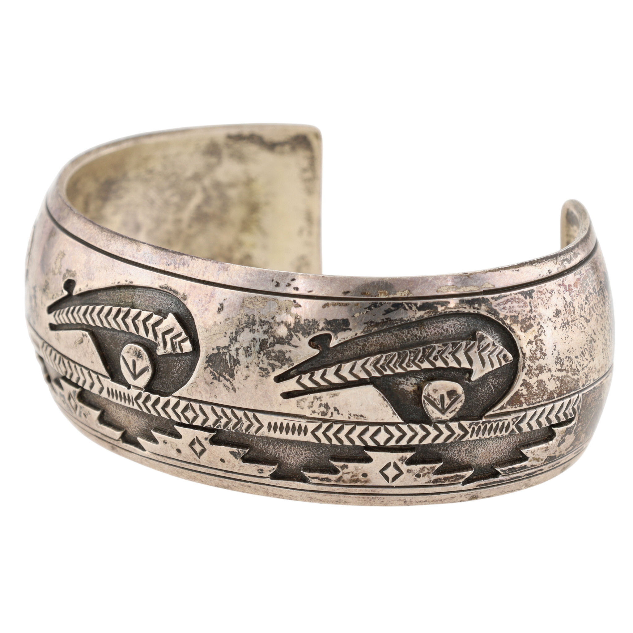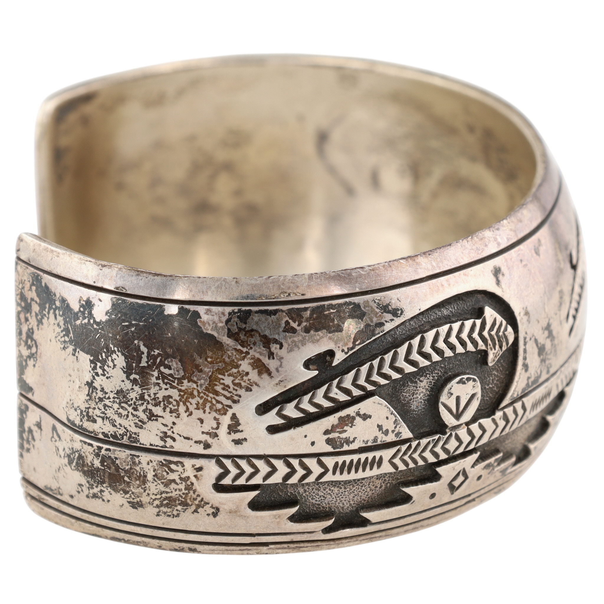 Signed KN – possibly Kirby Nez – Navajo Sterling Stamped Overlay Spirit Bear Cuff Bracelet – 46.9g