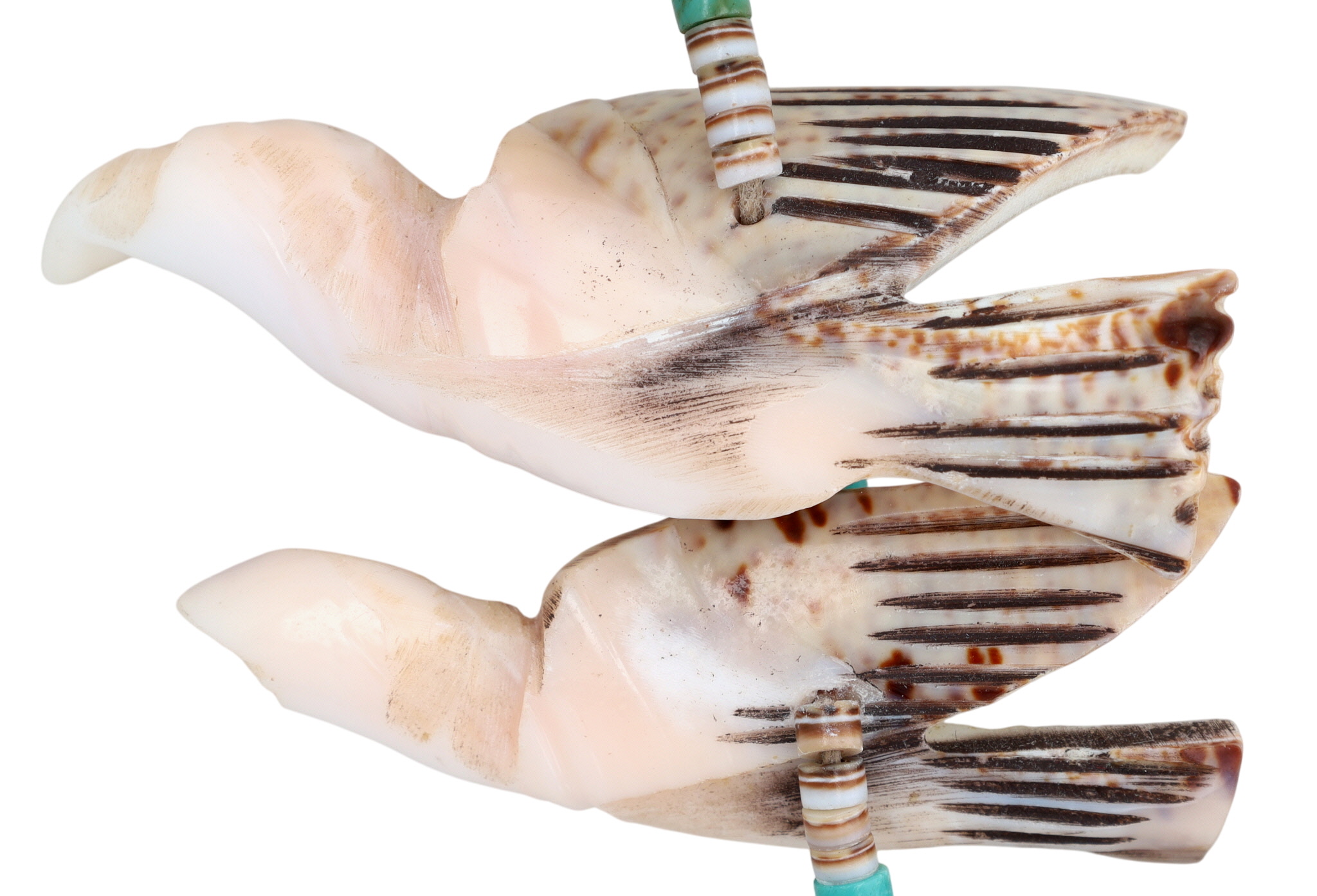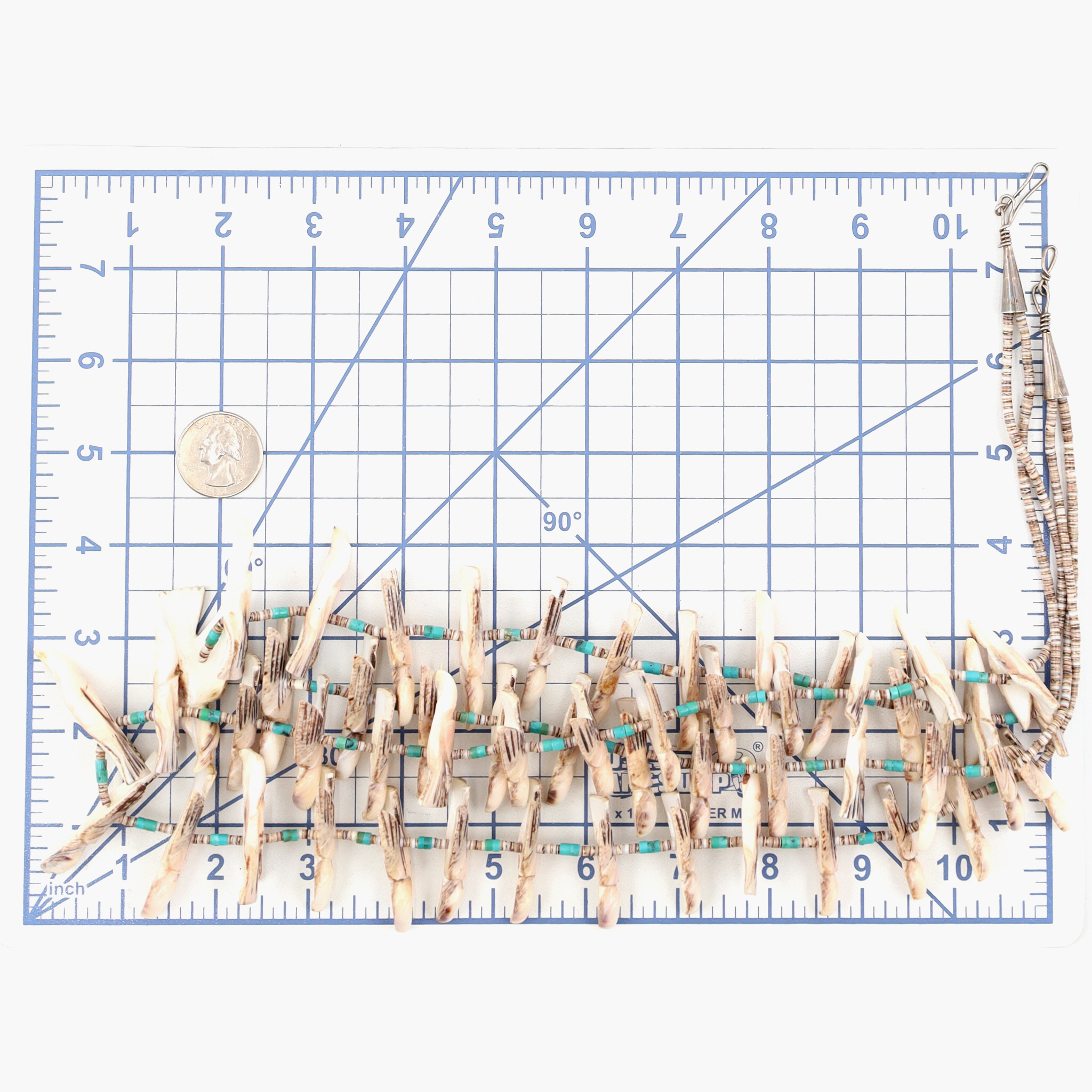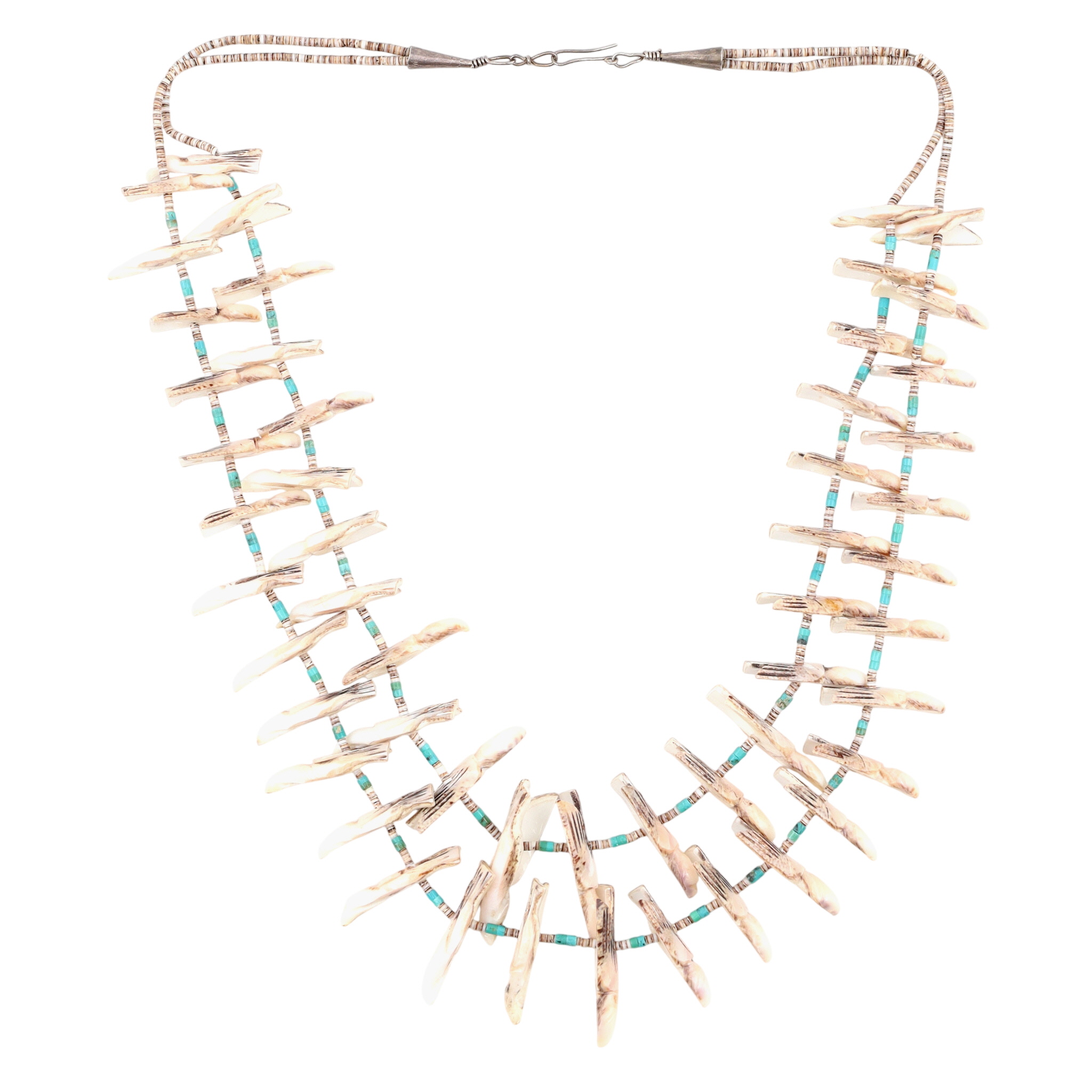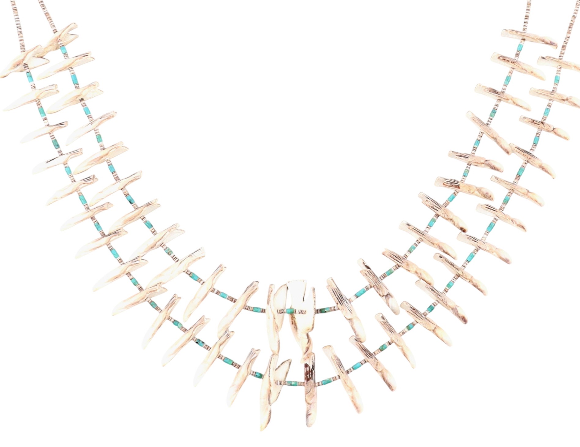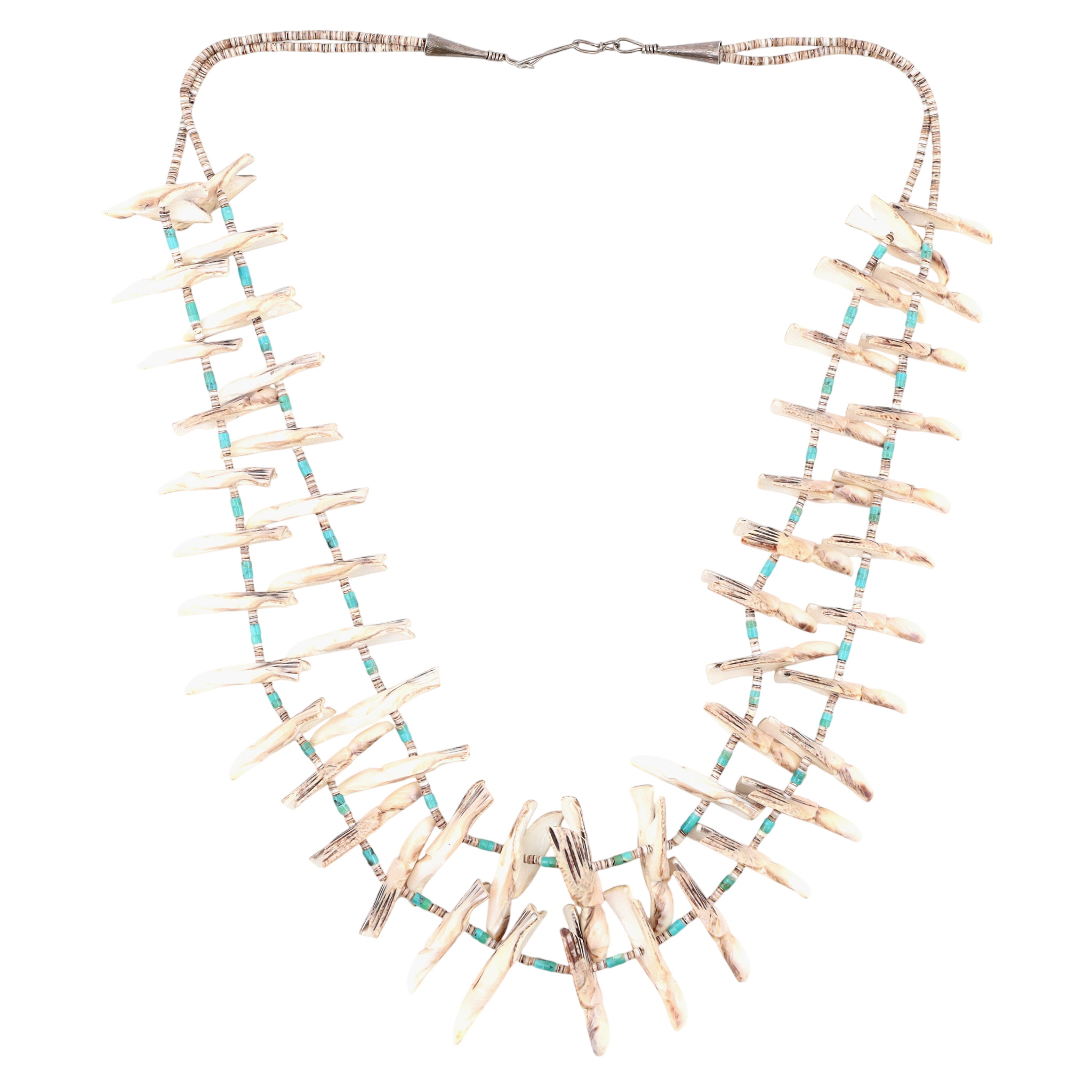 Huge Vintage Santo Domingo Kewa Sterling Carved Bird Fetish and Shell, Turquoise Heishi 2-Strand Necklace – 201g – approx. over 50 carved birds!