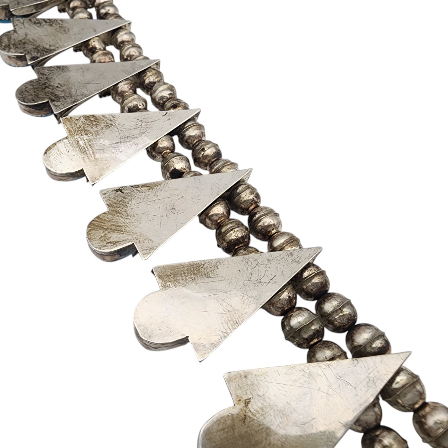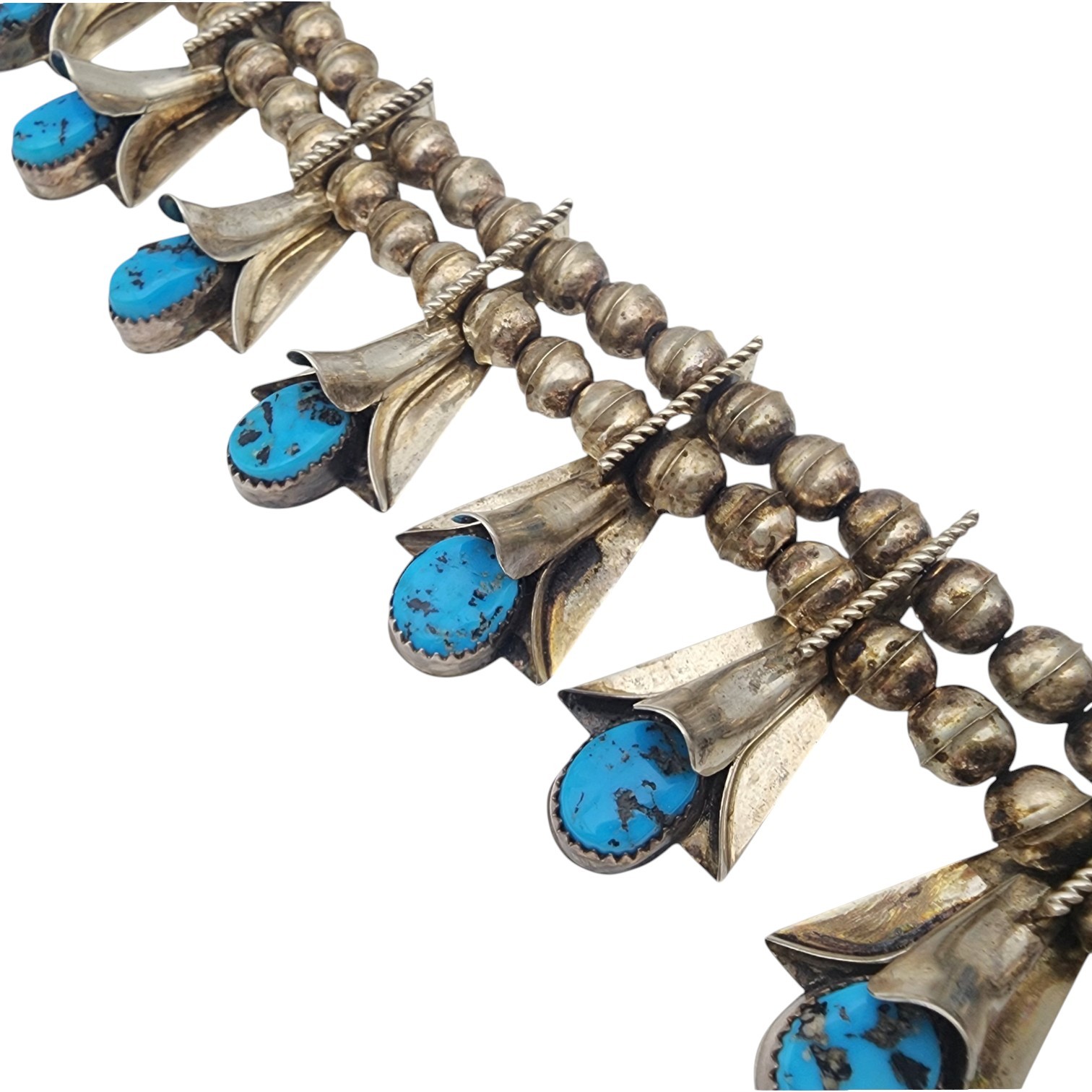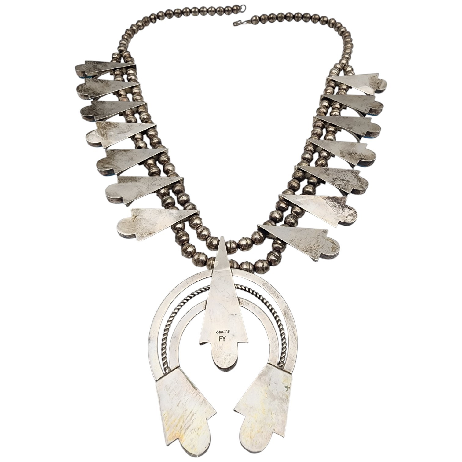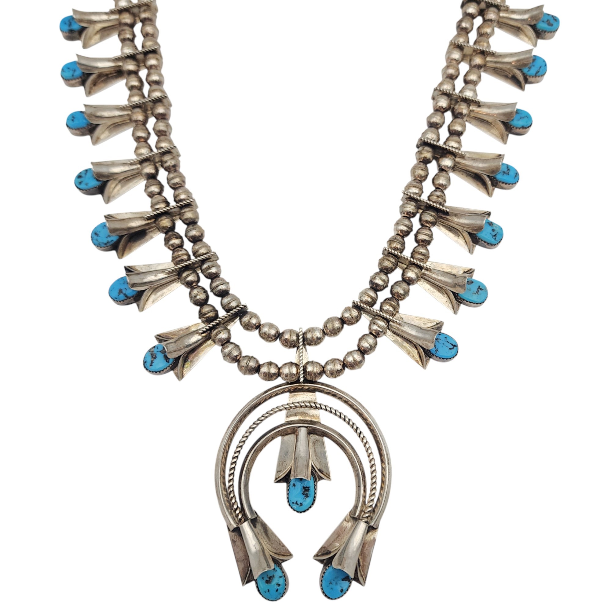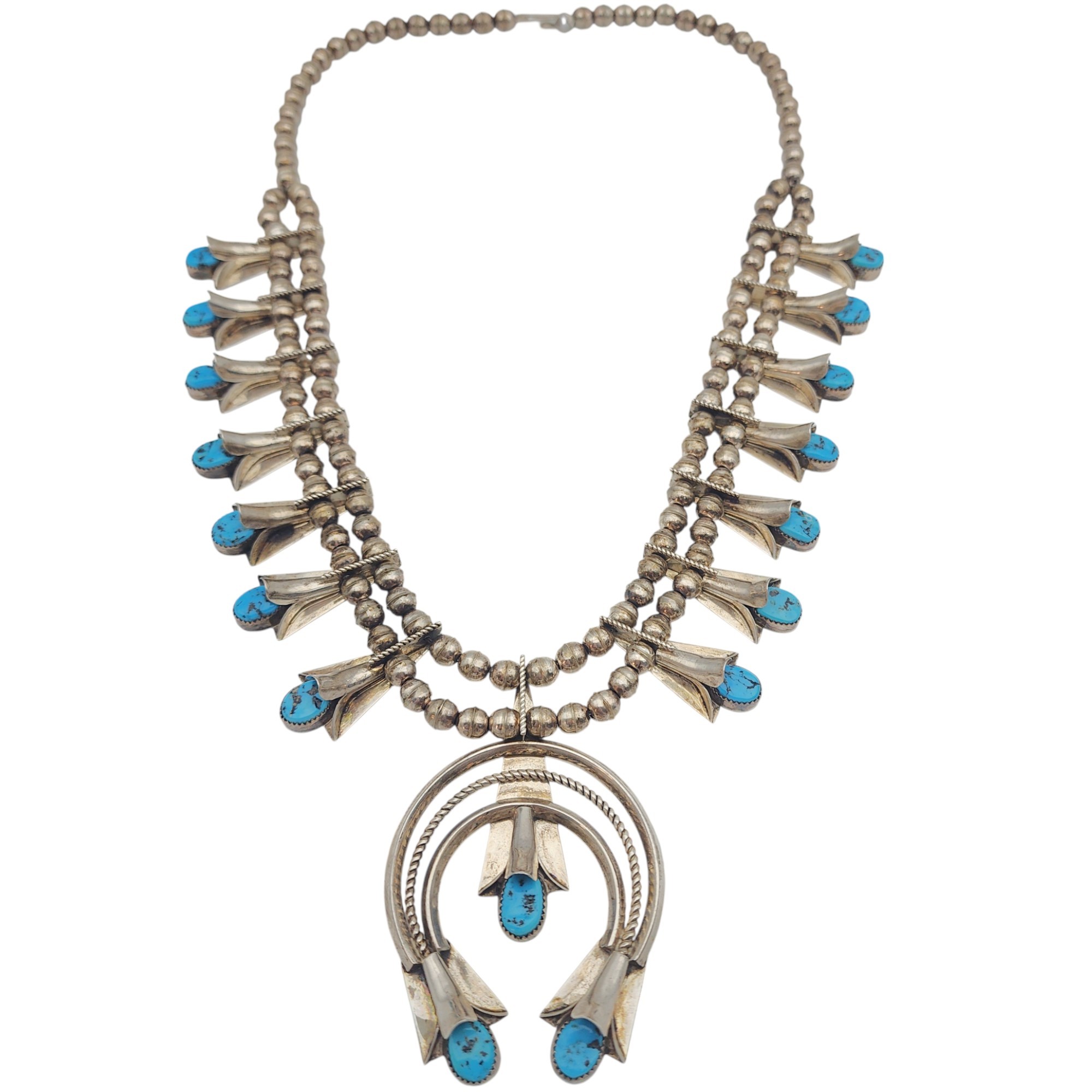 Frank Yazzie Navajo Sterling Turquoise Squash Blossom Necklace | Approx. Weight: 133g | Approx. Length: 26″