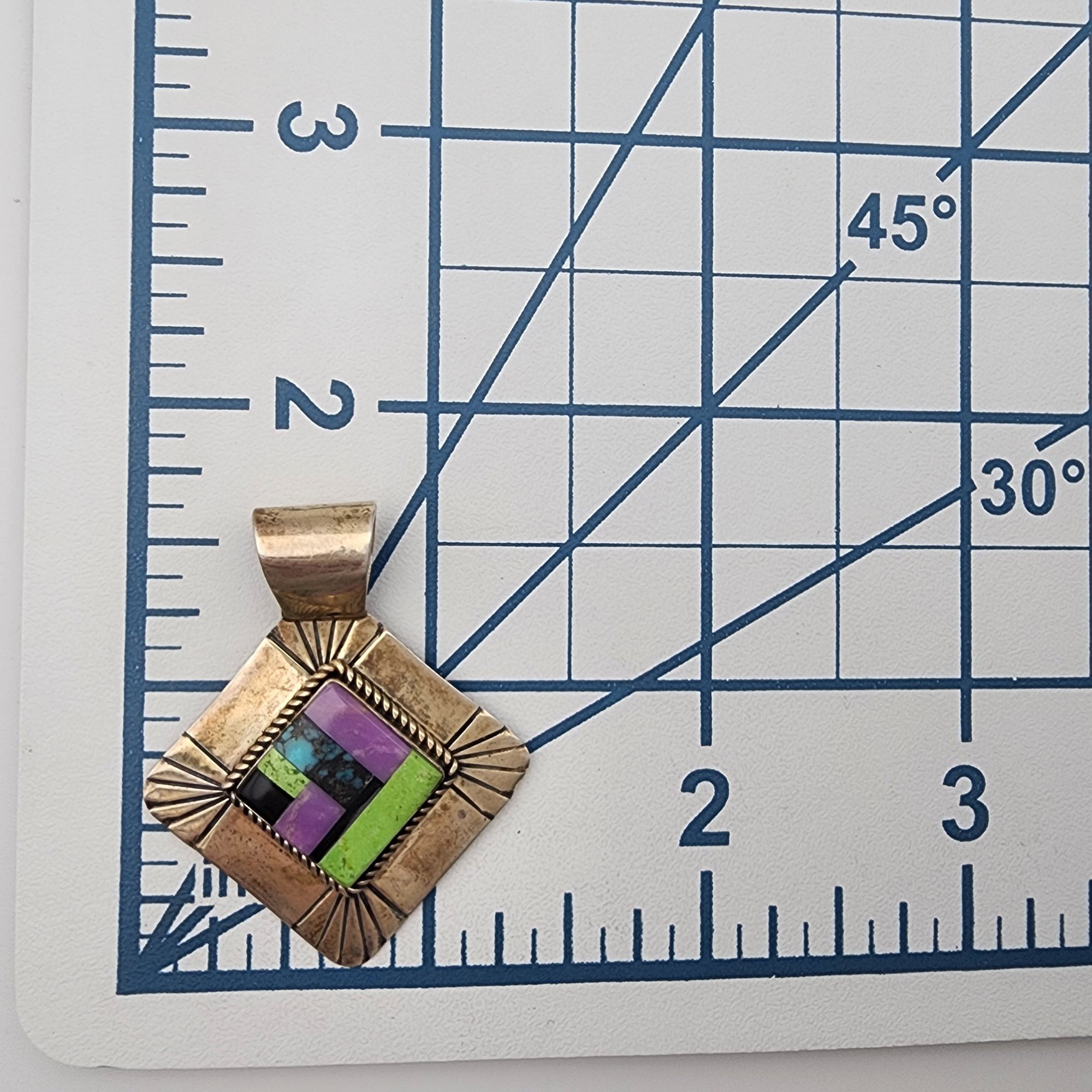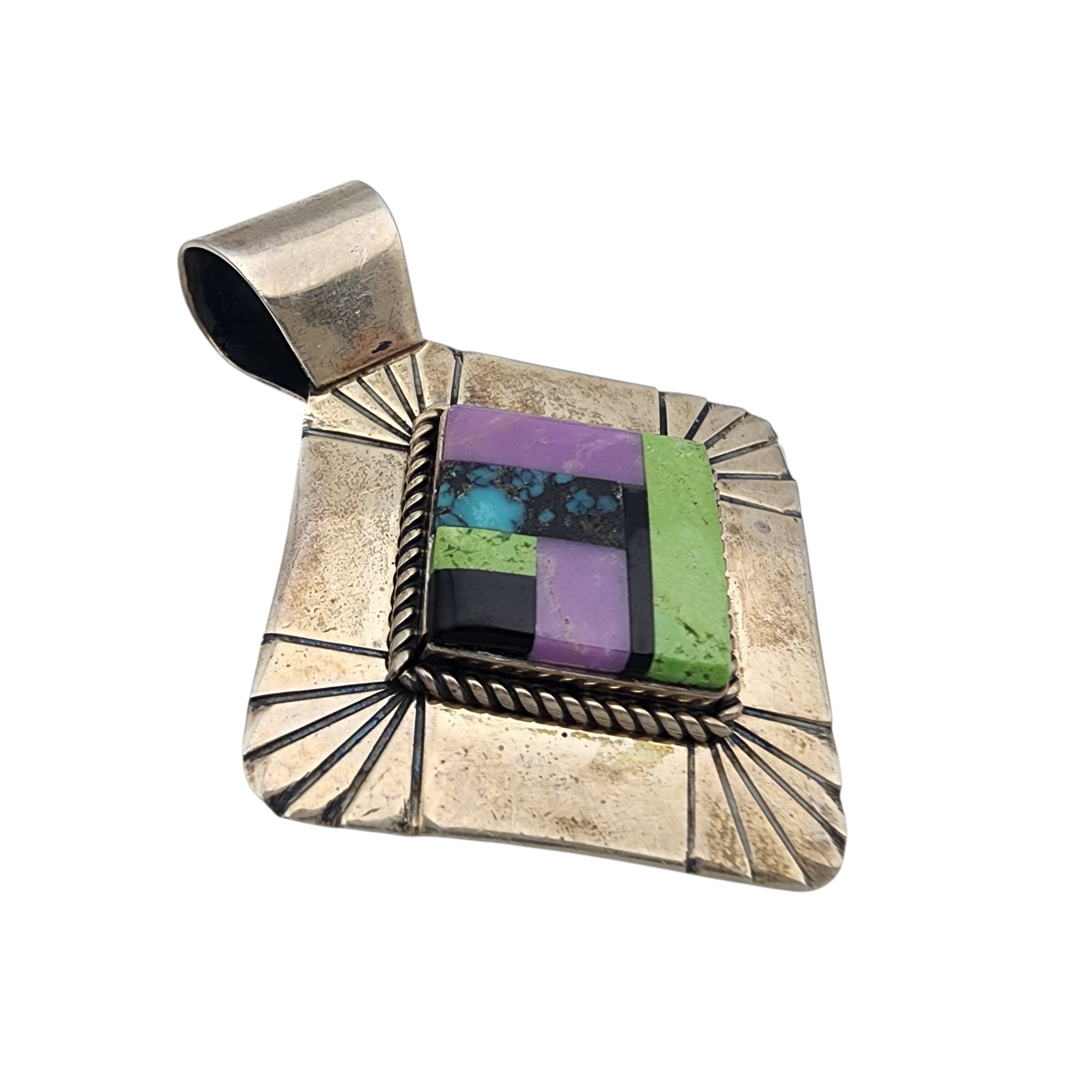 Navajo Sterling Multistone (Turquoise, Gaspeite, Jet, Charoite/Sugilite?) Inlay Pendant 5.7g