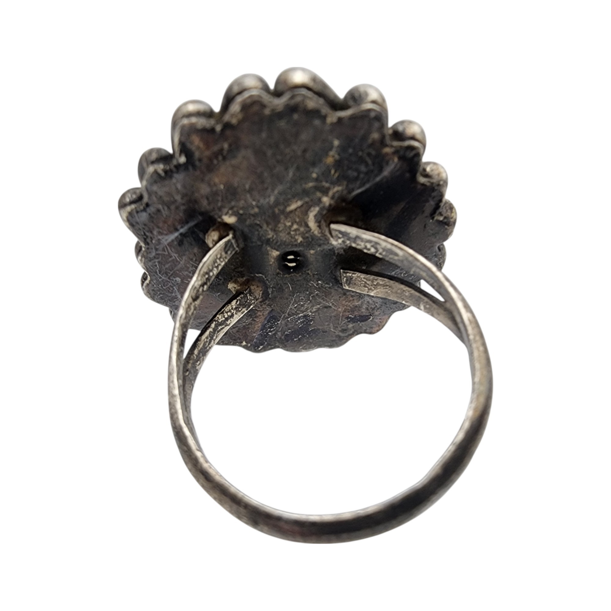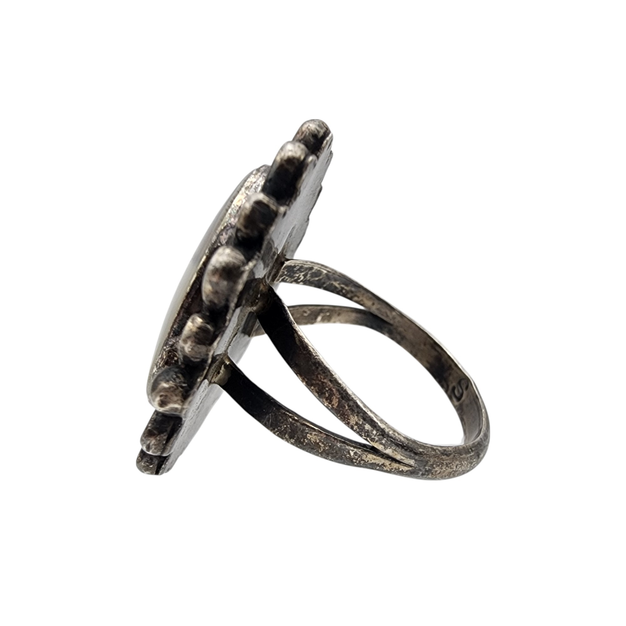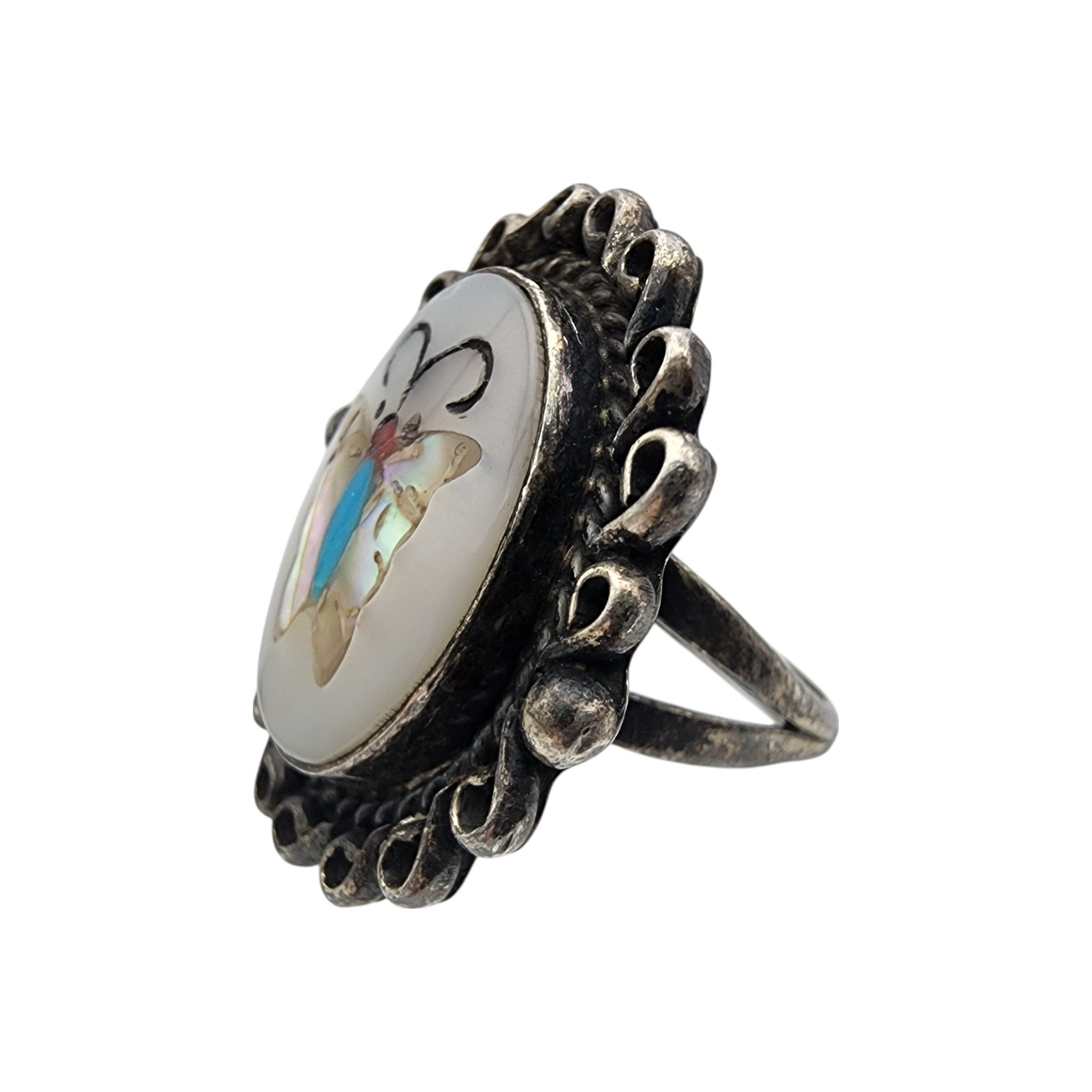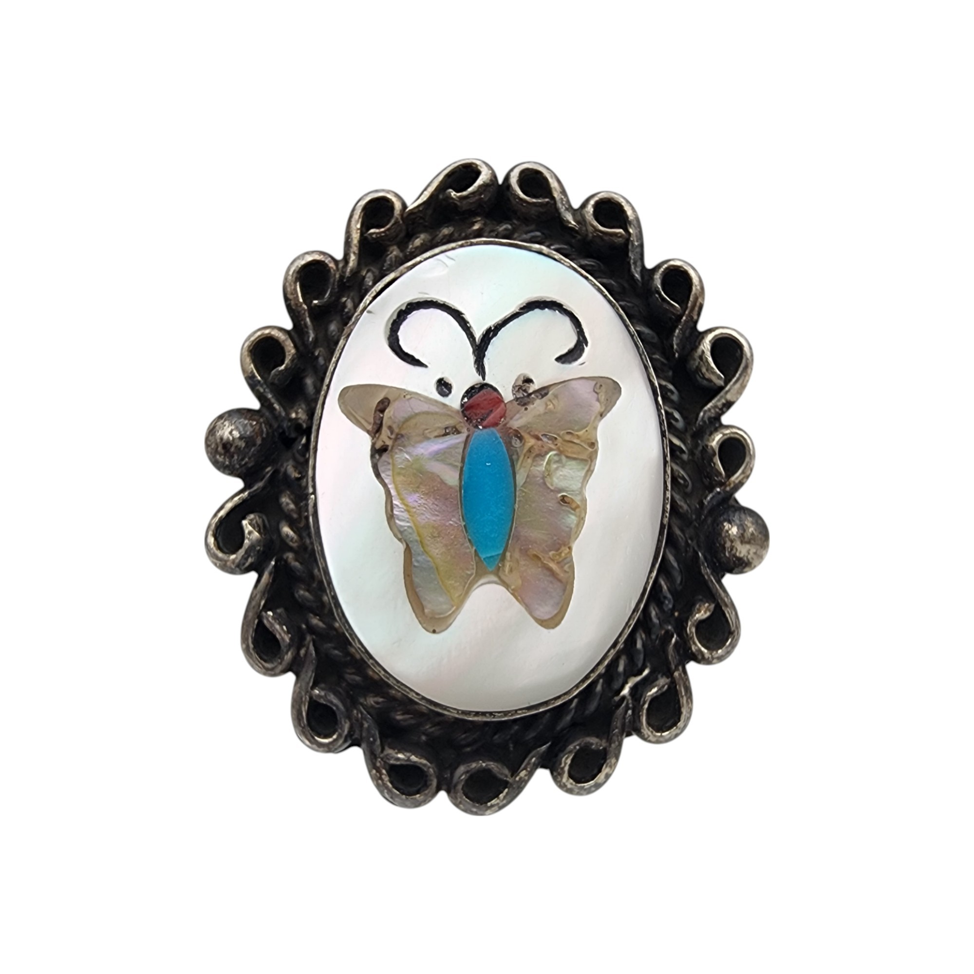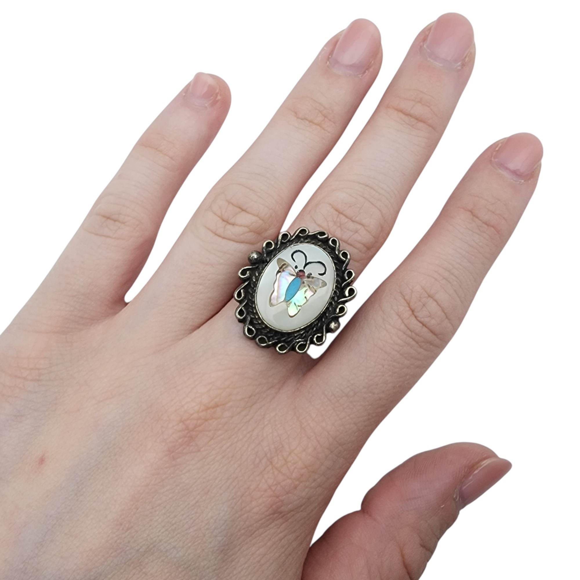 Signed Zuni Sterling Multistone (Mother of pearl, abalone, coral, turquoise, etc.) Inlay Butterfly Ring Sz 6.5 | 6.6g