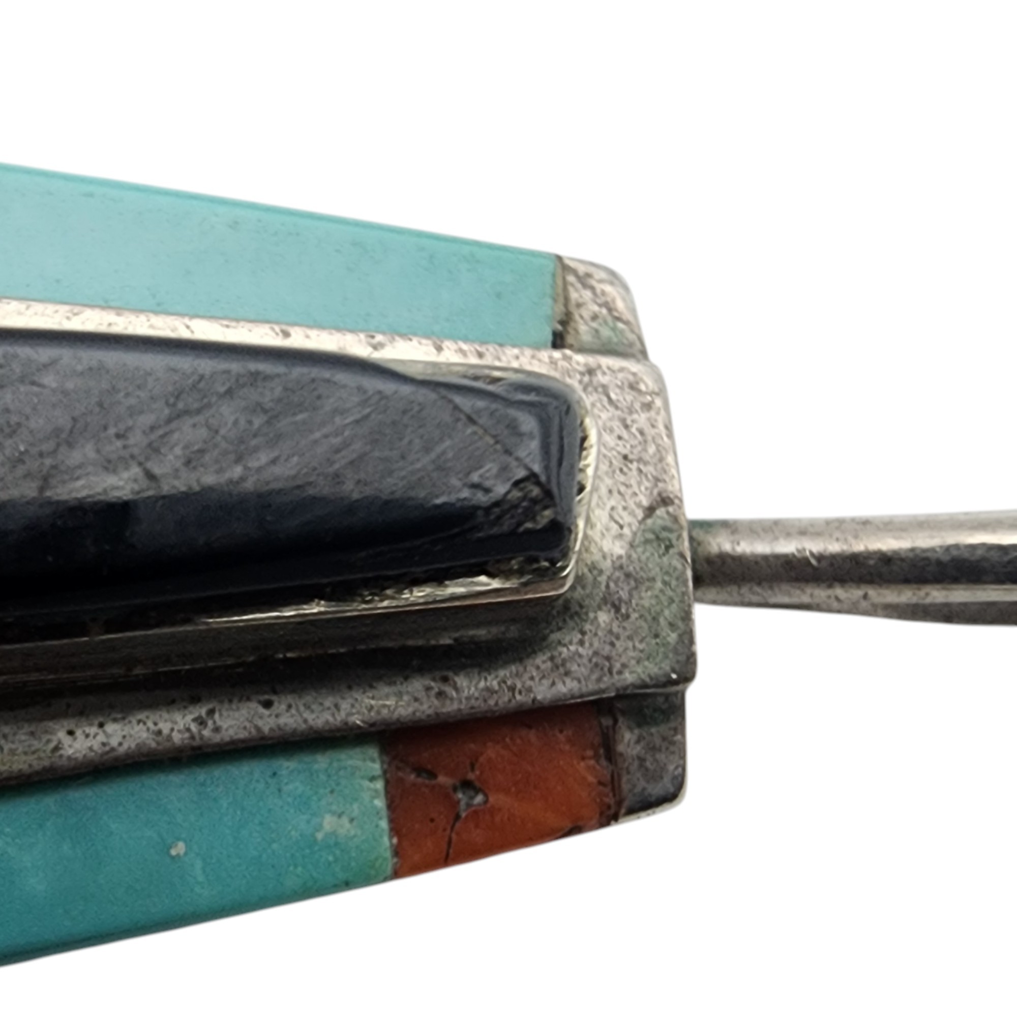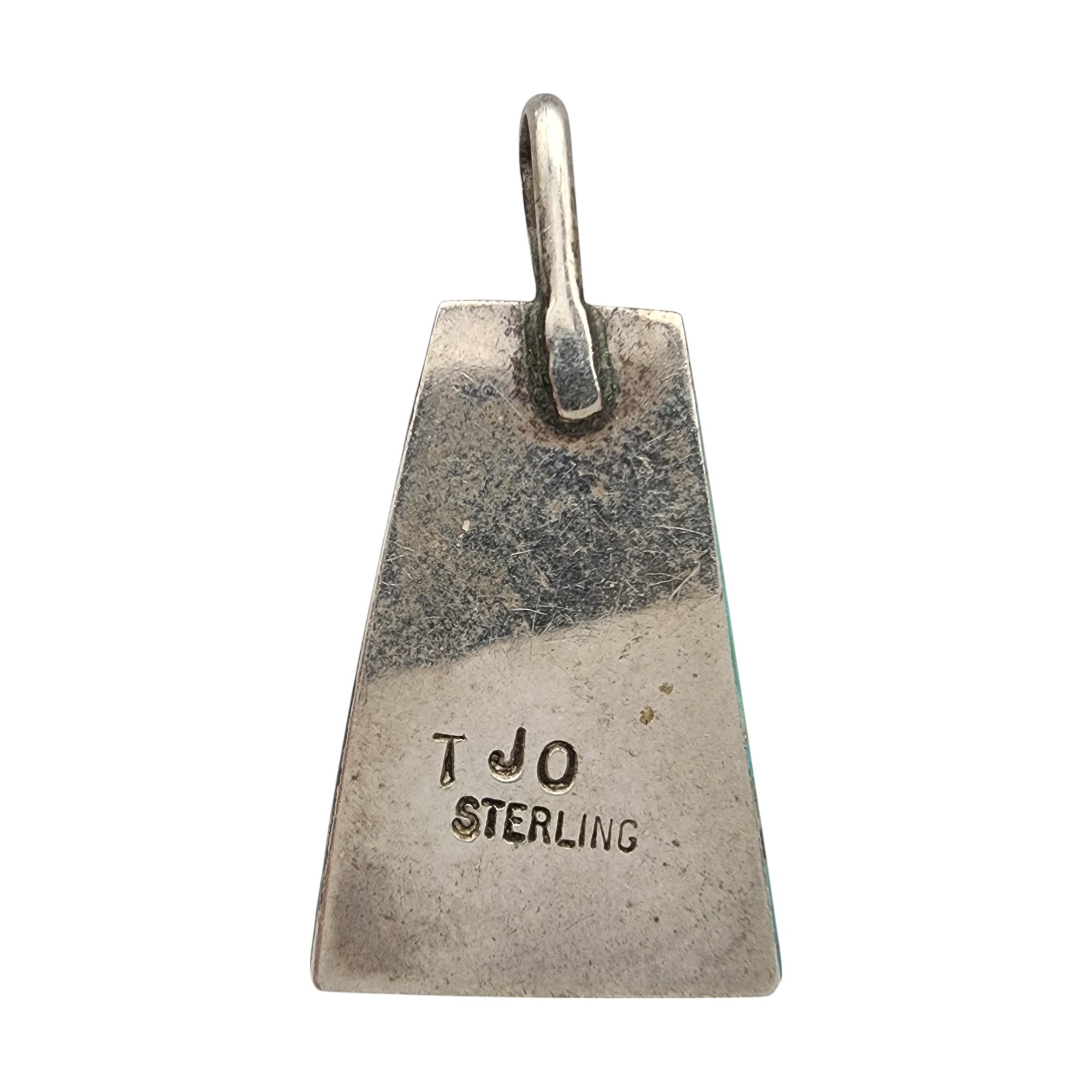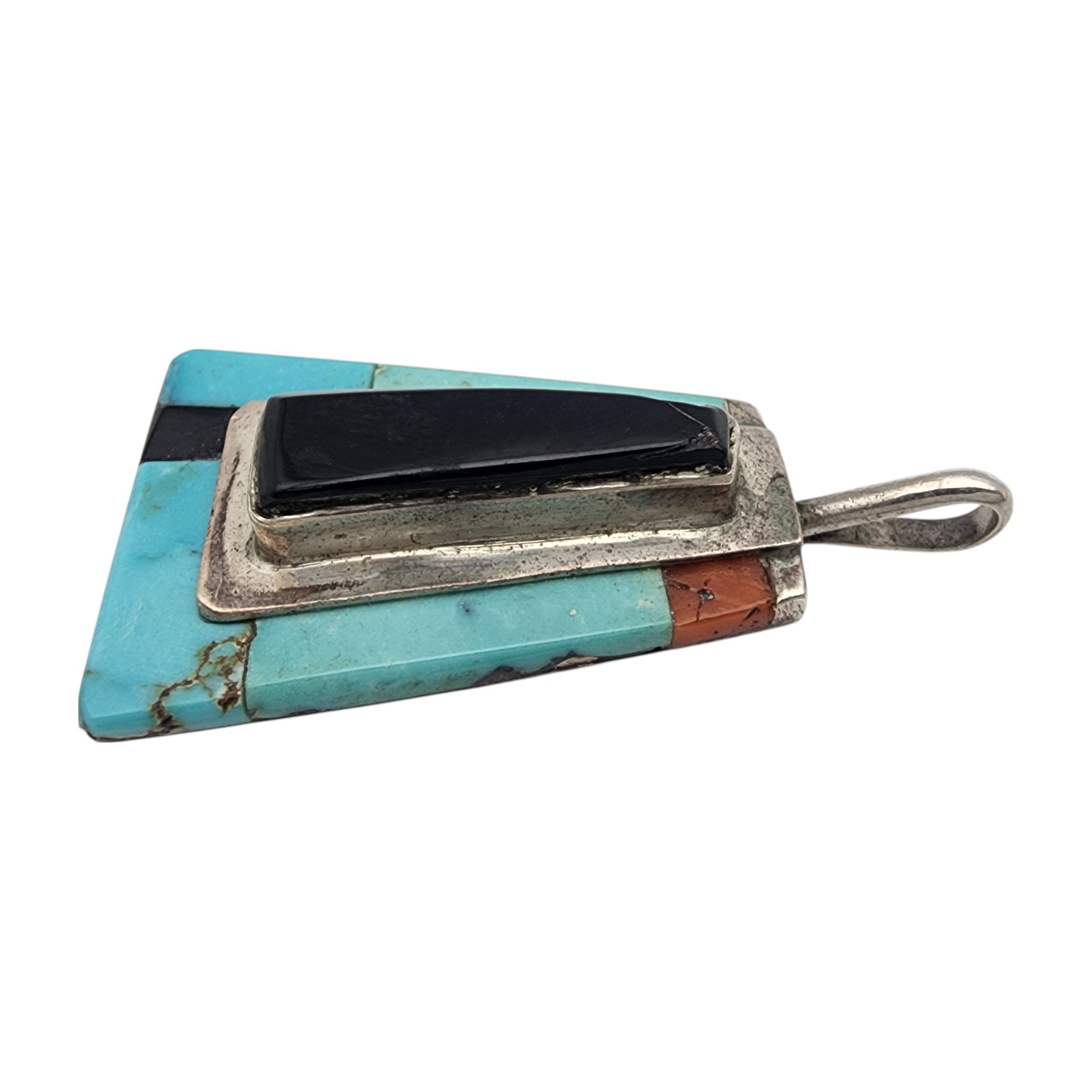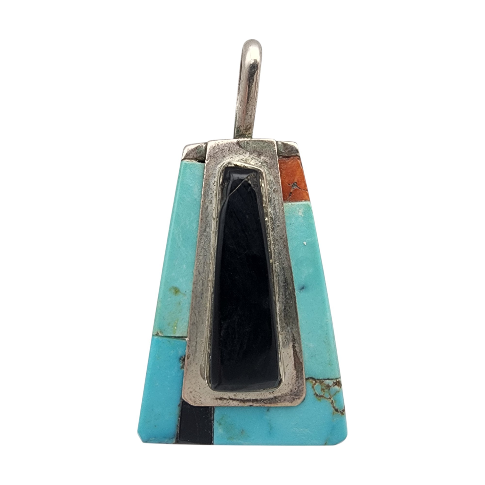 Vintage Theresa Joe Navajo Sterling Multistone (Turquoise, Coral, Jet/Onyx) Inlay Pendant | 5.5g | Small chip and crack at top of black stone – see photo)