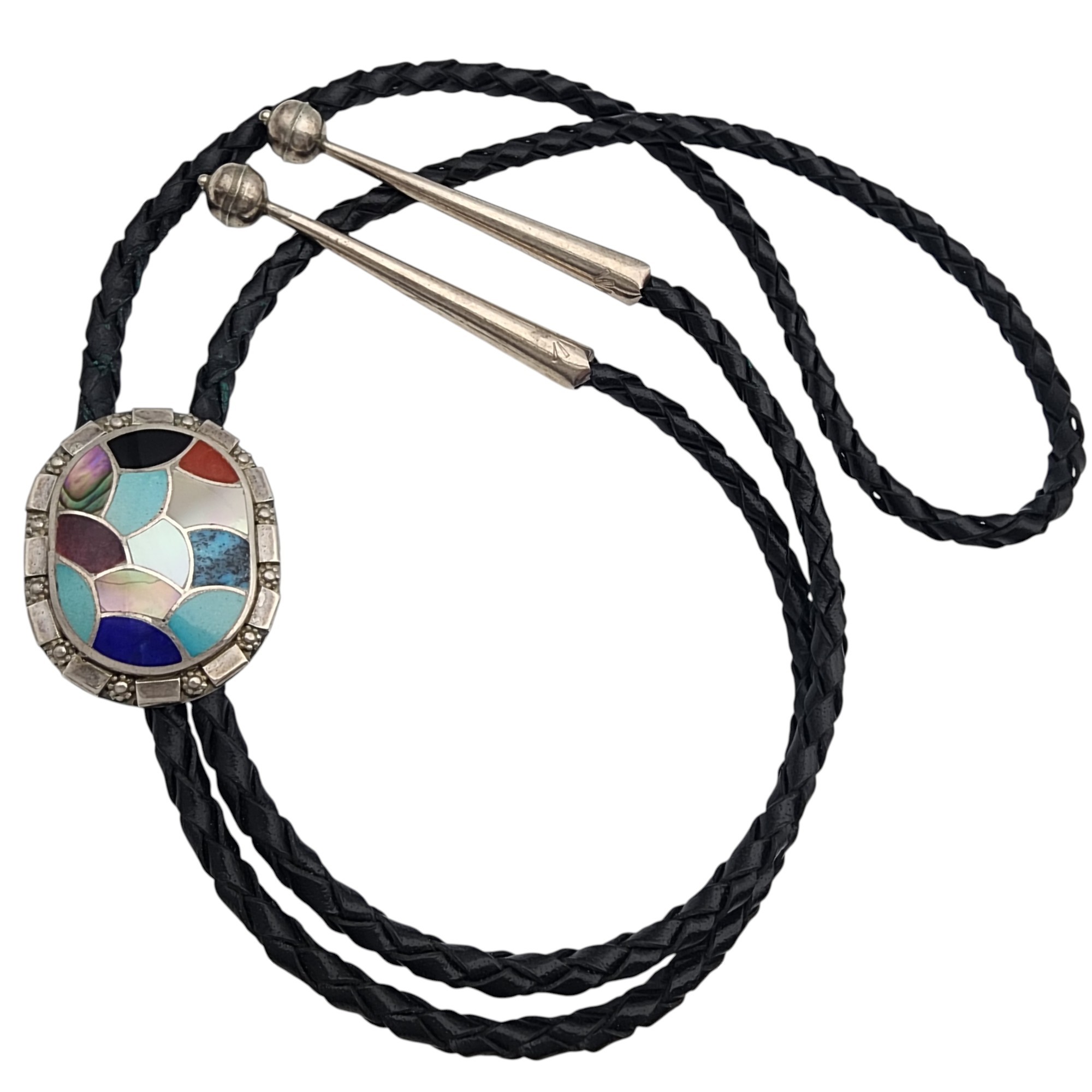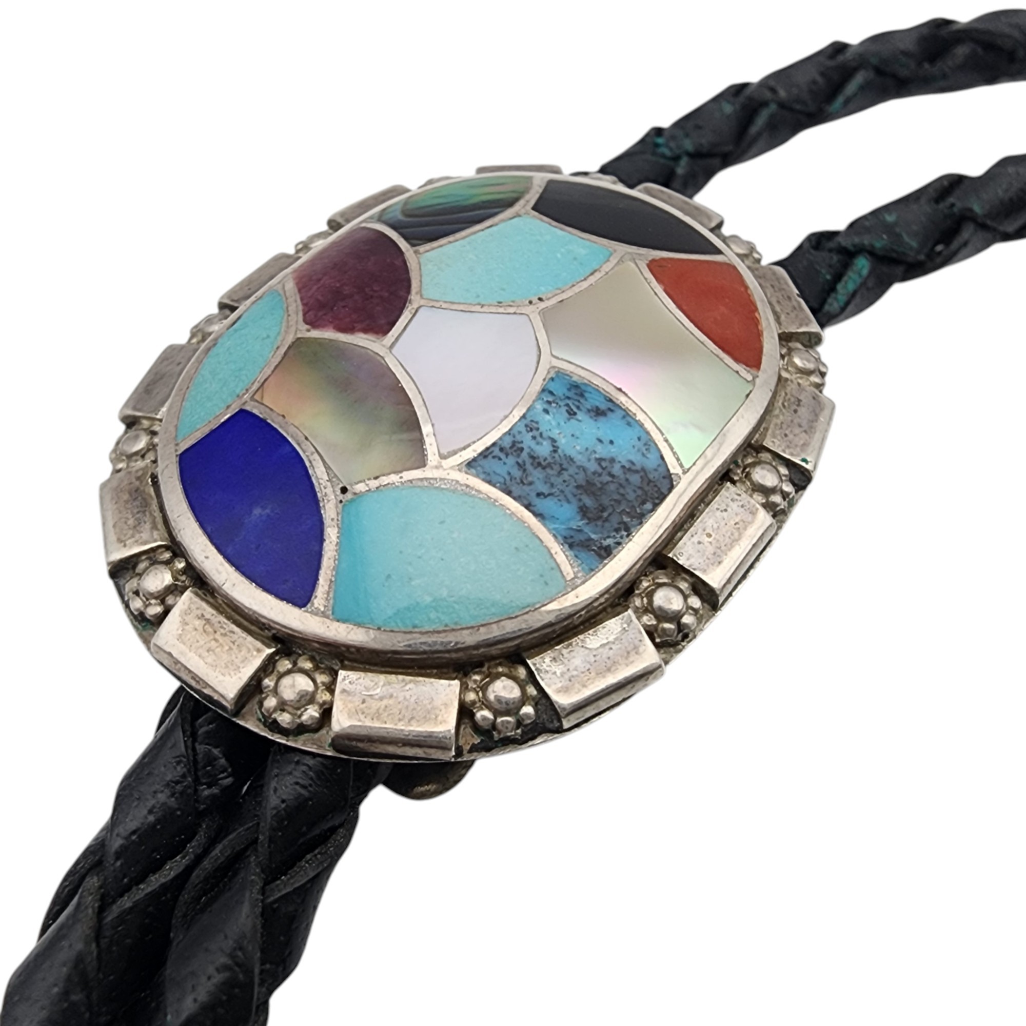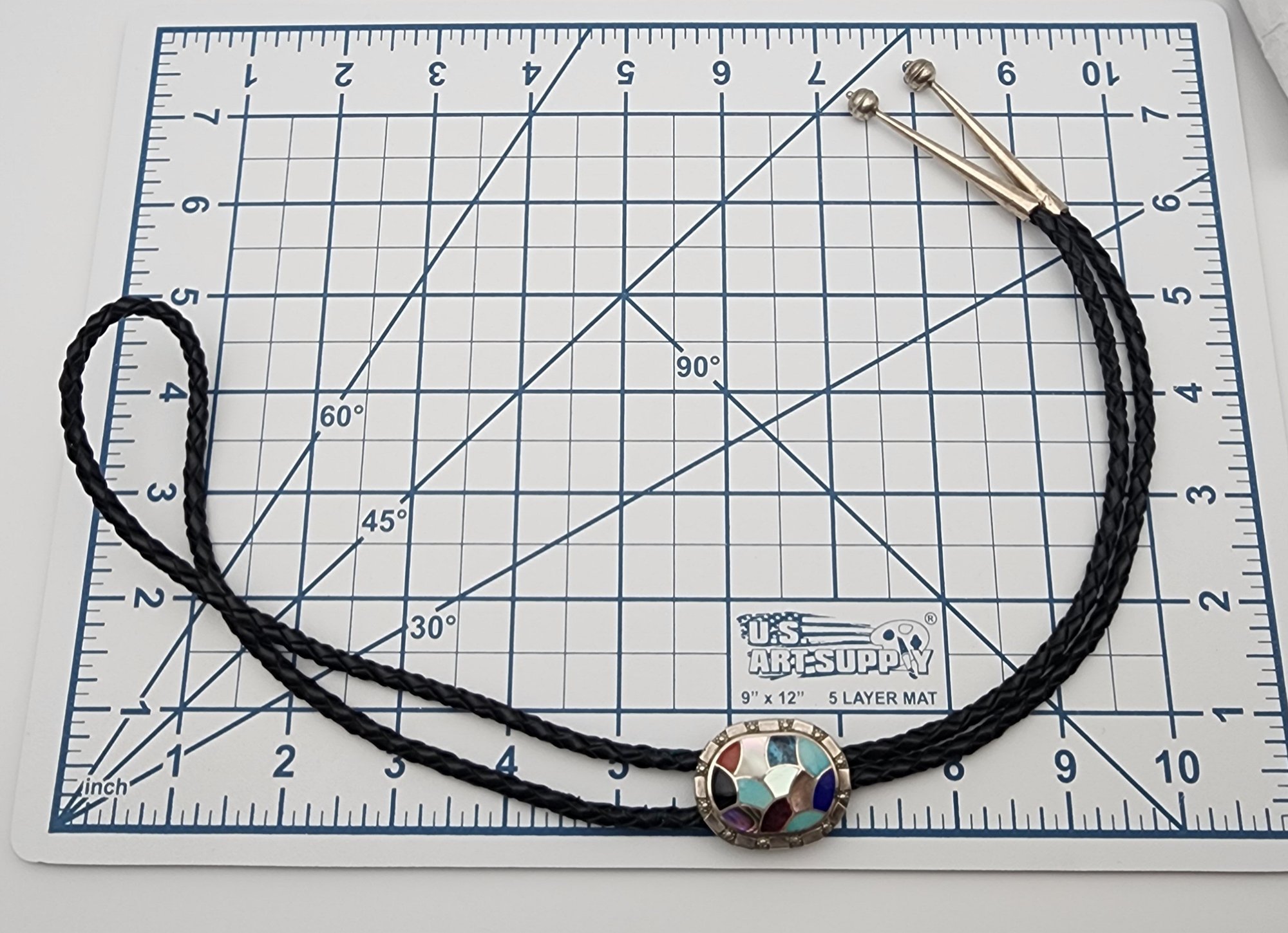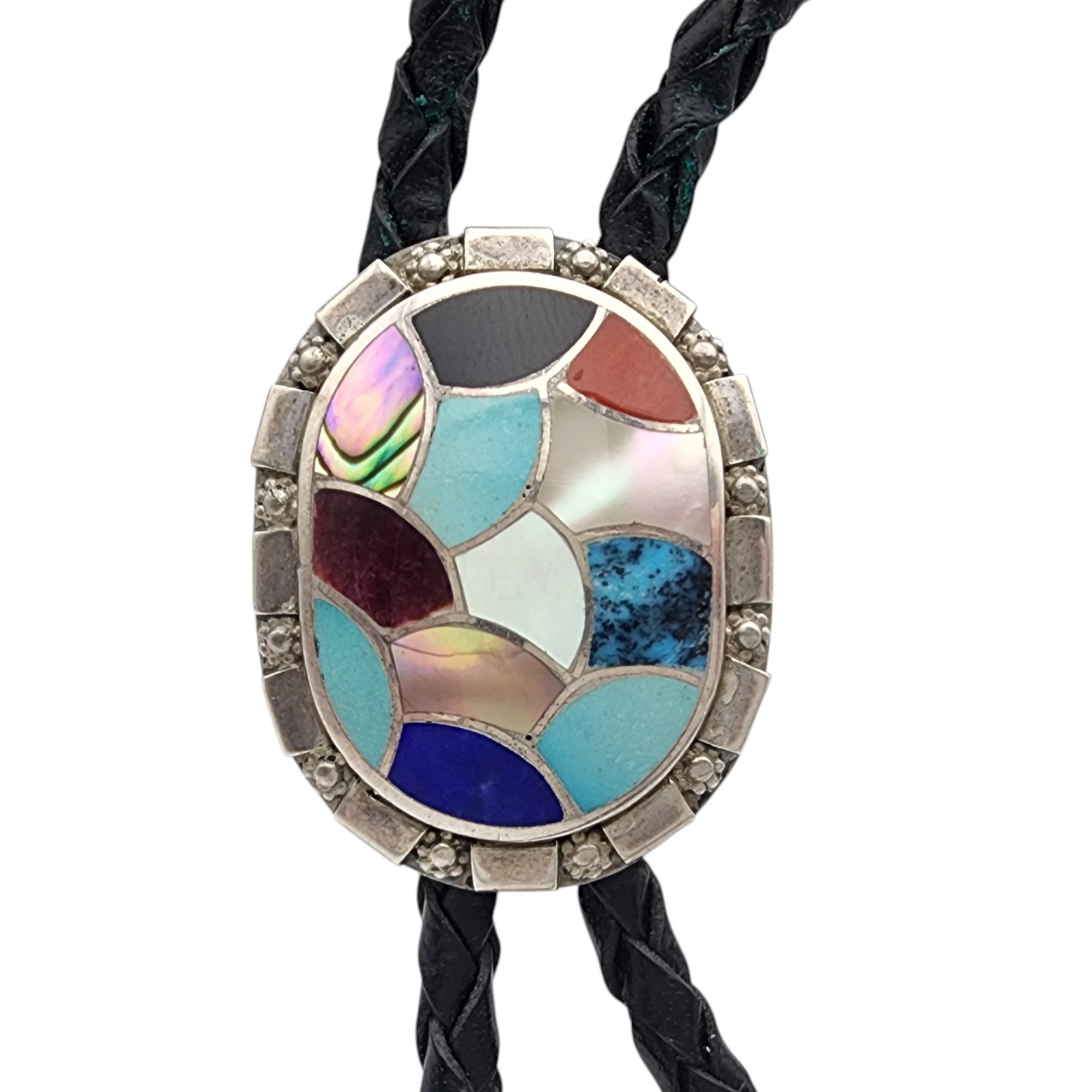 Beautiful Carmichael Haloo Zuni Sterling Multistone (Turquoise, Shell, Spiny Oyster, Jet/Onyx, Coral, Lapis Lazuli, Mother of Pearl) Fish Scale Inlay Bolo Tie | 26.6g – Lot removed from auction