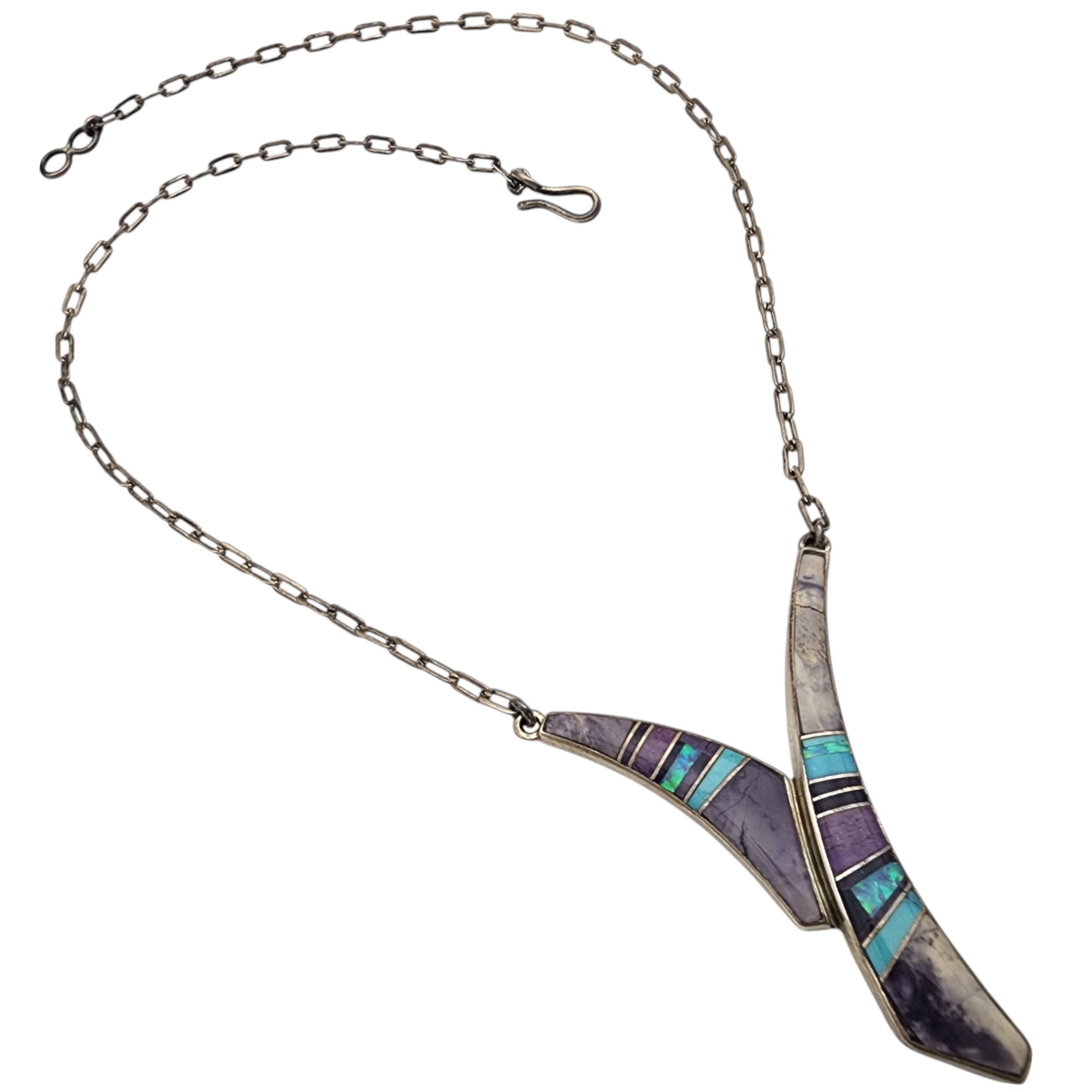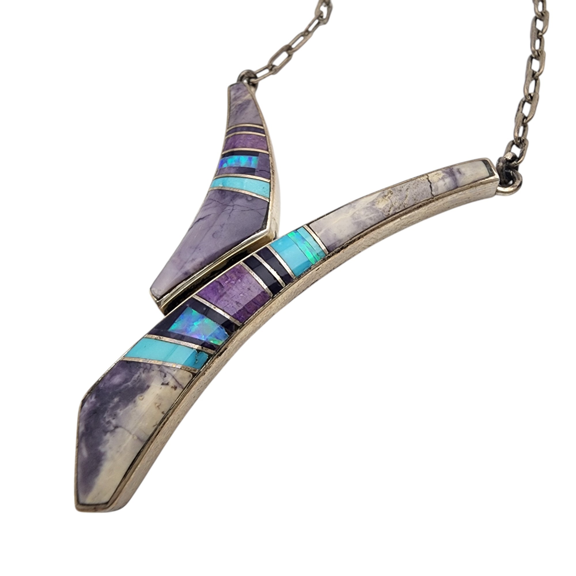 Kenneth Bitsie Navajo Sterling Multistone (Turquoise, opal, charoite/sugilite?/purple spiny oyster?) Inlay Necklace | 13.6g