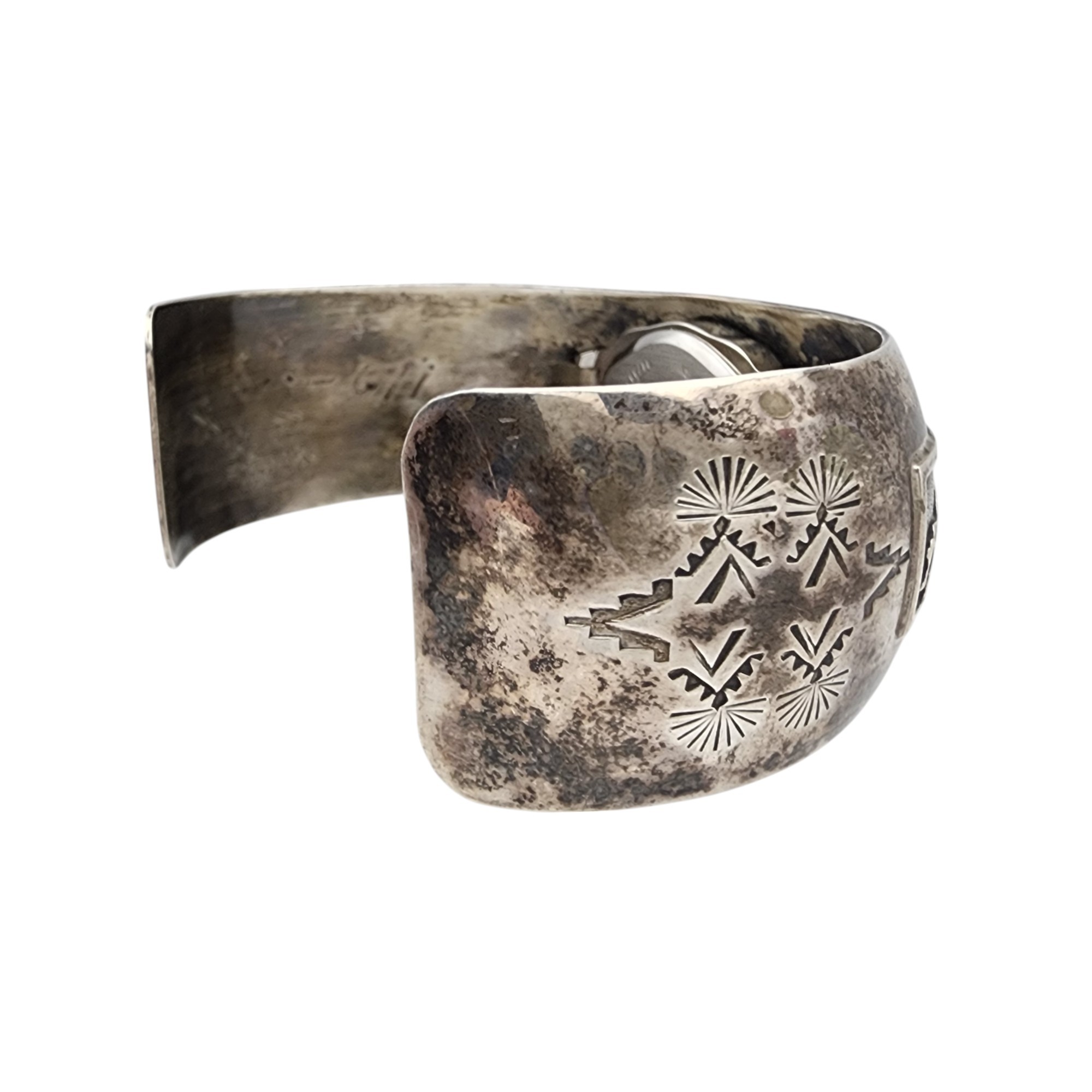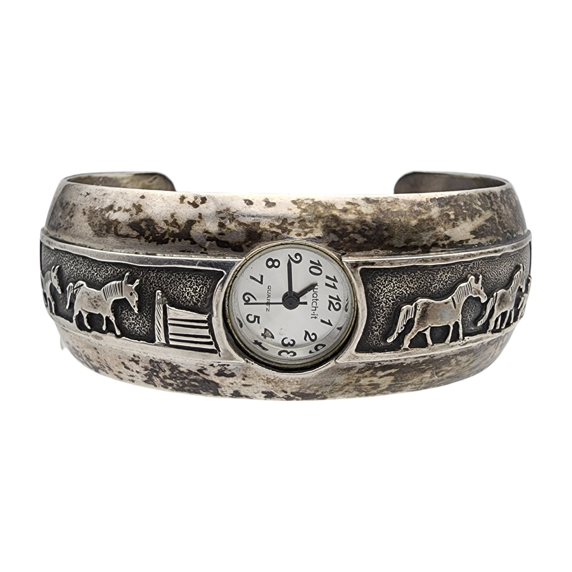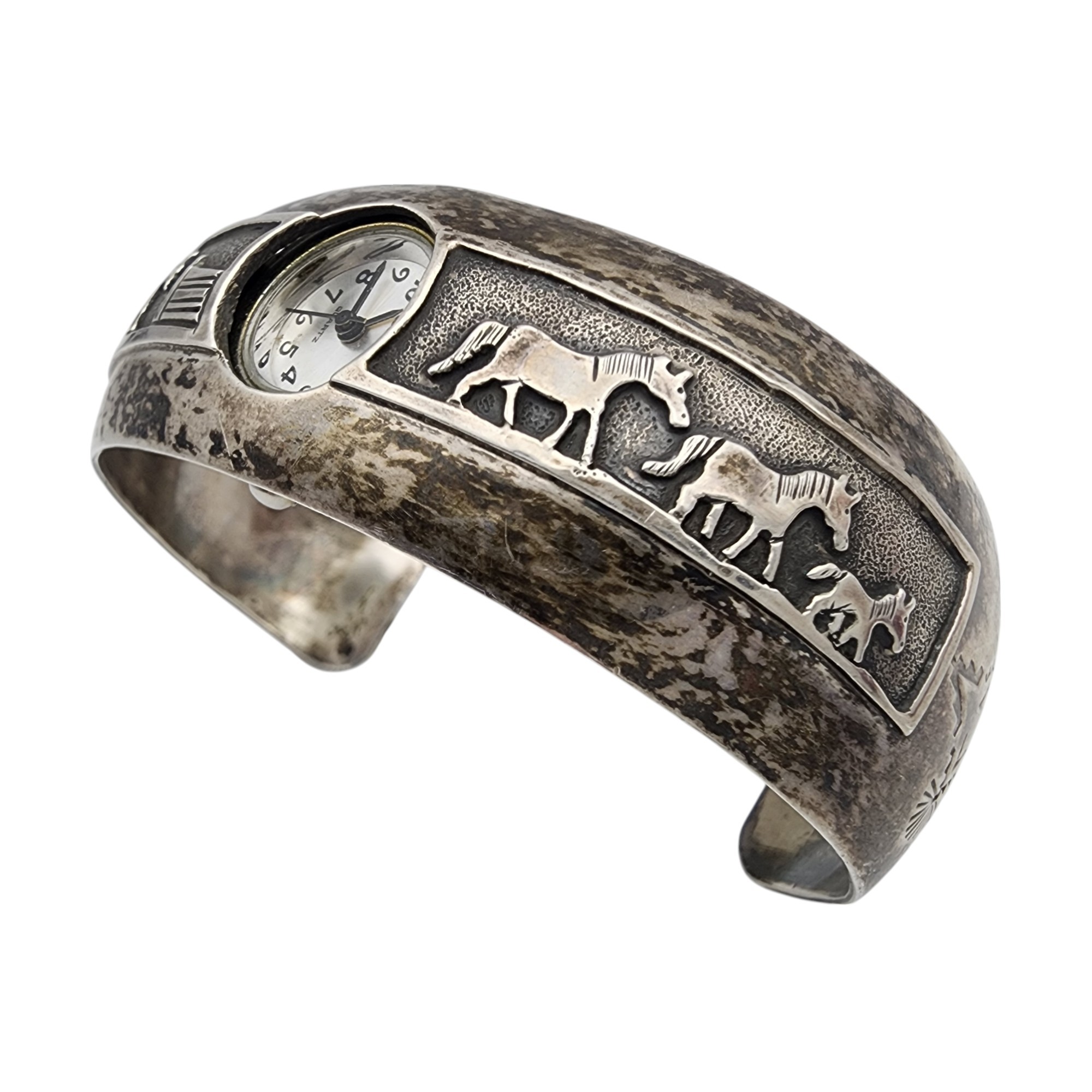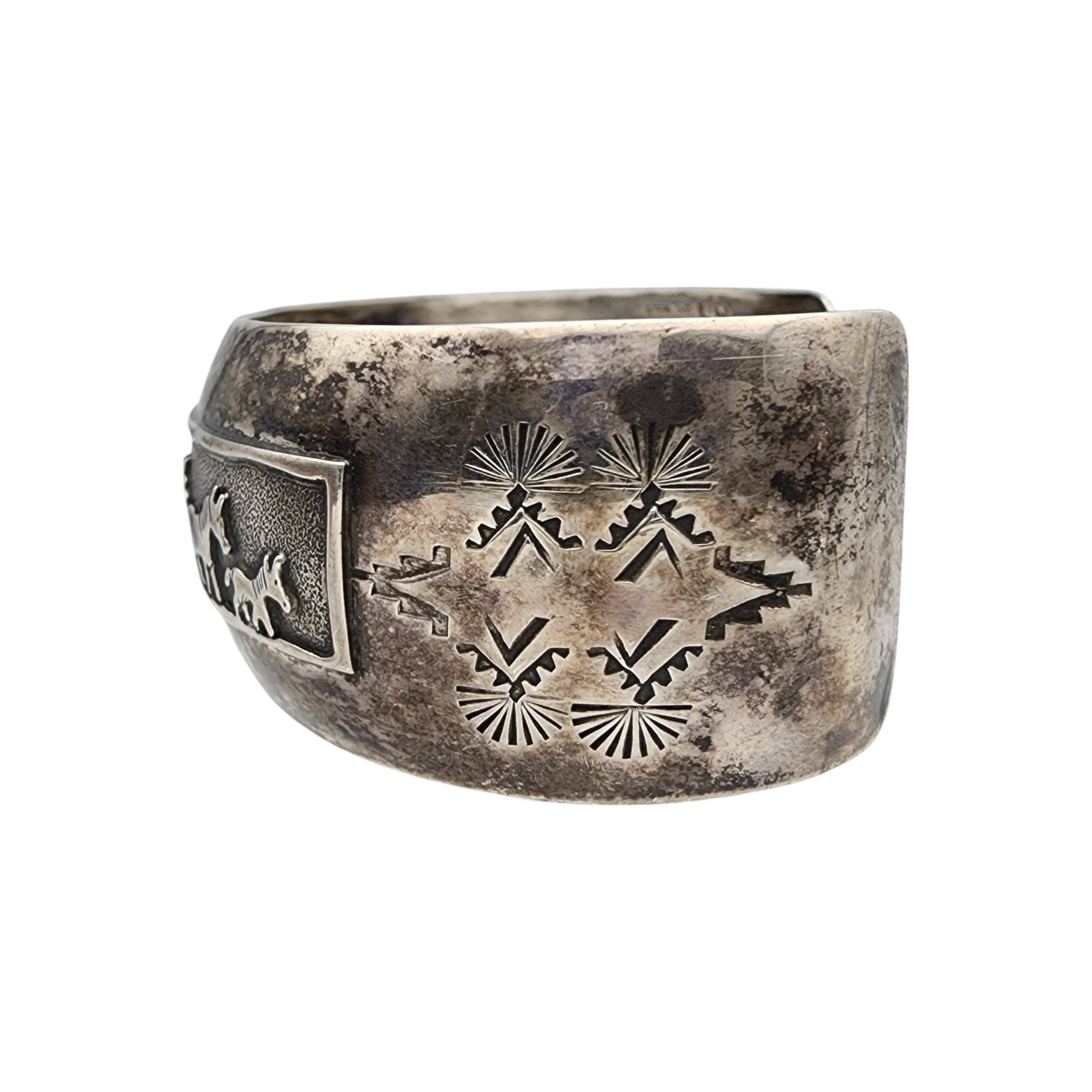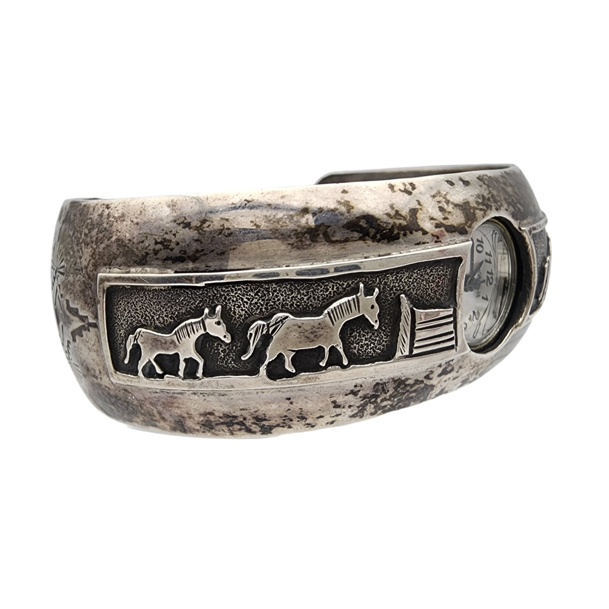 Leander Nezzie Navajo Sterling Storyteller Horse Stamped Watch Cuff Bracelet | 42.9g