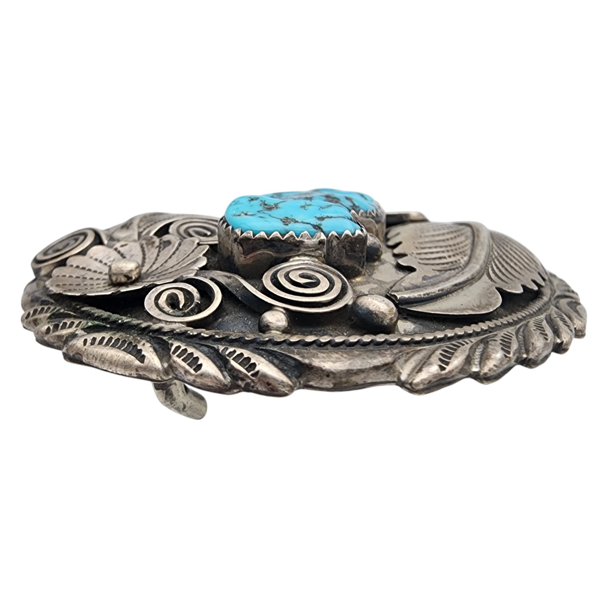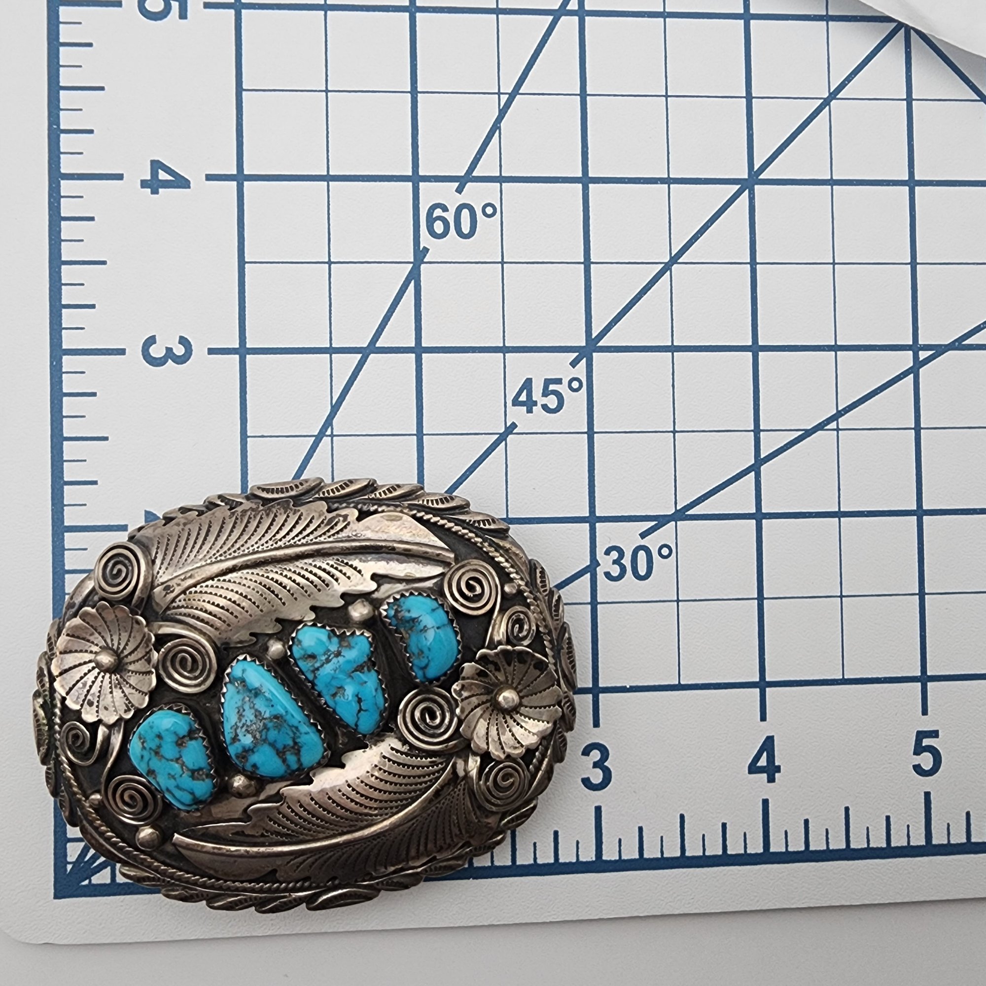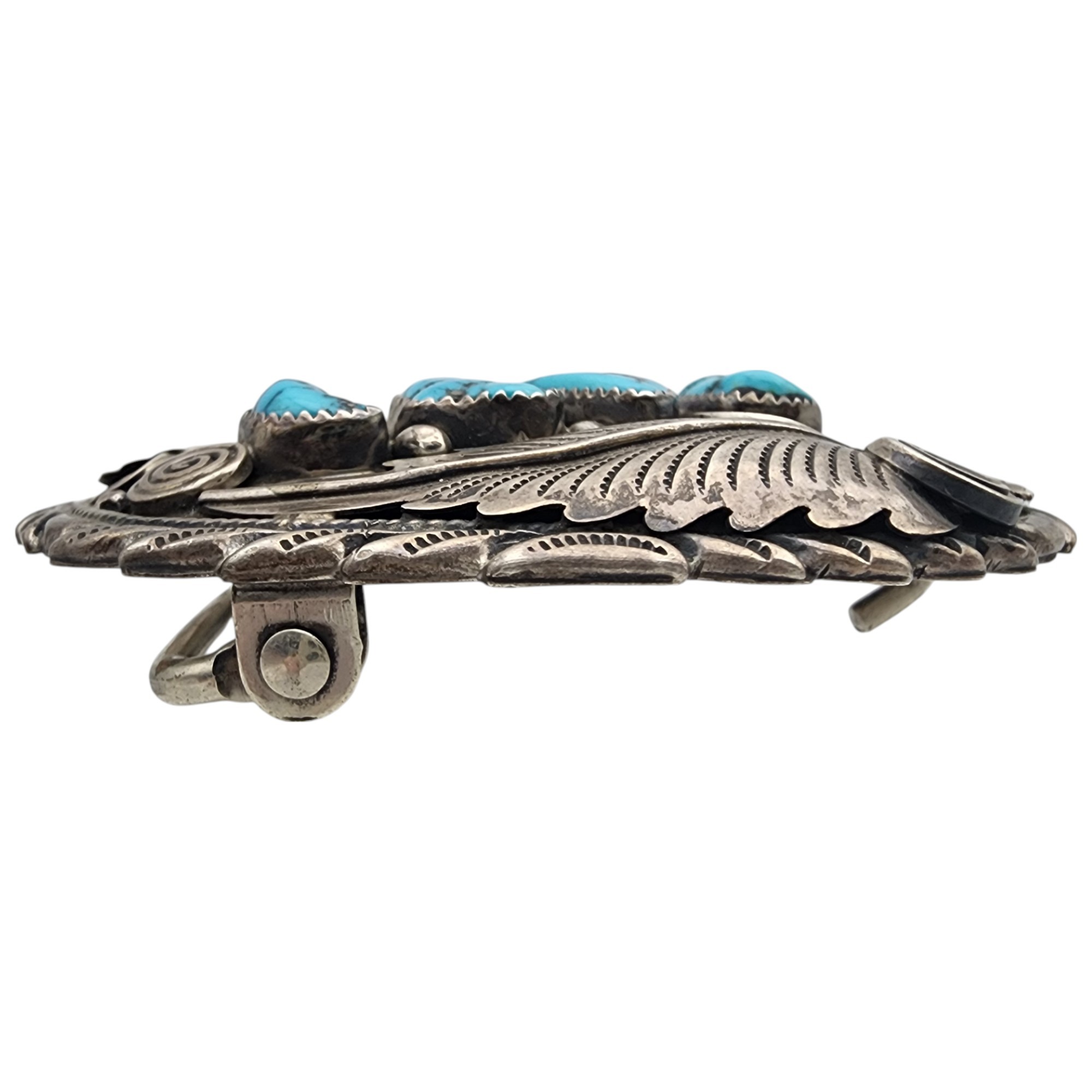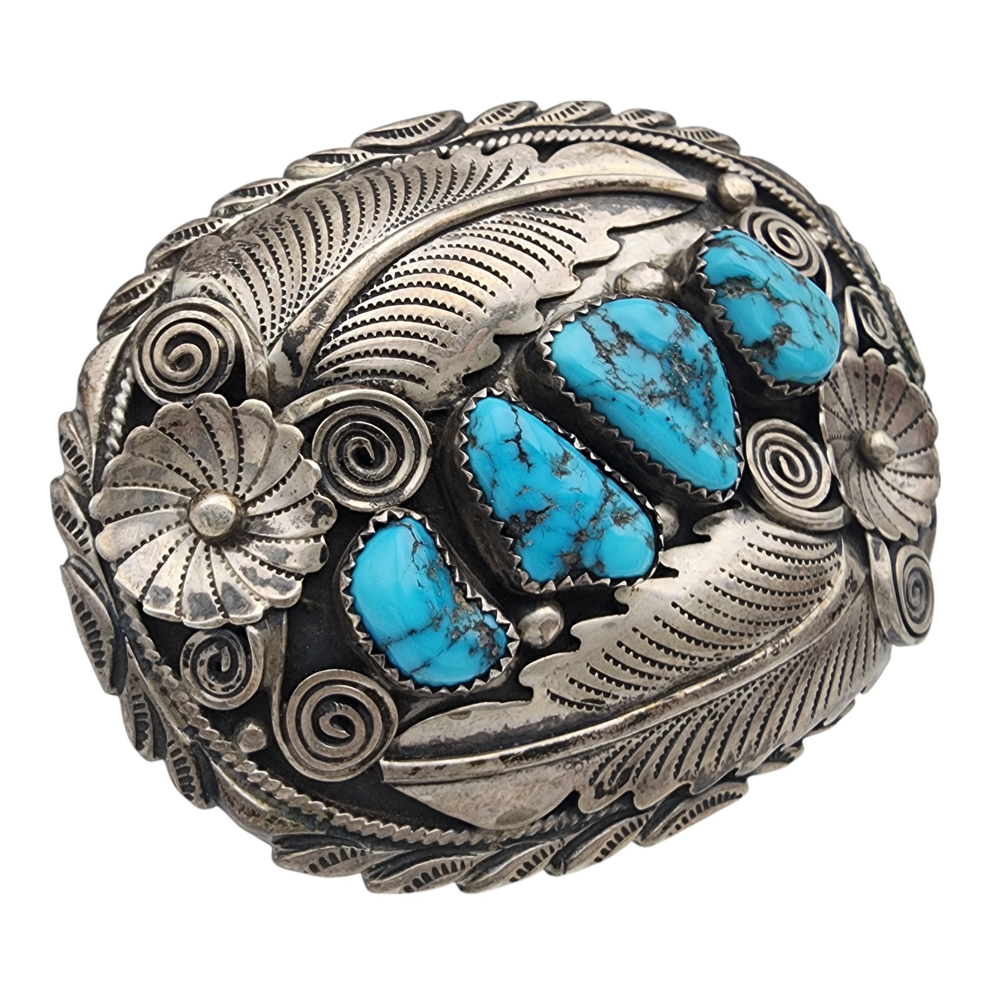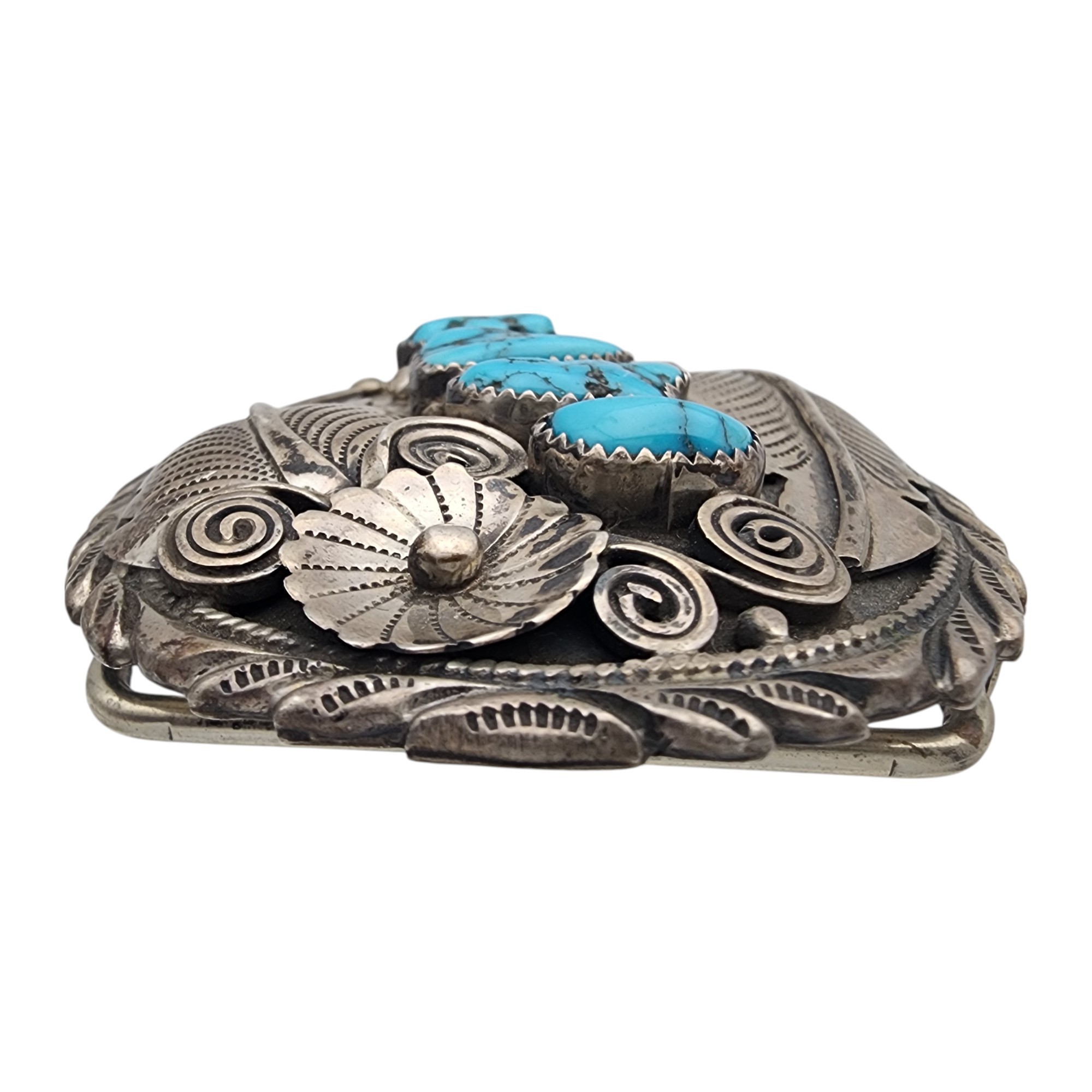 Jimmy Yazzie Navajo Sterling Turquoise Belt Buckle 48.4g – amazing applique details on this belt buckle!