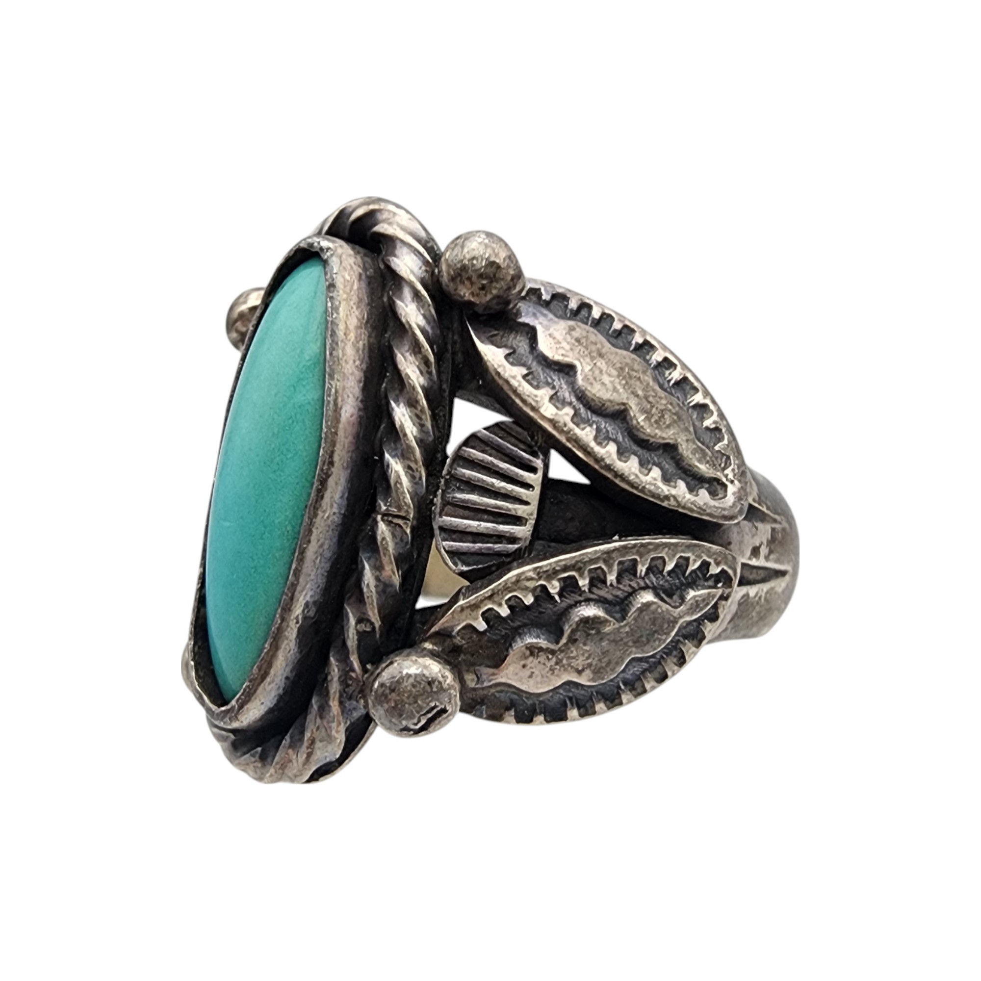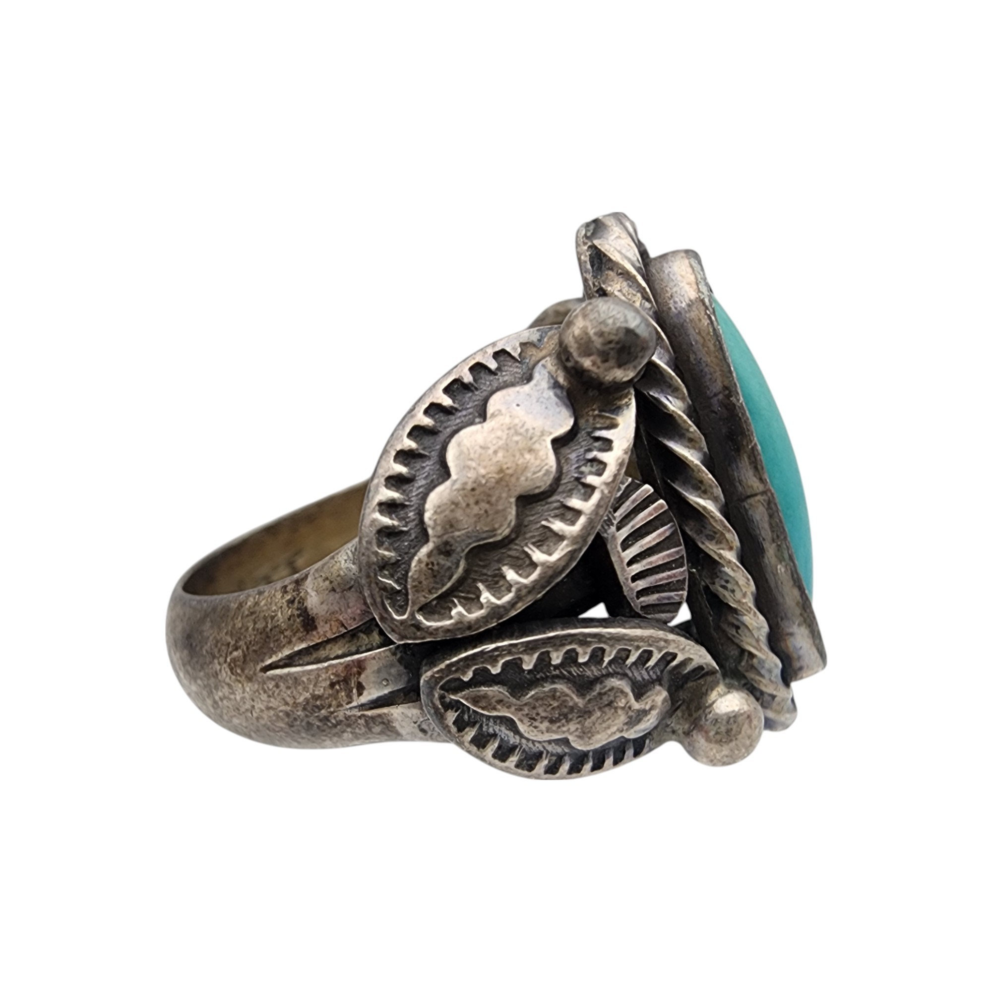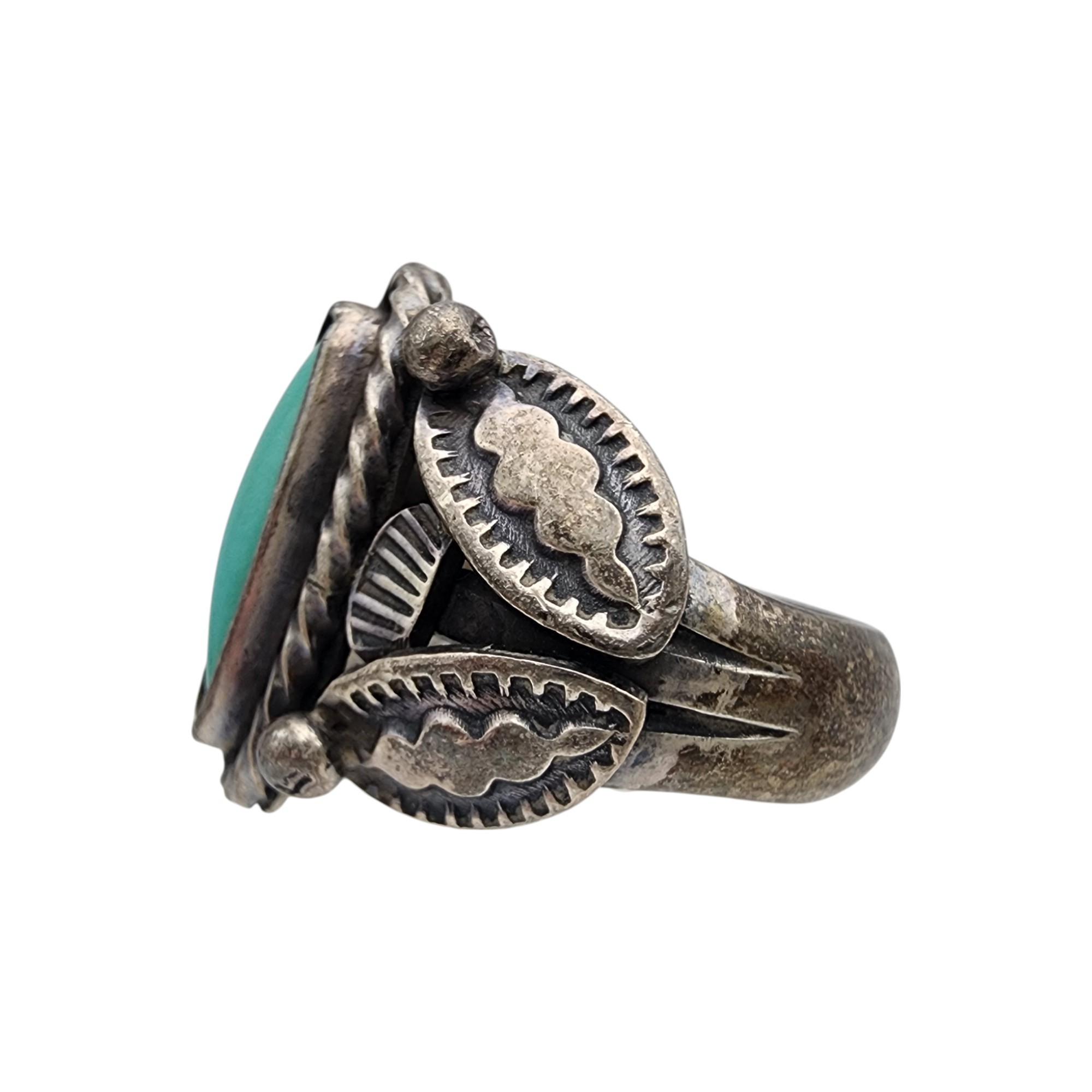 Signed Navajo Sterling Turquoise Stamped Ring Sz 7