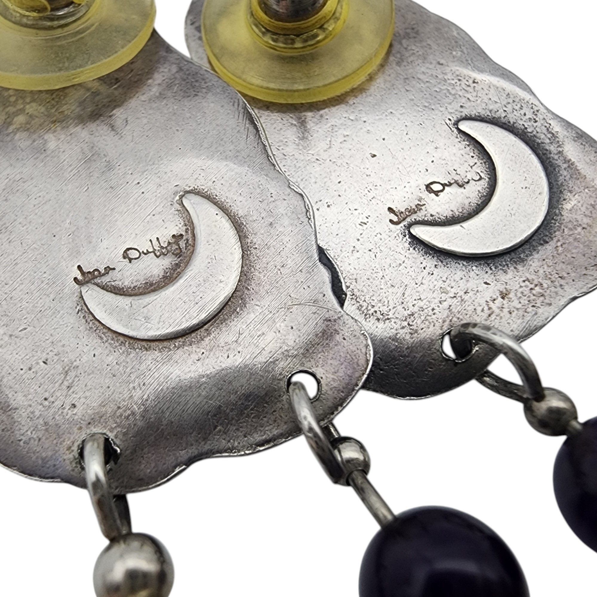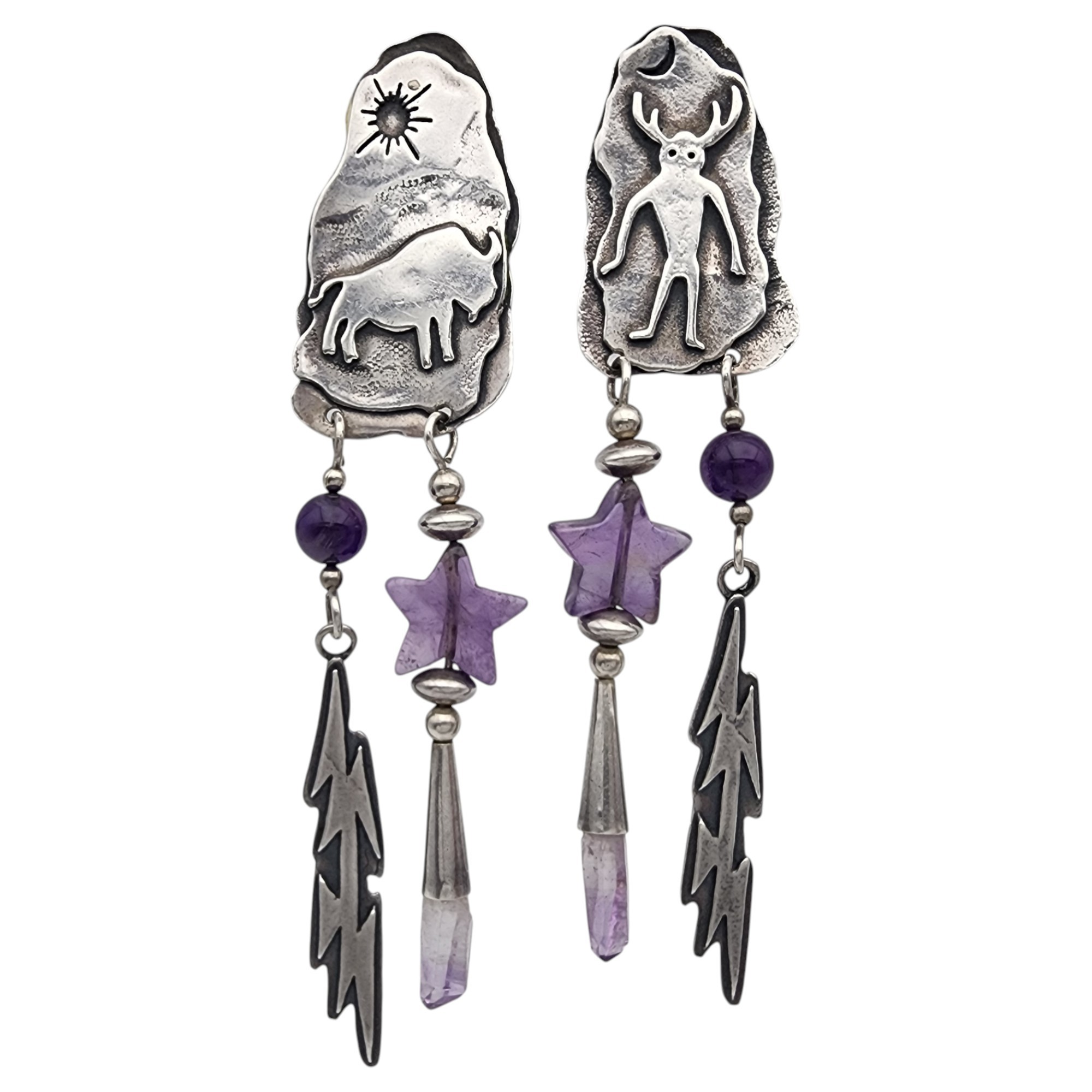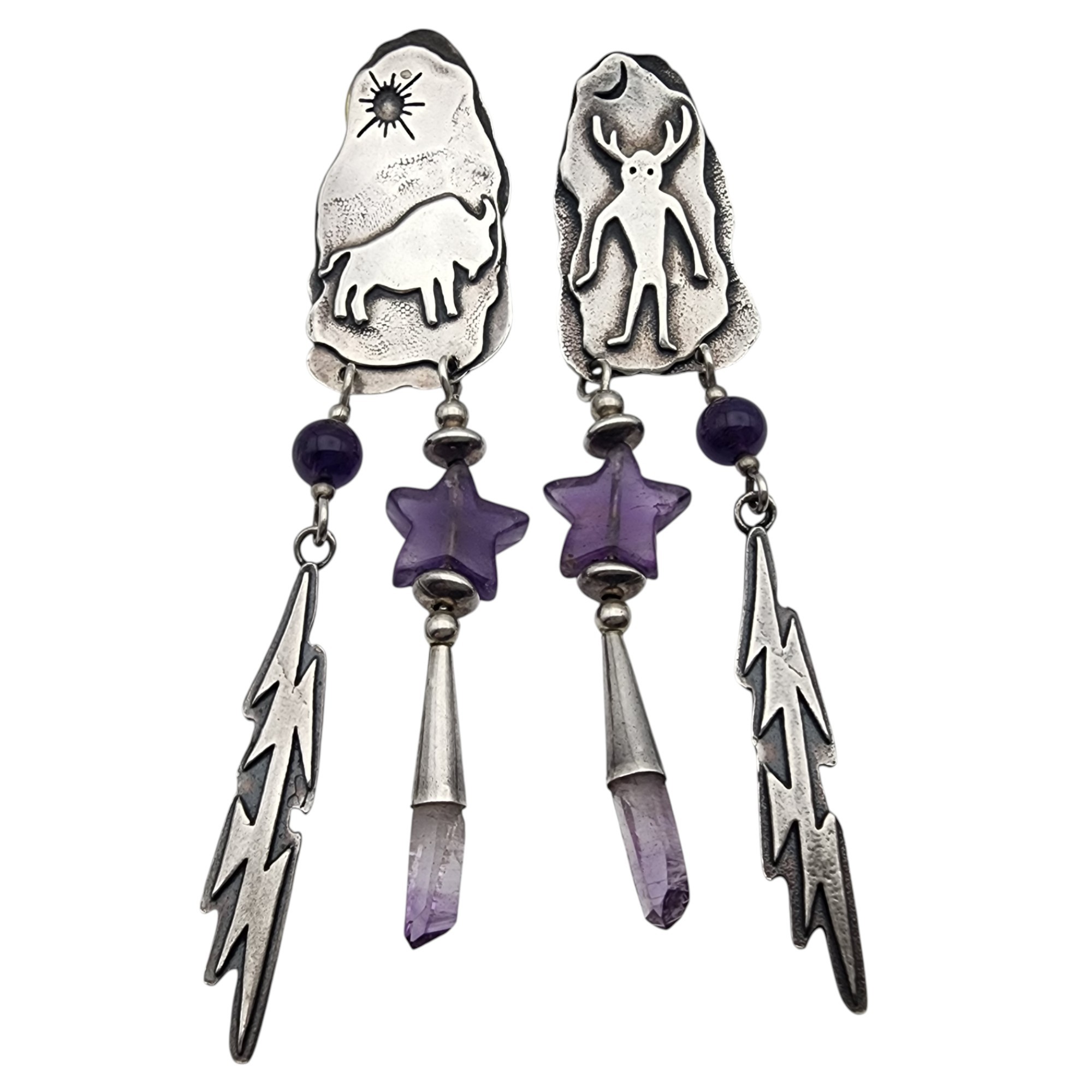 Gorgeous Signed ‘Jean Duffy’ Southwest Sterling and Amethyst Petroglyph and Lightning Bolt Dangle Earrings 17.2g