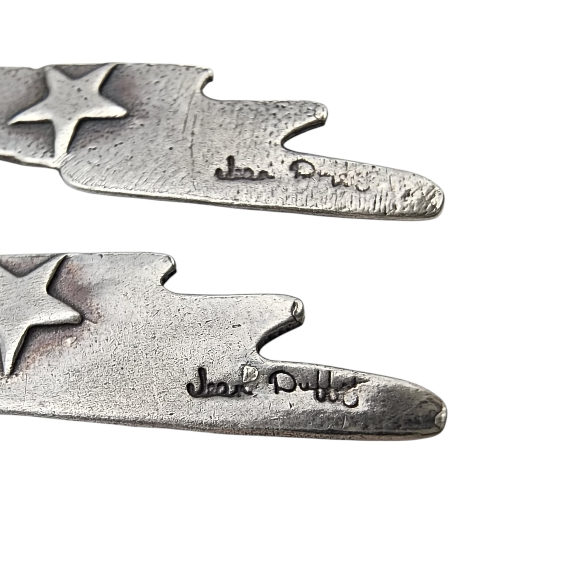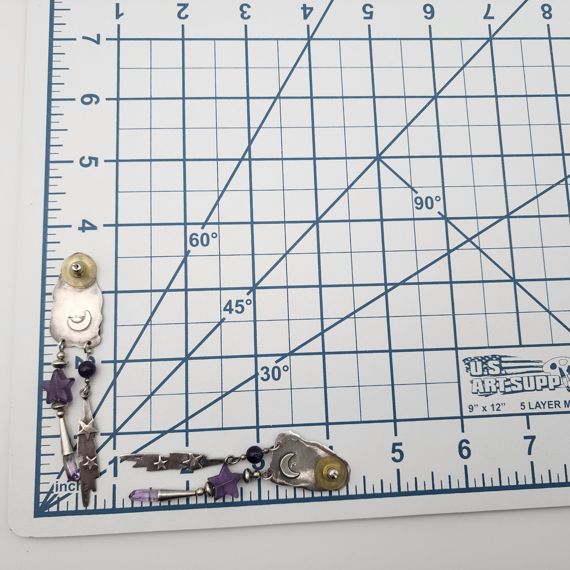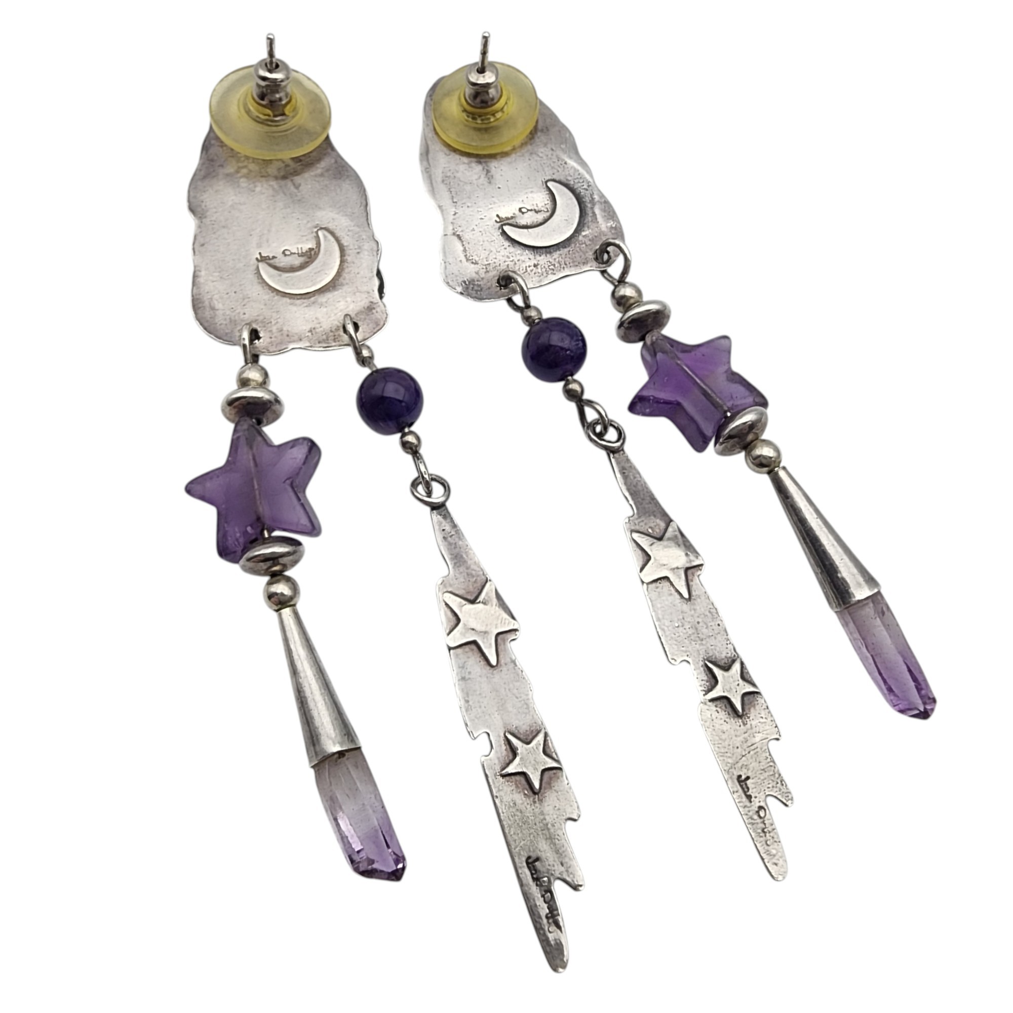 Gorgeous Signed ‘Jean Duffy’ Southwest Sterling and Amethyst Petroglyph and Lightning Bolt Dangle Earrings 17.2g