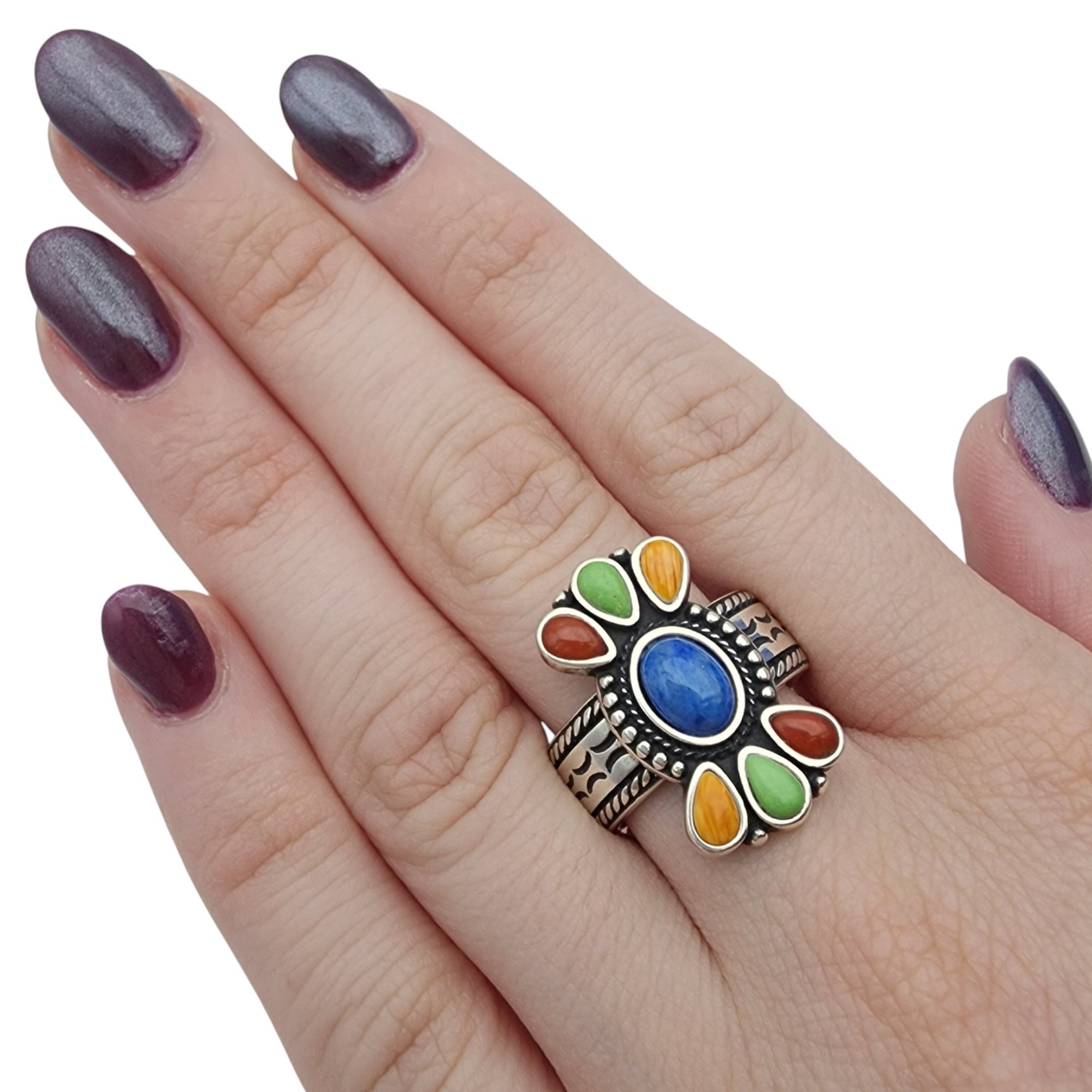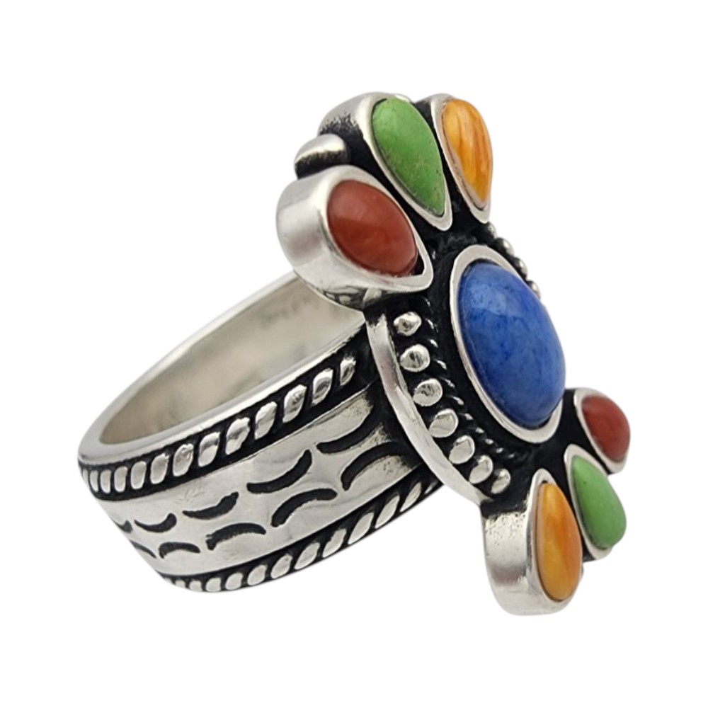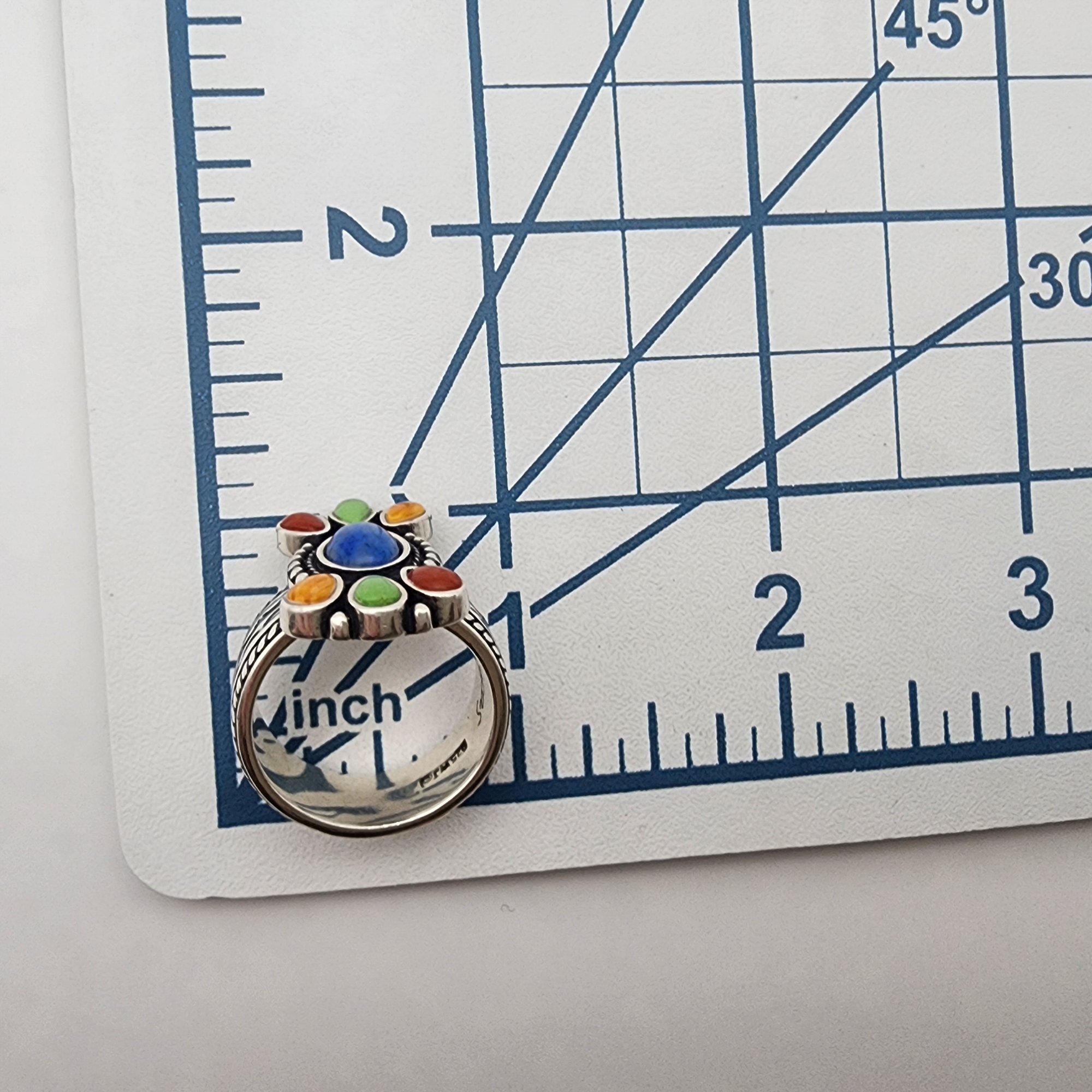 Amazing! Don Lucas for Waldeck Sterling Multistone – coral, spiny oyster, gaspeite, lapis lazuli – Cluster Ring Sz 9 | 14.4g – solid, well made ring!