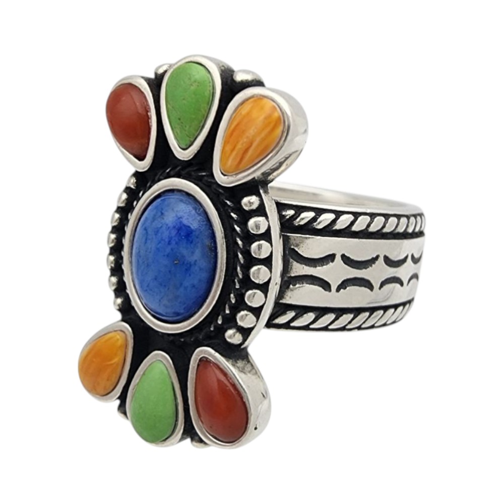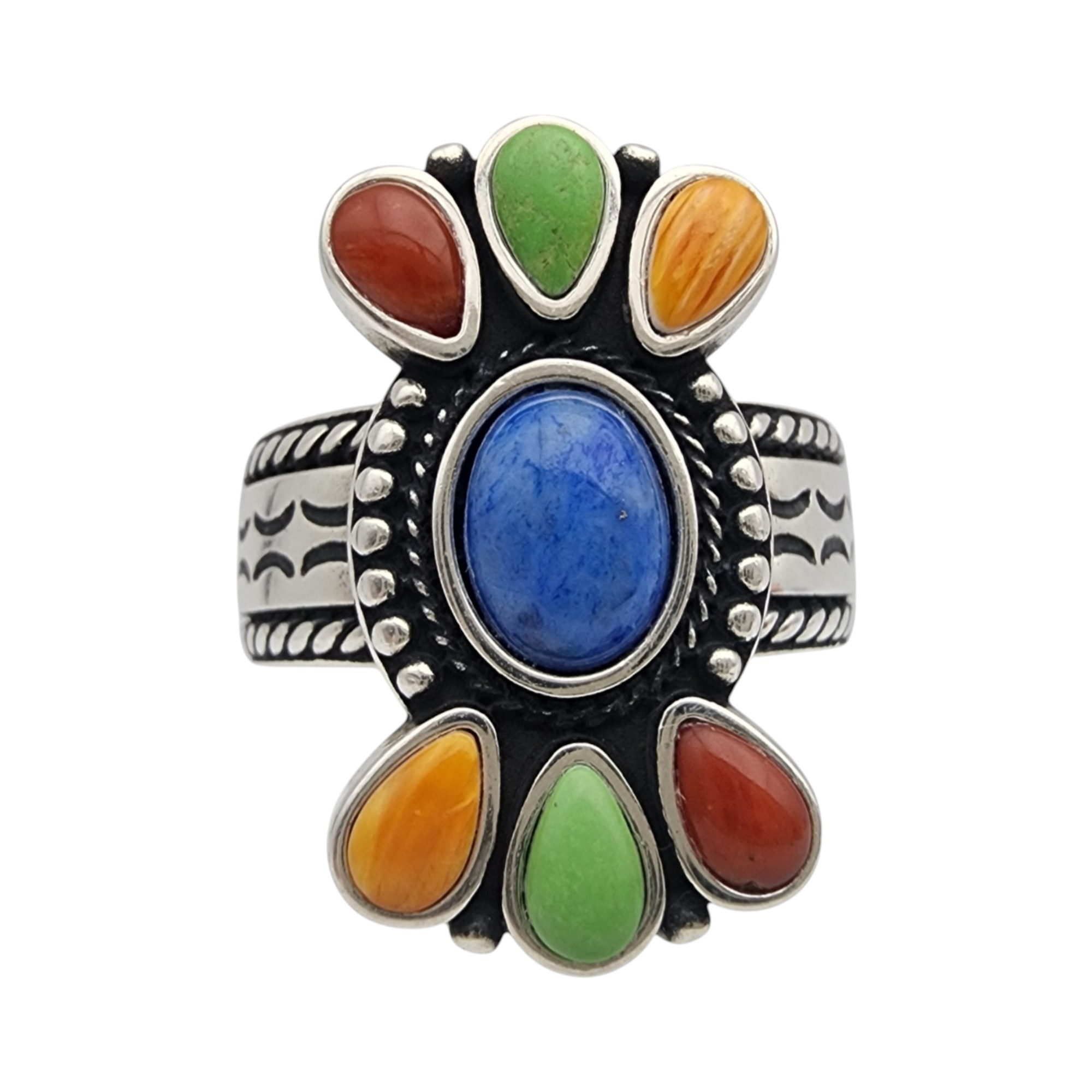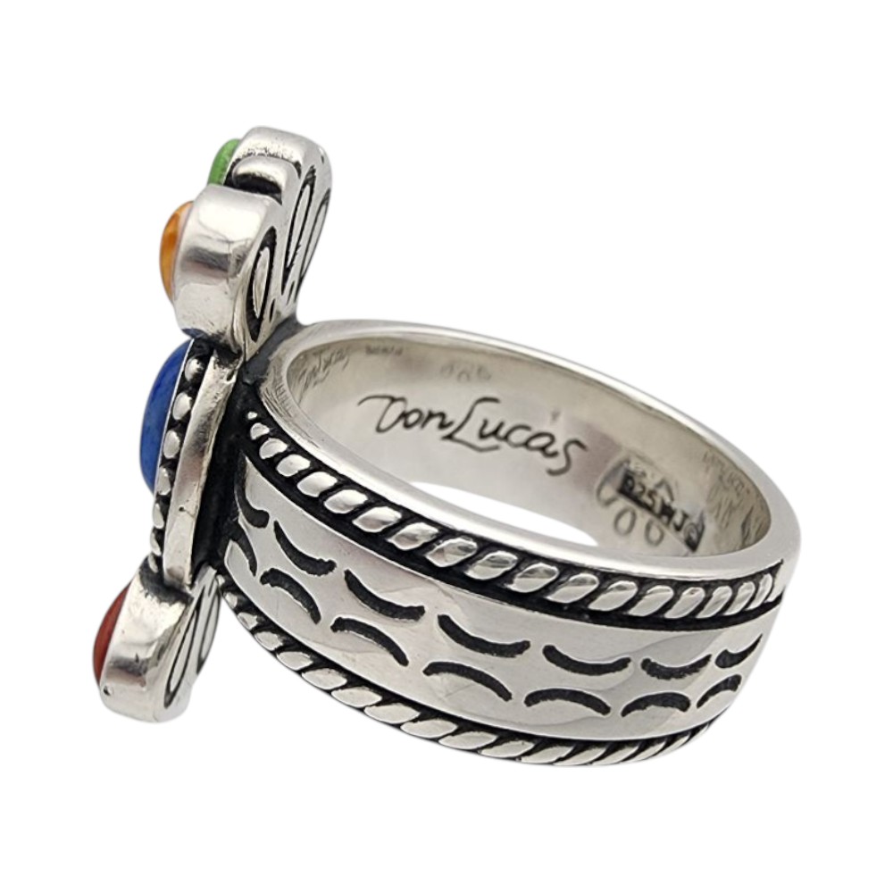Amazing! Don Lucas for Waldeck Sterling Multistone – coral, spiny oyster, gaspeite, lapis lazuli – Cluster Ring Sz 9 | 14.4g – solid, well made ring!