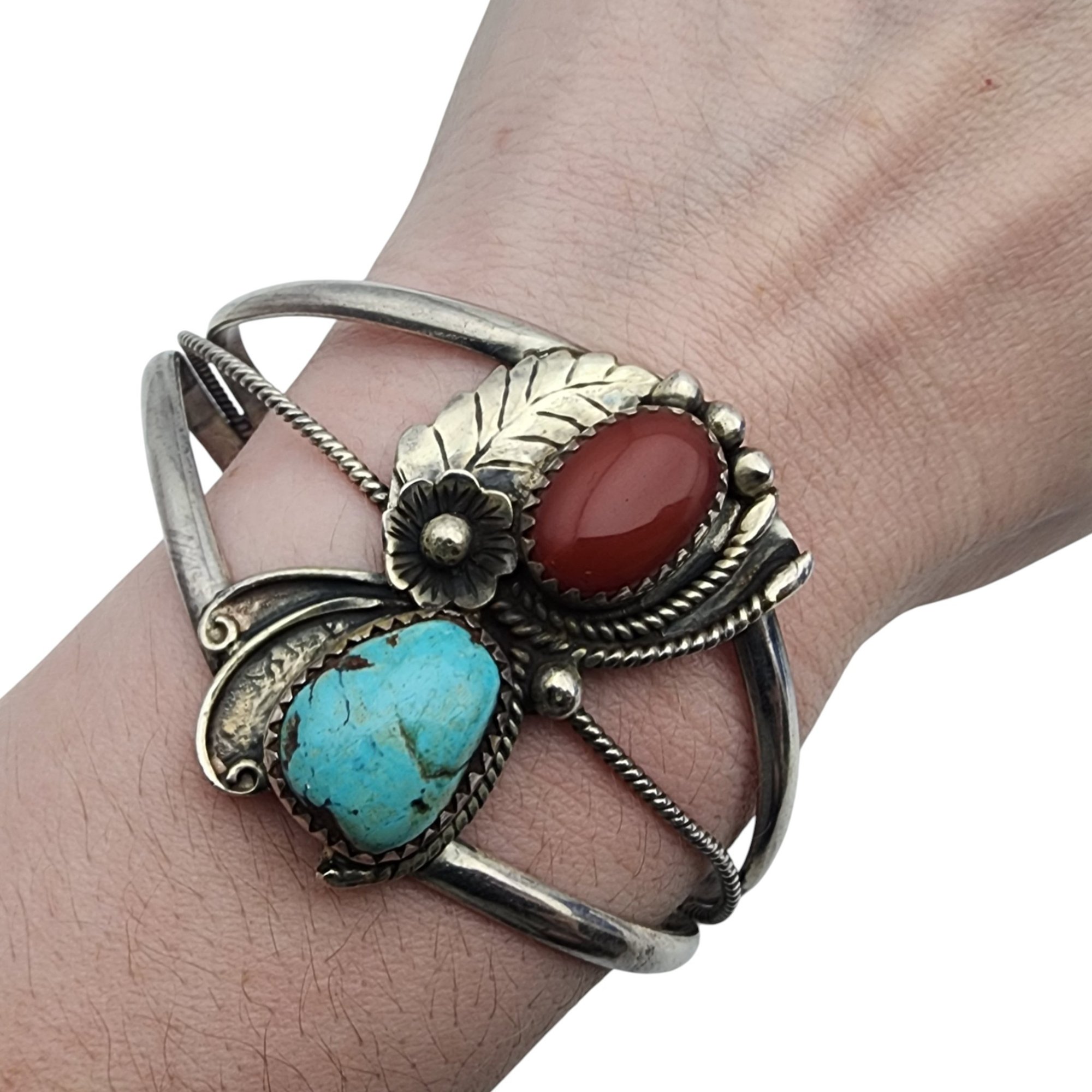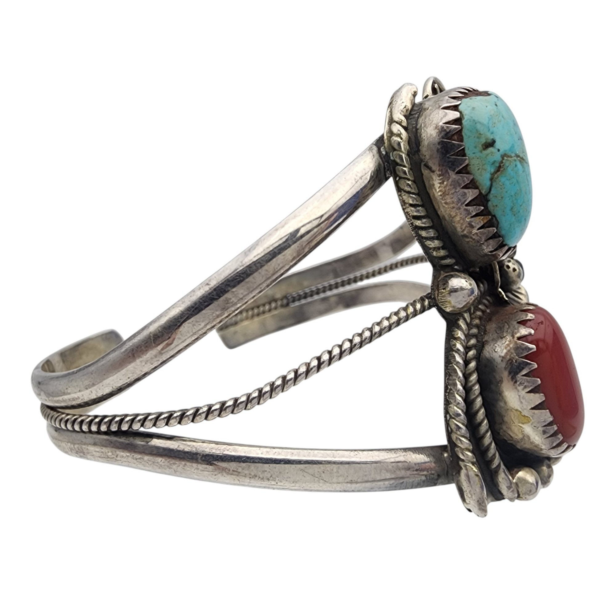Vintage Navajo Sterling Turquoise and Coral Cuff Bracelet – 32.6g
