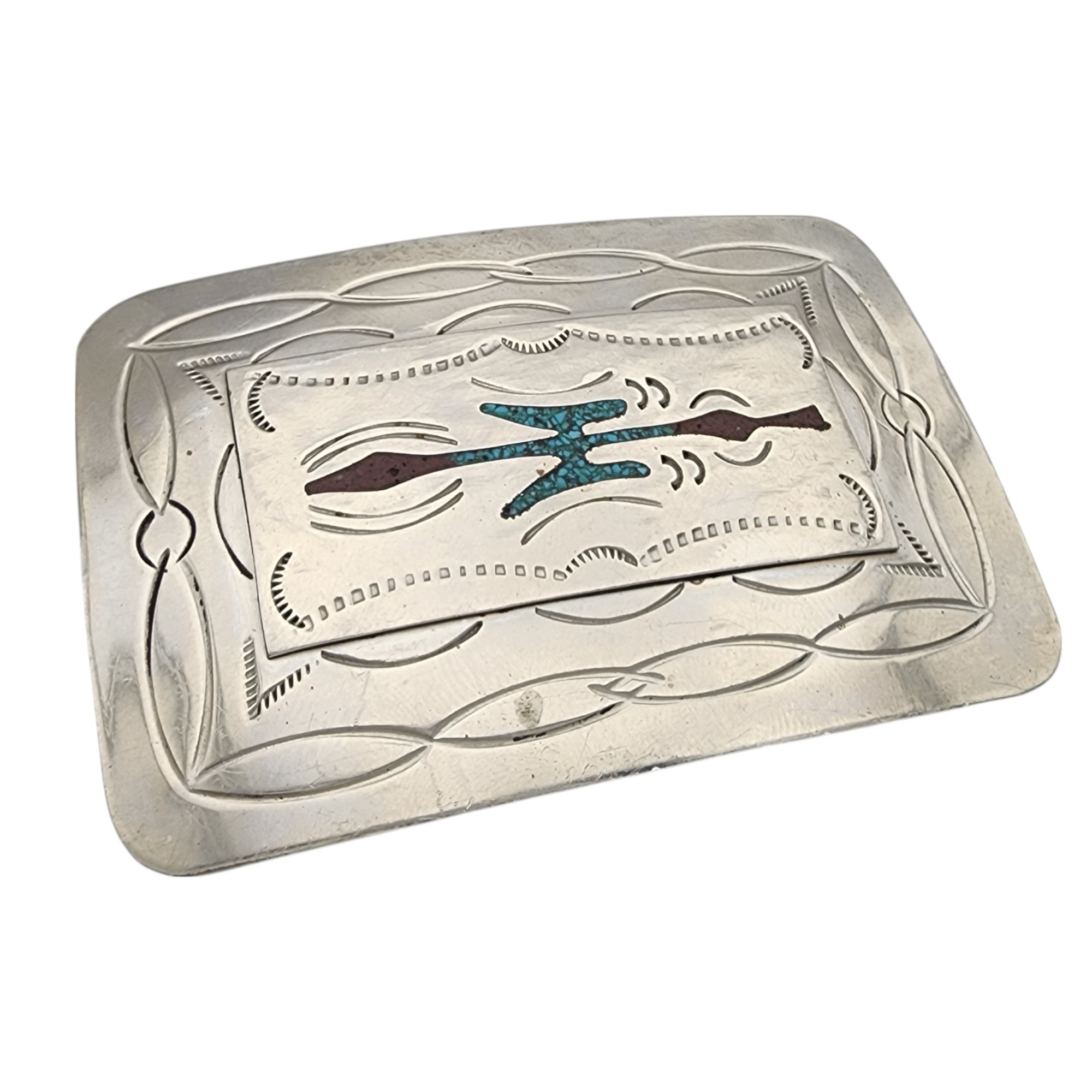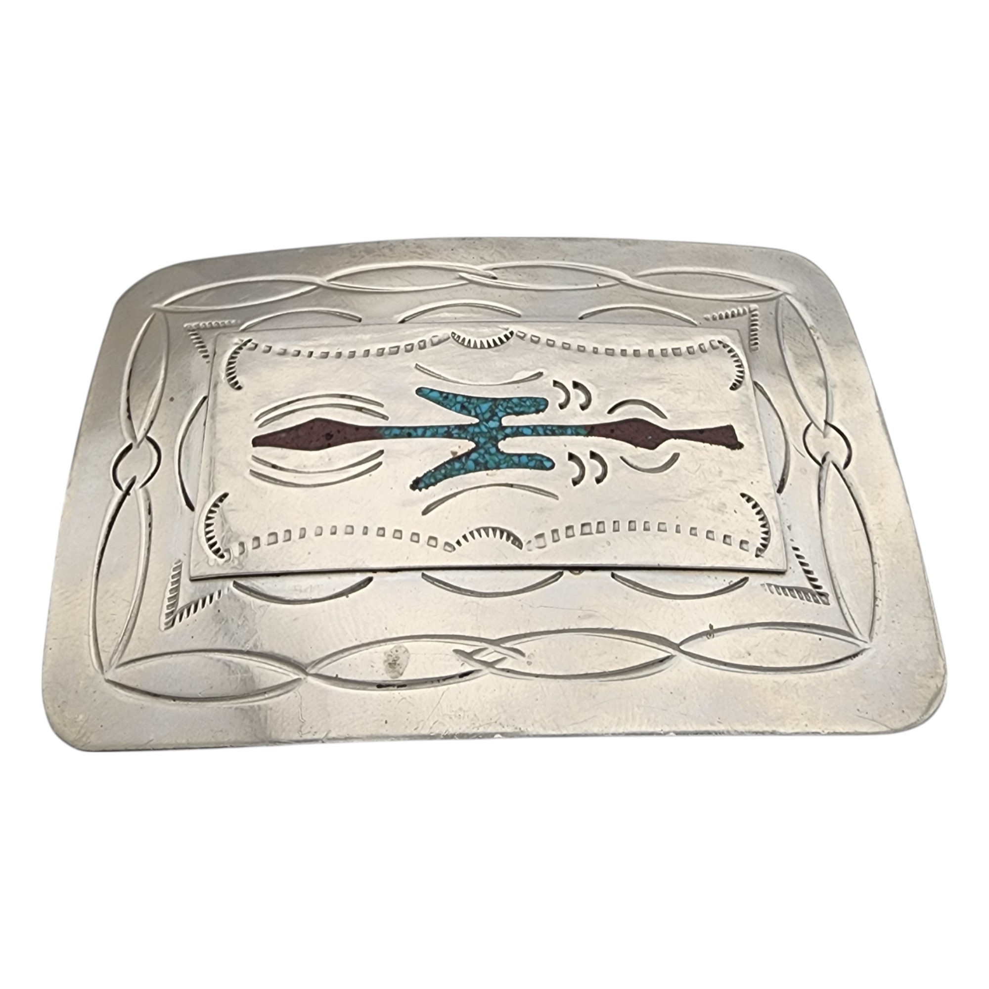 Atkinson Trading Post Navajo Sterling Crushed Turquoise and Coral Inlay Peyote Bird Belt Buckle | 35.1g