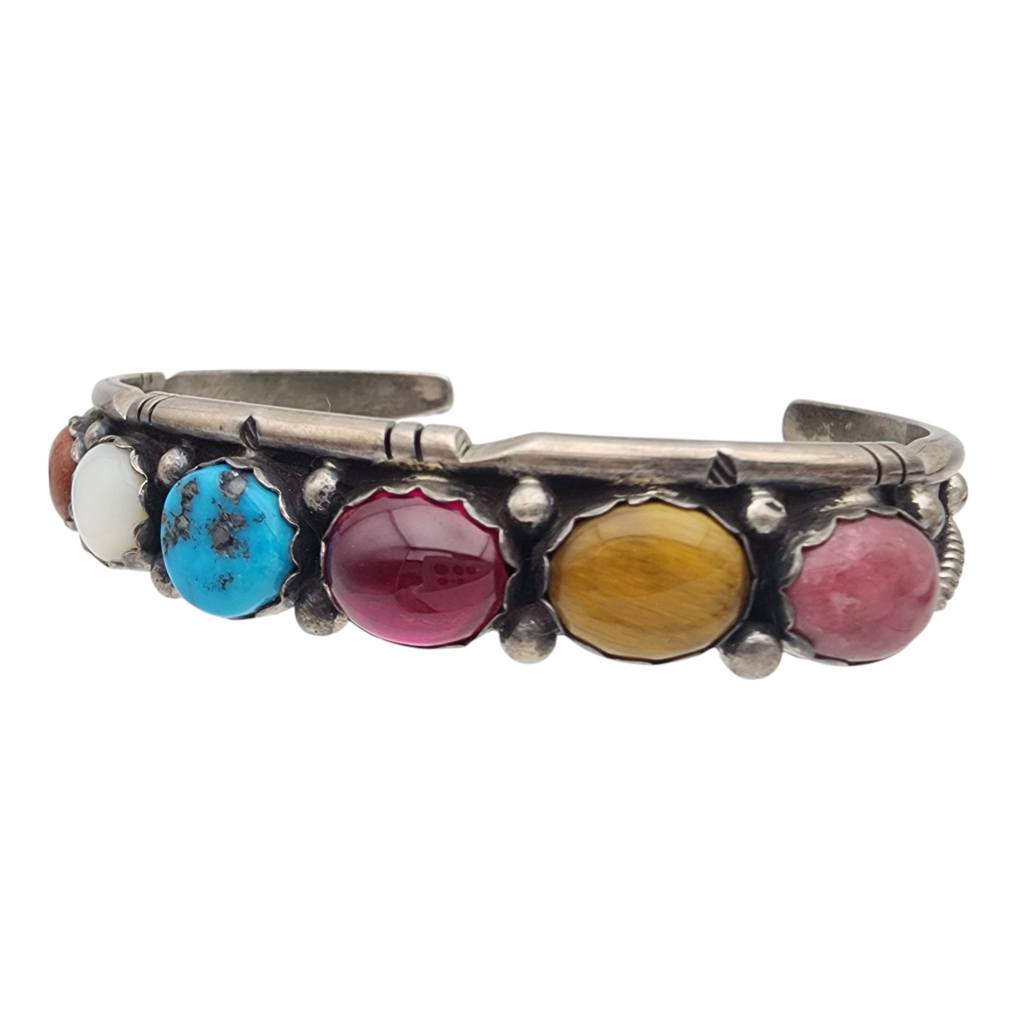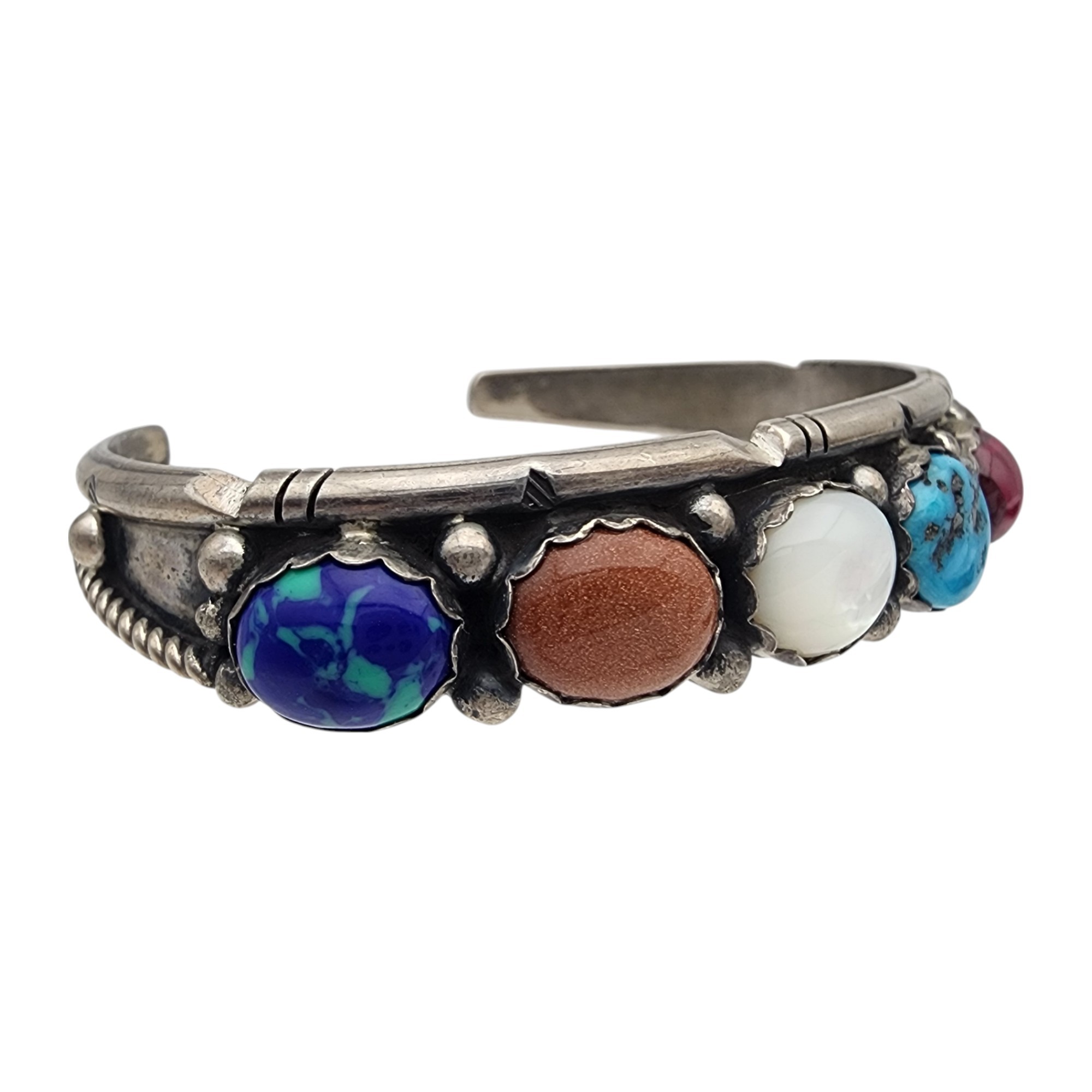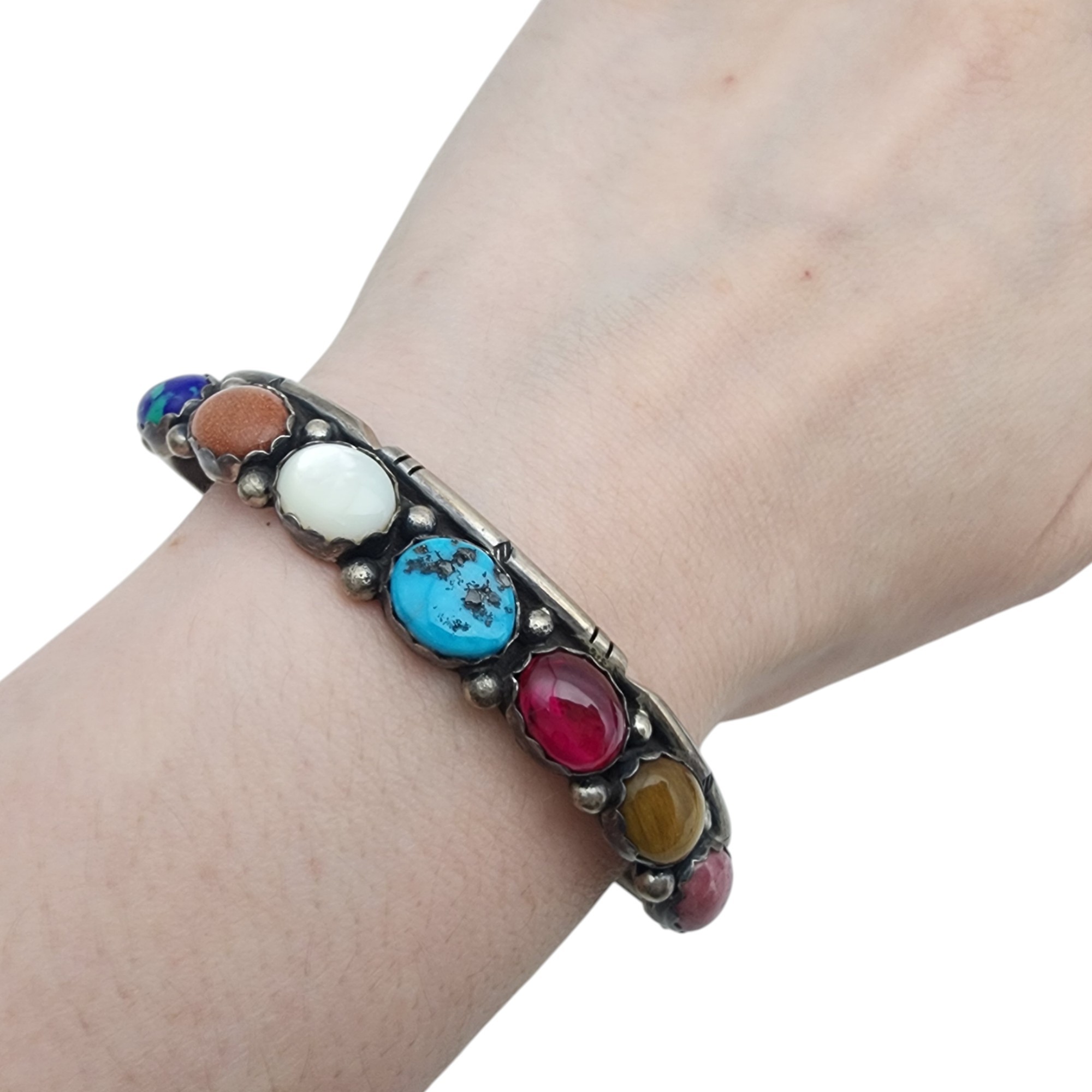 Signed RG Navajo Sterling Multistone (Turquoise, Goldstone, Azurite, Mother of Pearl, Tigers Eye, Rhodochrosite, etc.) Cuff Bracelet | 24.7g