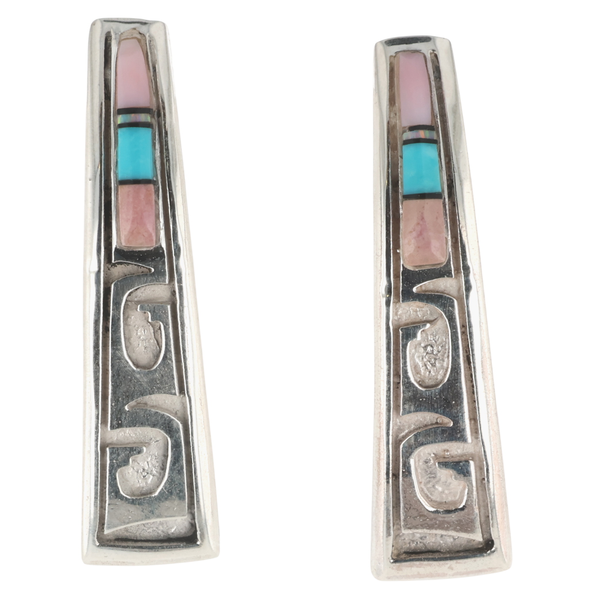 Grace Hale Navajo Sterling Turquoise, Pink Conch, Onyx, Opal Inlay Earrings 5g