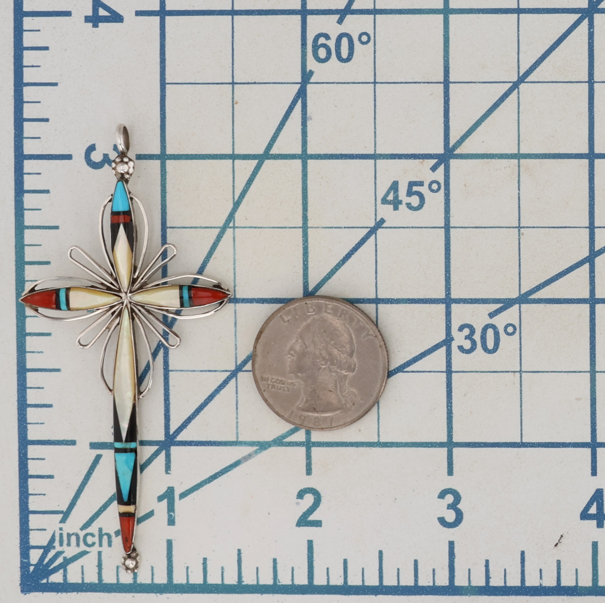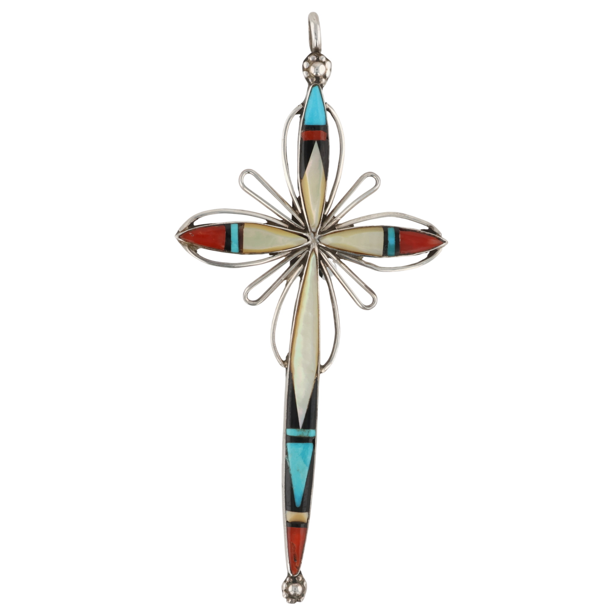 Vintage Adeline Zuni Sterling Mother of Pearl, Turquoise, Coral, Onyx Inlay Cross Pendant 5g