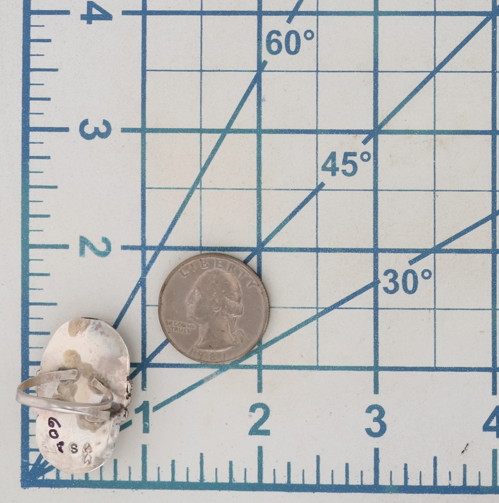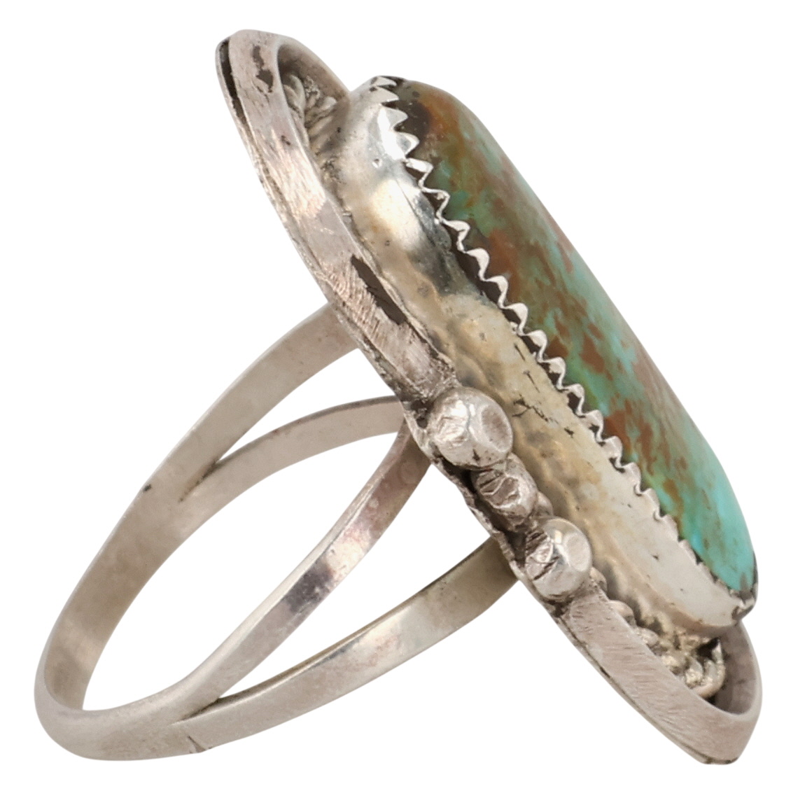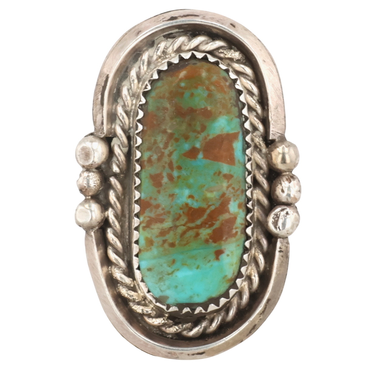 Vintage Signed Navajo Sterling Turquoise Ring 9g Sz 7.5, signature S with an Arrow