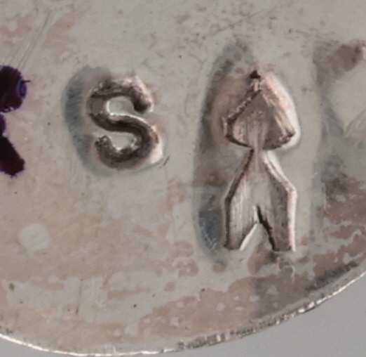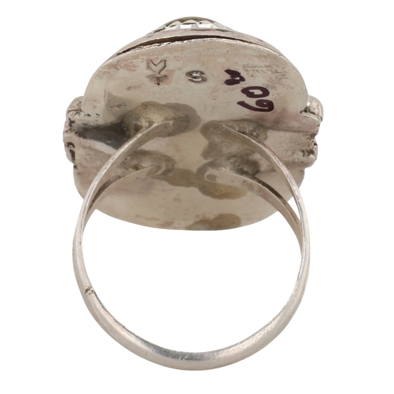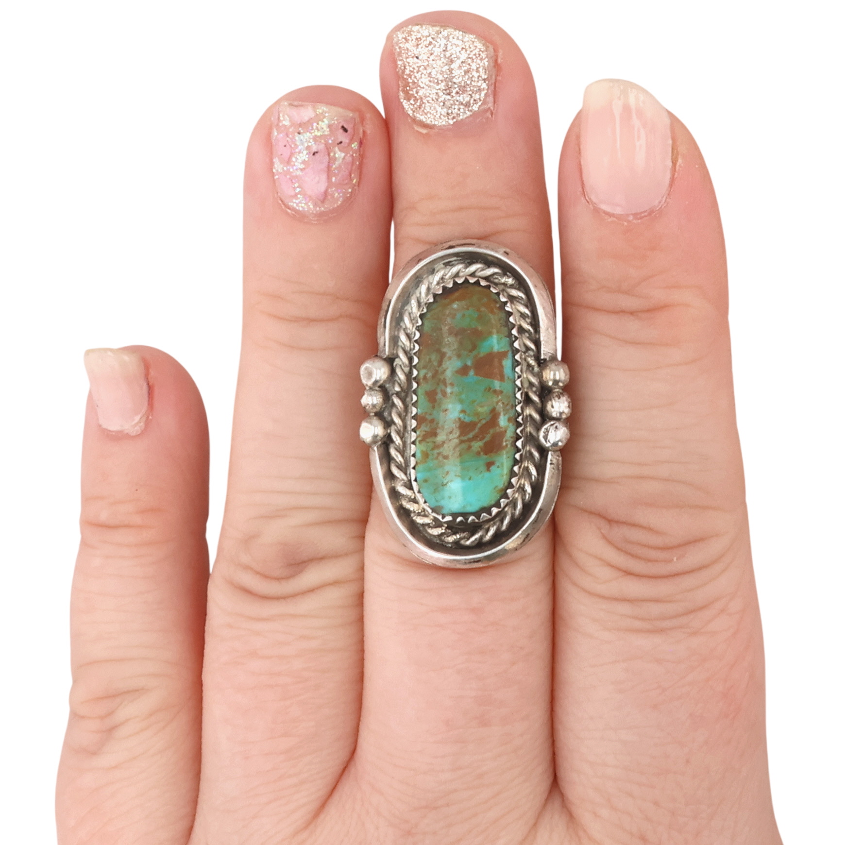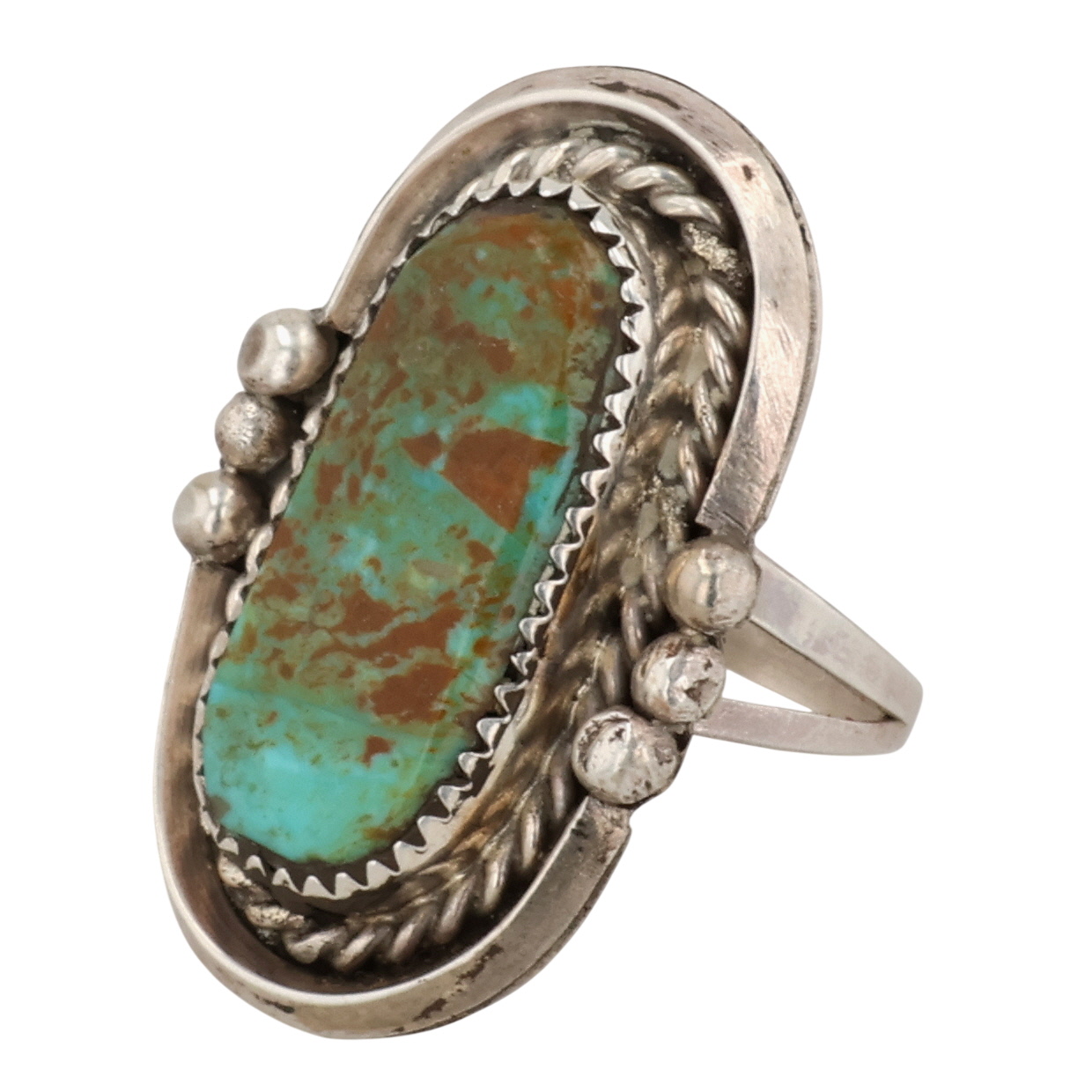 Vintage Signed Navajo Sterling Turquoise Ring 9g Sz 7.5, signature S with an Arrow