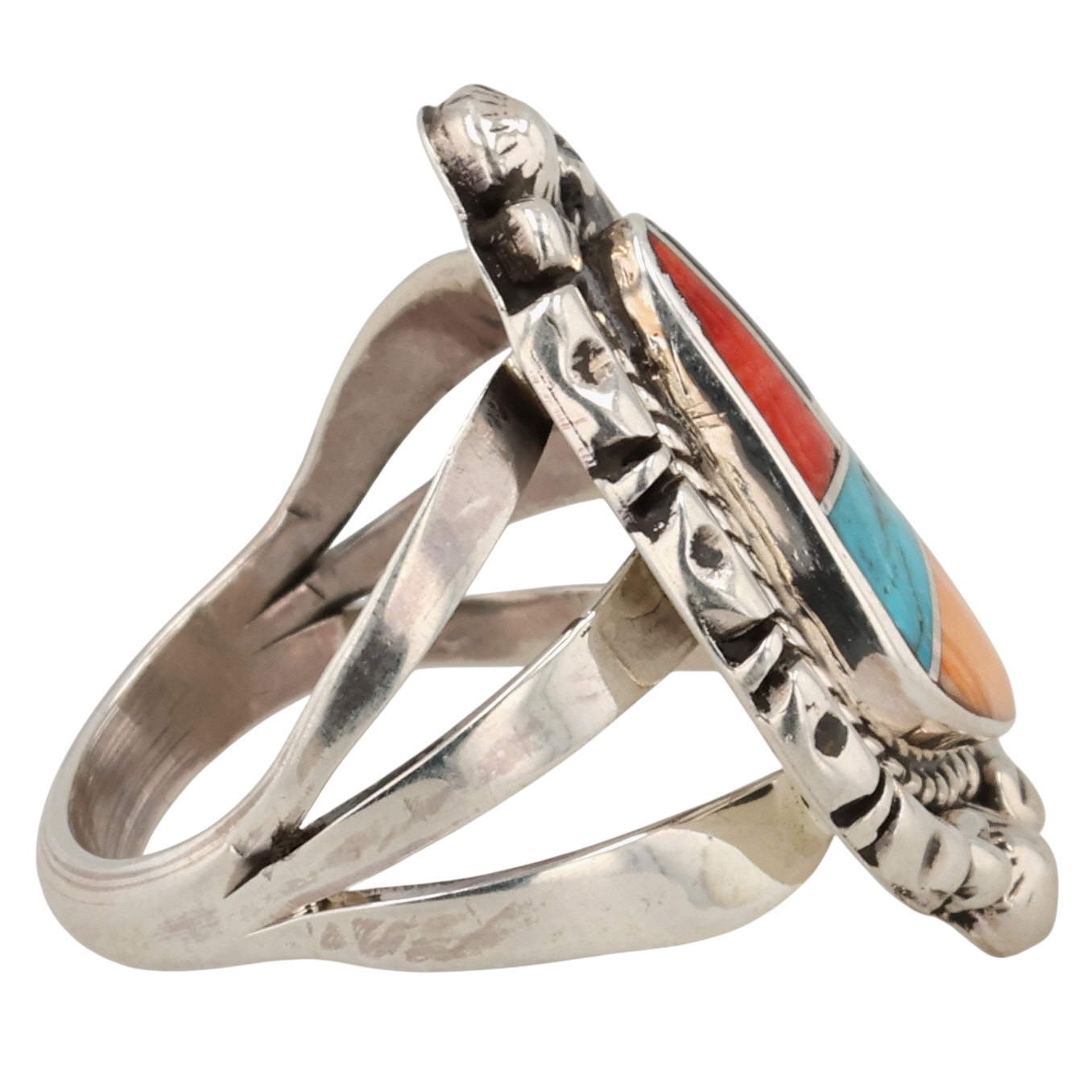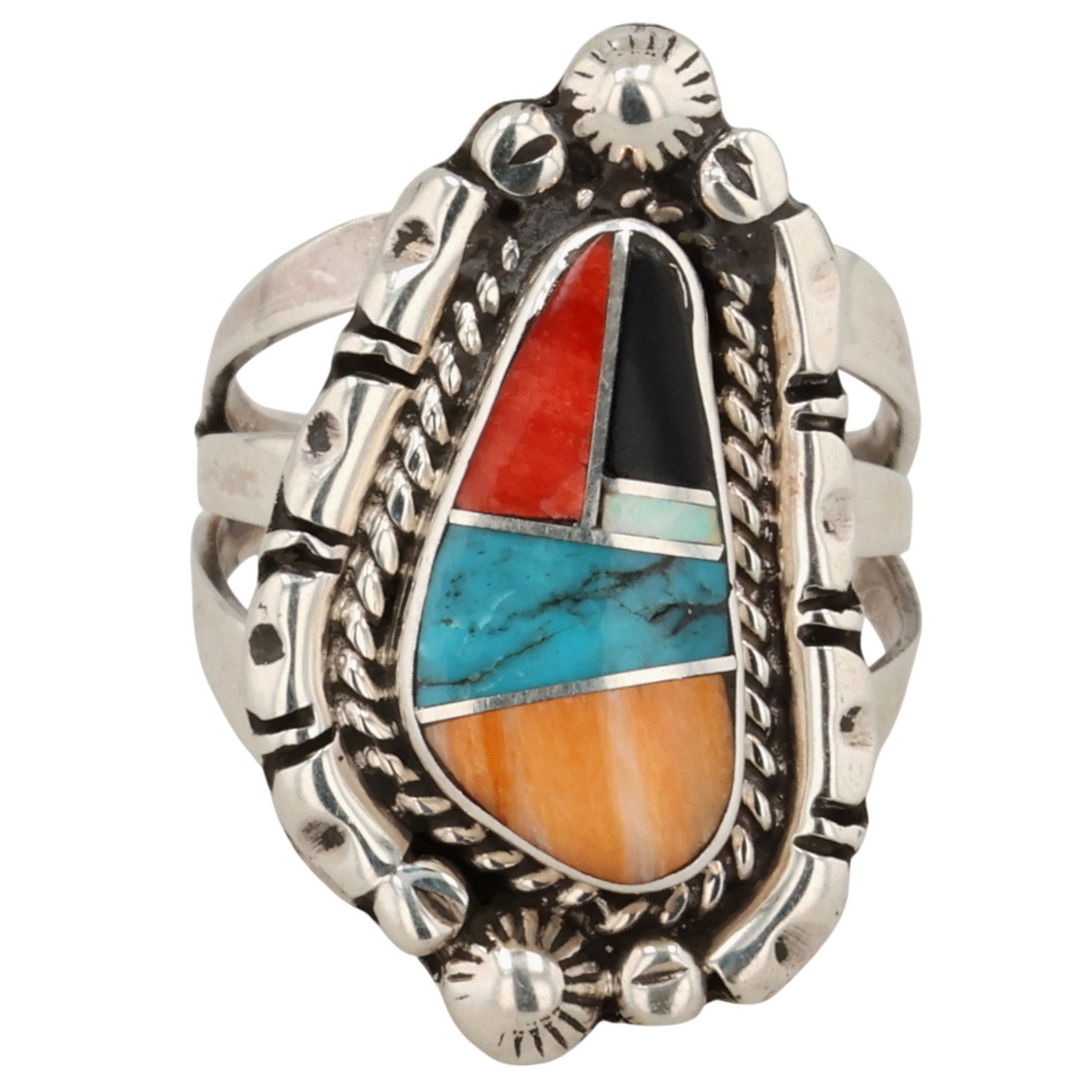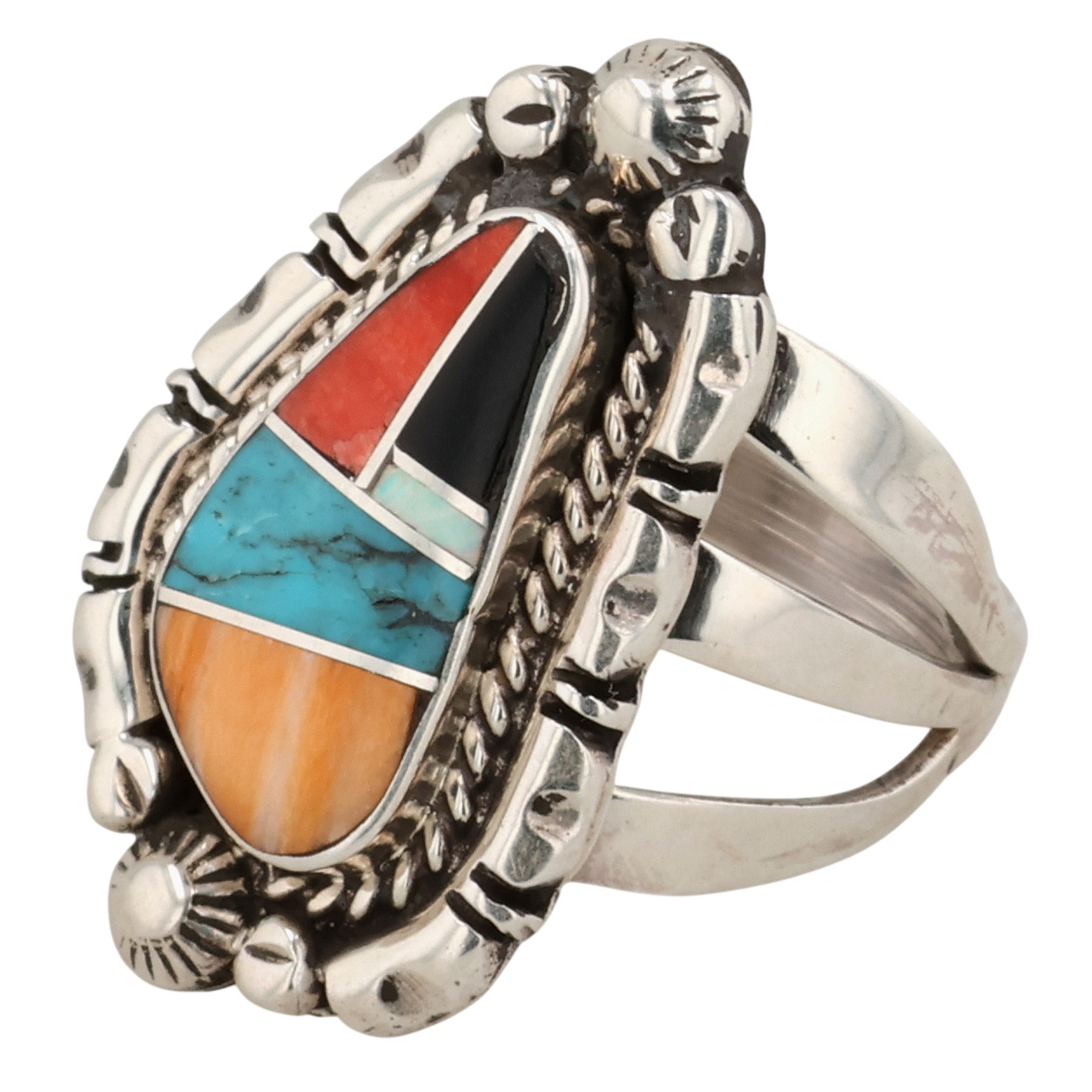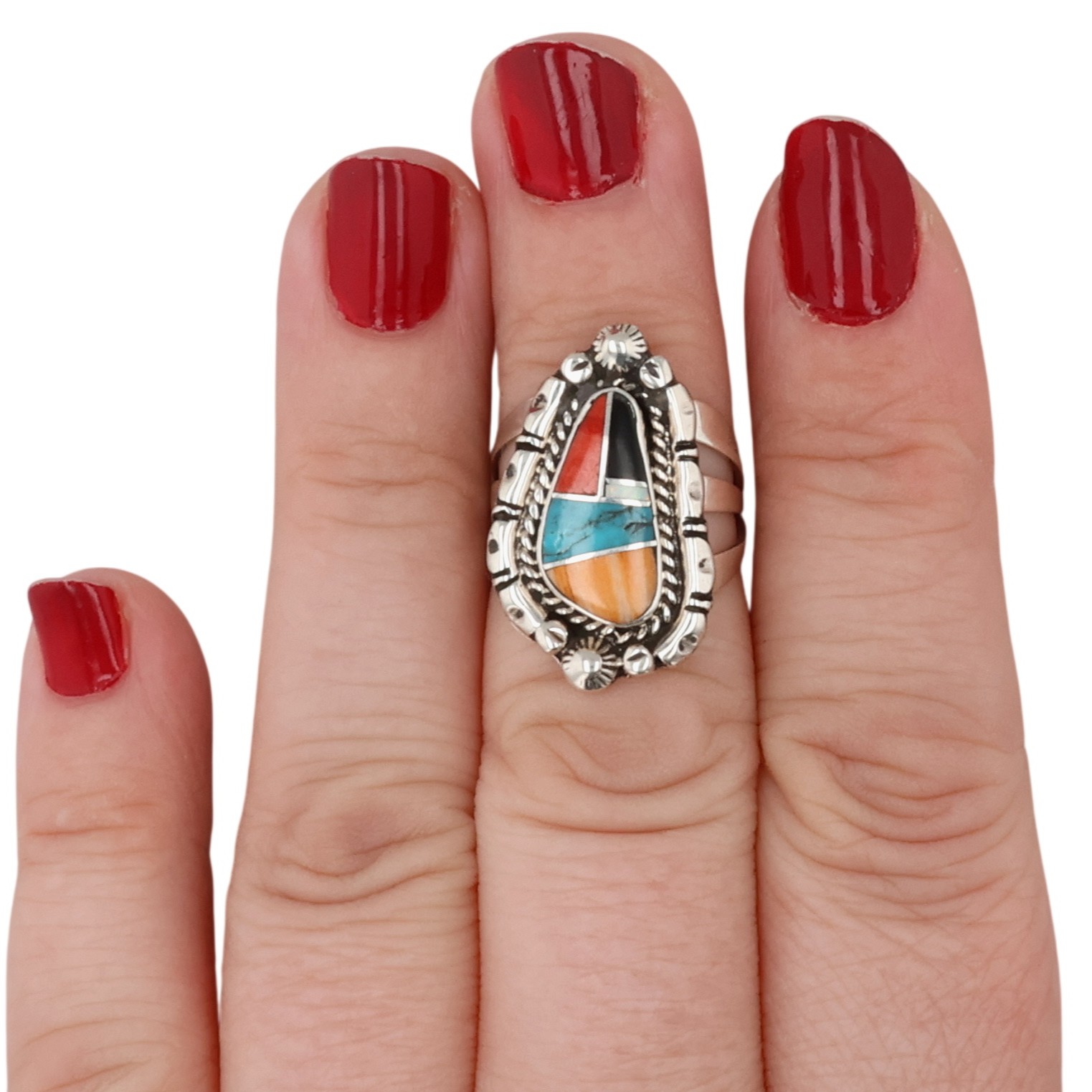 James Manygoats Navajo Sterling Coral, Turquoise, Spiny Oyster, Opal, Onyx Inlay Ring 6.5g Sz 5.5