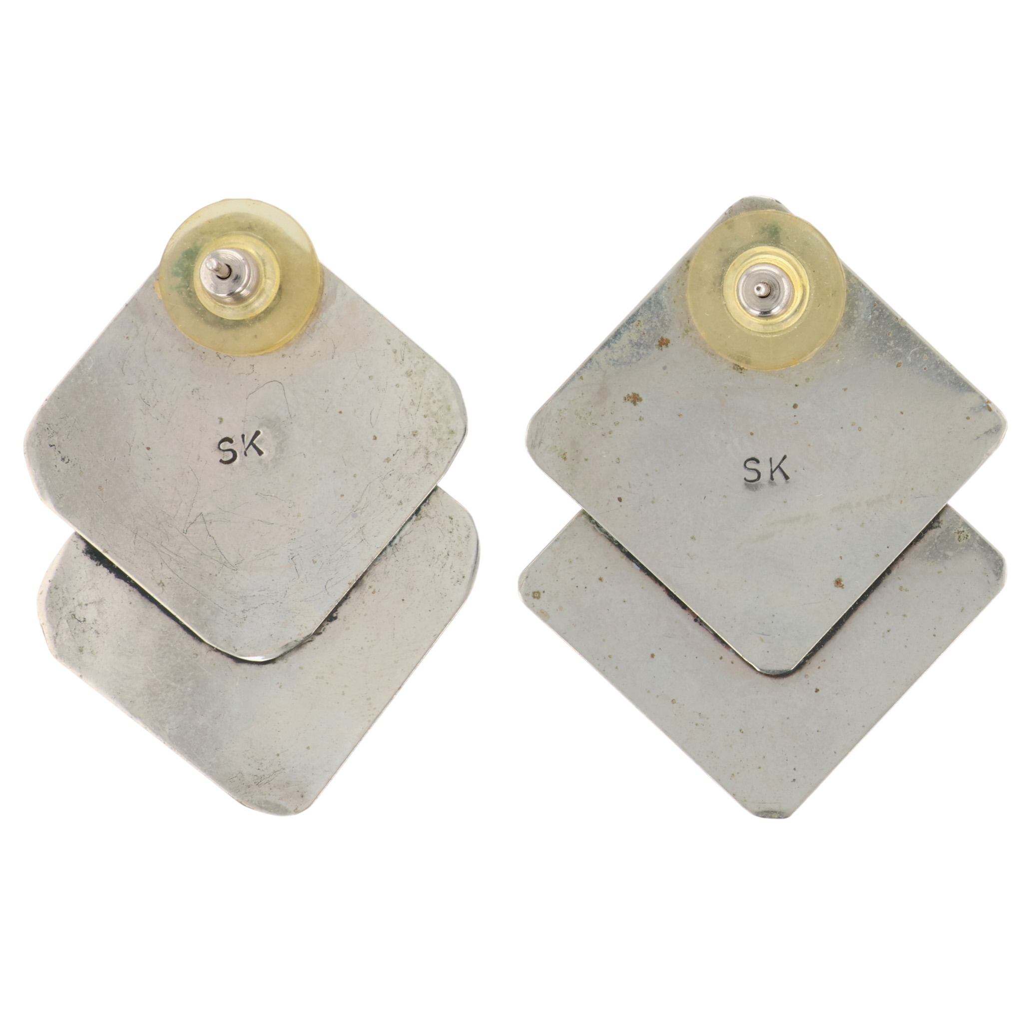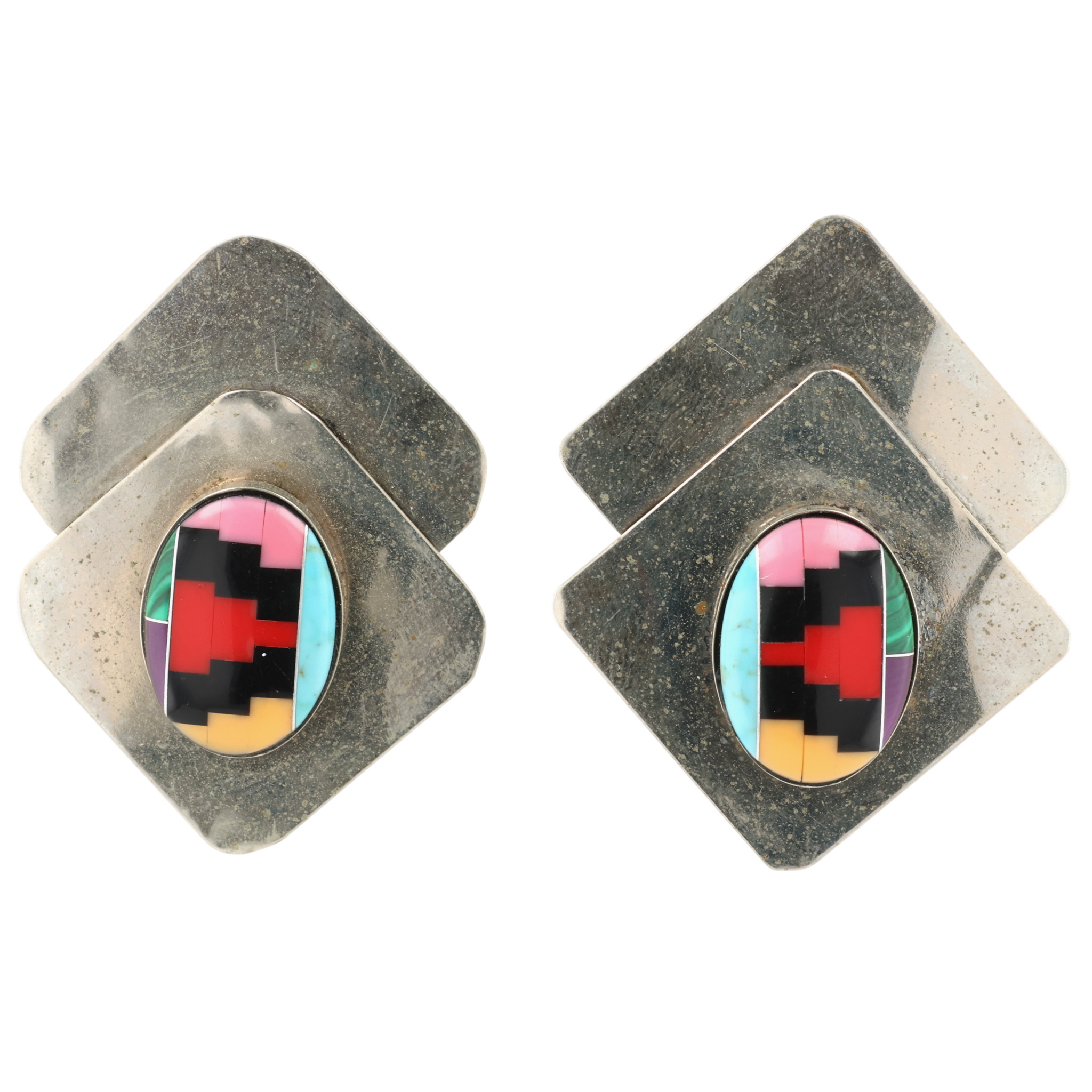 Samson Kee Navajo Sterling Turquoise, Coral, Onyx, Spiny Oyster Inlay Earrings 11g