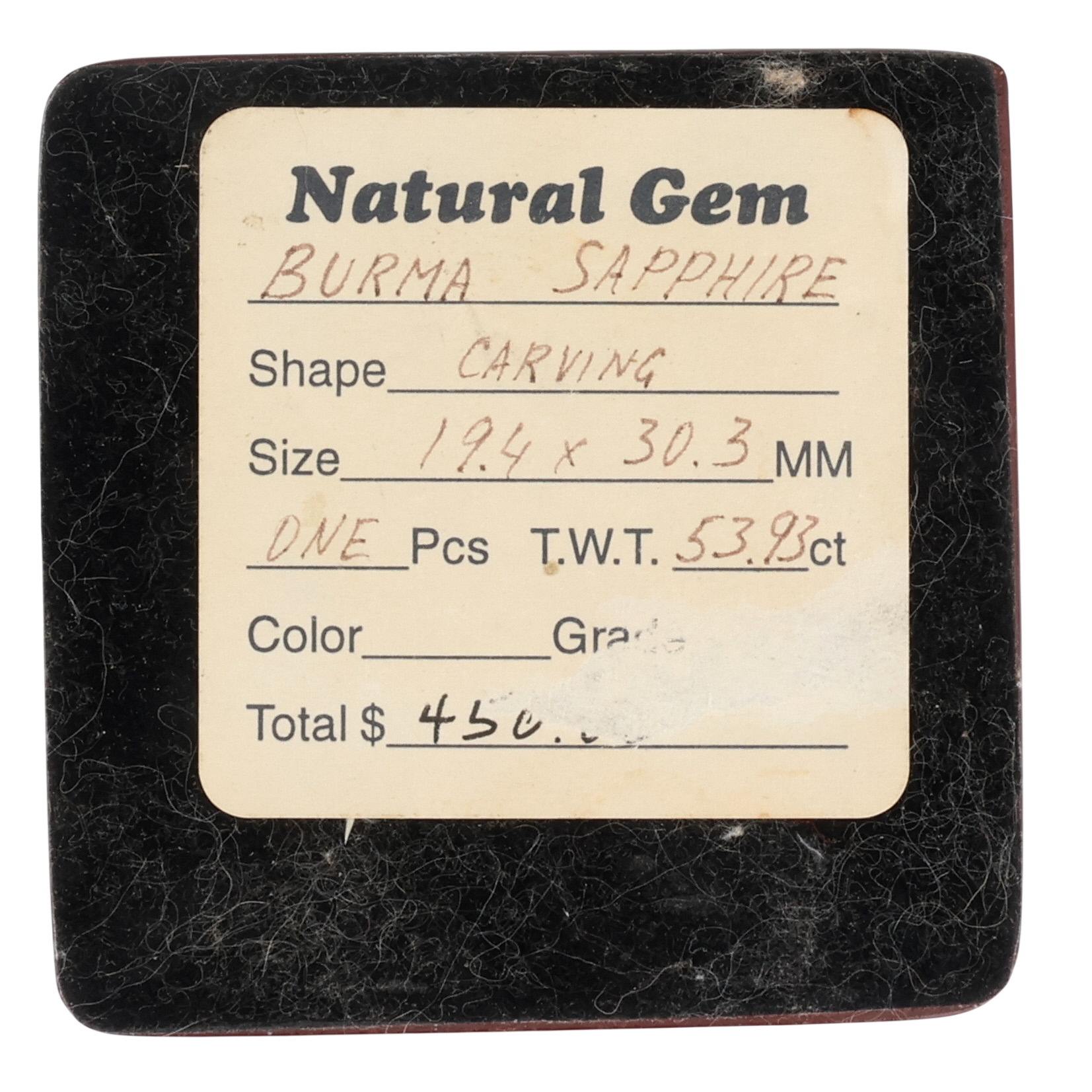 Burma Carved Sapphire Sz 19.4 by 30.3 MM TCW 53.93 in the box