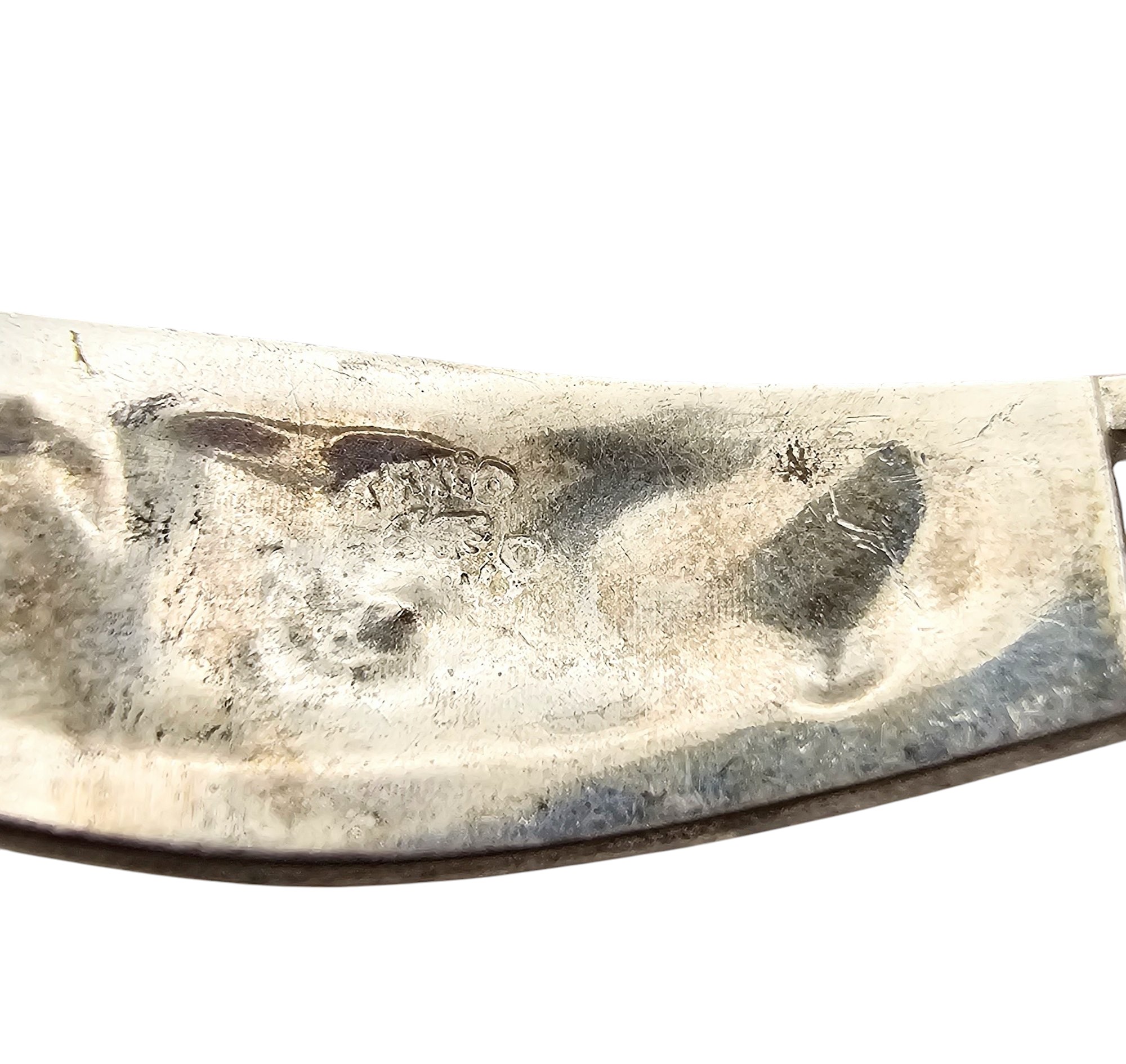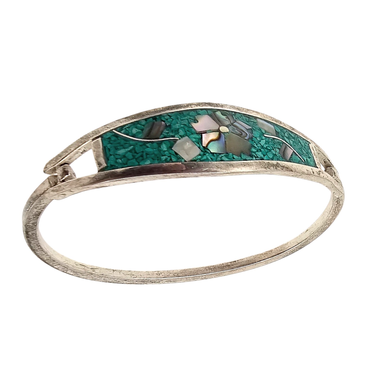 Signed Alpaca Silver Crushed Turquoise Mother Of Pearl Eye Hook Bangle Bracelet 15.2 G