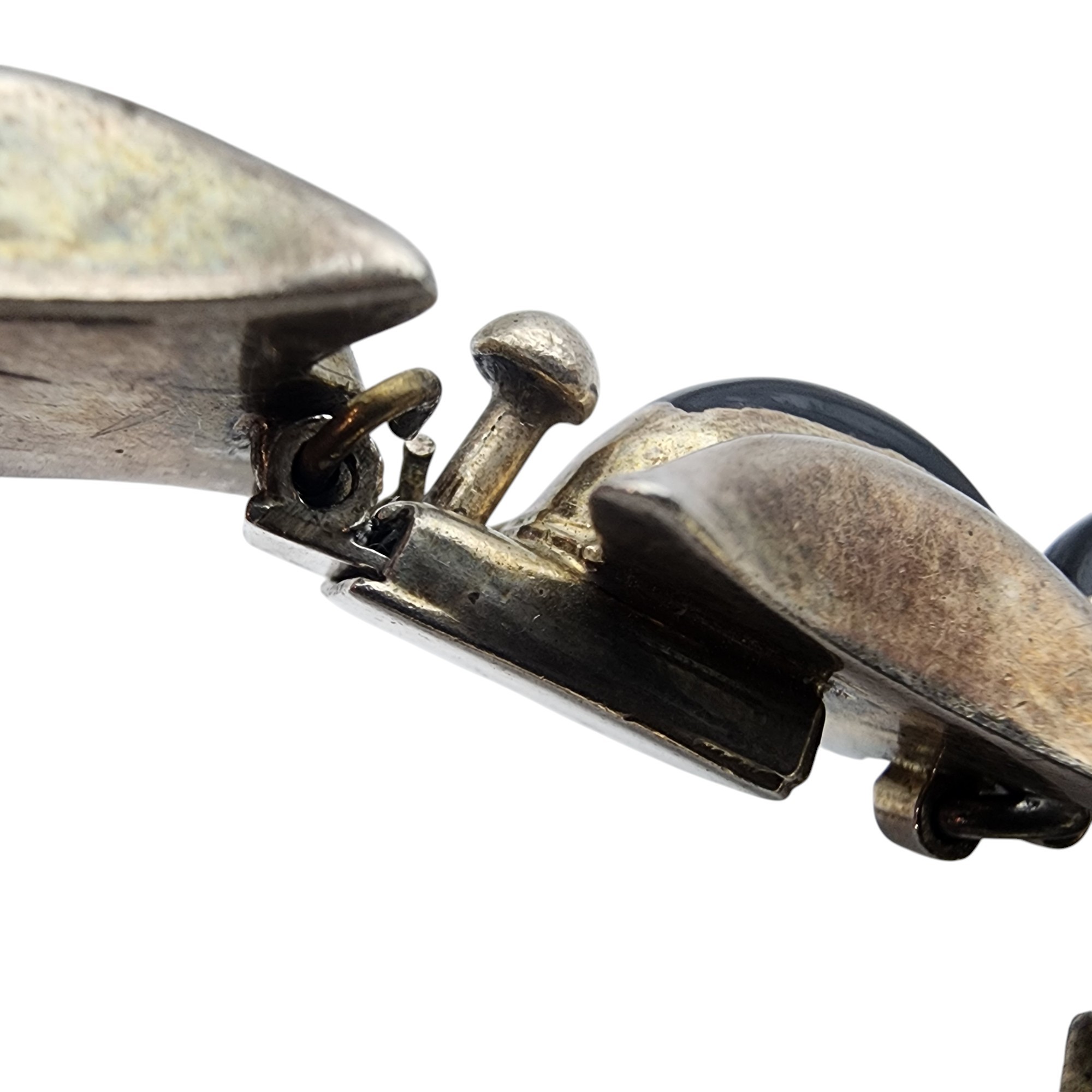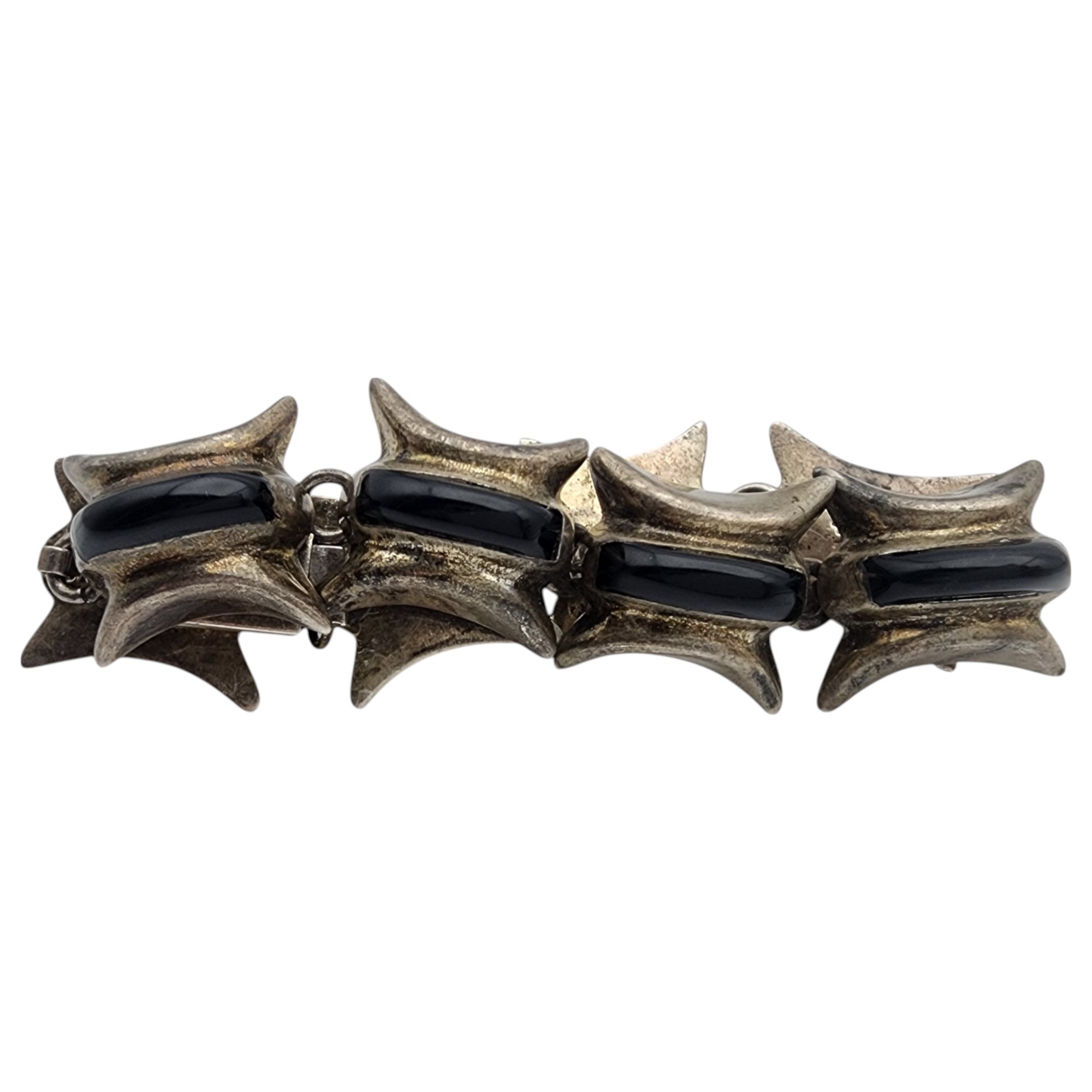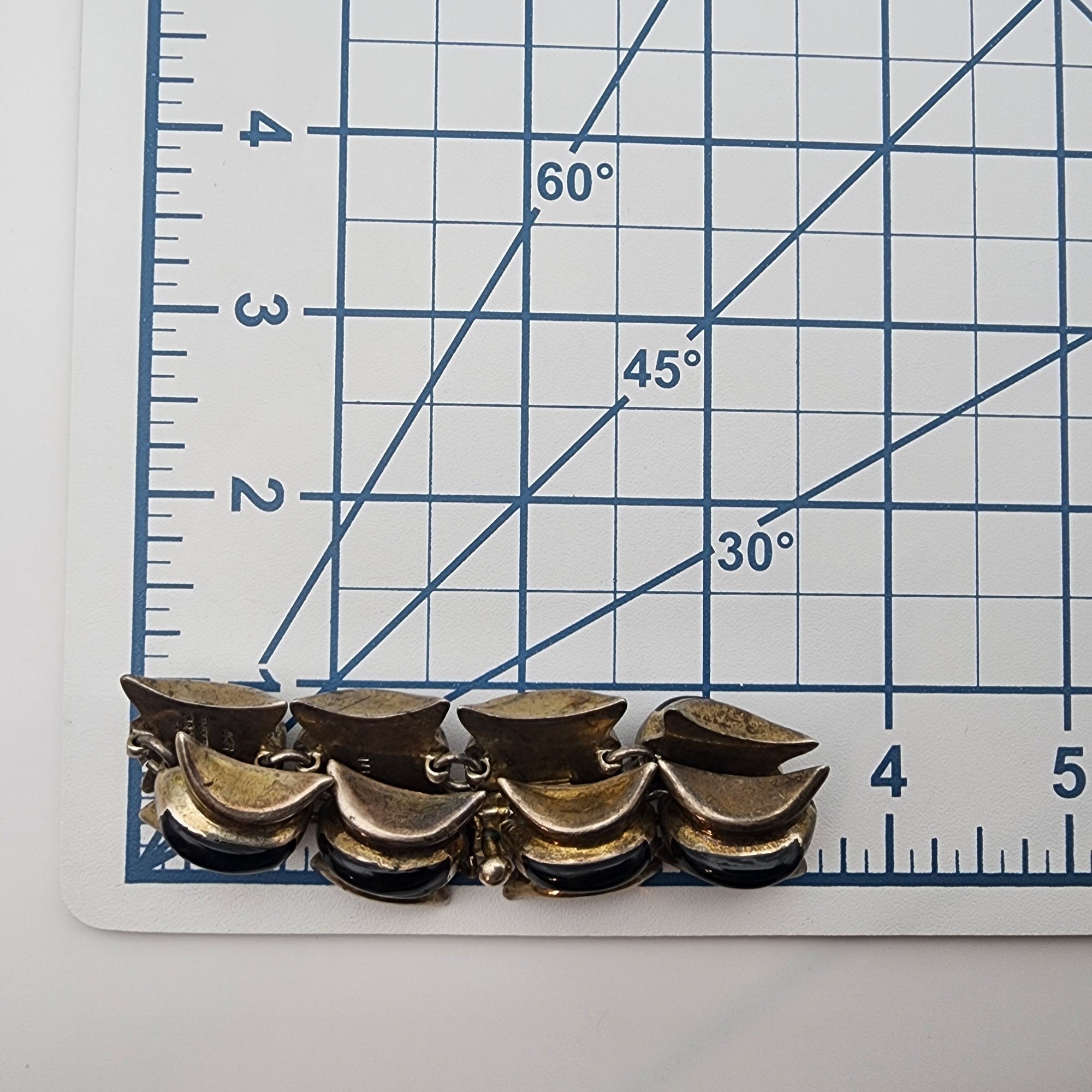 Vintage Taxco TJ- 82? Mexico Sterling Onyx Ridge Link Bracelet, 51.6g, as is – missing the mechanism that locks the clasp in place – previous owner made a temporary fix and used a piece of a sterling stud back to hold the links together to be able to wear the bracelet – appears that you can easily remove the temporary repair and have it repaired to your liking.