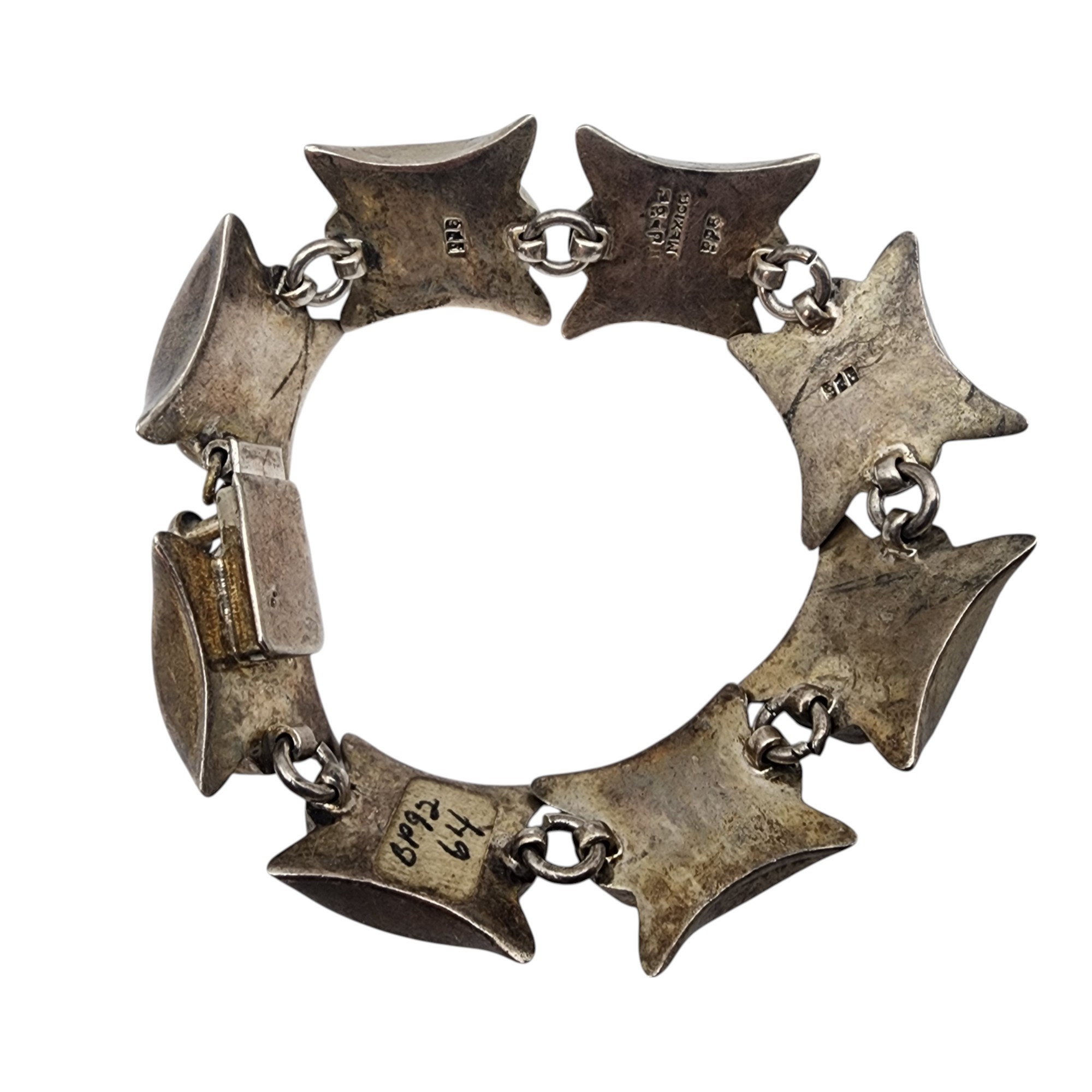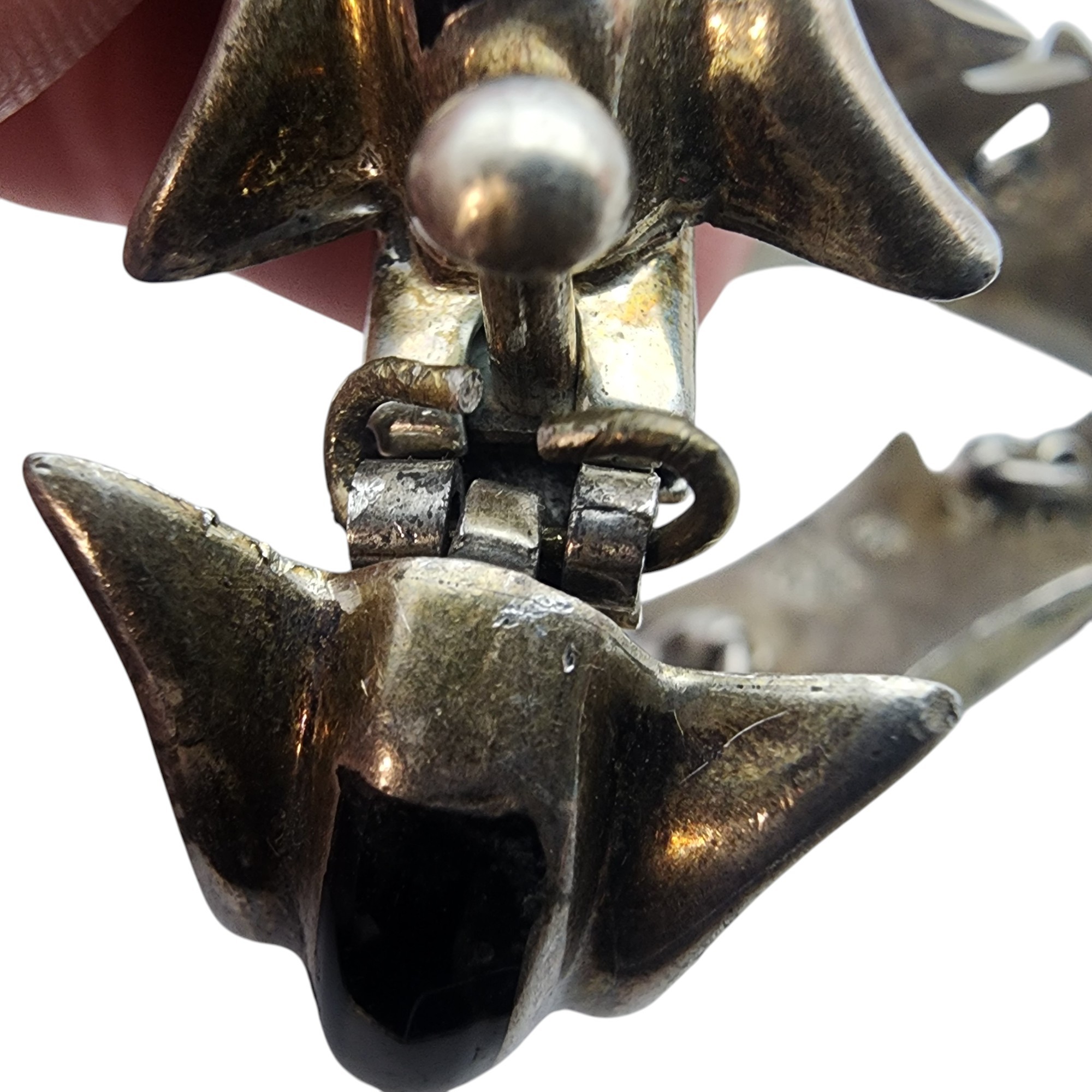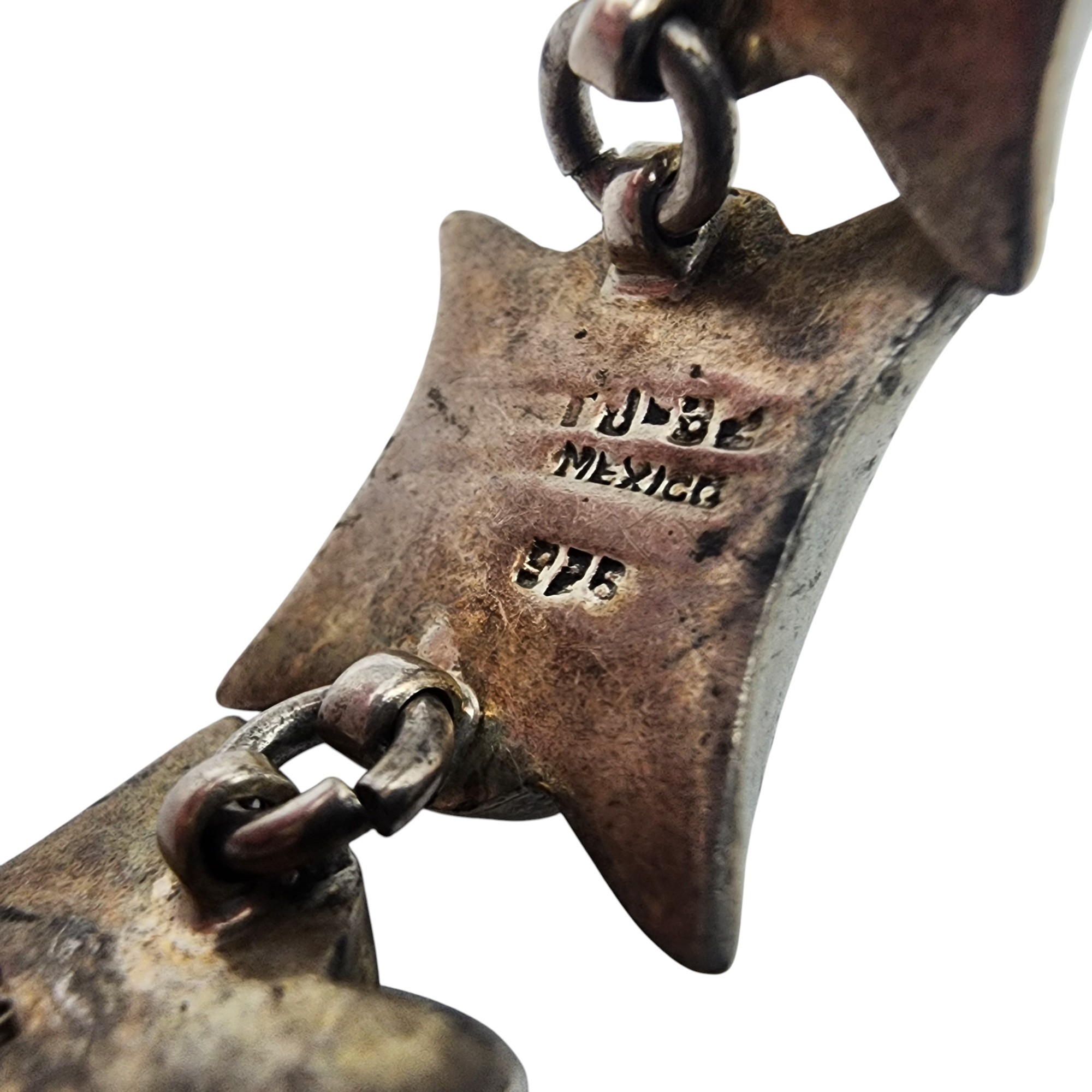Vintage Taxco TJ- 82? Mexico Sterling Onyx Ridge Link Bracelet, 51.6g, as is – missing the mechanism that locks the clasp in place – previous owner made a temporary fix and used a piece of a sterling stud back to hold the links together to be able to wear the bracelet – appears that you can easily remove the temporary repair and have it repaired to your liking.