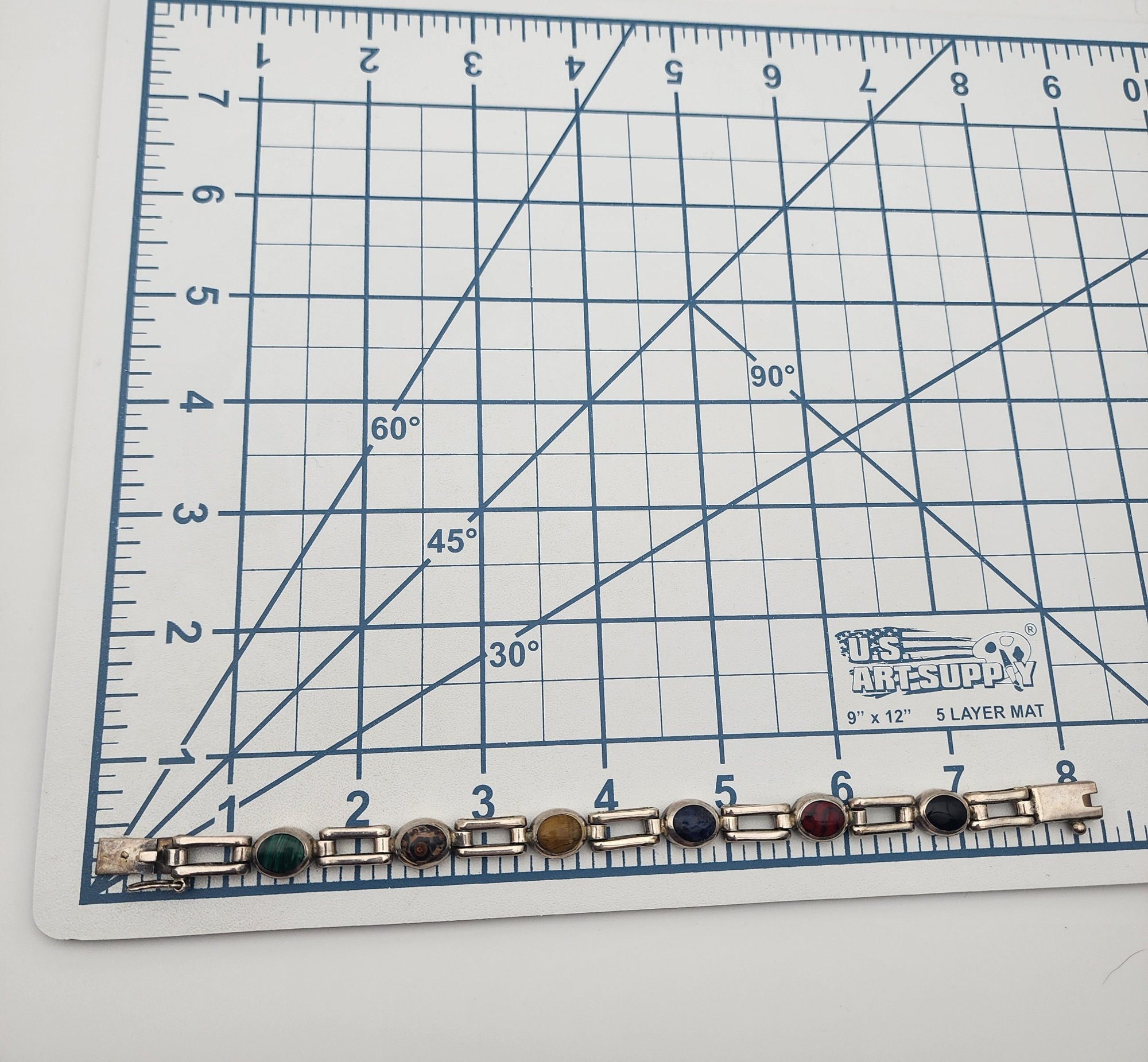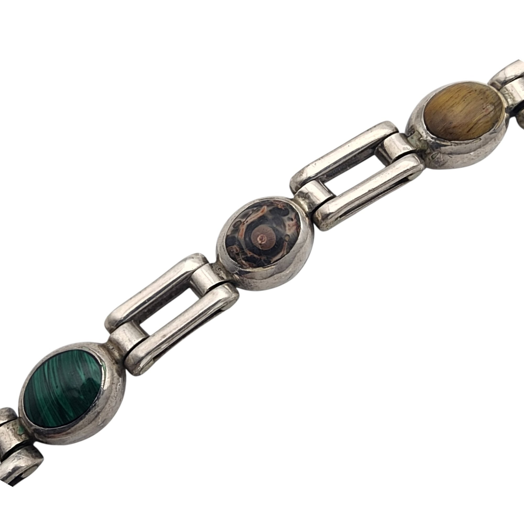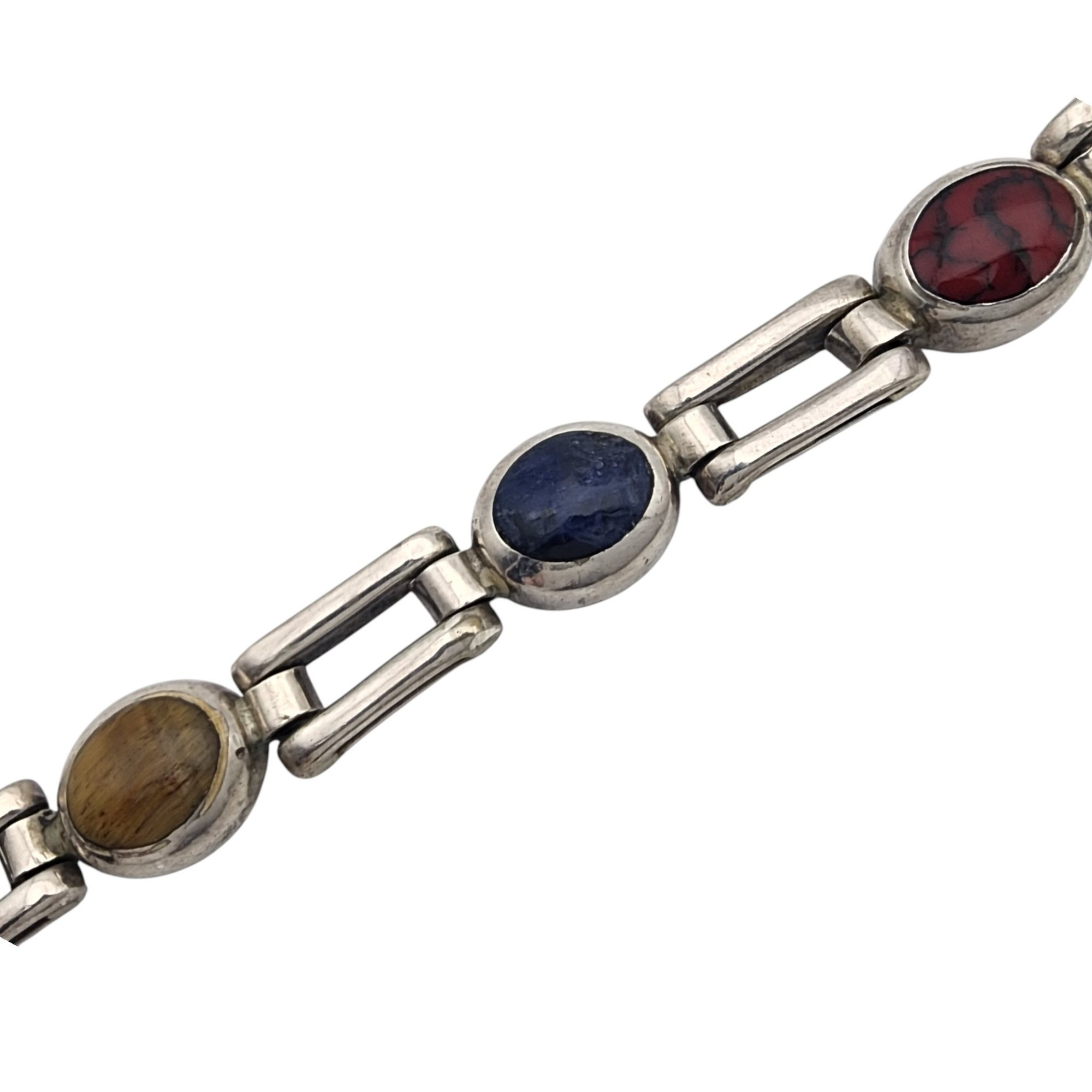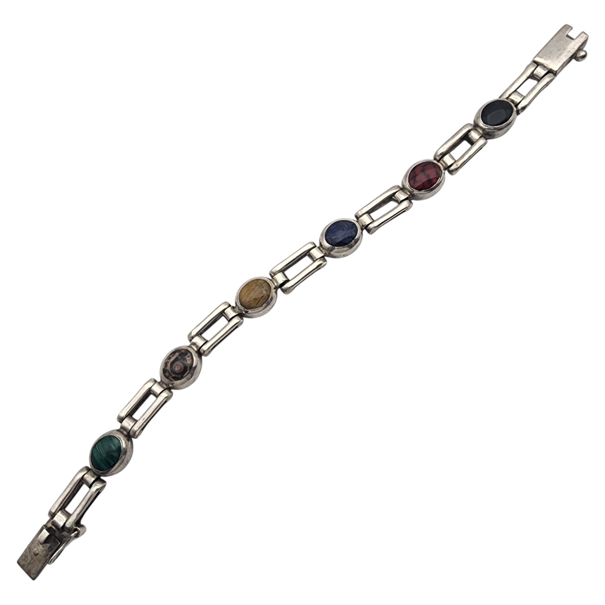 Taxco Mexico Sterling Multistone (Onyx, Tigers Eye, Sodalite, Red Jasper, Lapis Lazuli, Jasper, Malachite) Link Bracelet – 28.9g – Note – Lapis Lazuli with chip in stone