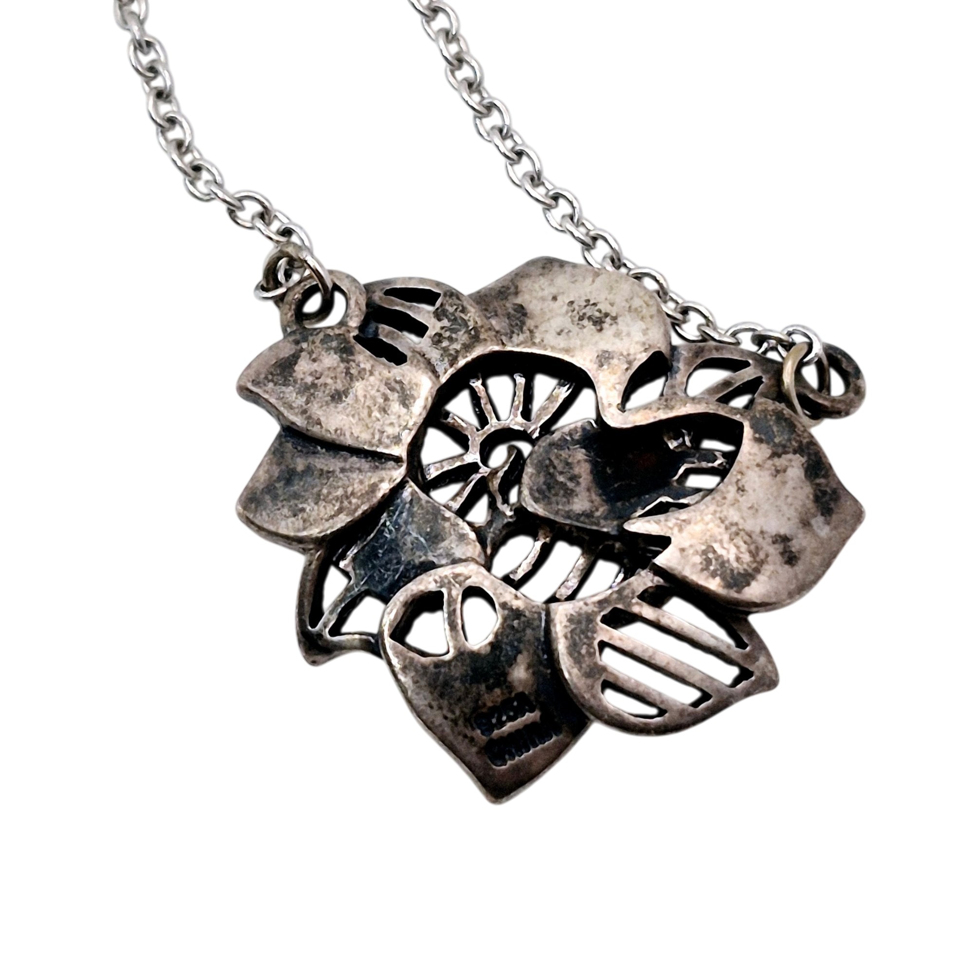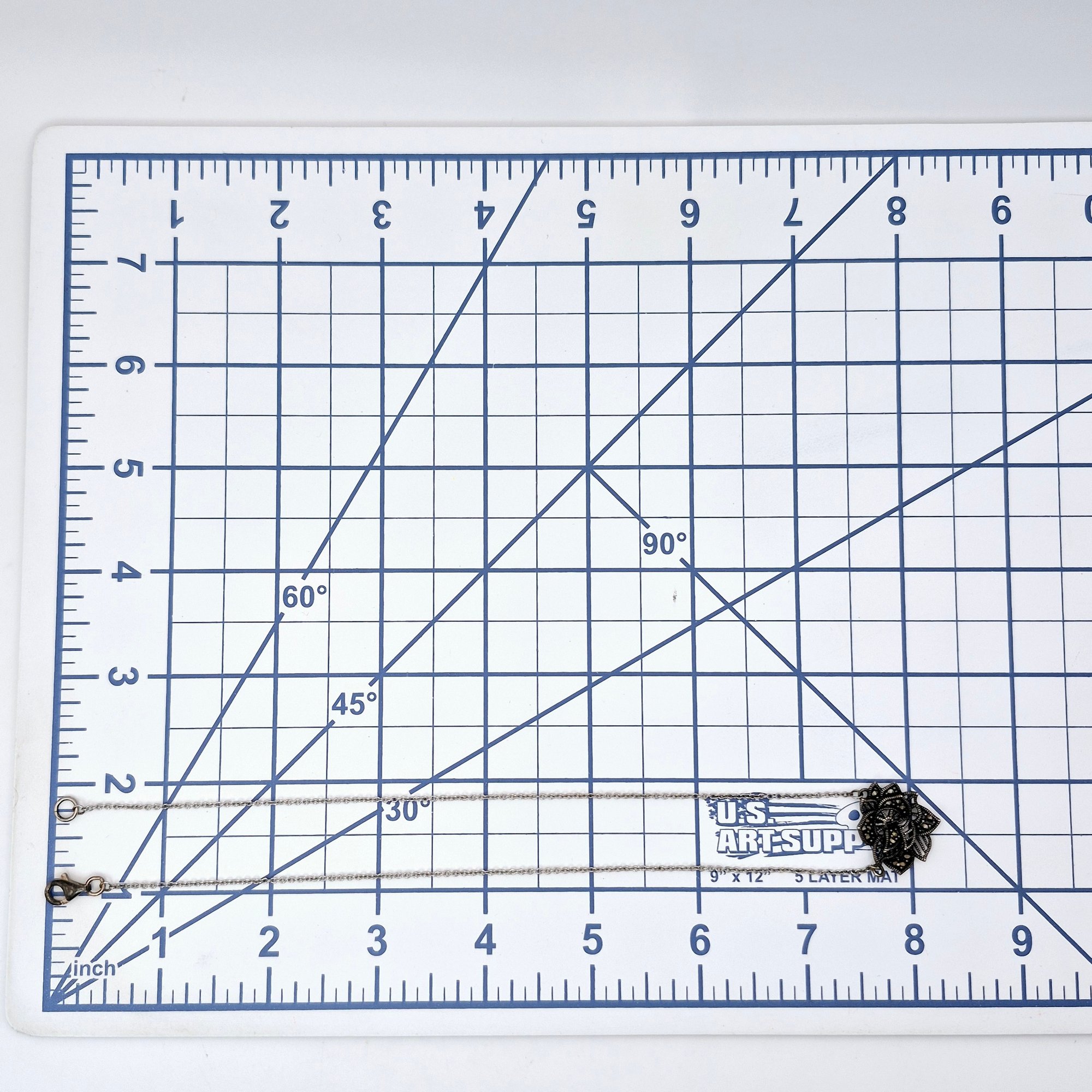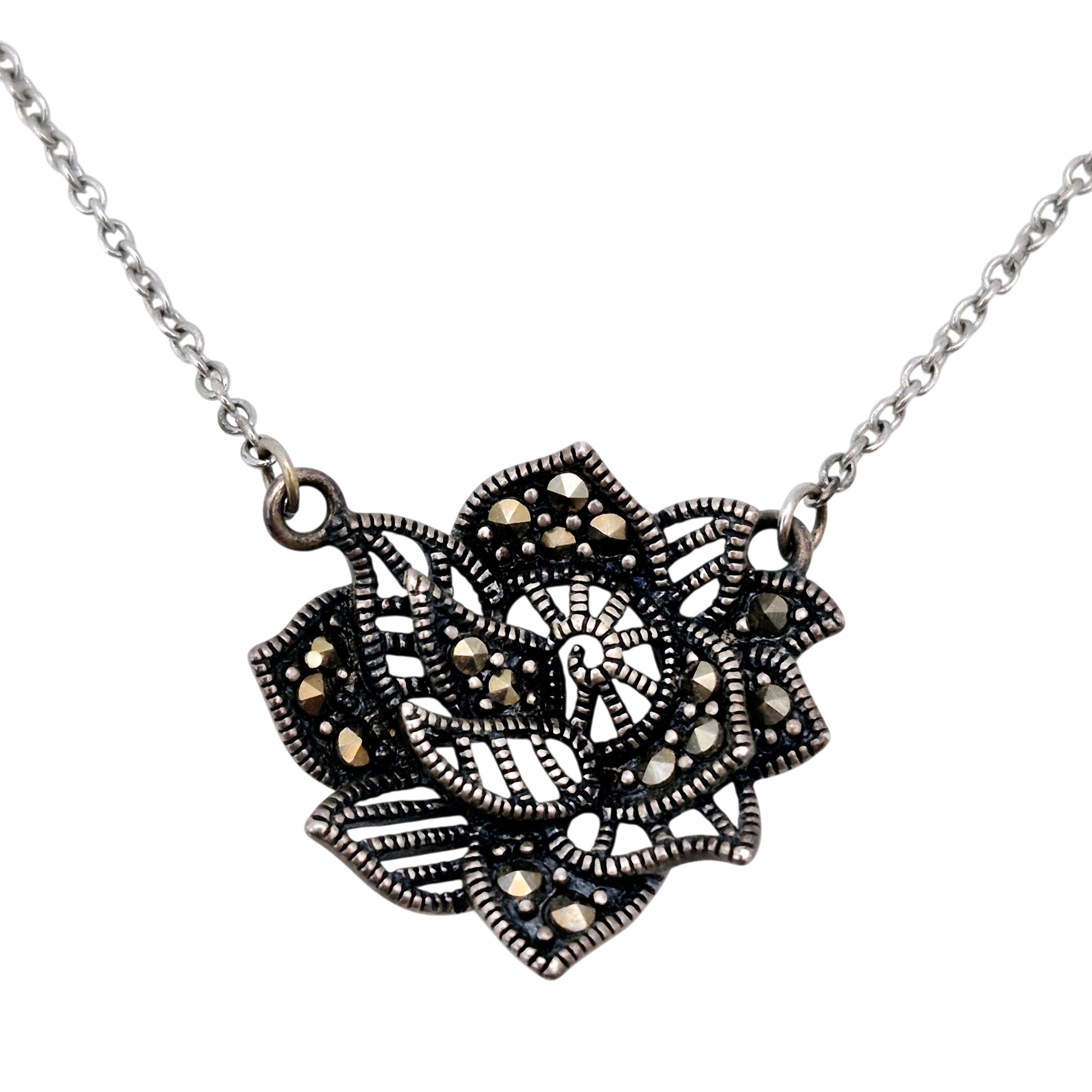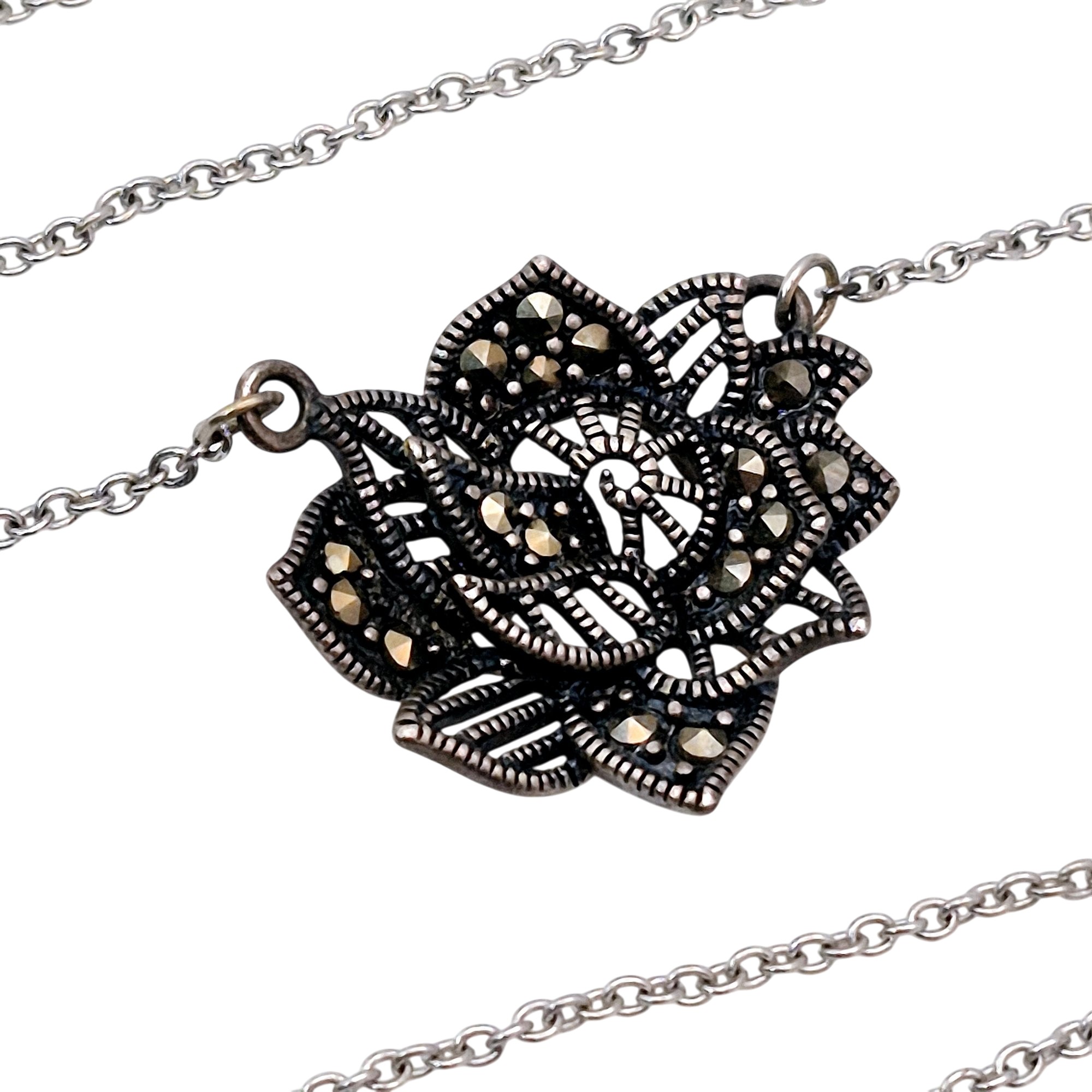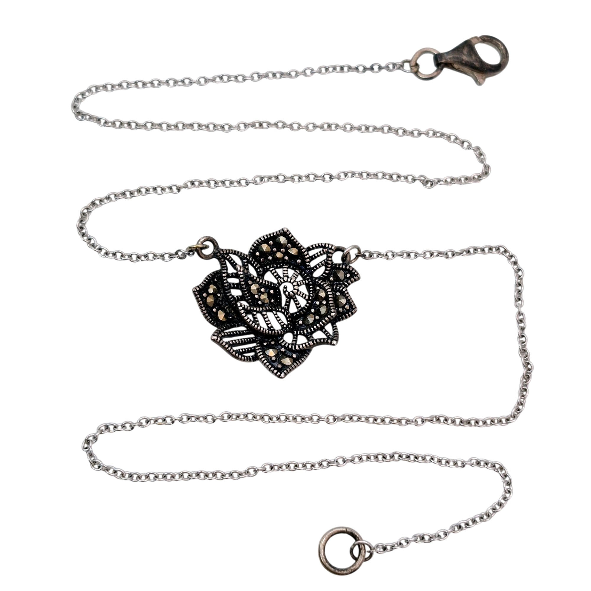 Sterling marcasite flower pendant cable chain necklace 5.3 G